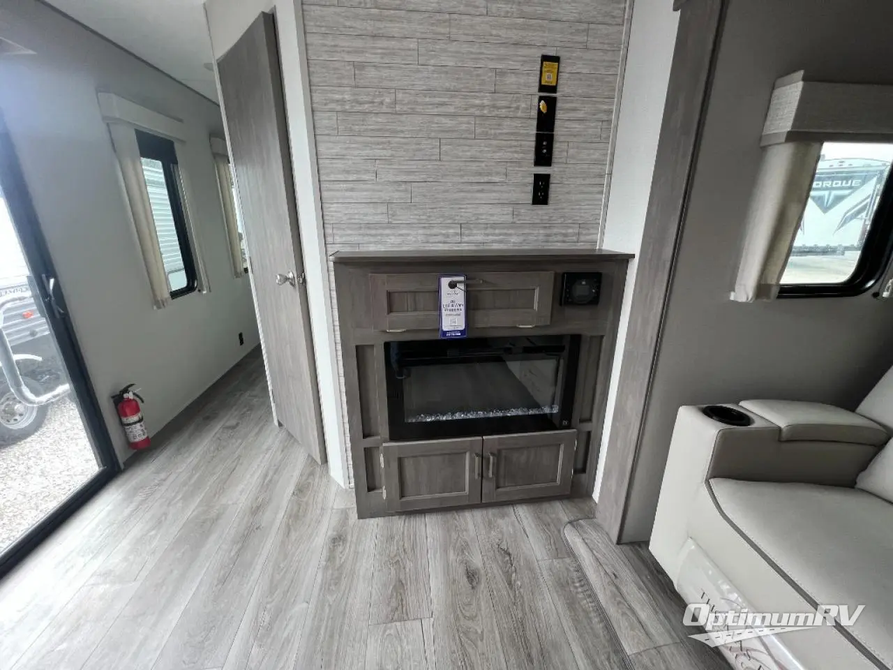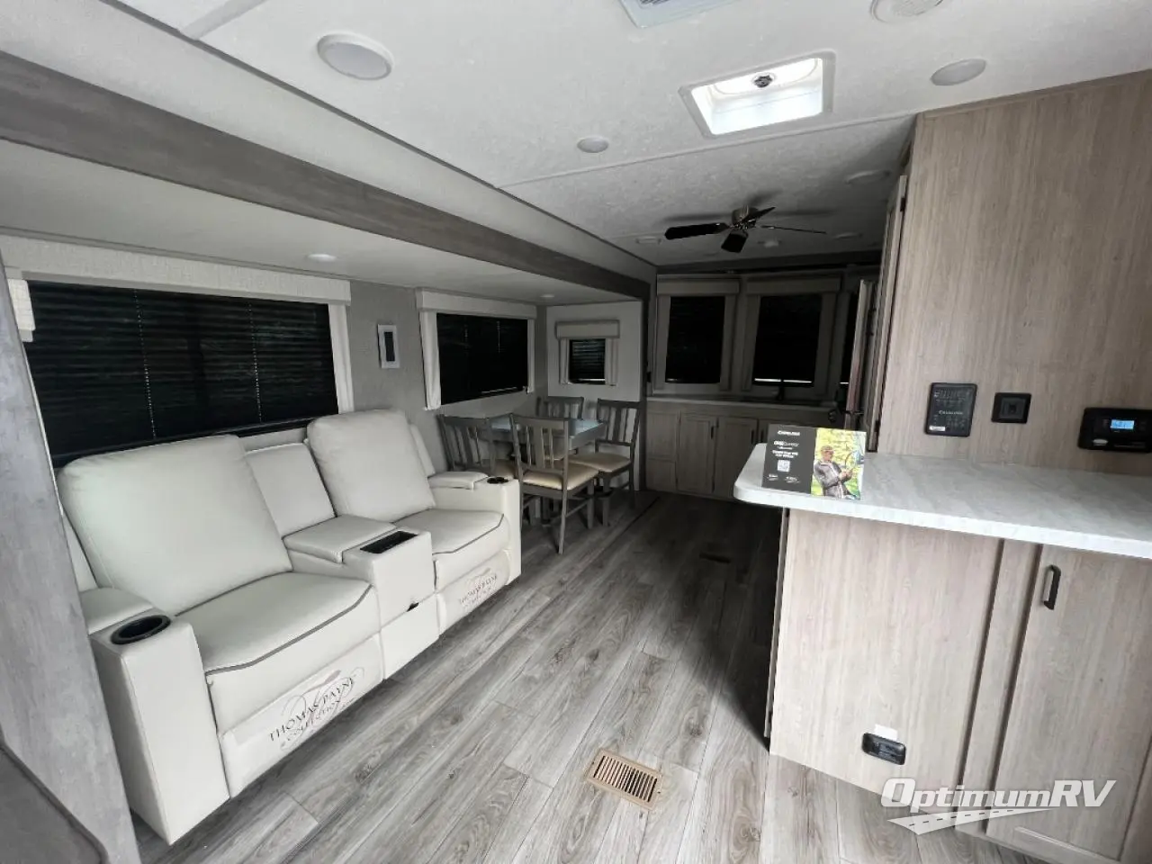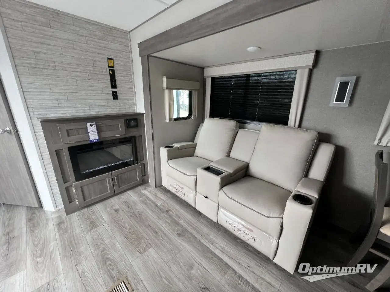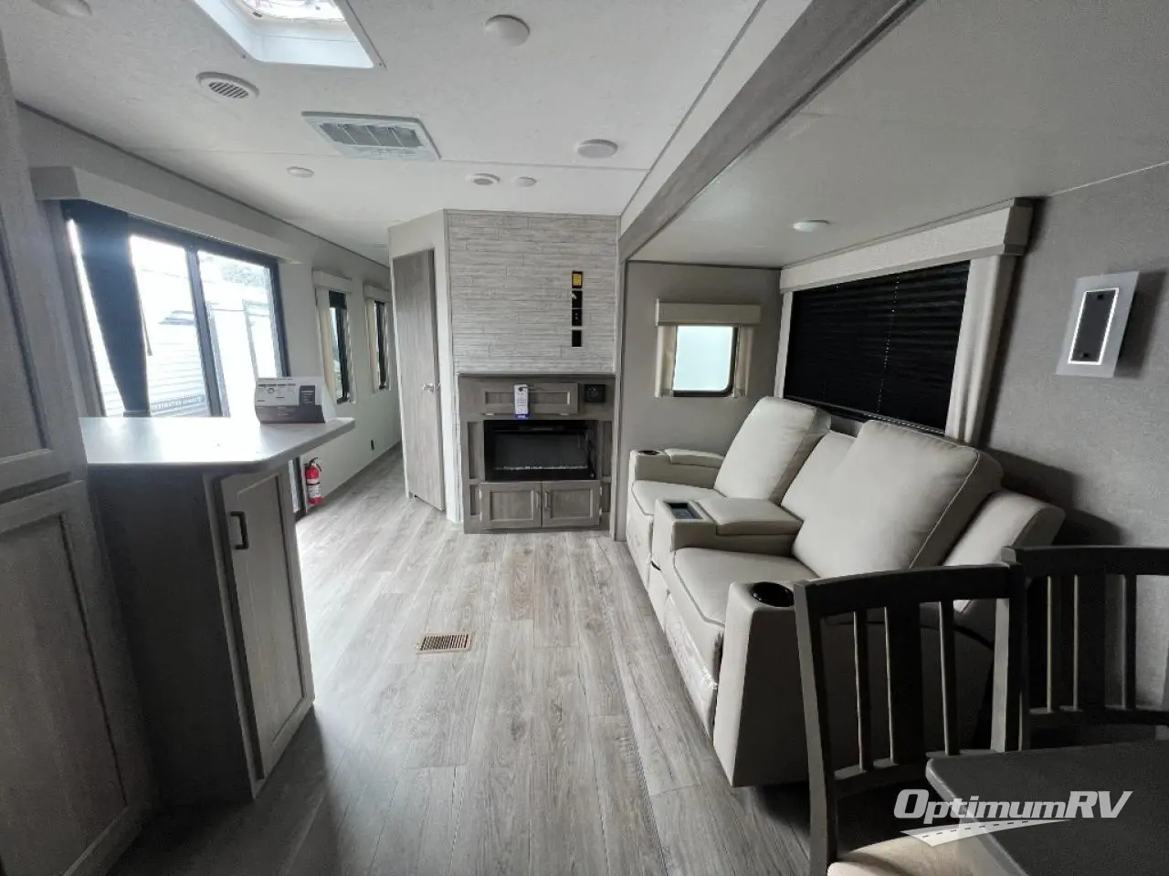 Pack up your clothes and groceries and head out for a long weekend at your own place with this destination trailer! You can enter through the main patio door or near the rear bedroom and full bathroom. You will find storage throughout in the wardrobes, linen cabinet, pantry and more! The kids will surely head to the middle bunkhouse featuring a jackknife sofa with a flip-up bunk and storage totes beneath. Someone will probably relax on the theater seating by the fireplace, or you can all play a game at the booth dinette. The ceiling fans will keep you cooler in the summer months along with the air conditioner. And the cook will love the front kitchen layout and all the appliances to keep everyone fed.