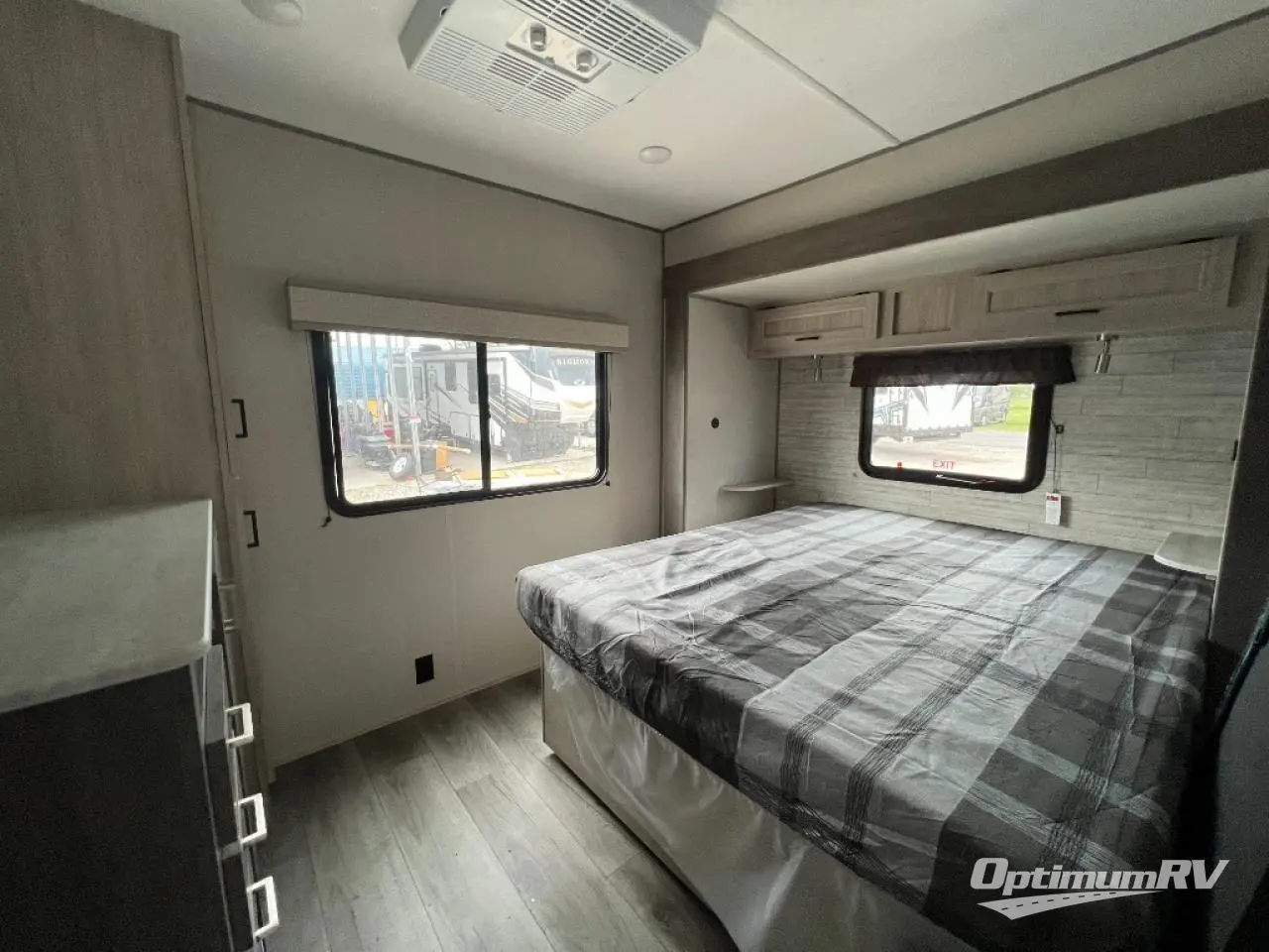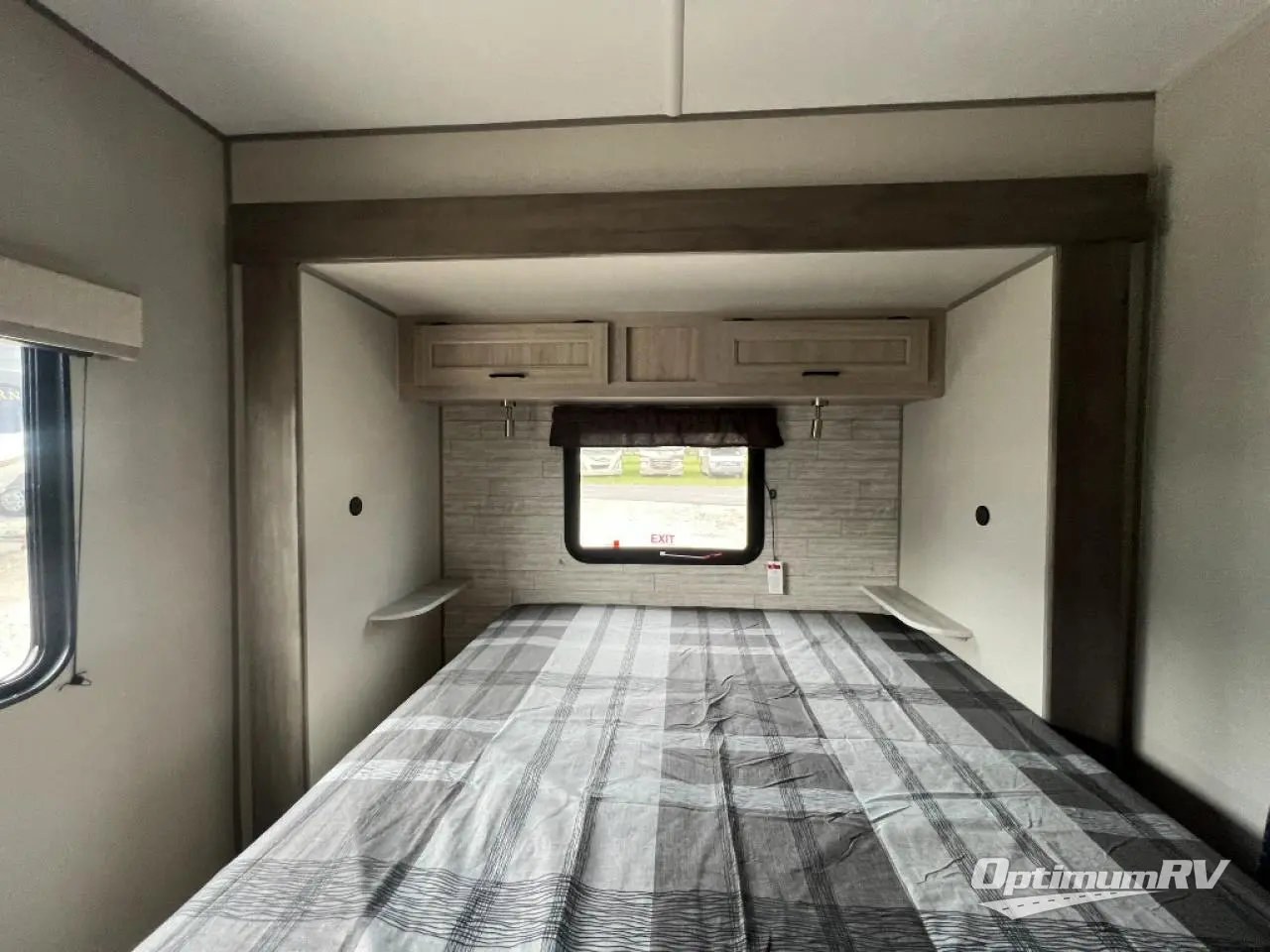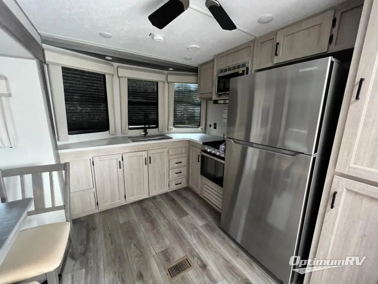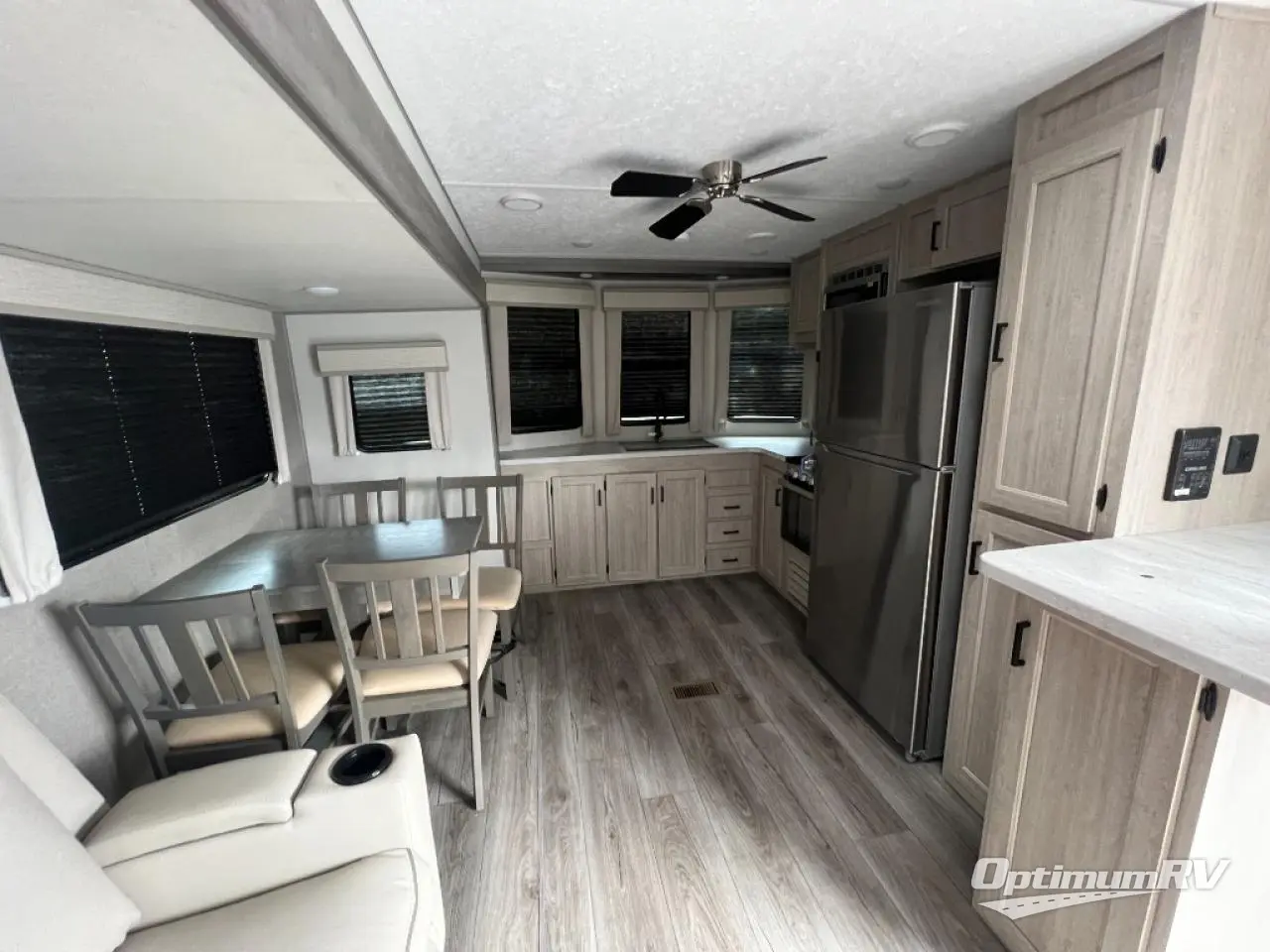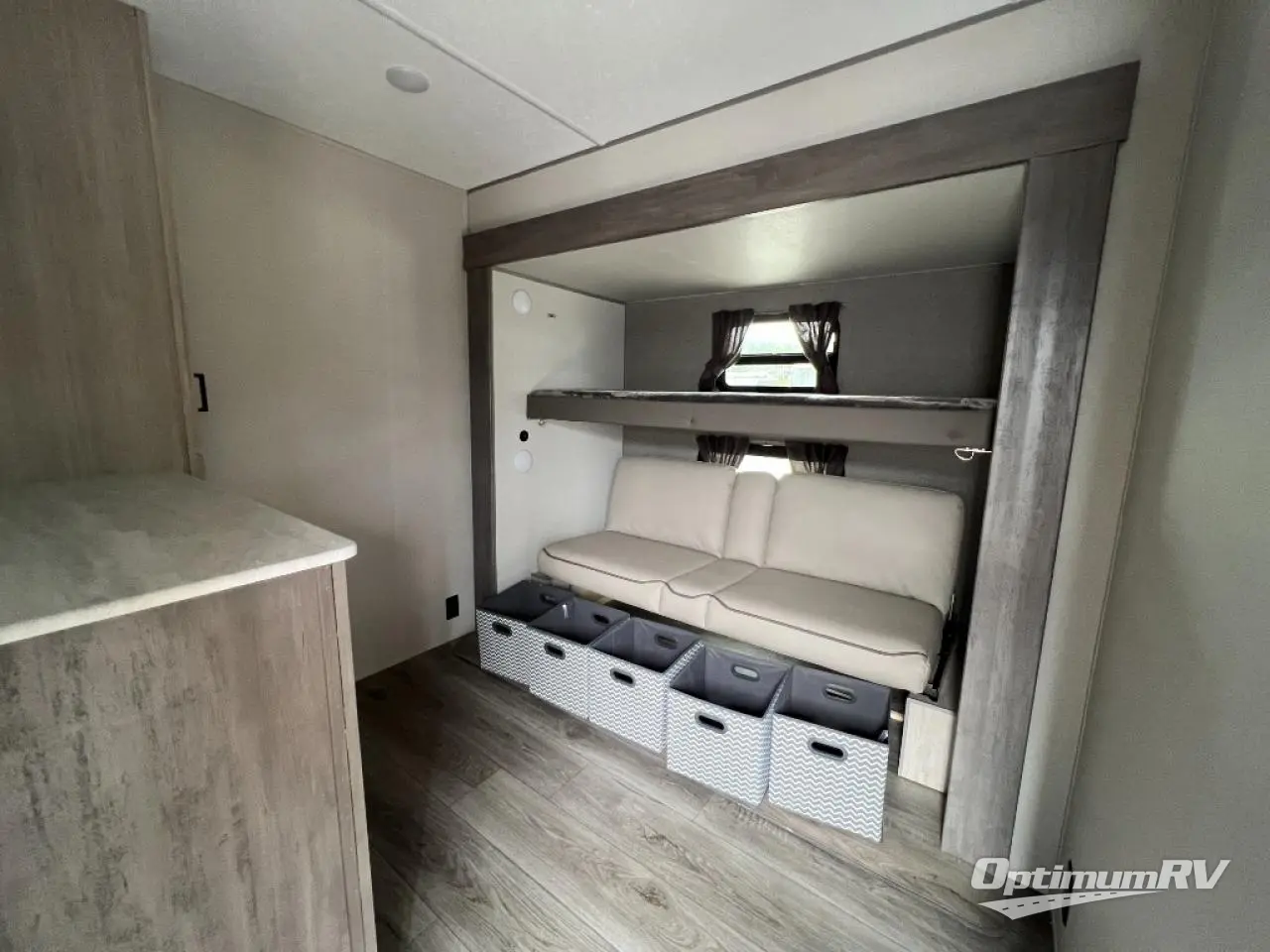 Pack up your clothes and groceries and head out for a long weekend at your own place with this destination trailer! You can enter through the main patio door or near the rear bedroom and full bathroom. You will find storage throughout in the wardrobes, linen cabinet, pantry and more! The kids will surely head to the middle bunkhouse featuring a jackknife sofa with a flip-up bunk and storage totes beneath. Someone will probably relax on the theater seating by the fireplace, or you can all play a game at the booth dinette. The ceiling fans will keep you cooler in the summer months along with the air conditioner. And the cook will love the front kitchen layout and all the appliances to keep everyone fed.
