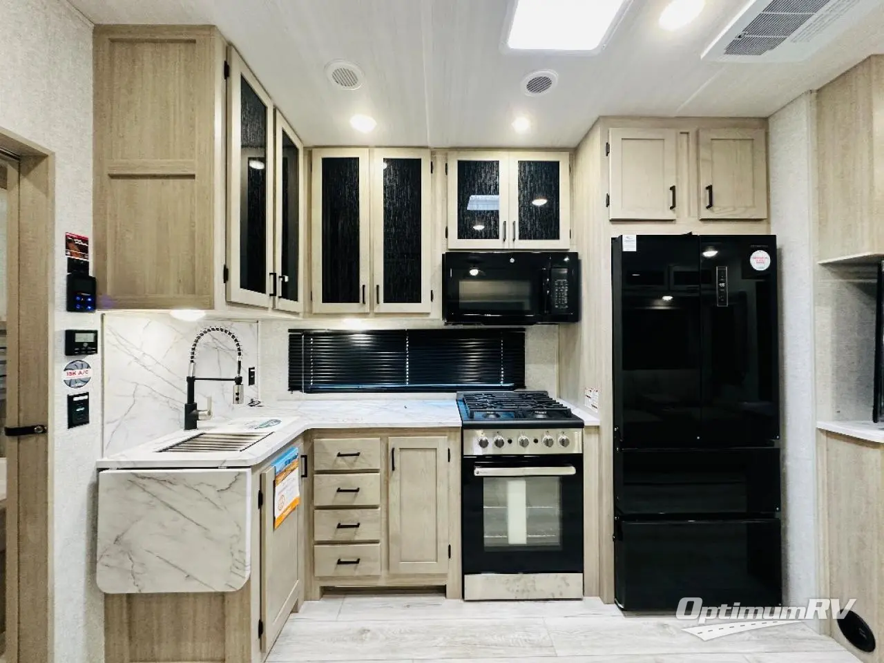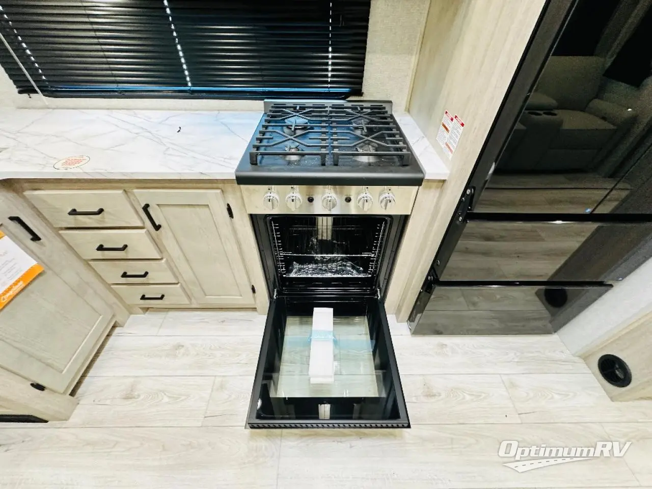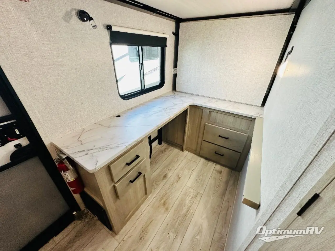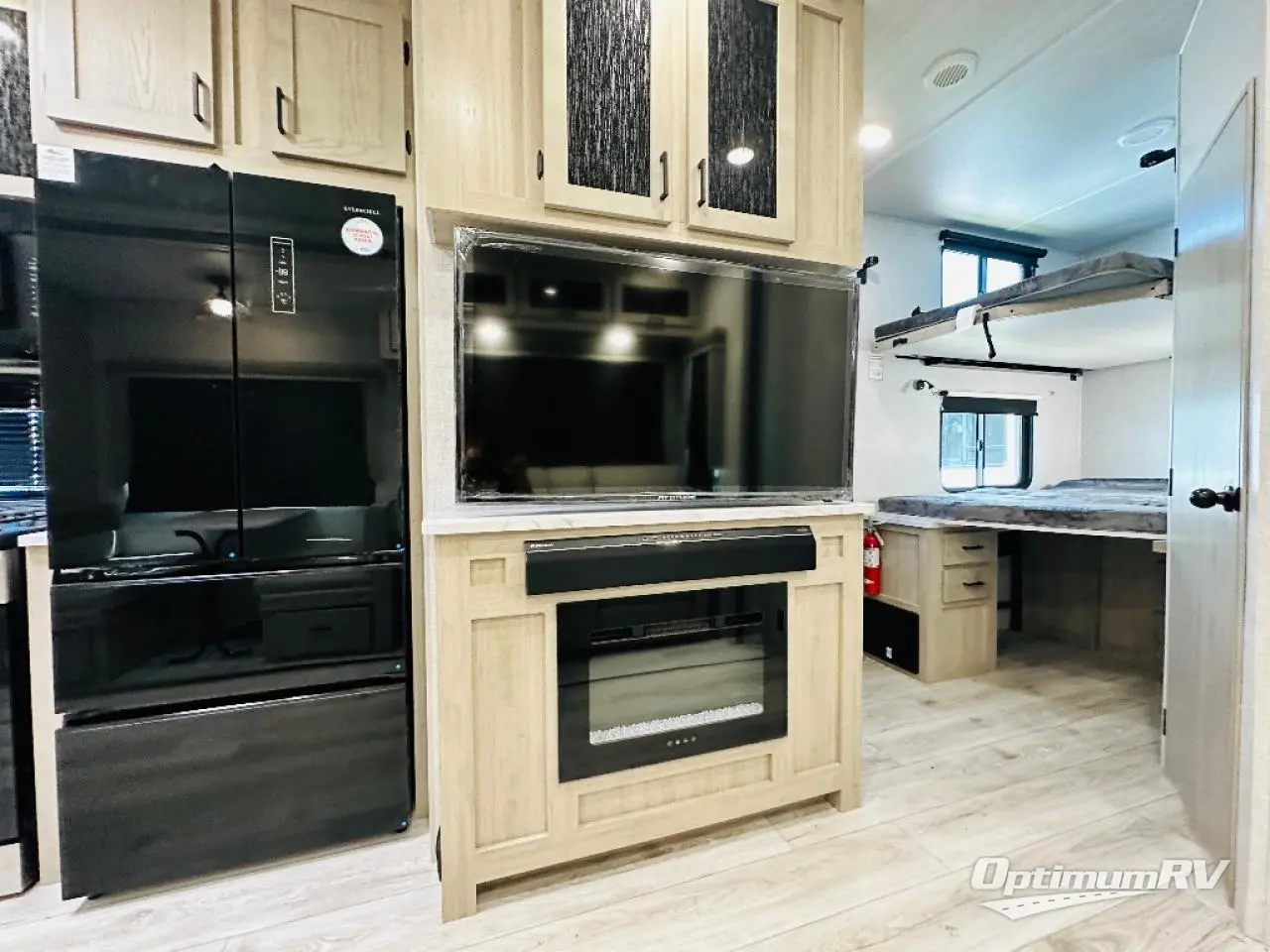 Head to the campground in this travel trailer! After you've unloaded the pass-through storage and set up the 21' power awning, start lunch by extending the countertop extension. You can get a good night's rest on the king bed in the front private bedroom and any extra guests can sleep on the stowable bunk system with a ladder above the office area which is also conveniently next to the rear corner bathroom. Across from the bunk system is a large closet with washer and dryer prep if you want the option to make laundry day easier. The free standing dinette has storage underneath and is right next to the pantry for easy snack grabbing. You also have a tri-fold sofa for extra sleeping space or you can switch it out for the optional theater seating.