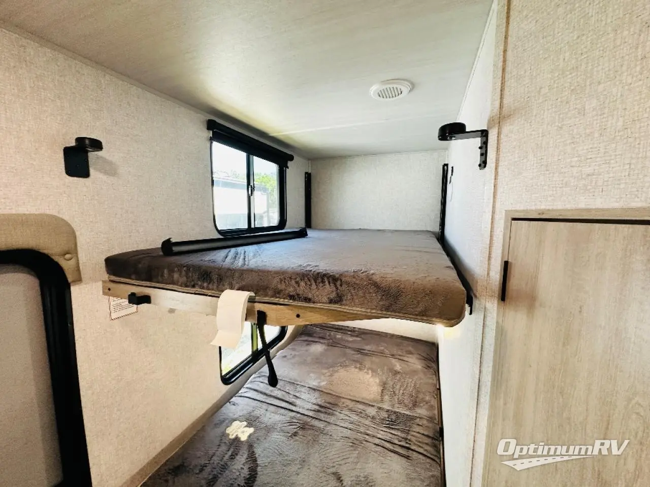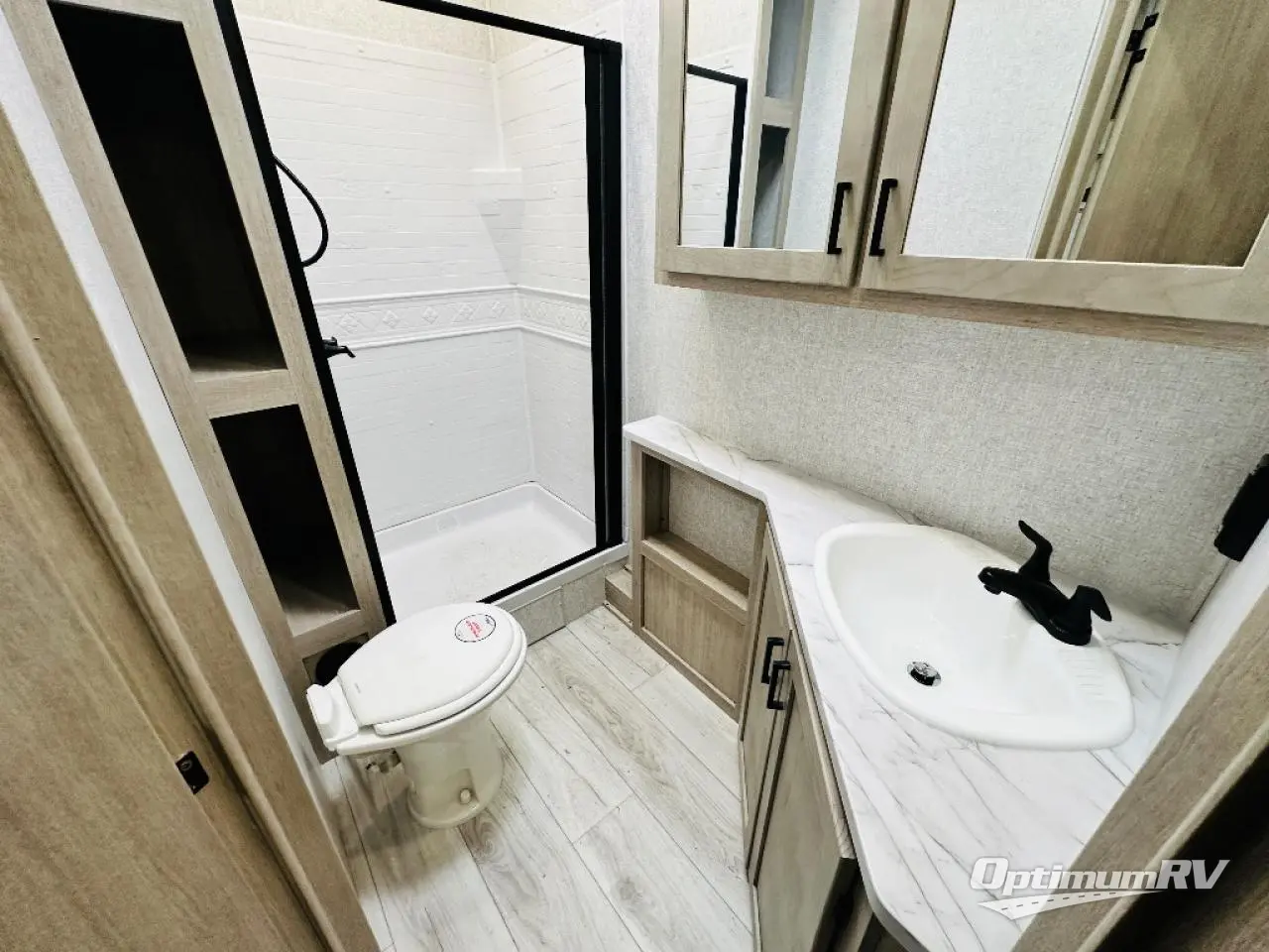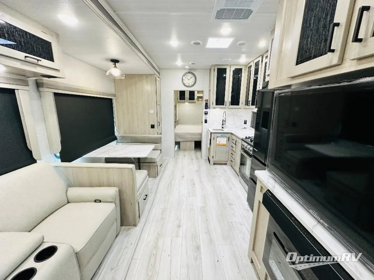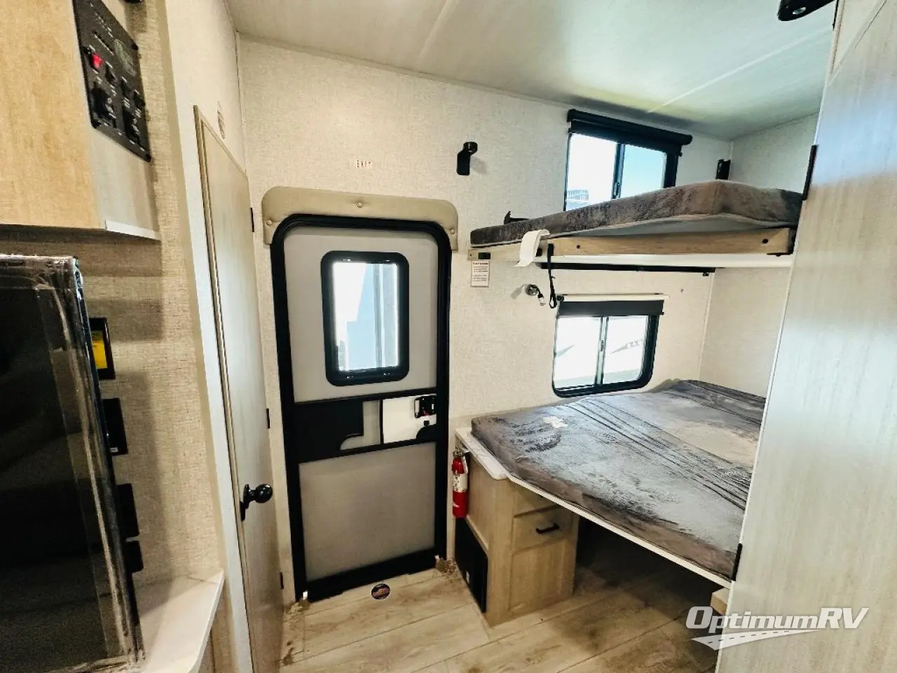Head to the campground in this travel trailer! After you've unloaded the pass-through storage and set up the 21' power awning, start lunch by extending the countertop extension. You can get a good night's rest on the king bed in the front private bedroom and any extra guests can sleep on the stowable bunk system with a ladder above the office area which is also conveniently next to the rear corner bathroom. Across from the bunk system is a large closet with washer and dryer prep if you want the option to make laundry day easier. The free standing dinette has storage underneath and is right next to the pantry for easy snack grabbing. You also have a tri-fold sofa for extra sleeping space or you can switch it out for the optional theater seating.