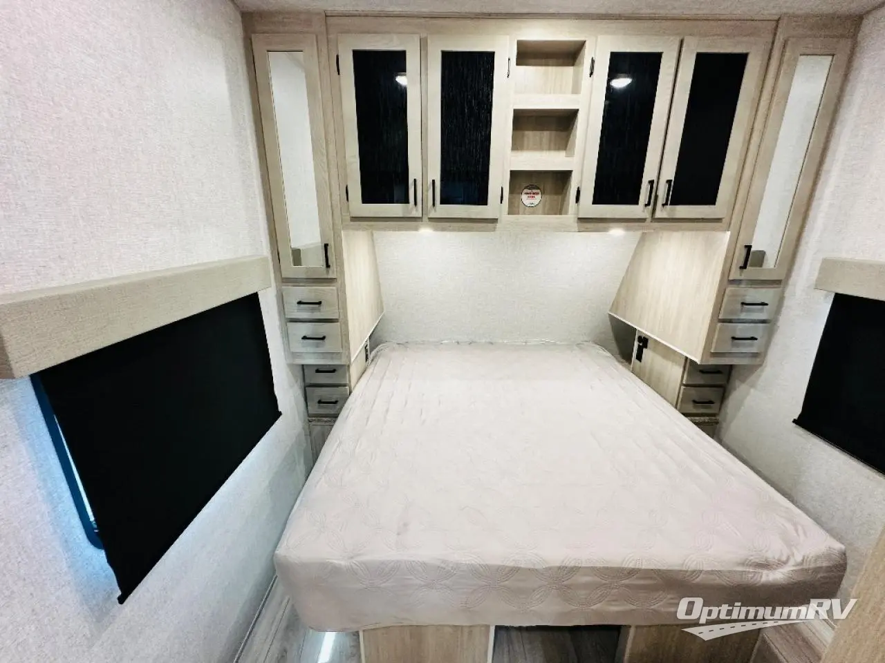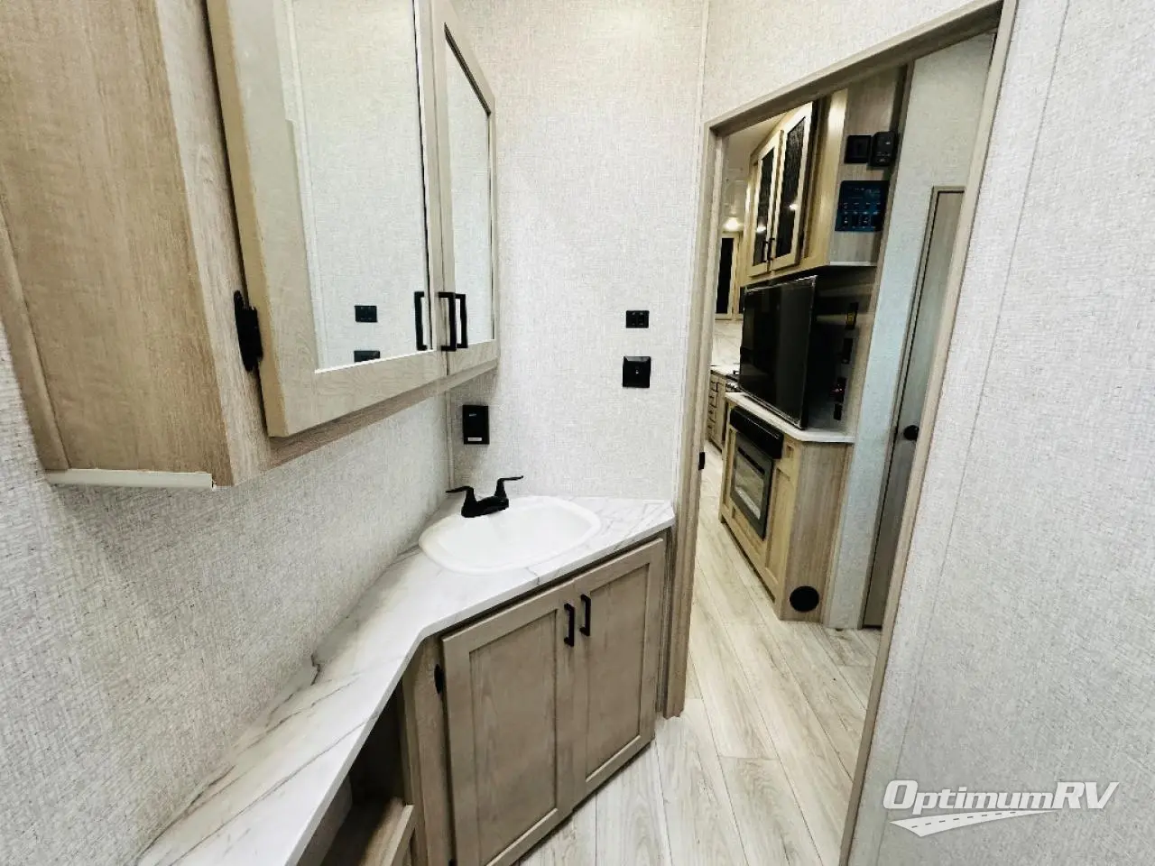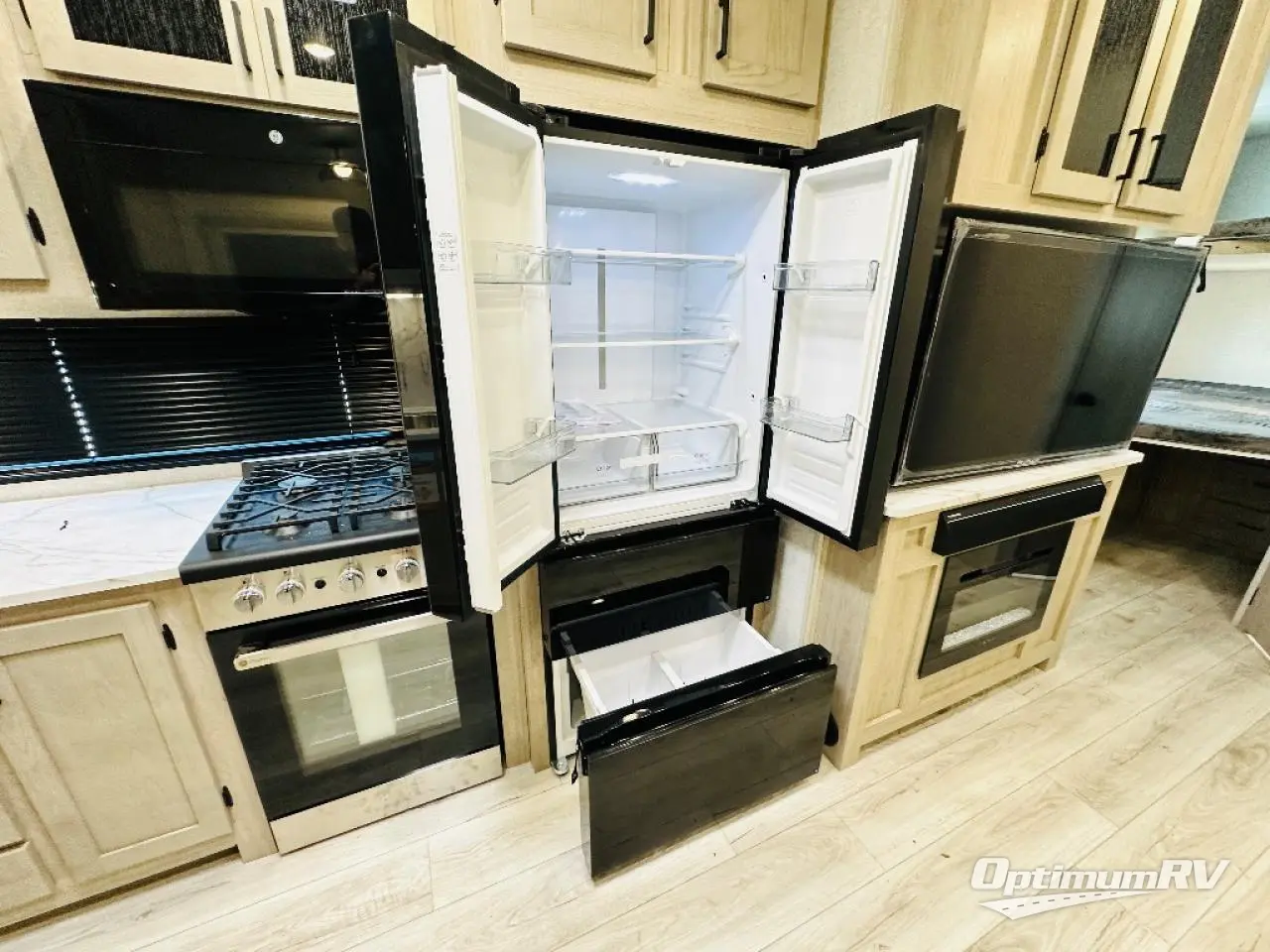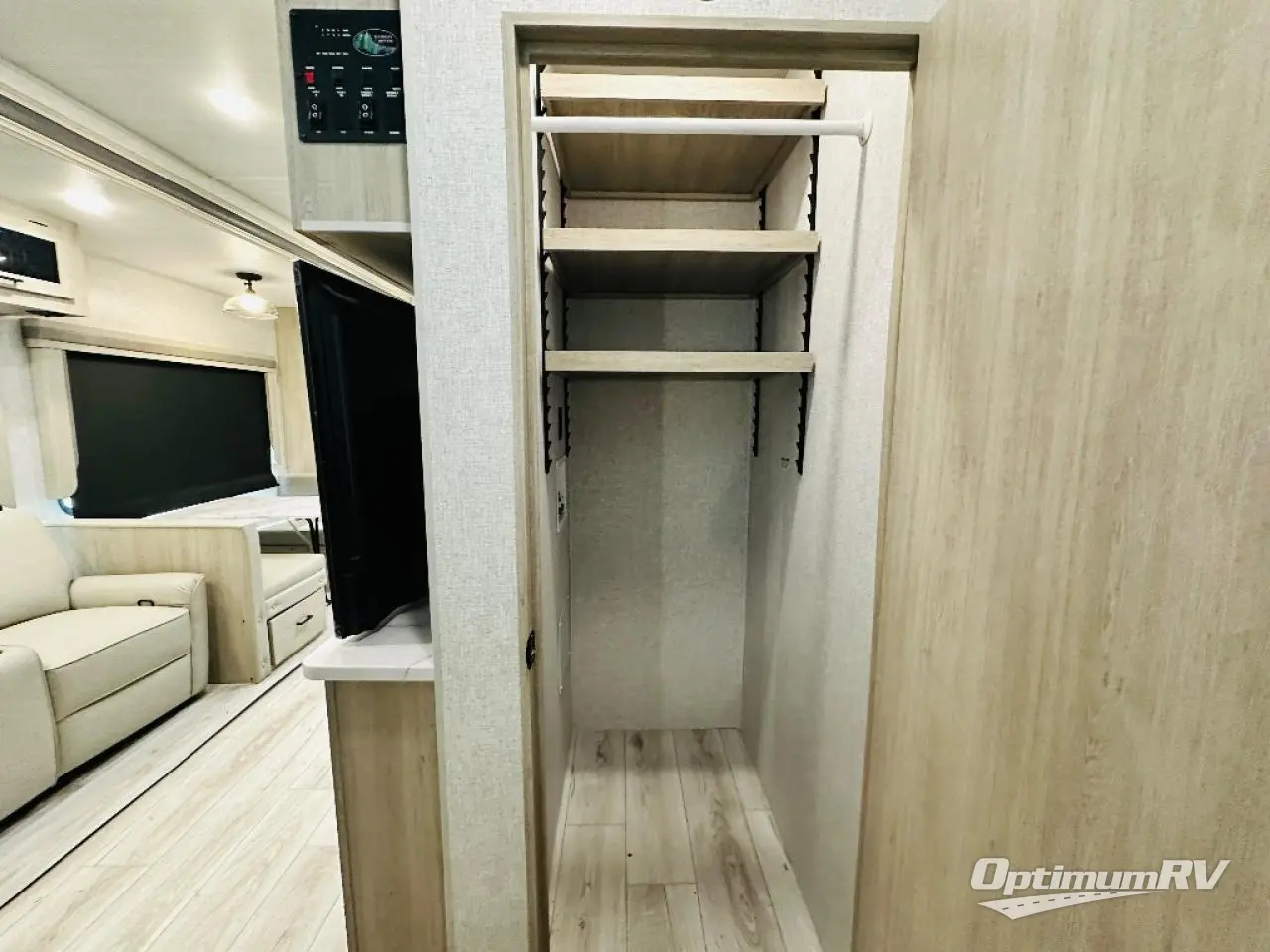 Head to the campground in this travel trailer! After you've unloaded the pass-through storage and set up the 21' power awning, start lunch by extending the countertop extension. You can get a good night's rest on the king bed in the front private bedroom and any extra guests can sleep on the stowable bunk system with a ladder above the office area which is also conveniently next to the rear corner bathroom. Across from the bunk system is a large closet with washer and dryer prep if you want the option to make laundry day easier. The free standing dinette has storage underneath and is right next to the pantry for easy snack grabbing. You also have a tri-fold sofa for extra sleeping space or you can switch it out for the optional theater seating.
