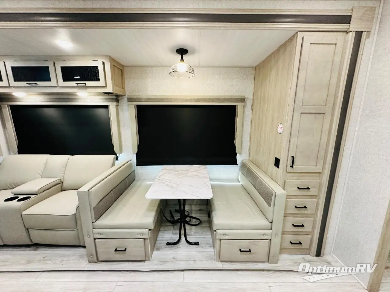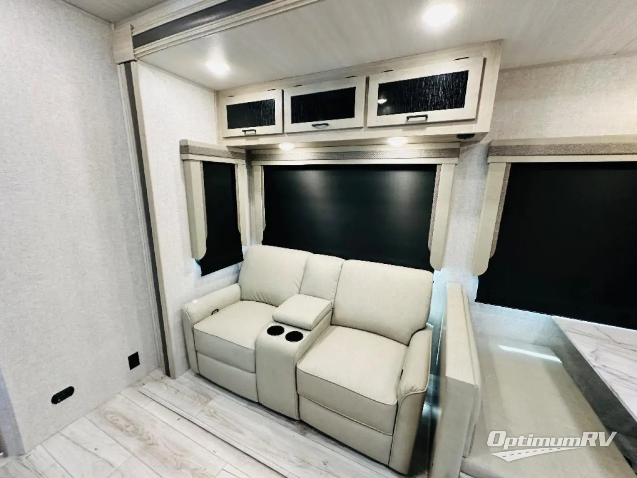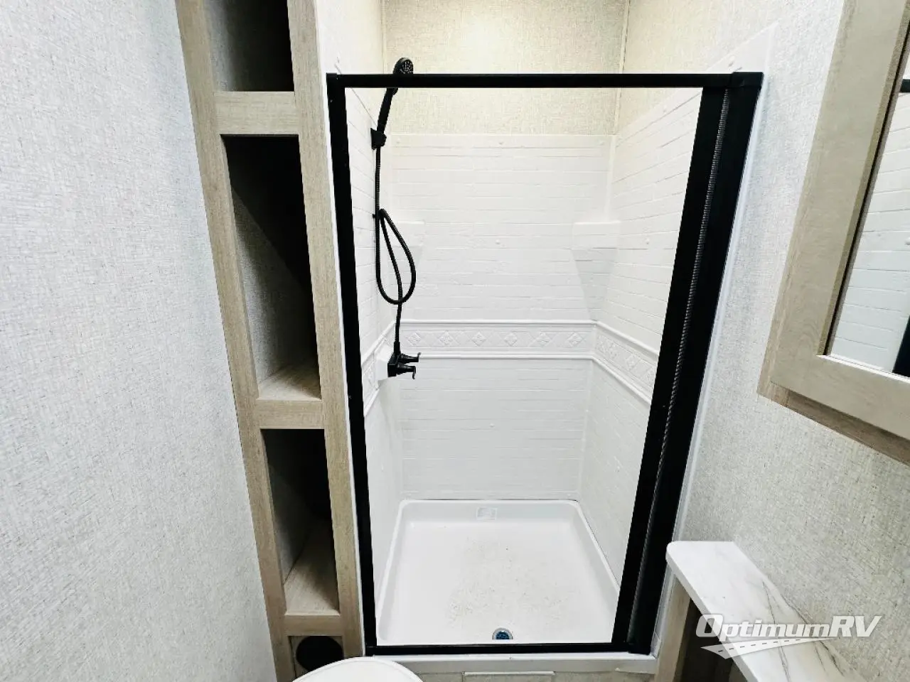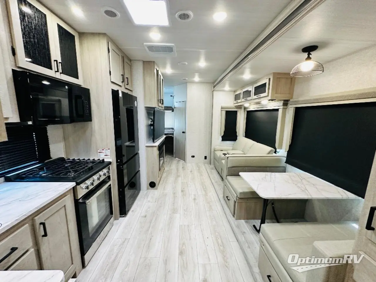 Head to the campground in this travel trailer! After you've unloaded the pass-through storage and set up the 21' power awning, start lunch by extending the countertop extension. You can get a good night's rest on the king bed in the front private bedroom and any extra guests can sleep on the stowable bunk system with a ladder above the office area which is also conveniently next to the rear corner bathroom. Across from the bunk system is a large closet with washer and dryer prep if you want the option to make laundry day easier. The free standing dinette has storage underneath and is right next to the pantry for easy snack grabbing. You also have a tri-fold sofa for extra sleeping space or you can switch it out for the optional theater seating.