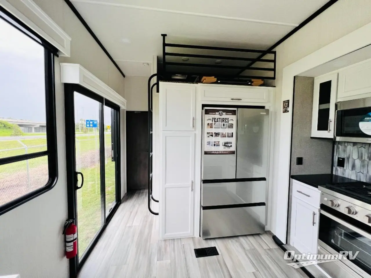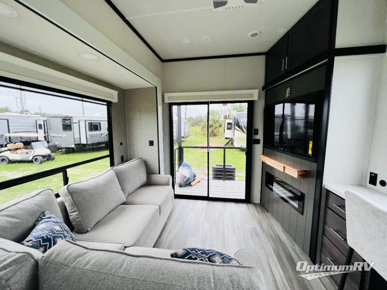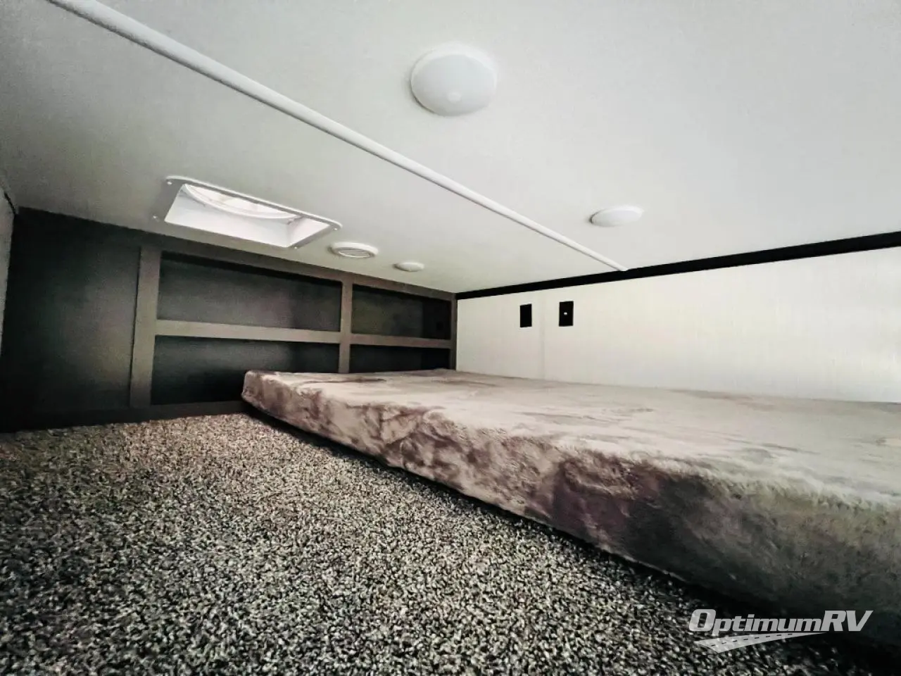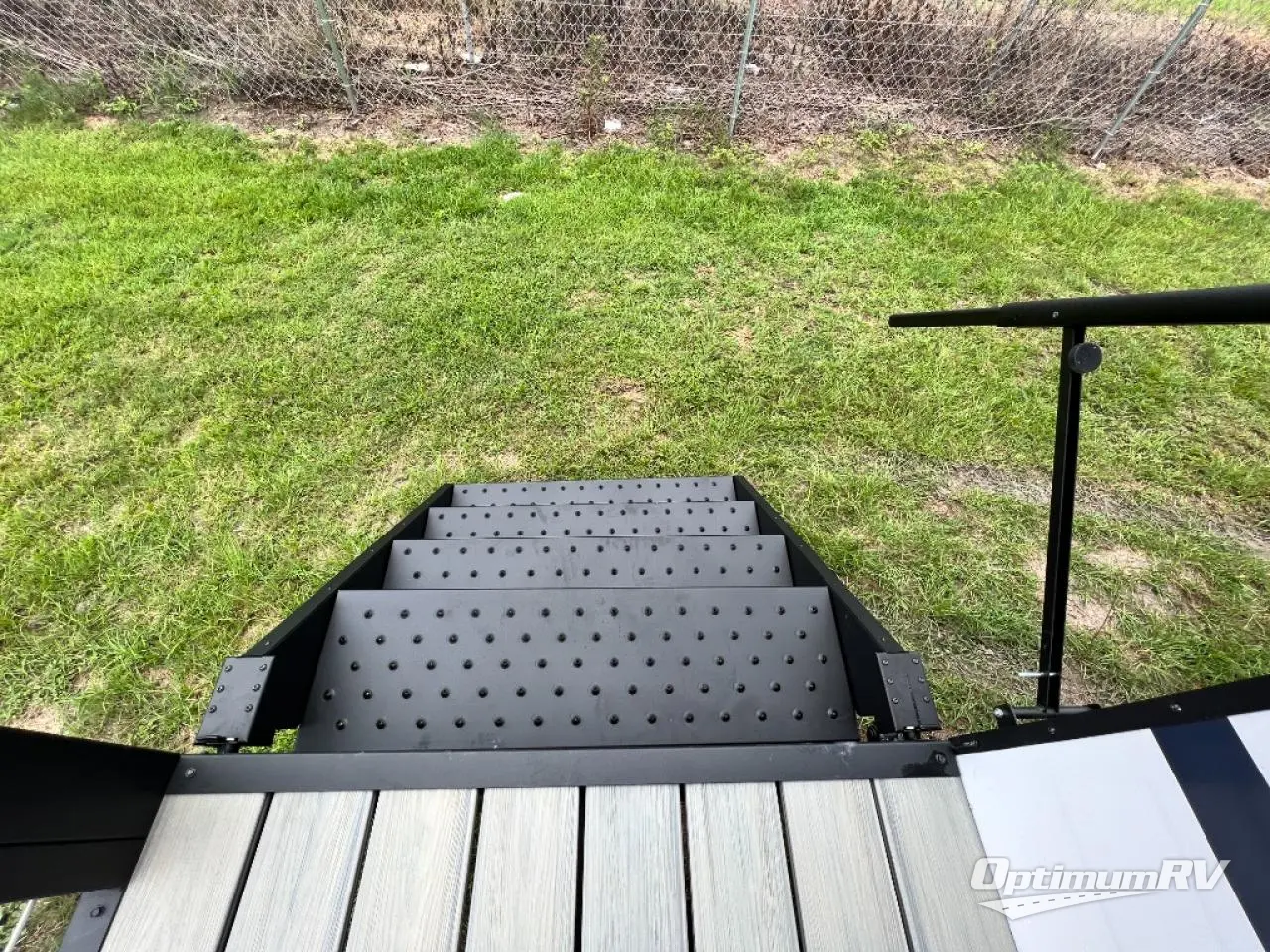 If you need more sleeping or storage space, this destination trailer is the one for you! There is a front covered porch with sliding glass doors that enters in to the front living area. Here, you'll enjoy relaxing on the sectional hide-a-bed sofa across from the entertainment center and fireplace. The spacious bar top with two seats will provide a place to dine, and the middle kitchen is any chef's dream with its two pantries, spacious 20 cu. ft. 12V refrigerator, and plenty of counter space! When you're ready for your own space, you can retreat to the rear bedroom where you'll find a king bed slide out, a wardrobe, a dresser, drawers, and even washer and dryer prep. The comfort doesn't stop there! There is also a loft above the full bath that includes a ladder and a mattress, so you can use this space for more sleeping or storage space!