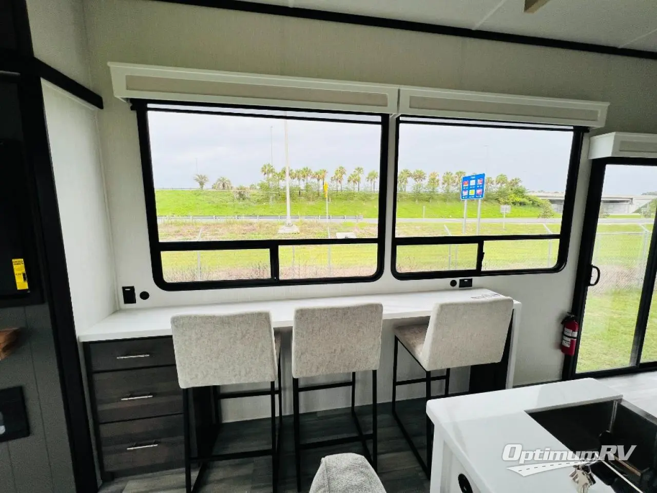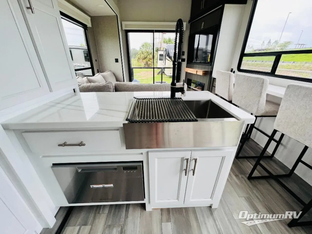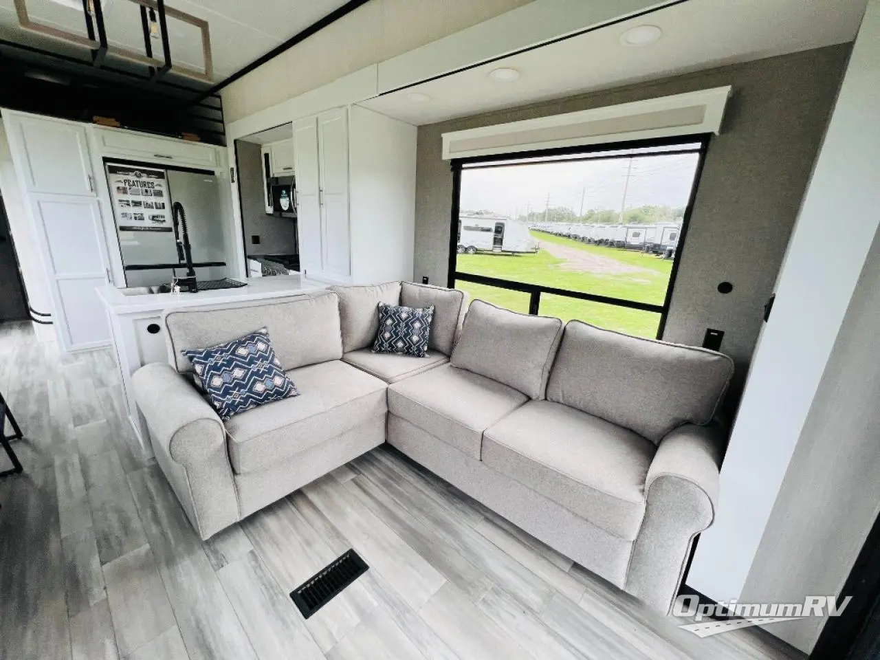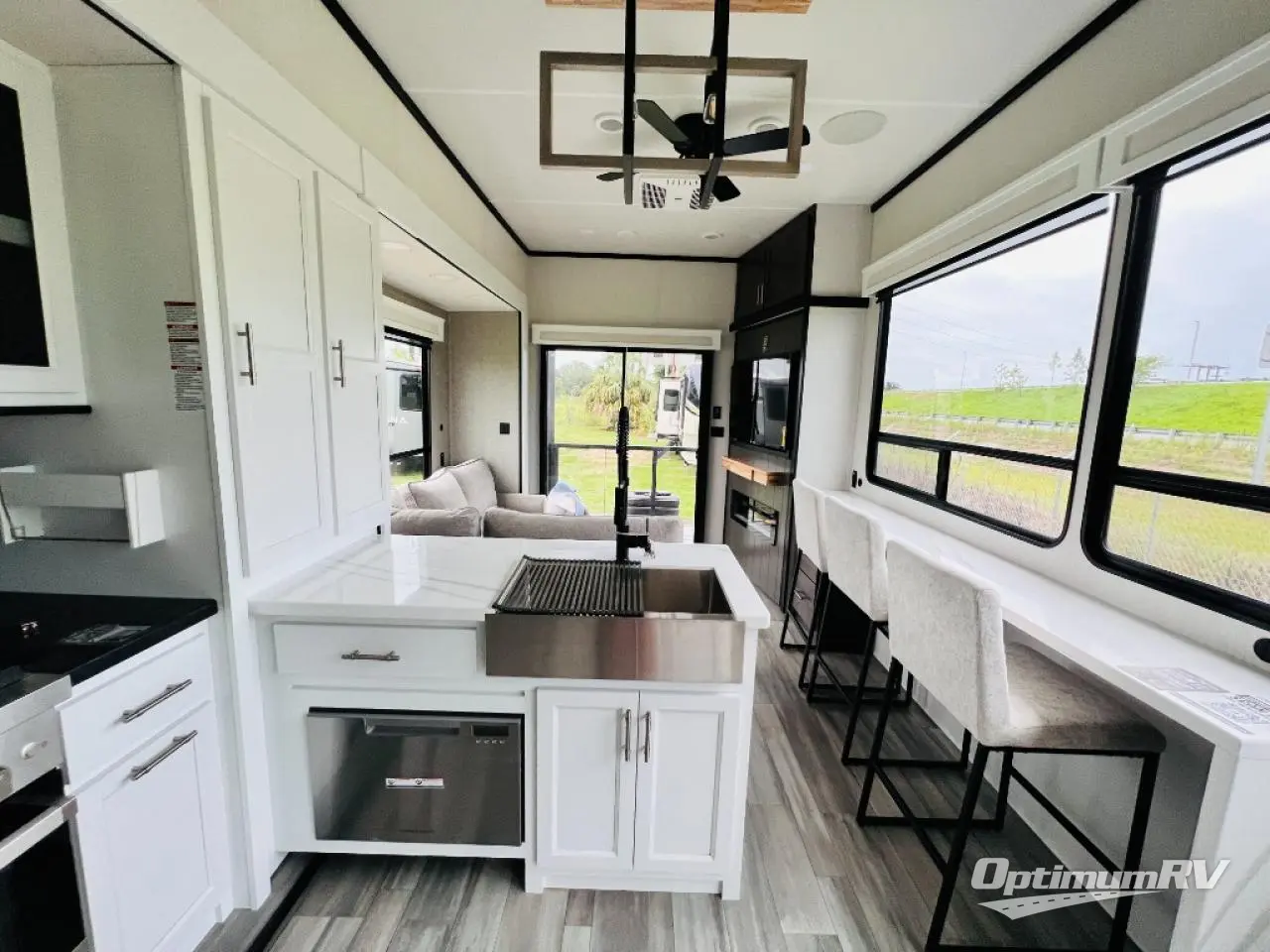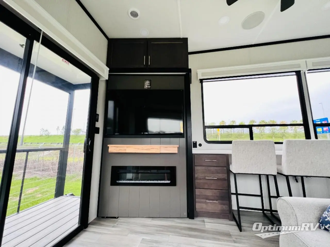 If you need more sleeping or storage space, this destination trailer is the one for you! There is a front covered porch with sliding glass doors that enters in to the front living area. Here, you'll enjoy relaxing on the sectional hide-a-bed sofa across from the entertainment center and fireplace. The spacious bar top with two seats will provide a place to dine, and the middle kitchen is any chef's dream with its two pantries, spacious 20 cu. ft. 12V refrigerator, and plenty of counter space! When you're ready for your own space, you can retreat to the rear bedroom where you'll find a king bed slide out, a wardrobe, a dresser, drawers, and even washer and dryer prep. The comfort doesn't stop there! There is also a loft above the full bath that includes a ladder and a mattress, so you can use this space for more sleeping or storage space!