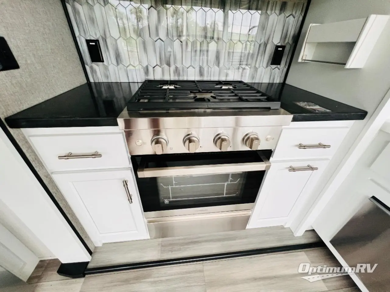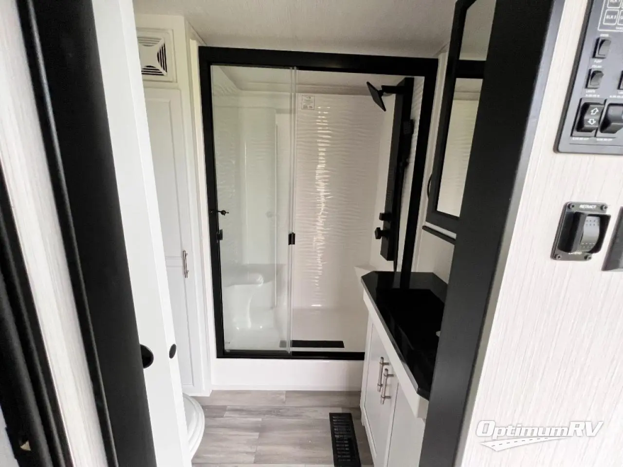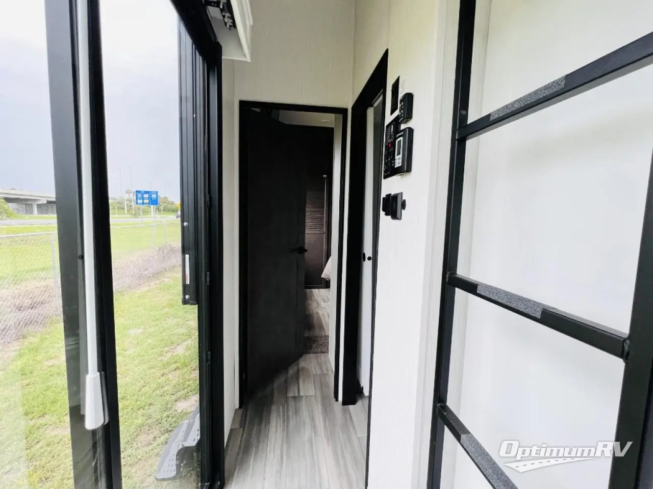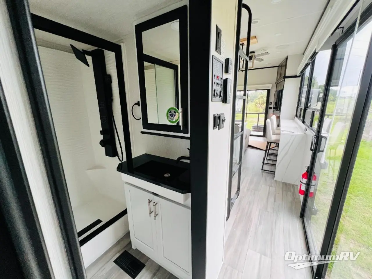 If you need more sleeping or storage space, this destination trailer is the one for you! There is a front covered porch with sliding glass doors that enters in to the front living area. Here, you'll enjoy relaxing on the sectional hide-a-bed sofa across from the entertainment center and fireplace. The spacious bar top with two seats will provide a place to dine, and the middle kitchen is any chef's dream with its two pantries, spacious 20 cu. ft. 12V refrigerator, and plenty of counter space! When you're ready for your own space, you can retreat to the rear bedroom where you'll find a king bed slide out, a wardrobe, a dresser, drawers, and even washer and dryer prep. The comfort doesn't stop there! There is also a loft above the full bath that includes a ladder and a mattress, so you can use this space for more sleeping or storage space!