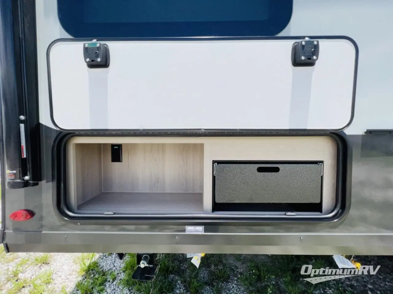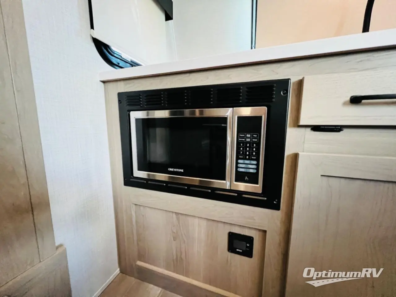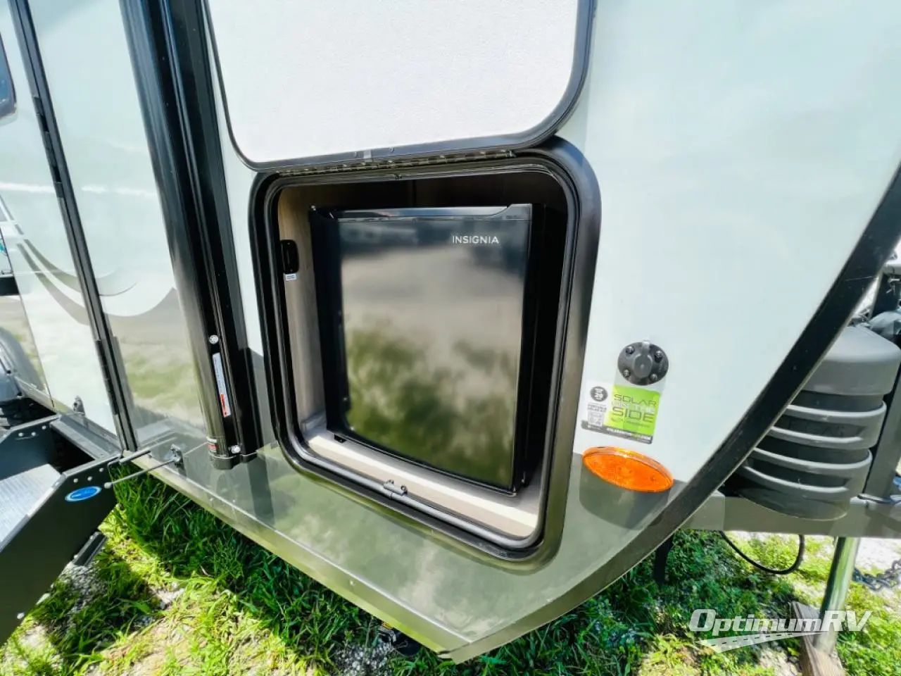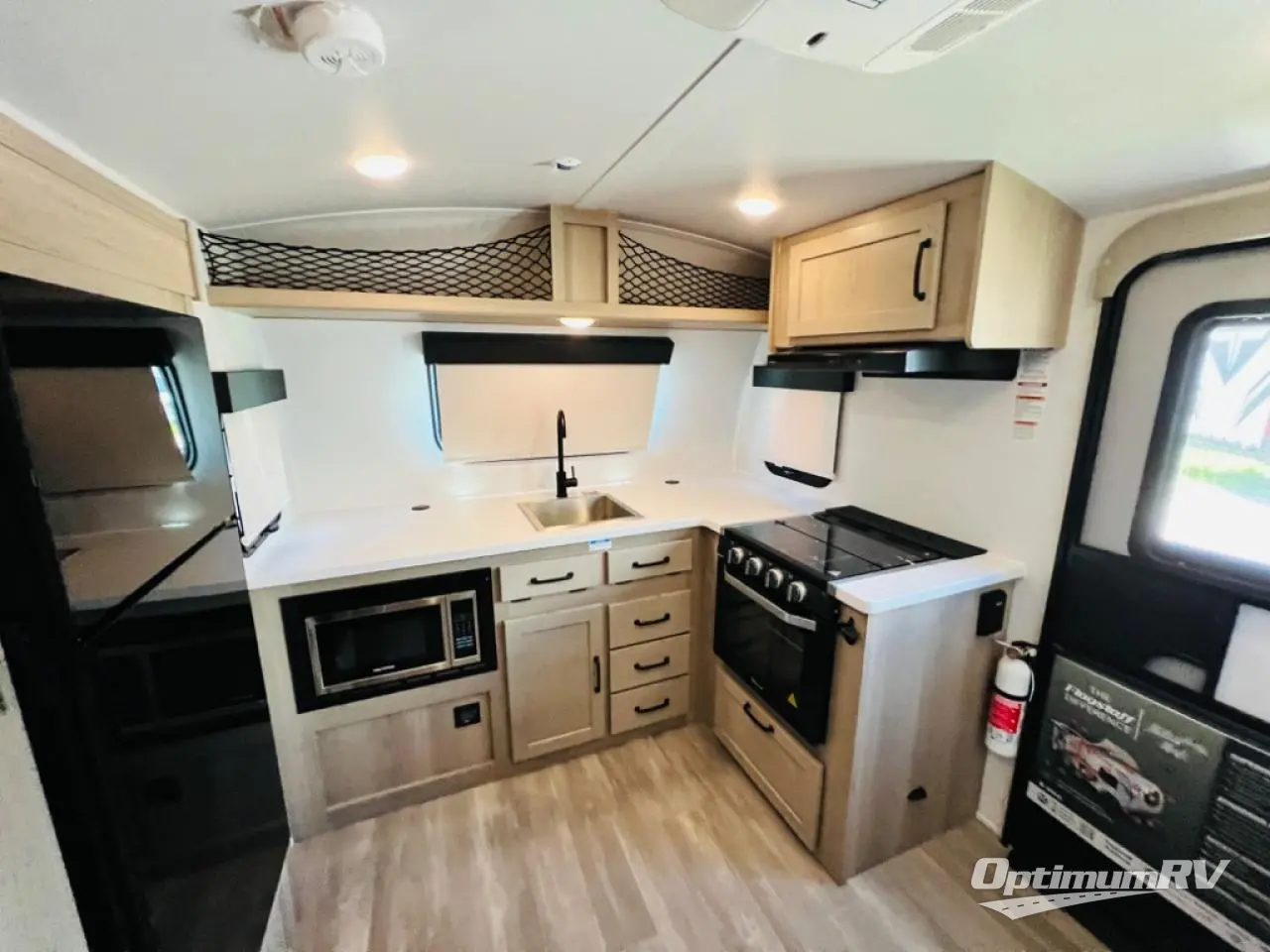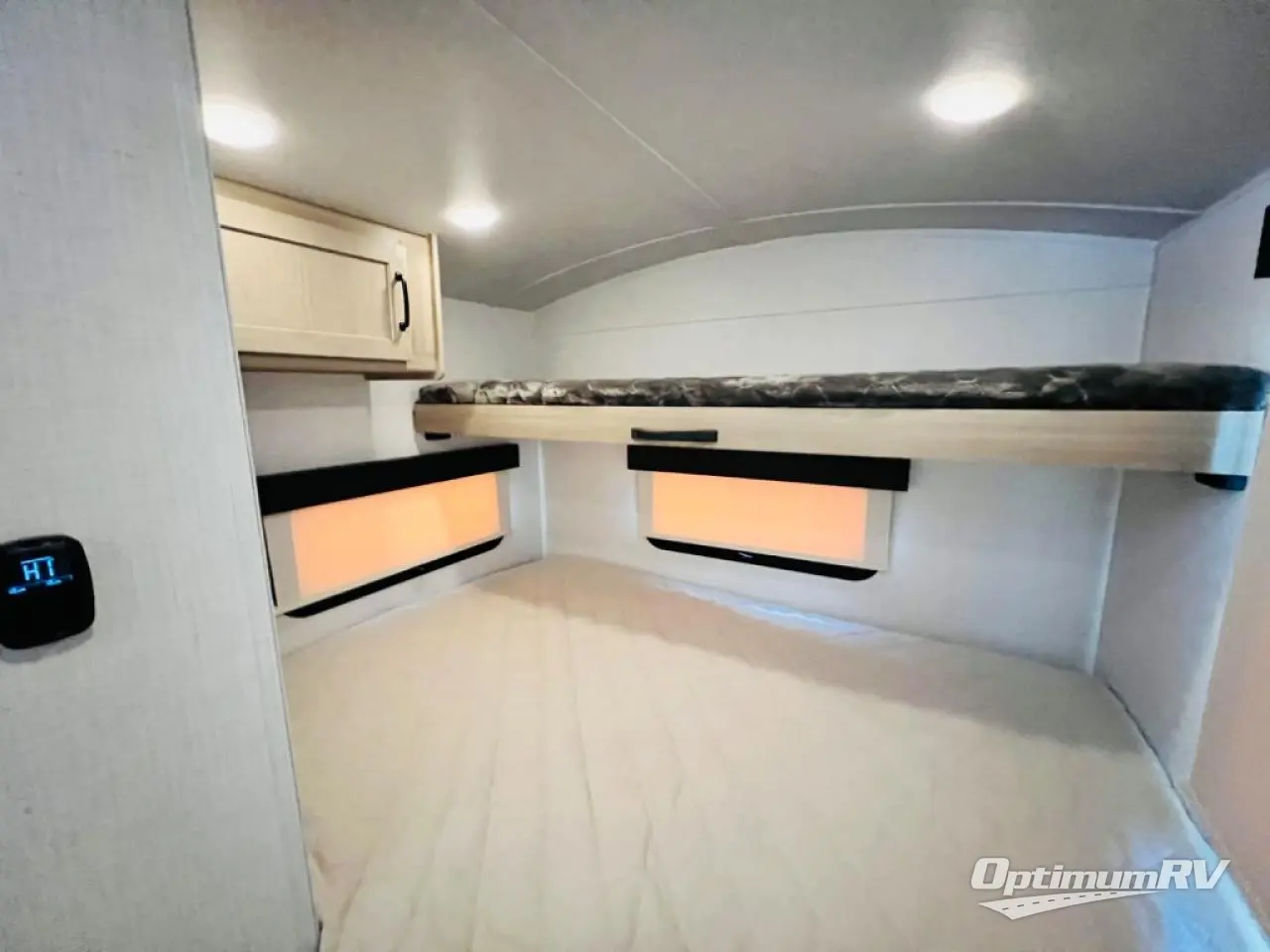 The chef will love cooking in the front kitchen of this travel trailer! It offers plenty of countertop space to meal prep and all of the essentials to cook delicious meals, plus there is even an outside kitchen with a refrigerator, a pull-out stove, and a griddle to fry what you caught that day. Enjoy all of your meals at the 72" sofa slide with a table or pull up a table and chairs under the 15' power awning. The queen bed offers a comfortable place for you to rest up each night and it even has a 26" x 80" flip-up bunk above it for a guest or two to tag along. Store all of your camping essentials in the exterior storage and rinse your feet off with the outside spray port after a fun day at the beach!