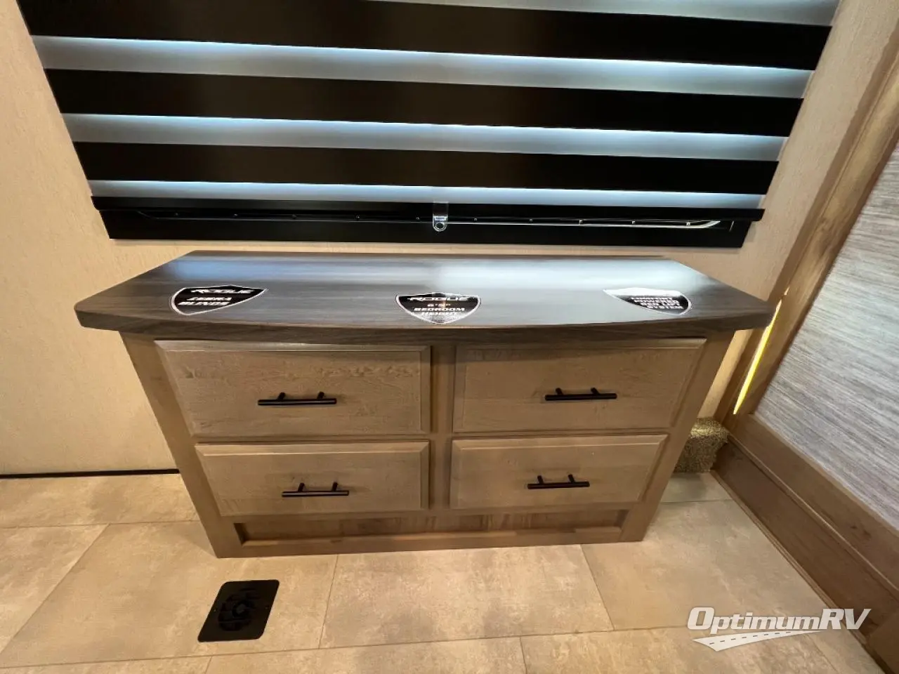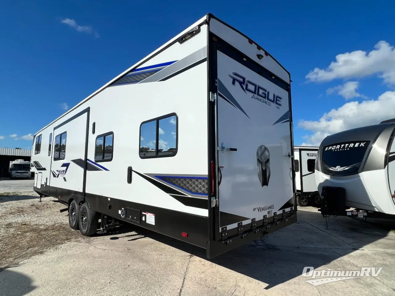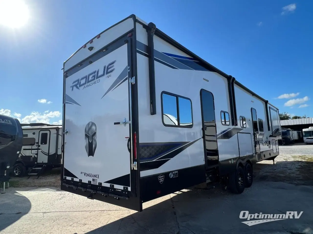 Every one of these Forest River Vengeance Rogue Armored fifth wheel toy haulers come with the features you want most at an affordable price tag! The DuraPoxy gas/oil resistant floor has 5,000 lb. tie downs to ensure your toys will arrive safely without damaging the flooring, plus the 3,000 lb. rated ramp door makes it easy to load them. Two 15,000 BTU A/Cs are "Super H Ducted" to keep you cool even on the hottest summer days, and an enclosed and heated underbelly keeps your unit's vitals protected all year long. The Rogue Armored package comes with a six point leveling system, a comfort plus adjustable powered king bed system, and a ramp door patio rail system. There are also two additional packages packed with features to make camping hassle-free!