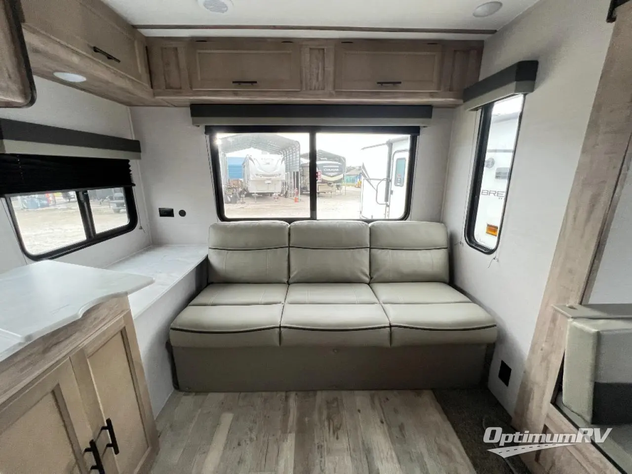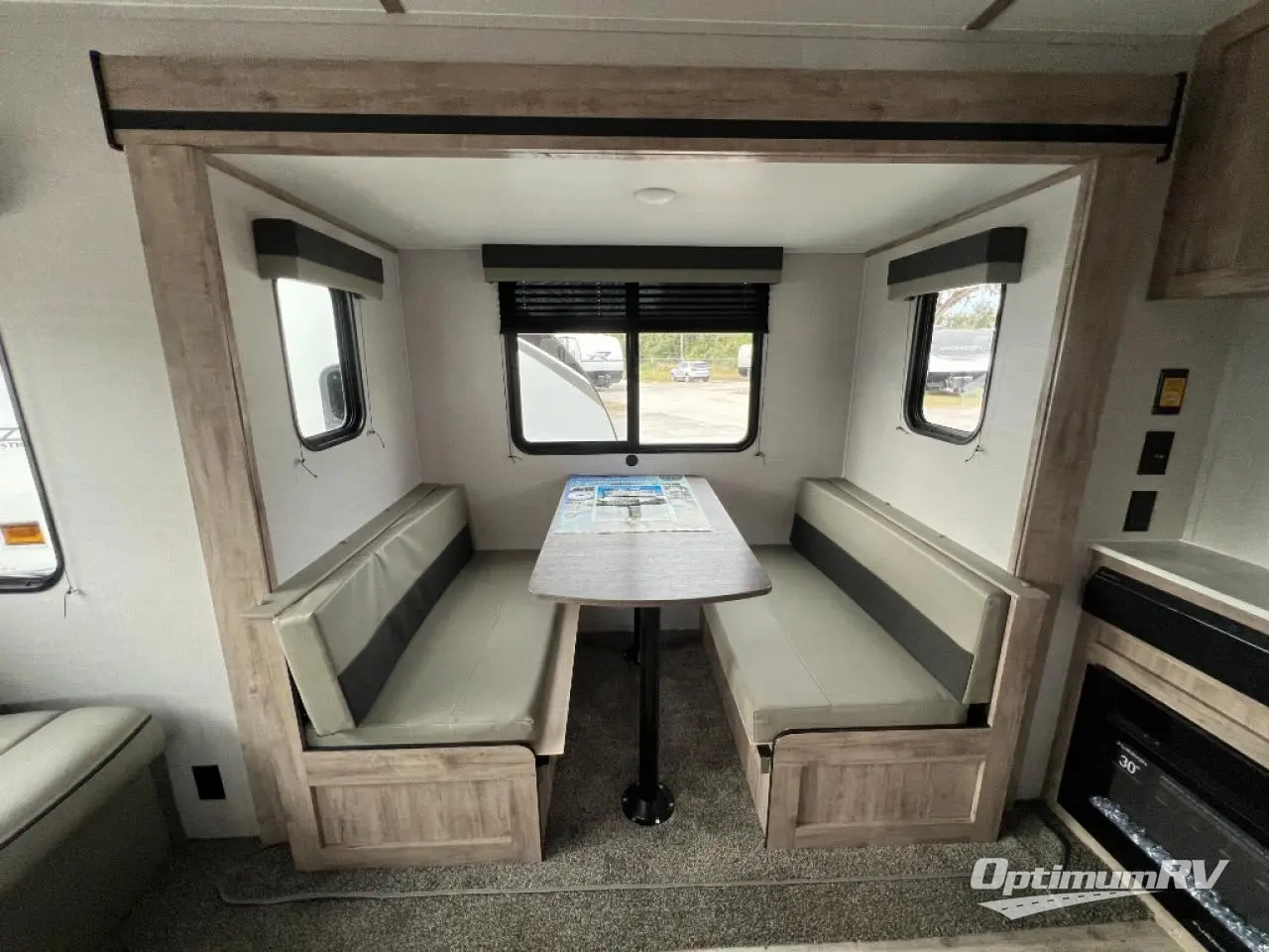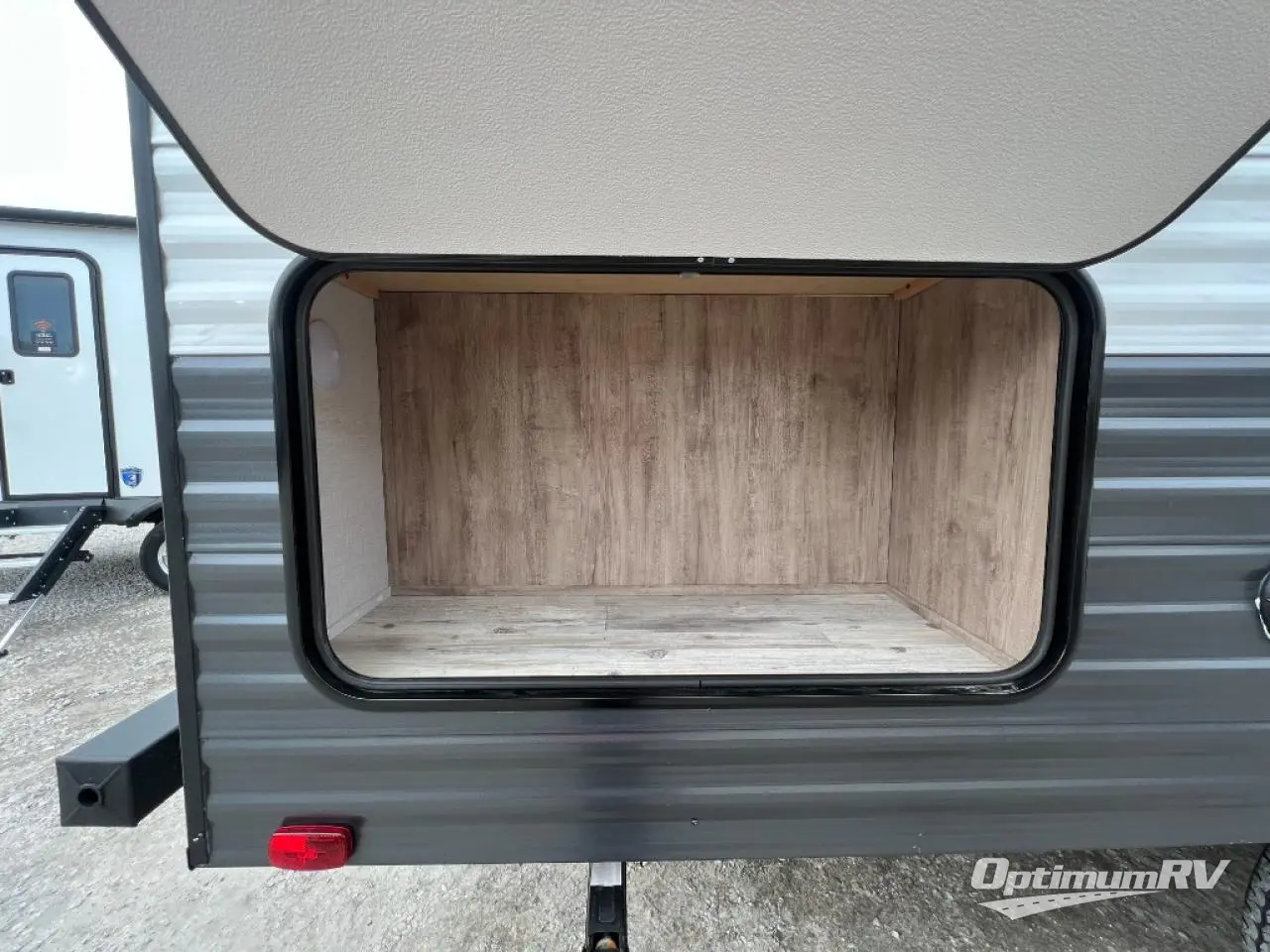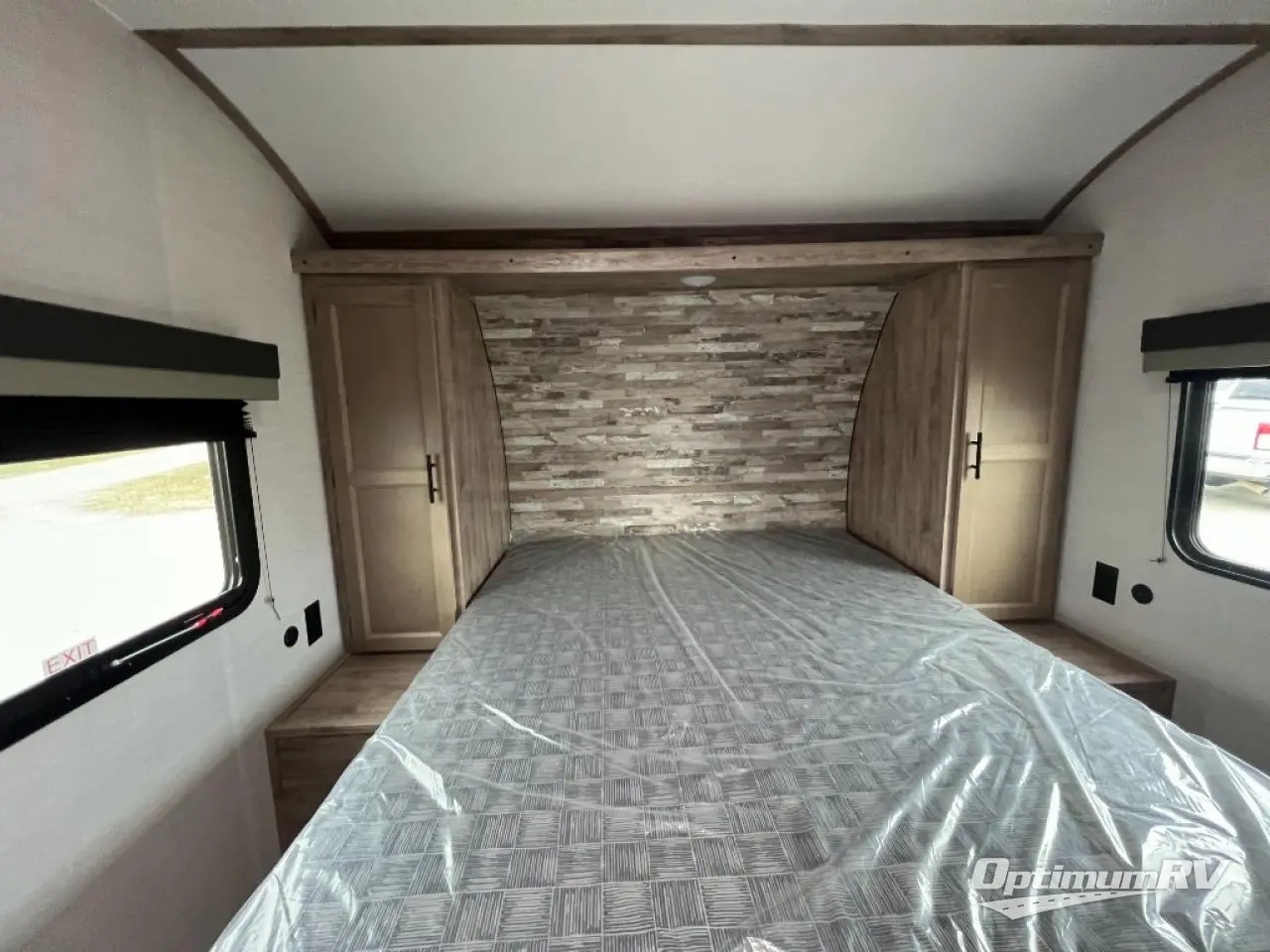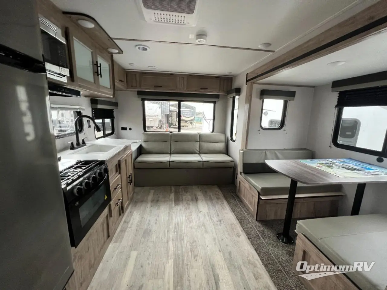 Camping with friends has never been so easy than in this cozy travel trailer. Once you arrive at your destination, prepare lunch on the three burner cooktop and you can dine at the booth dinette. Your guest can make this area their bed at night, along with the jack knife sofa. There is a front master bedroom with a queen bed that will feel just like home, and the two wardrobes provide a place for all your clothes. Head outside to find a pass-through storage, additional outside storage, plus an electric awning with LED lights!