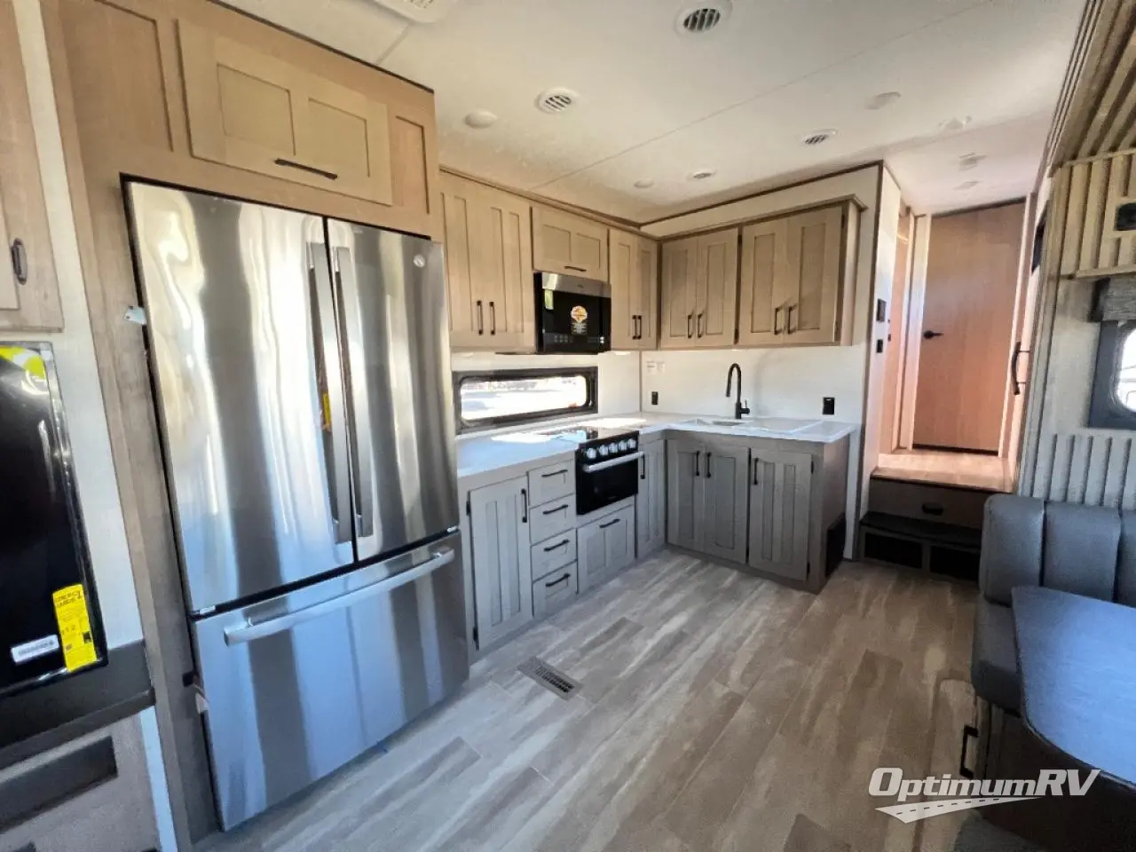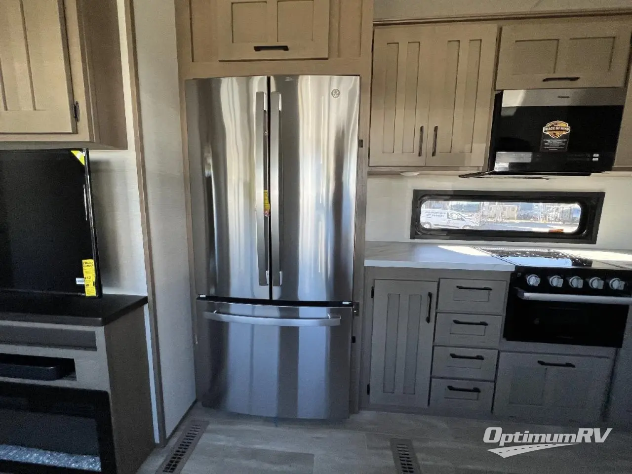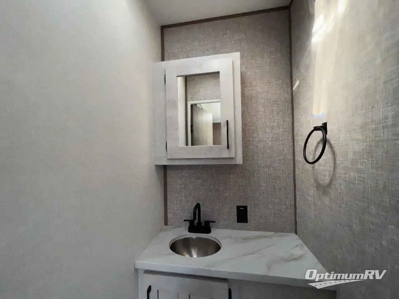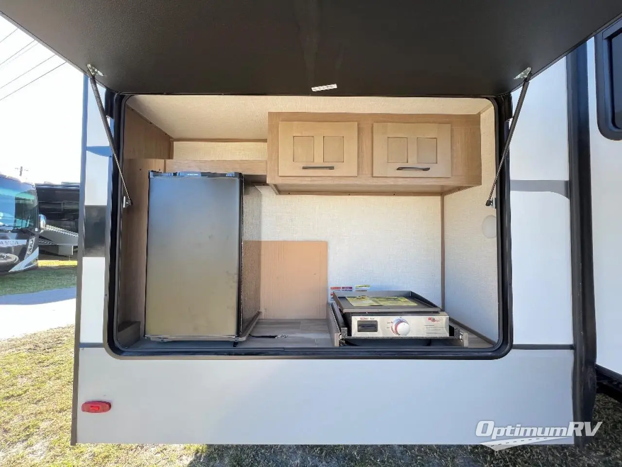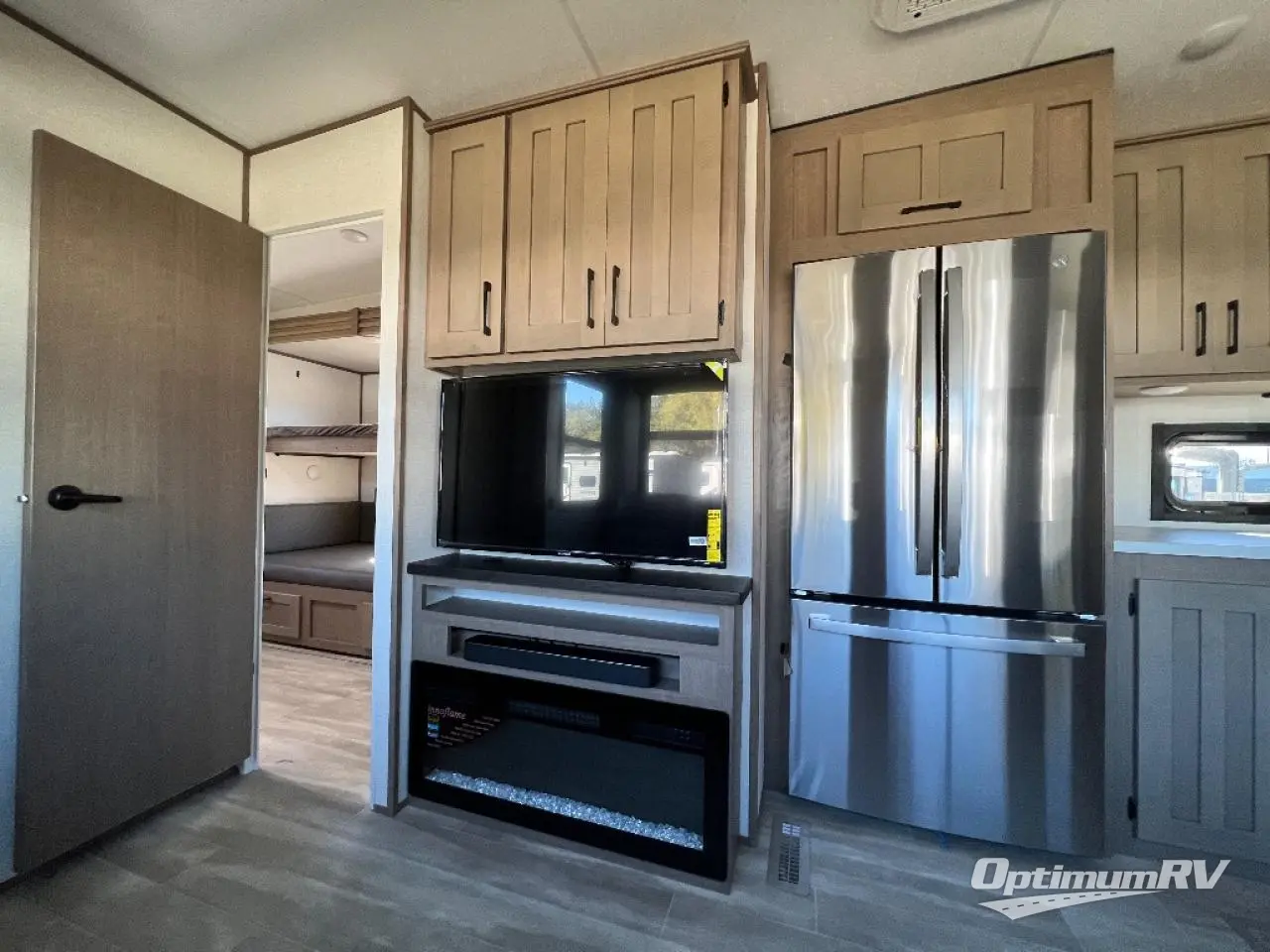 Your guests will feel right at home when they go camping with you since they will have their own bunkhouse suite with a half bath! There are three bunks here, plus an entertainment center if they choose to add a TV. The spacious full bath is up by the front private bedroom, and here you'll enjoy a queen bed, a slide out wardrobe, plus a closet with washer and dryer prep. Everyone can meet in the main living area at the booth dinette, or on the theater seating, plus this area includes a 43" Smart LED TV and an optional 40" fireplace can be added. Head outdoors to cook on the outside kitchen that includes a pellet smoker, a griddle, a sink, plus a refrigerator. There is also a 13' power awning here, and a second optional 11" awning can be added for even more shade!