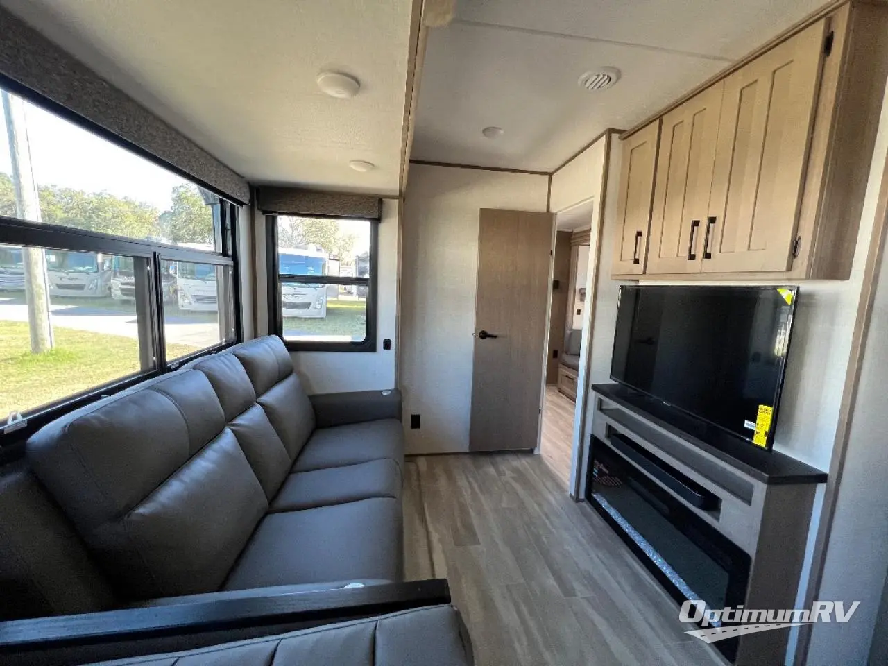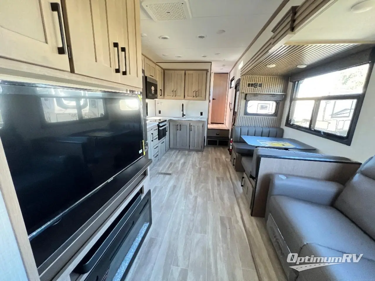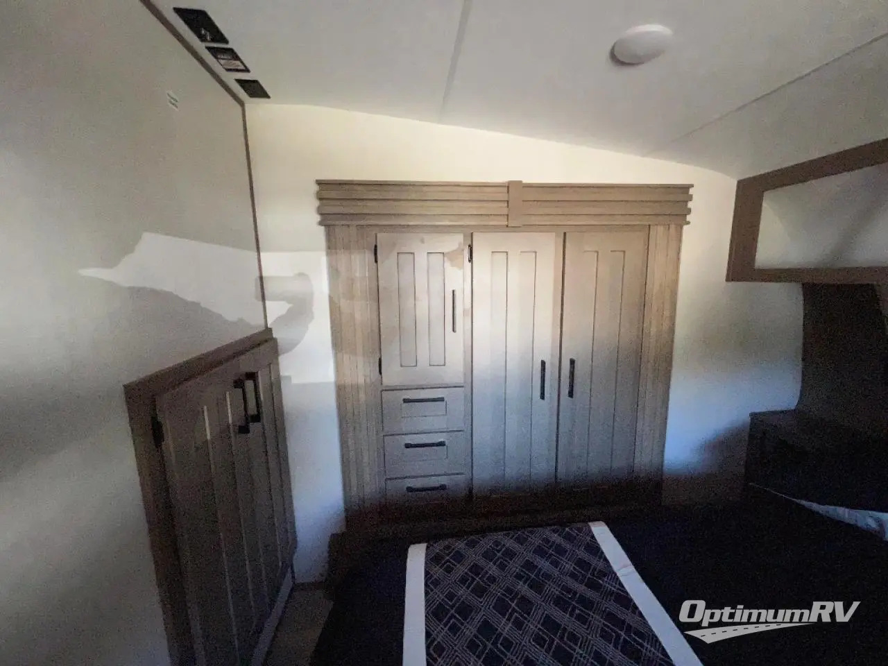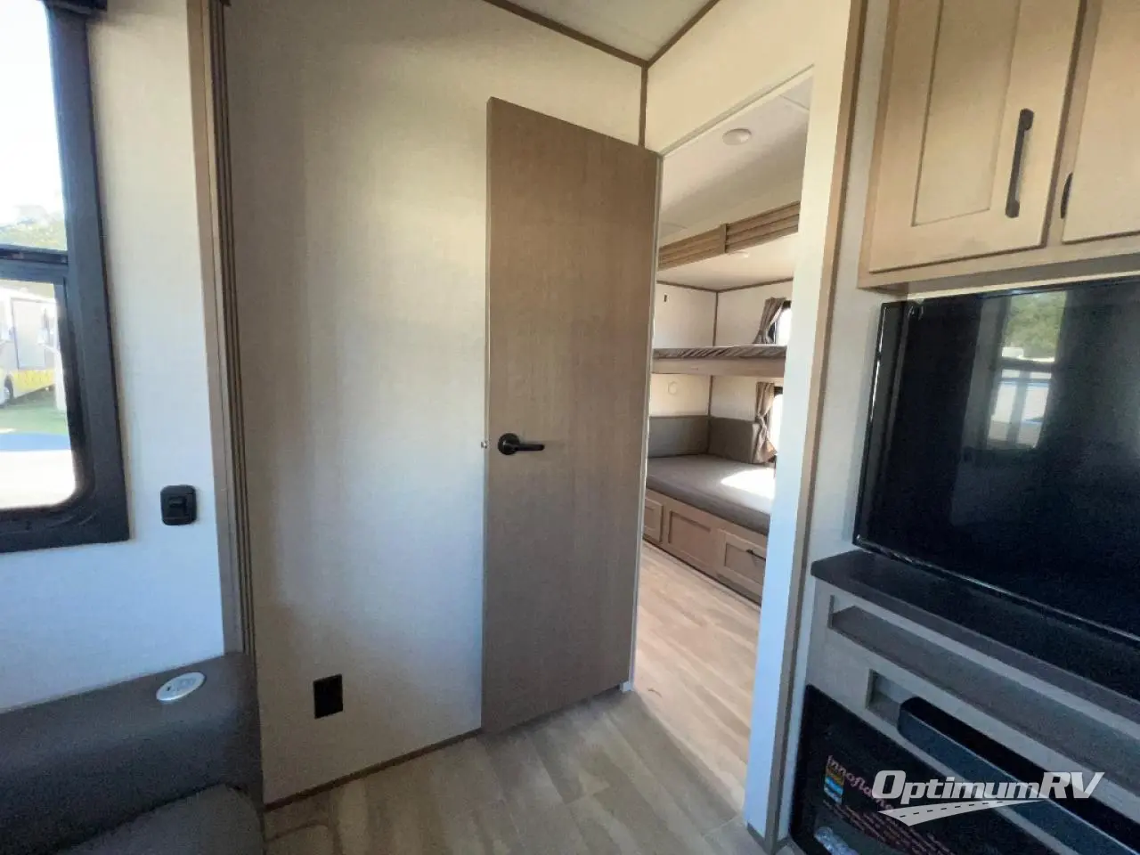 Your guests will feel right at home when they go camping with you since they will have their own bunkhouse suite with a half bath! There are three bunks here, plus an entertainment center if they choose to add a TV. The spacious full bath is up by the front private bedroom, and here you'll enjoy a queen bed, a slide out wardrobe, plus a closet with washer and dryer prep. Everyone can meet in the main living area at the booth dinette, or on the theater seating, plus this area includes a 43" Smart LED TV and an optional 40" fireplace can be added. Head outdoors to cook on the outside kitchen that includes a pellet smoker, a griddle, a sink, plus a refrigerator. There is also a 13' power awning here, and a second optional 11" awning can be added for even more shade!