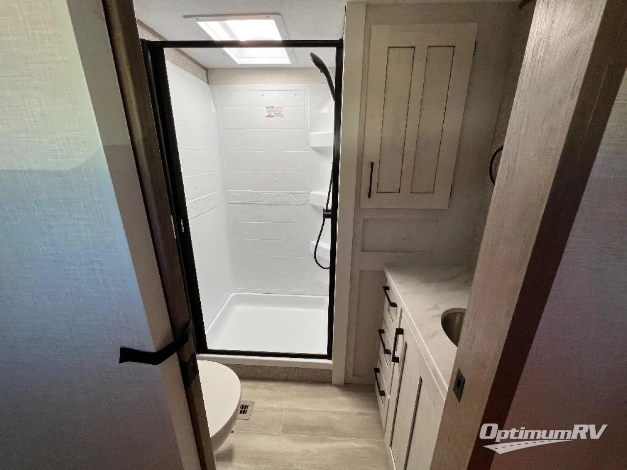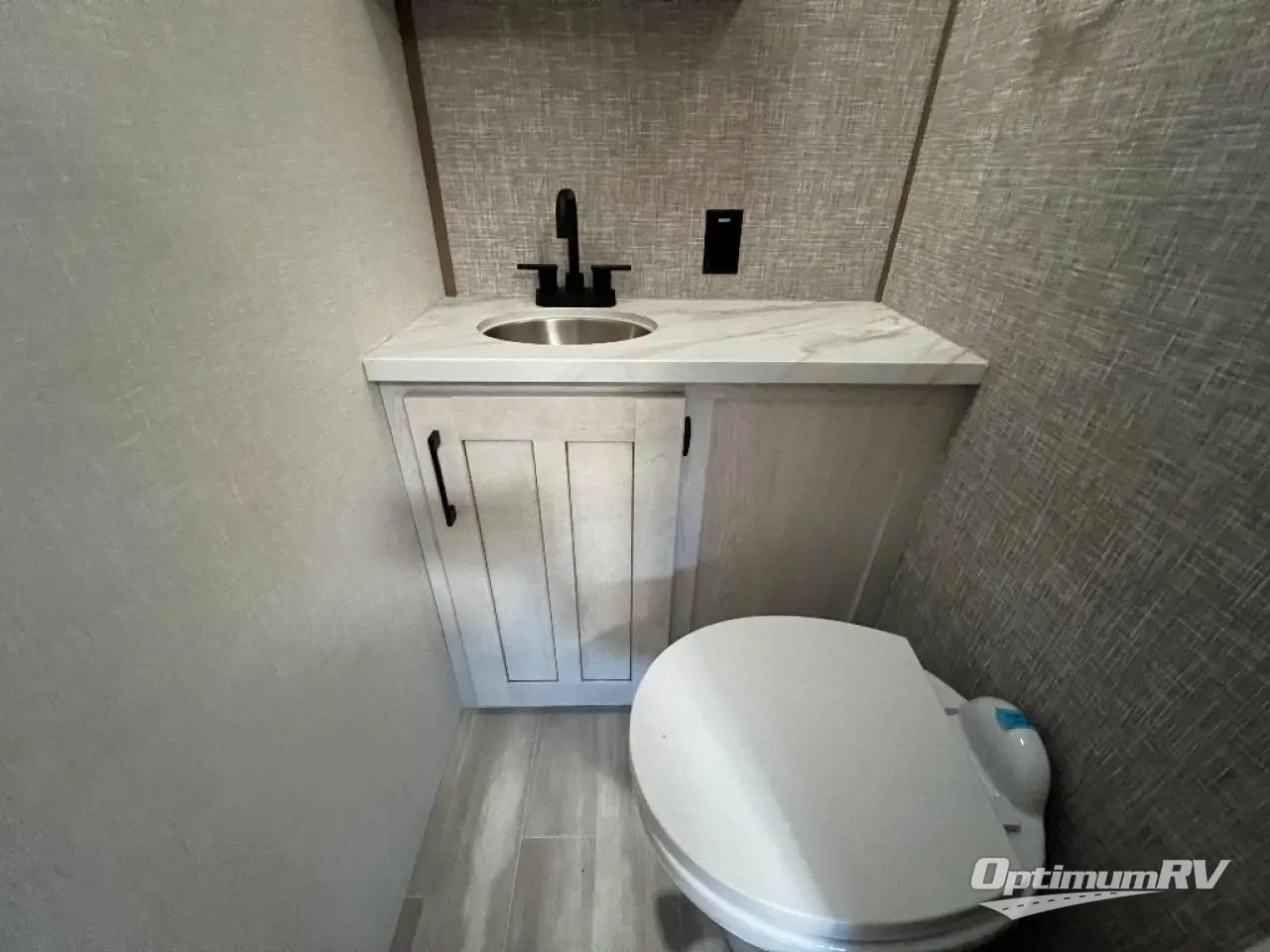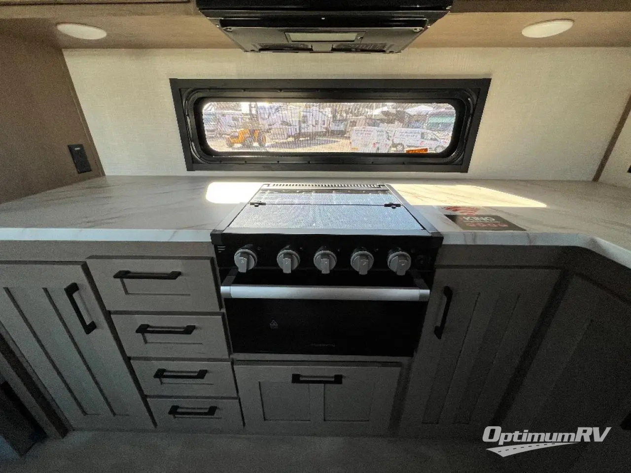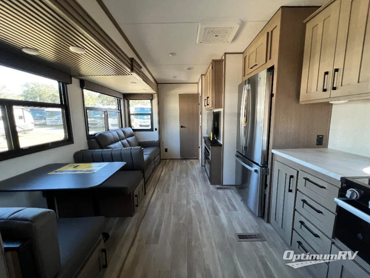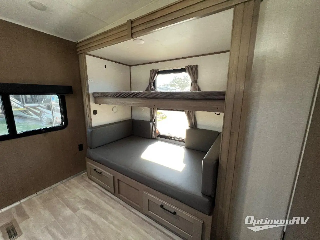 Your guests will feel right at home when they go camping with you since they will have their own bunkhouse suite with a half bath! There are three bunks here, plus an entertainment center if they choose to add a TV. The spacious full bath is up by the front private bedroom, and here you'll enjoy a queen bed, a slide out wardrobe, plus a closet with washer and dryer prep. Everyone can meet in the main living area at the booth dinette, or on the theater seating, plus this area includes a 43" Smart LED TV and an optional 40" fireplace can be added. Head outdoors to cook on the outside kitchen that includes a pellet smoker, a griddle, a sink, plus a refrigerator. There is also a 13' power awning here, and a second optional 11" awning can be added for even more shade!
