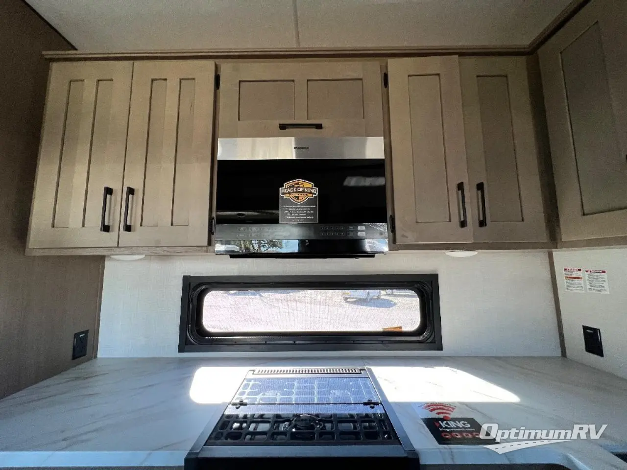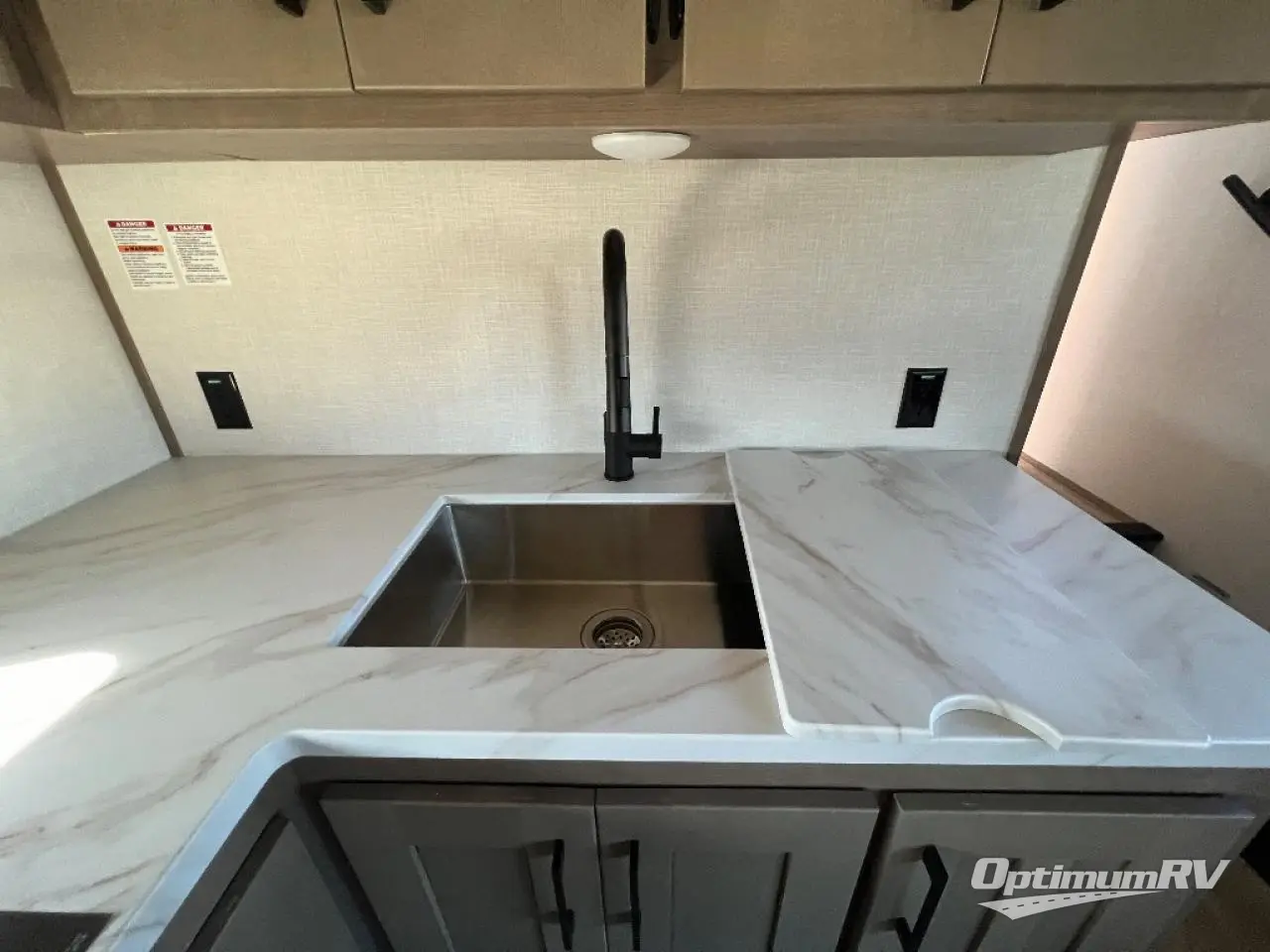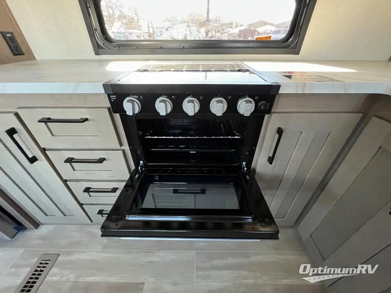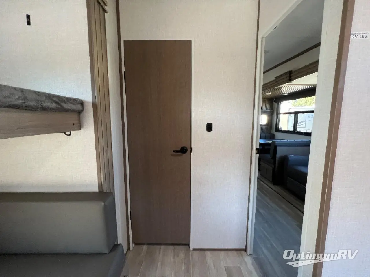 Your guests will feel right at home when they go camping with you since they will have their own bunkhouse suite with a half bath! There are three bunks here, plus an entertainment center if they choose to add a TV. The spacious full bath is up by the front private bedroom, and here you'll enjoy a queen bed, a slide out wardrobe, plus a closet with washer and dryer prep. Everyone can meet in the main living area at the booth dinette, or on the theater seating, plus this area includes a 43" Smart LED TV and an optional 40" fireplace can be added. Head outdoors to cook on the outside kitchen that includes a pellet smoker, a griddle, a sink, plus a refrigerator. There is also a 13' power awning here, and a second optional 11" awning can be added for even more shade!