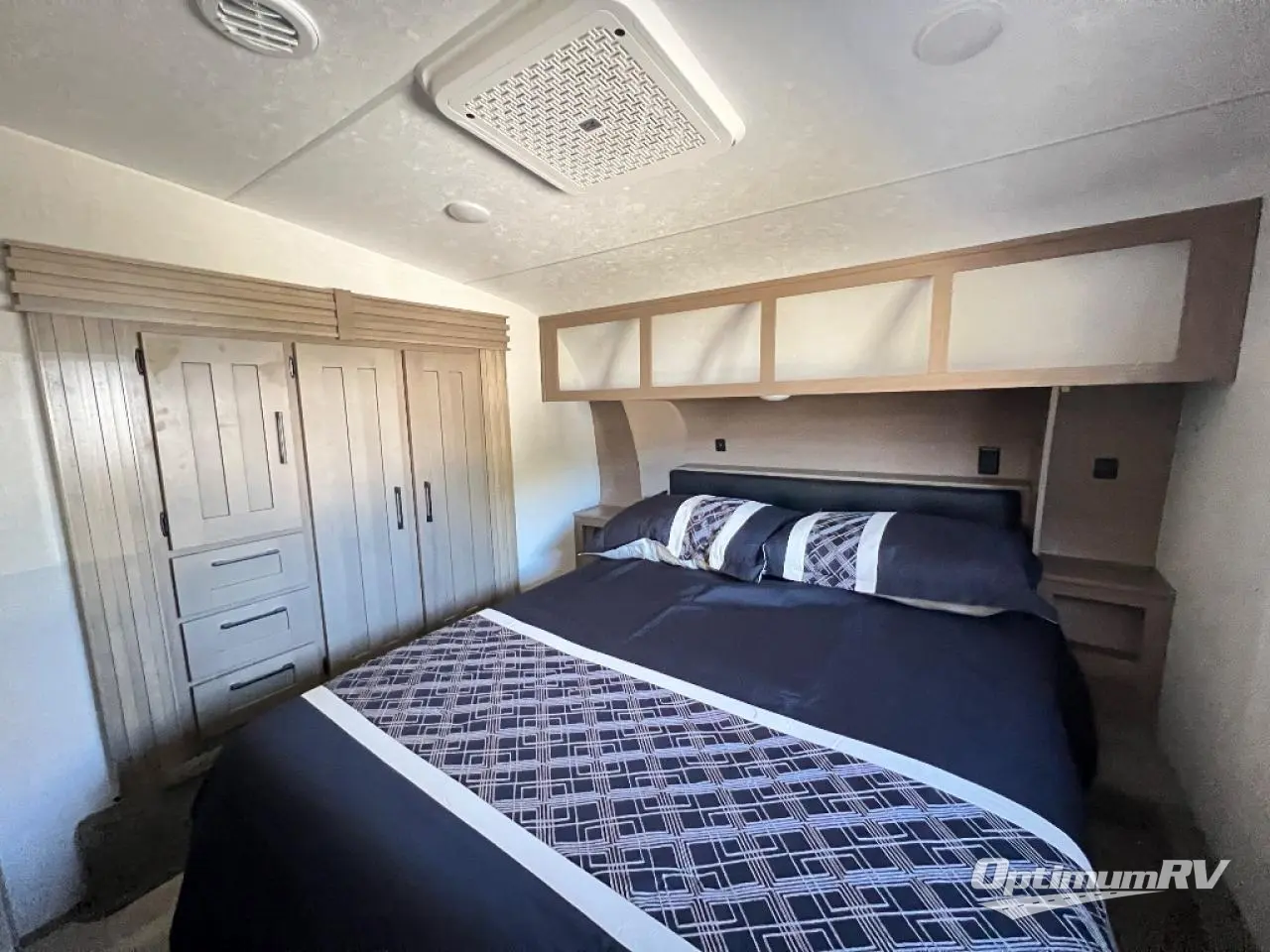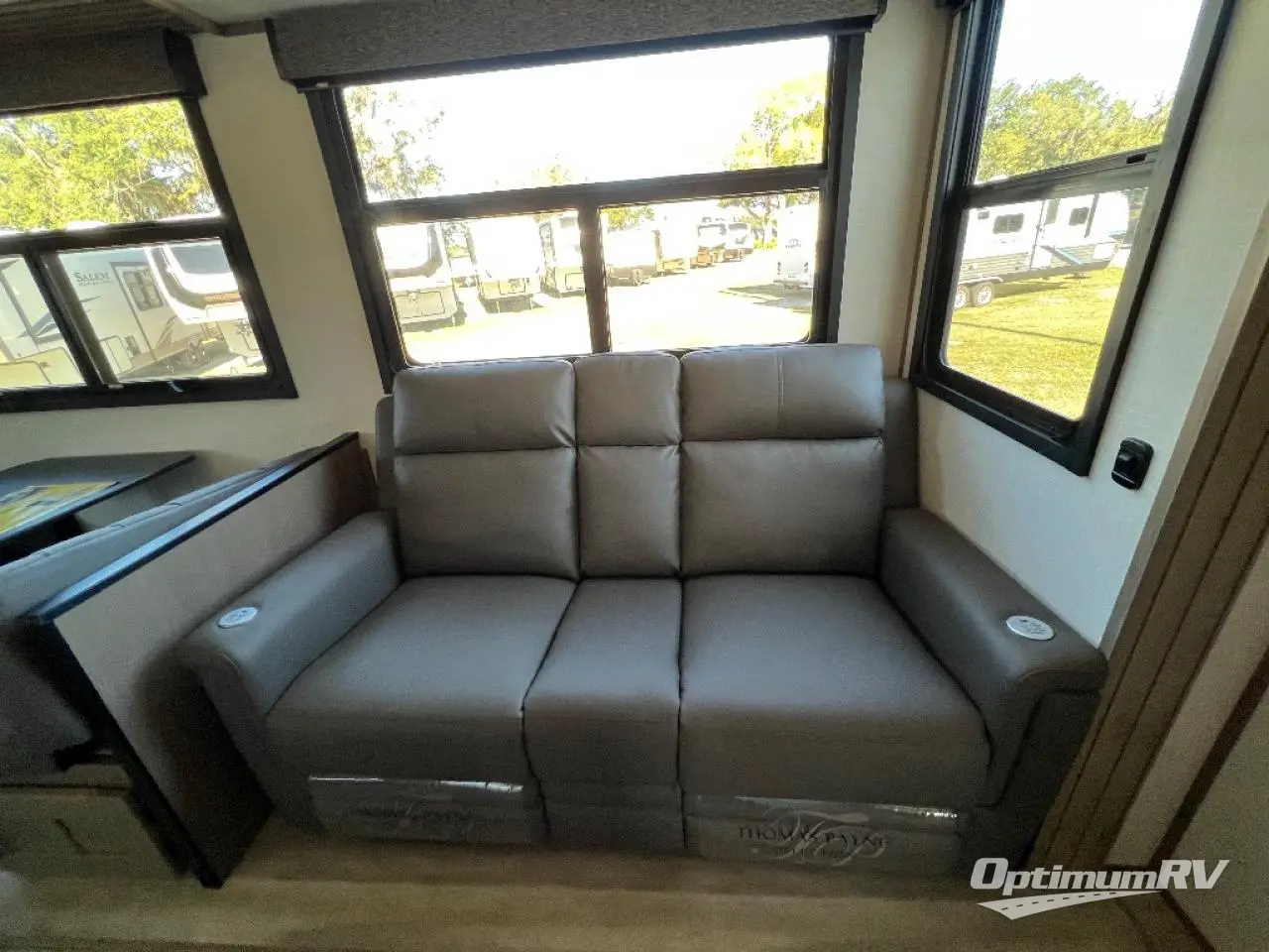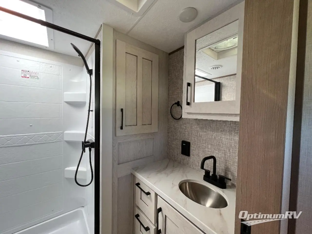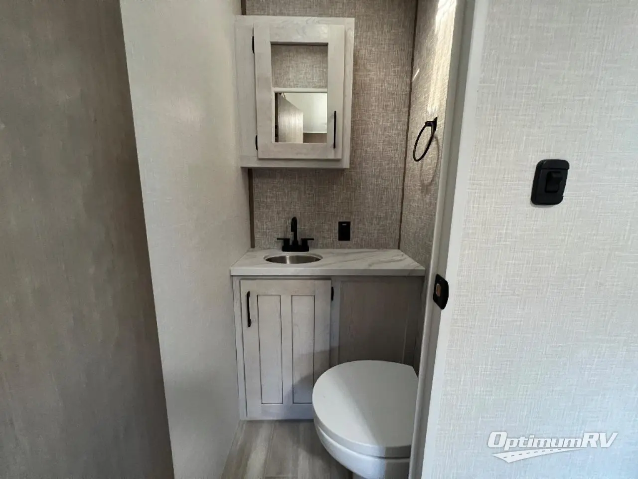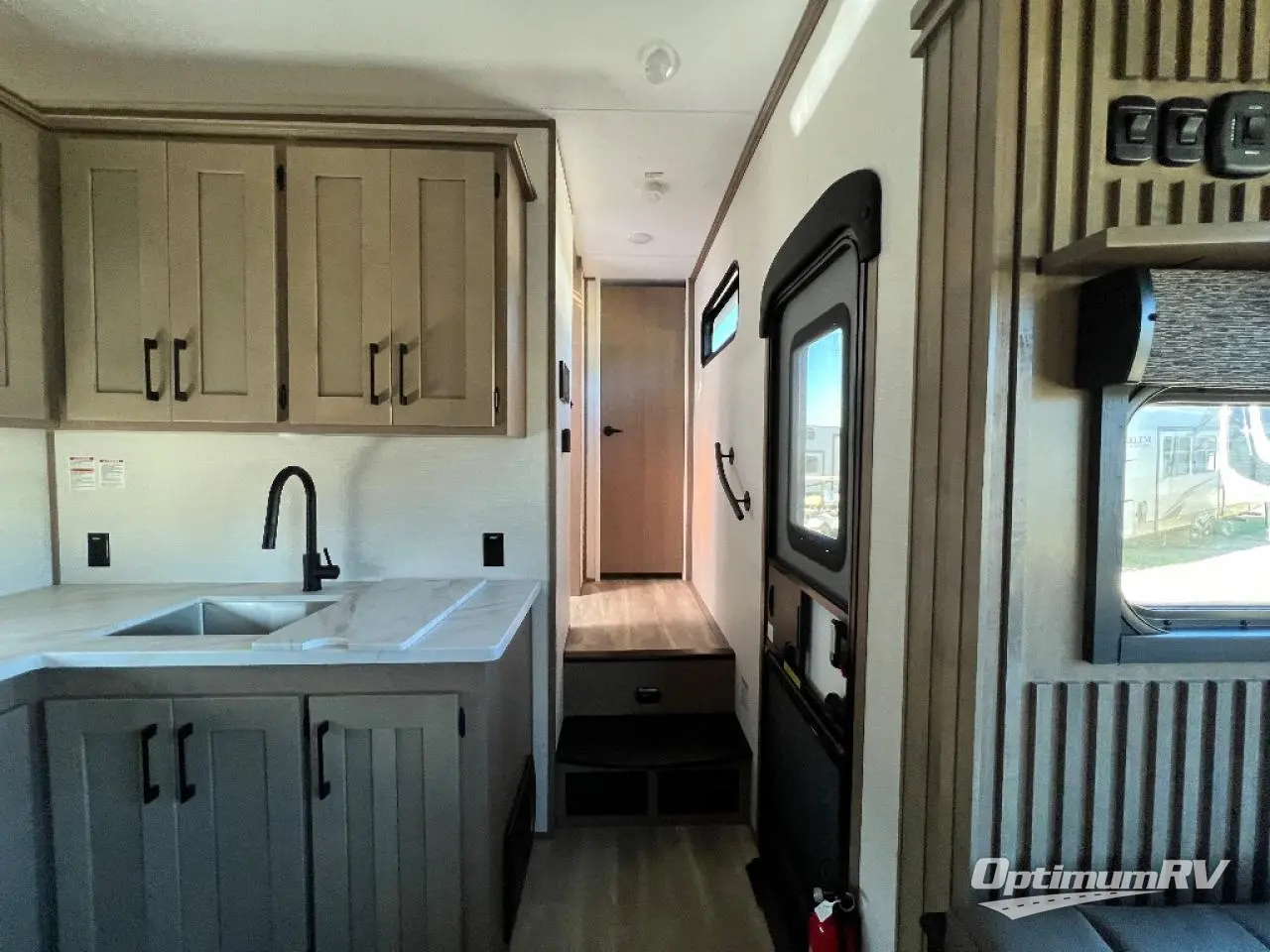 Your guests will feel right at home when they go camping with you since they will have their own bunkhouse suite with a half bath! There are three bunks here, plus an entertainment center if they choose to add a TV. The spacious full bath is up by the front private bedroom, and here you'll enjoy a queen bed, a slide out wardrobe, plus a closet with washer and dryer prep. Everyone can meet in the main living area at the booth dinette, or on the theater seating, plus this area includes a 43" Smart LED TV and an optional 40" fireplace can be added. Head outdoors to cook on the outside kitchen that includes a pellet smoker, a griddle, a sink, plus a refrigerator. There is also a 13' power awning here, and a second optional 11" awning can be added for even more shade!