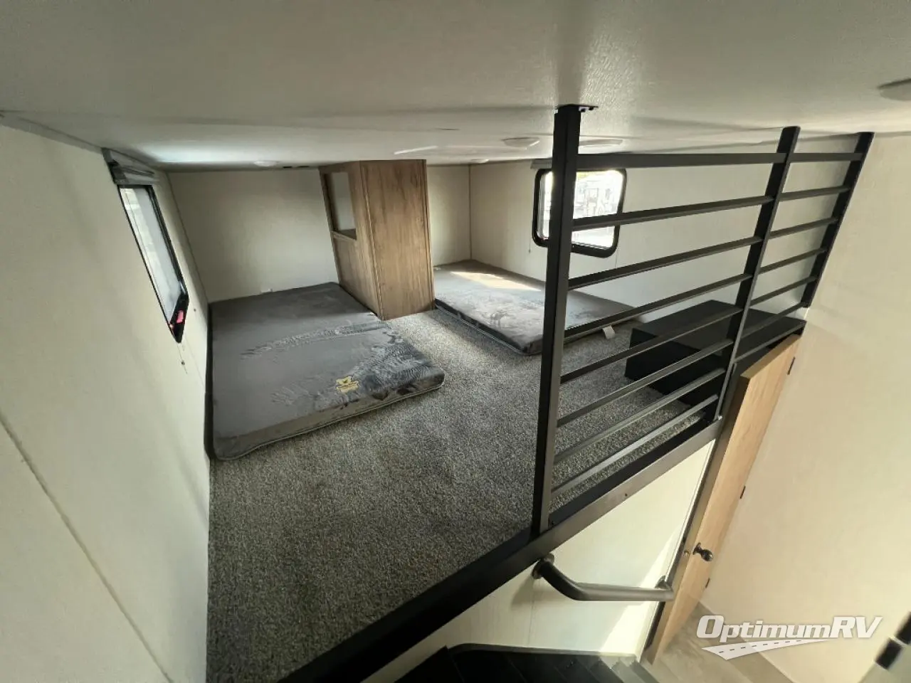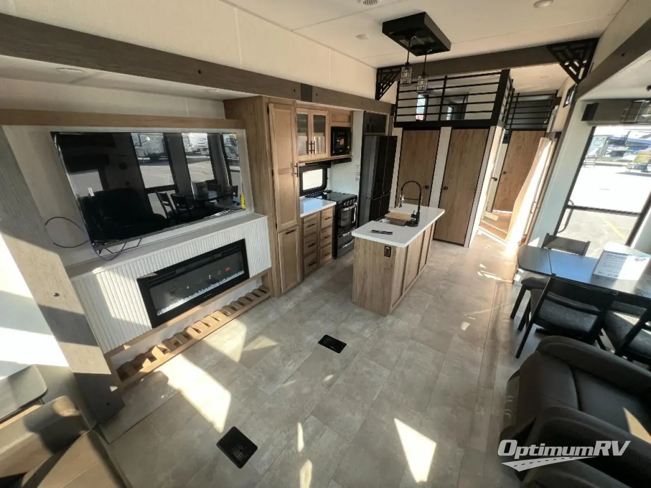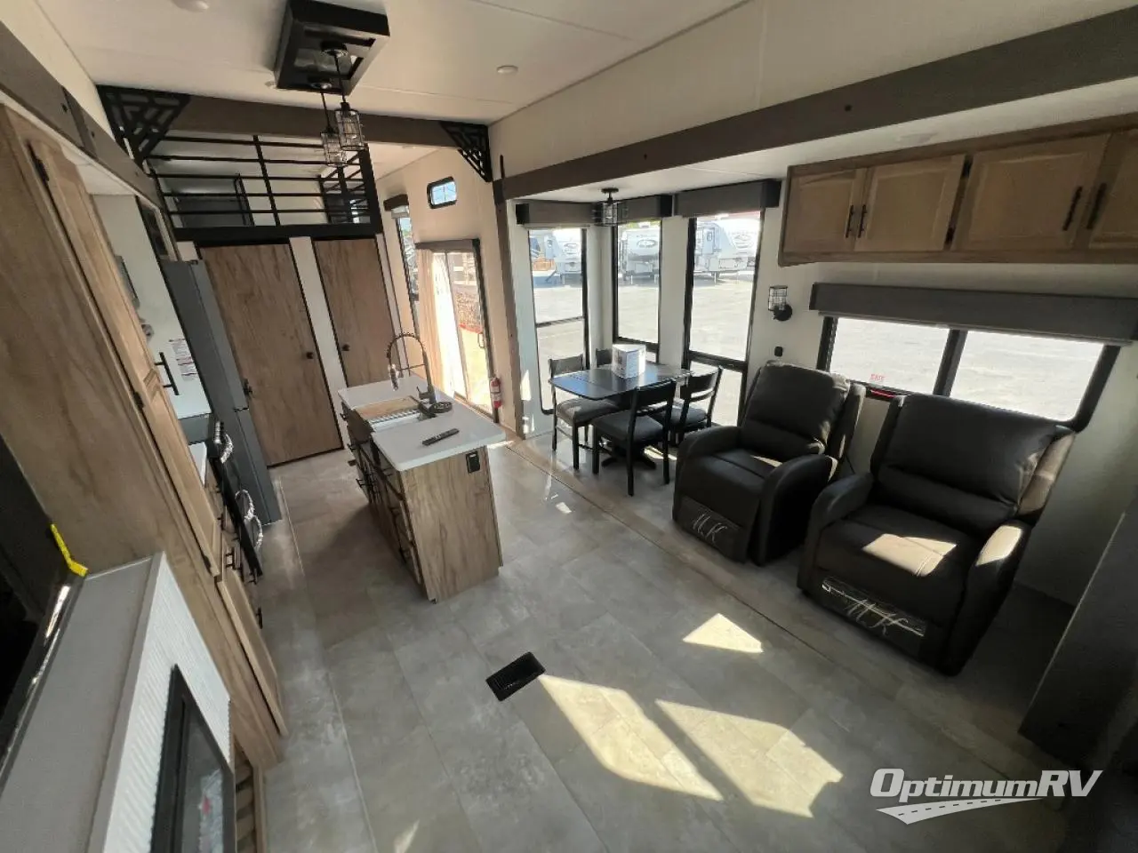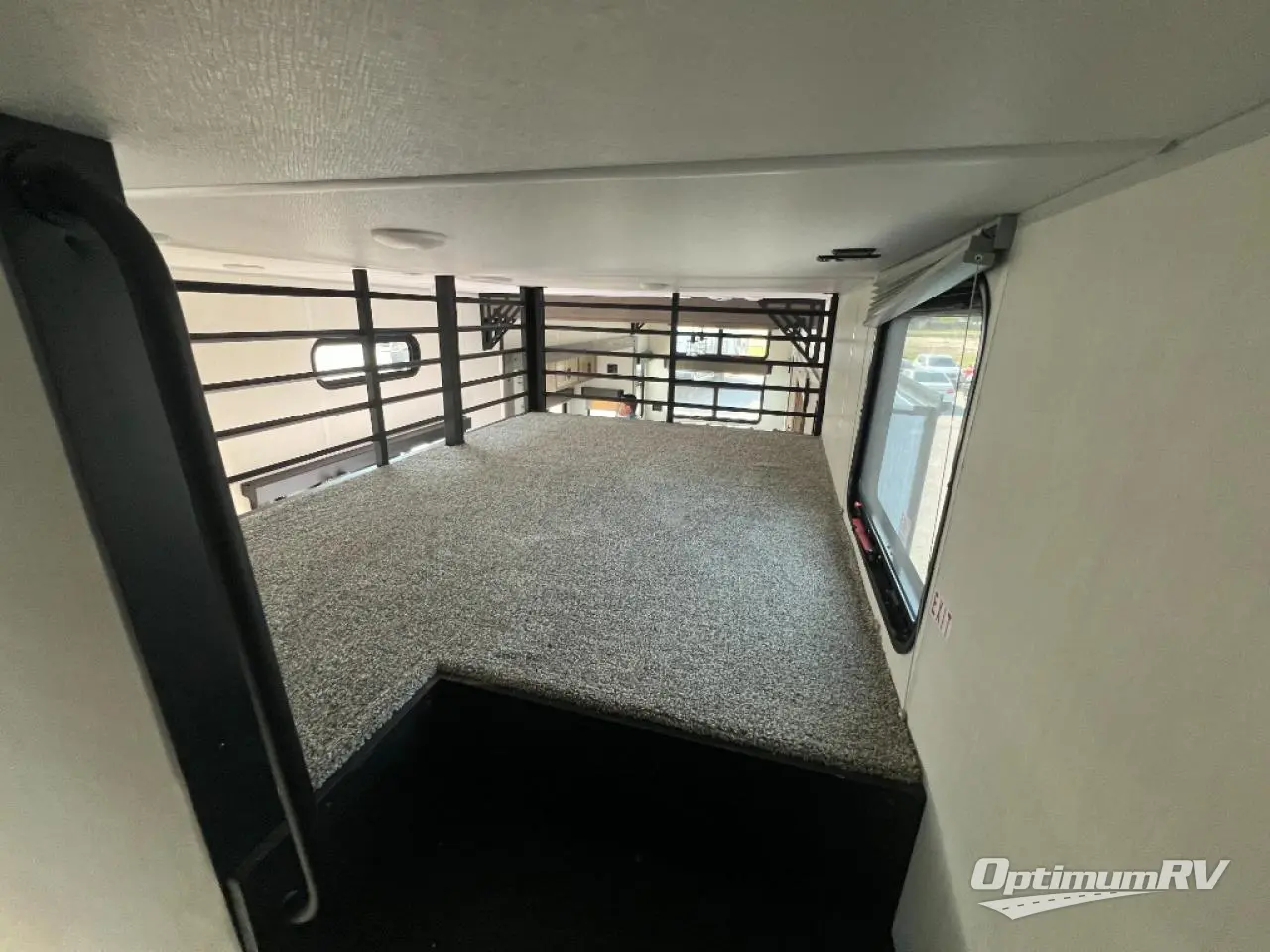 This Black Label destination trailer is an excellent and accommodating trailer that will make you feel right at home as soon as you enter through one of the two entry doors. The front private bedroom has a queen bed slide and lots of storage with the two wardrobes and linen closet. There is also an entertainment center where you can add your own TV thanks to the TV mount, and the bedroom even has the second exterior entry door so that you can come and go as you please. Above the bedroom is where the huge loft is located. When you take the stairs up to the loft, you'll find two 36" x 74" bunk mats, a nightstand, storage cabinets, and a large open area with a railing. The main living area has a free-standing dinette with chairs, two lounge chairs, a sofa, plus a fireplace to make this space feel more like home!