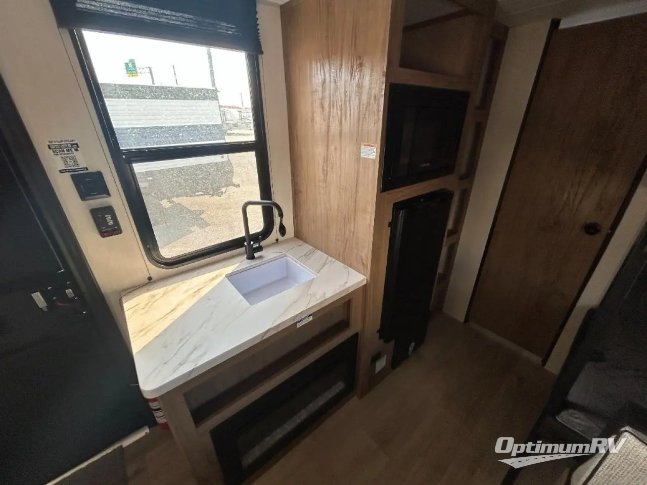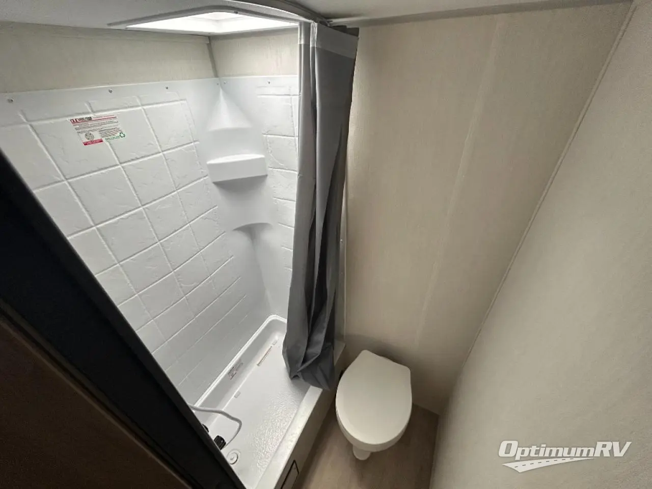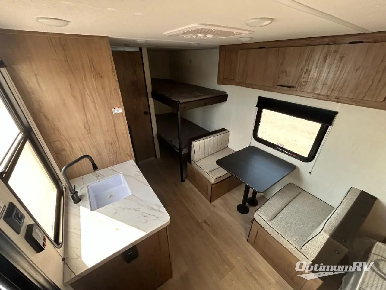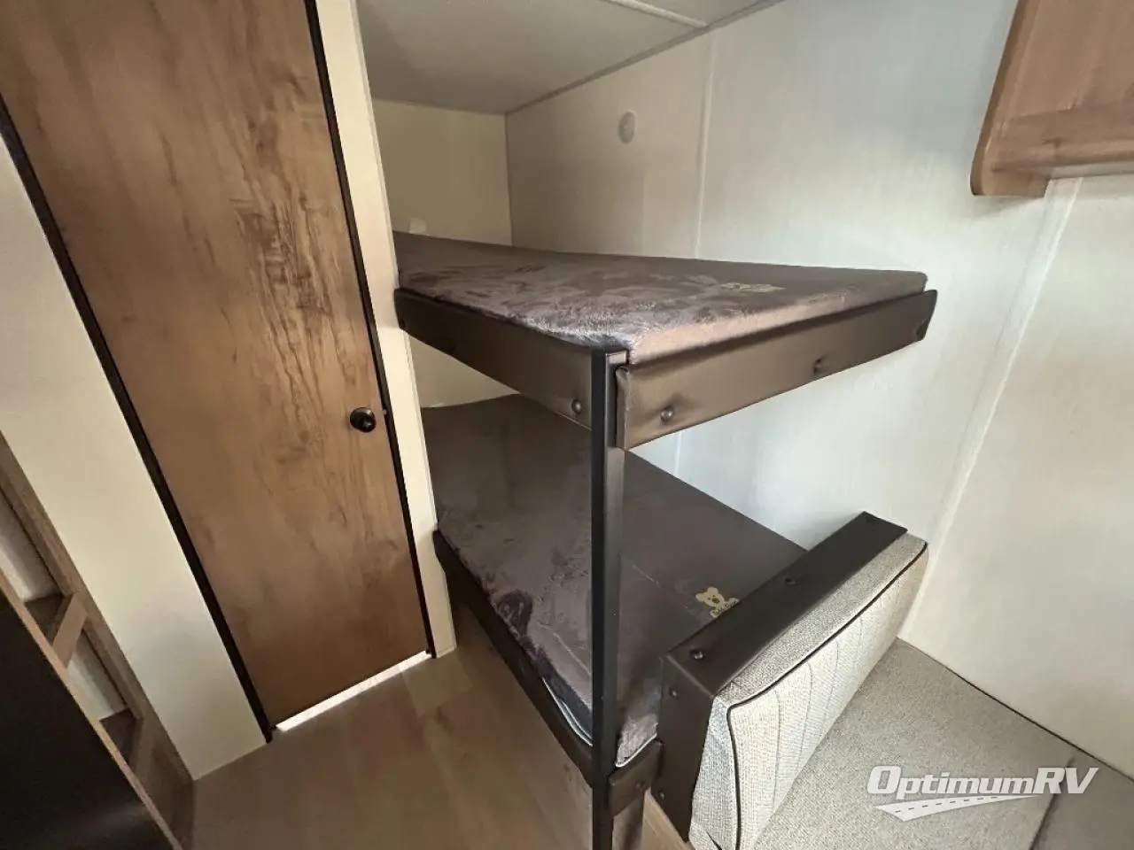 Enjoy family adventures in this all-electric bunk model which features sleeping for four or six depending on size with a queen bed up front, oversized bunks in the rear roadside corner, and you could even convert the booth dinette to sleep more. Inside, you will find ample storage with overhead cabinets and a large shelf above the queen bed, plus four shelves next to the refrigerator and microwave/air fryer that feature decorative storage bins for your things. Use this space for pantry items, towels, or clothing storage. There is even a fireplace below the counter and sink to bring you a bit of heat on those chilly nights. On the outside, you will also find a 12' awning and plenty of outside storage for your camping gear, plus more!