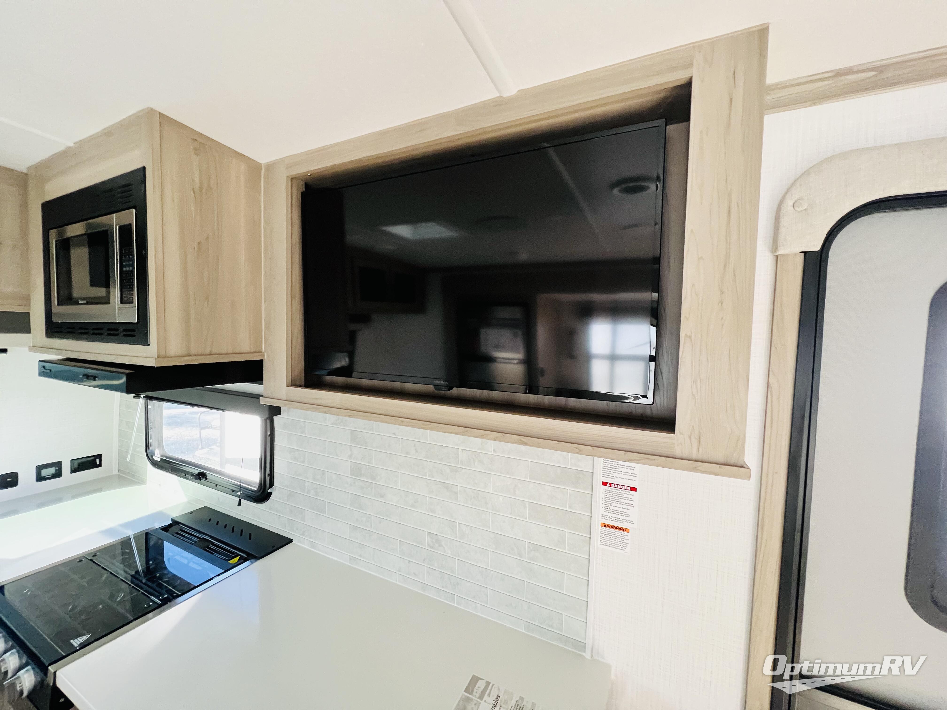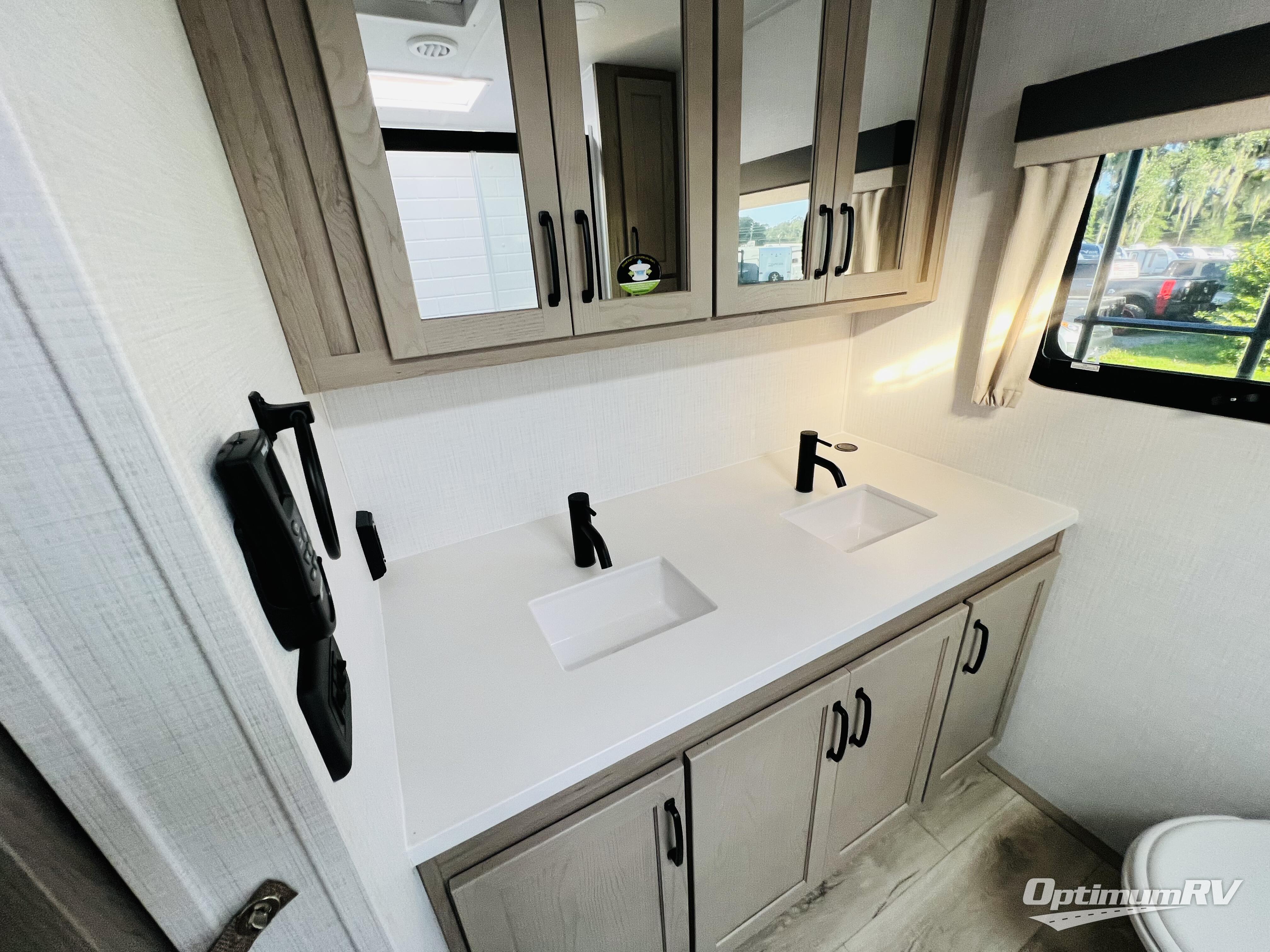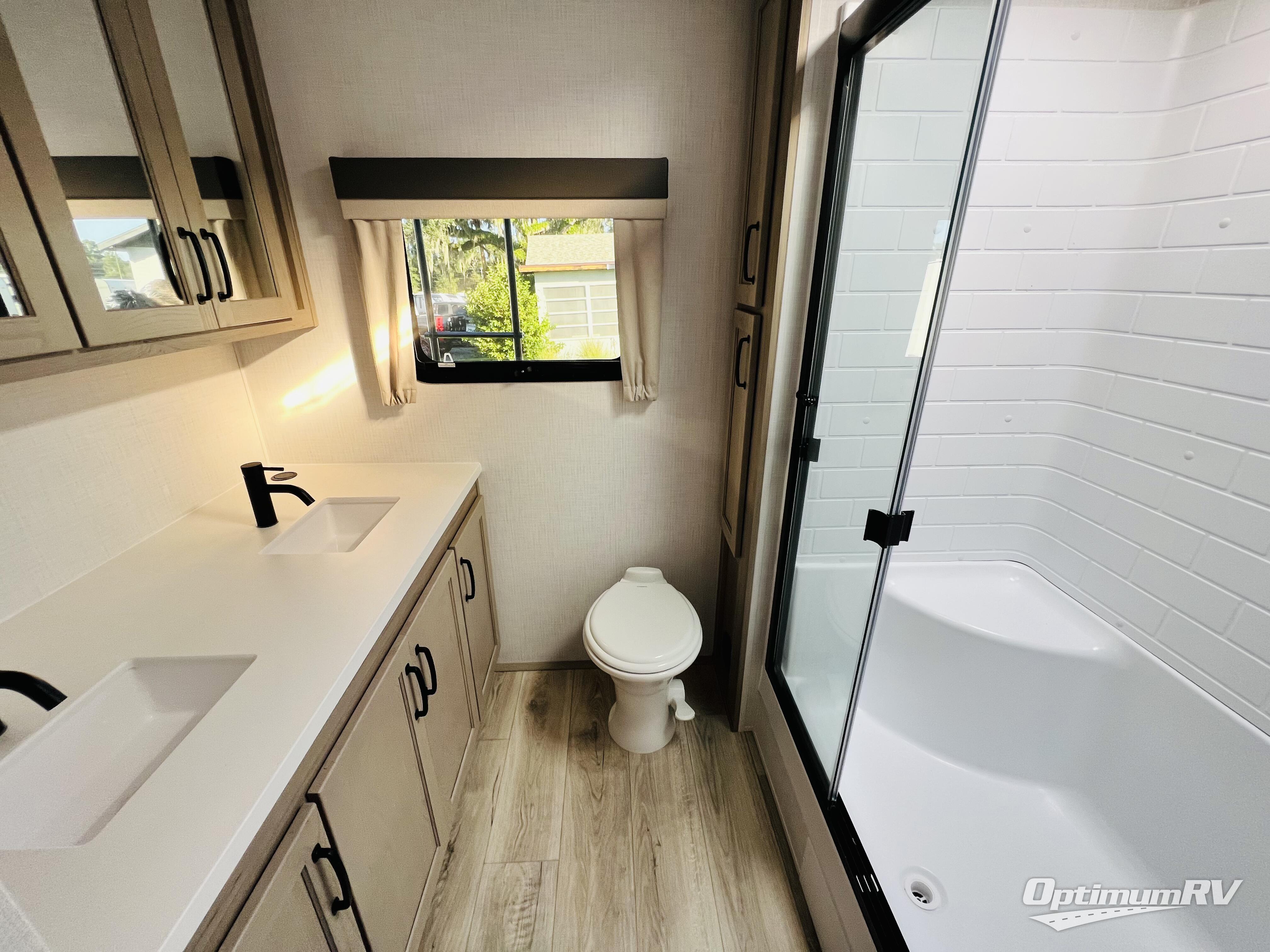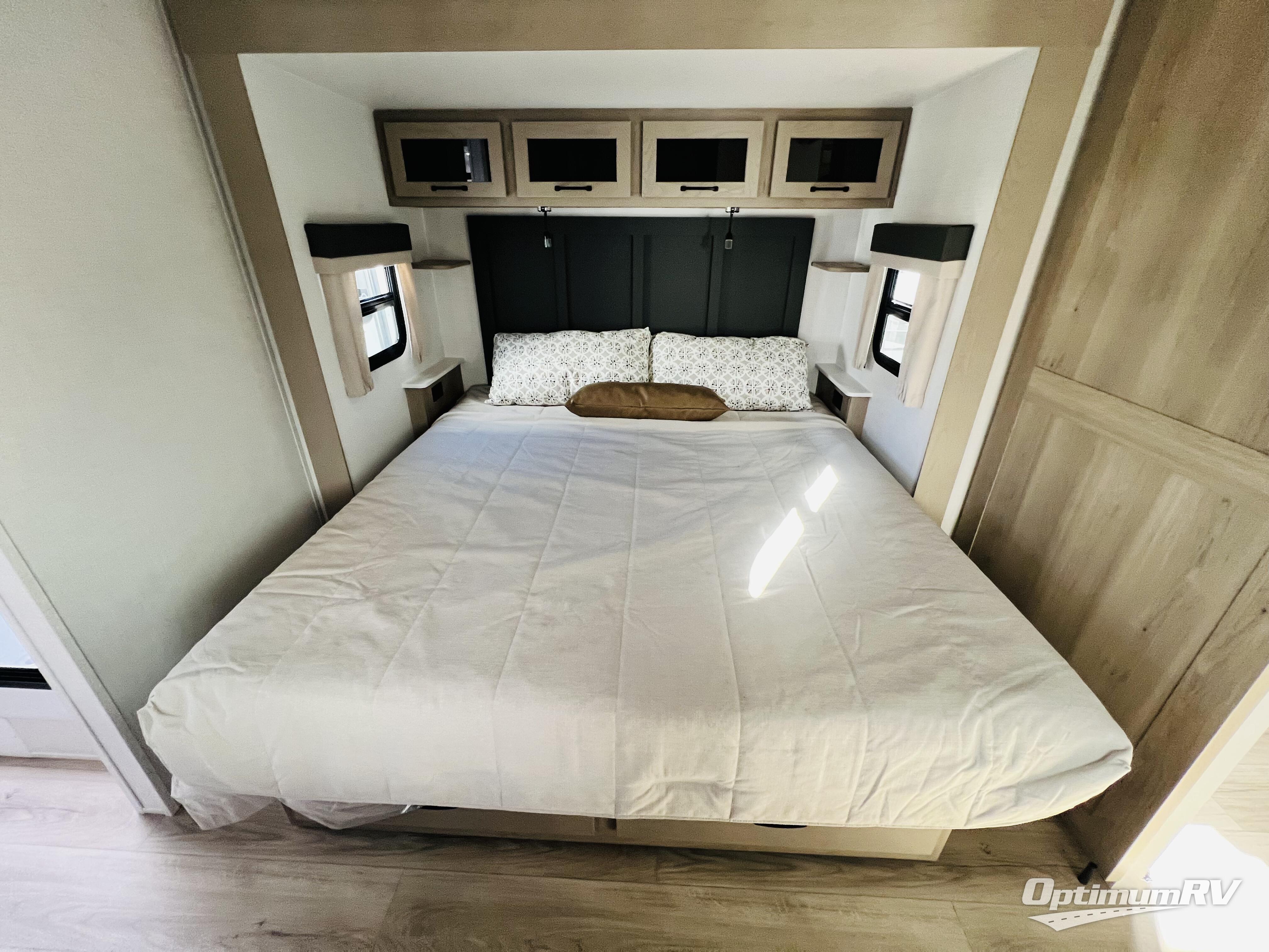 You will love how open this travel trailer will feel with the large front window that you can look out from the two-person bar top seating! The front kitchen has plenty of countertop space for you to prepare your best meals. Your nights will be spent in true relaxation with a 67" theater seating and king bed slide in the bedroom for a great night's rest. The full rear bathroom has a shower with a seat to take a nice, hot shower before bed, and a dual-sink vanity for two to get ready at once in the mornings!