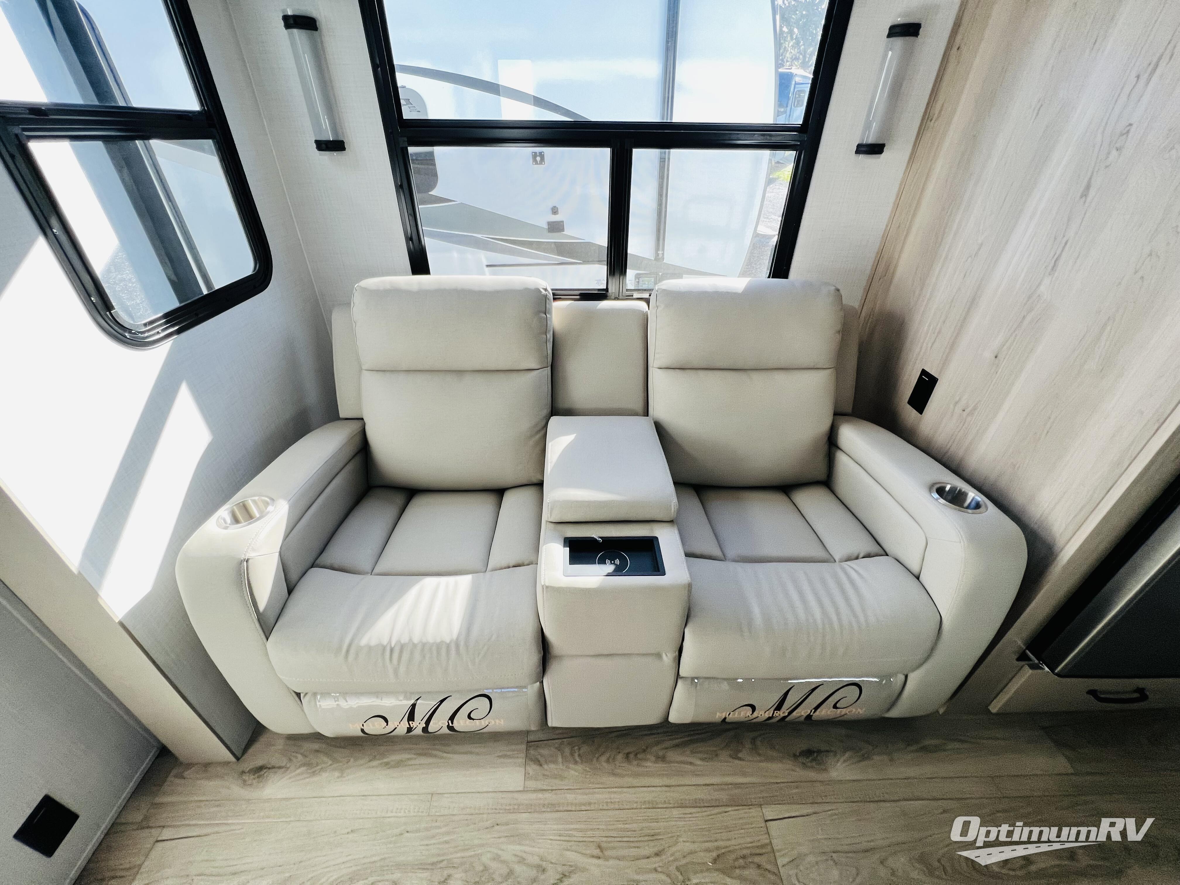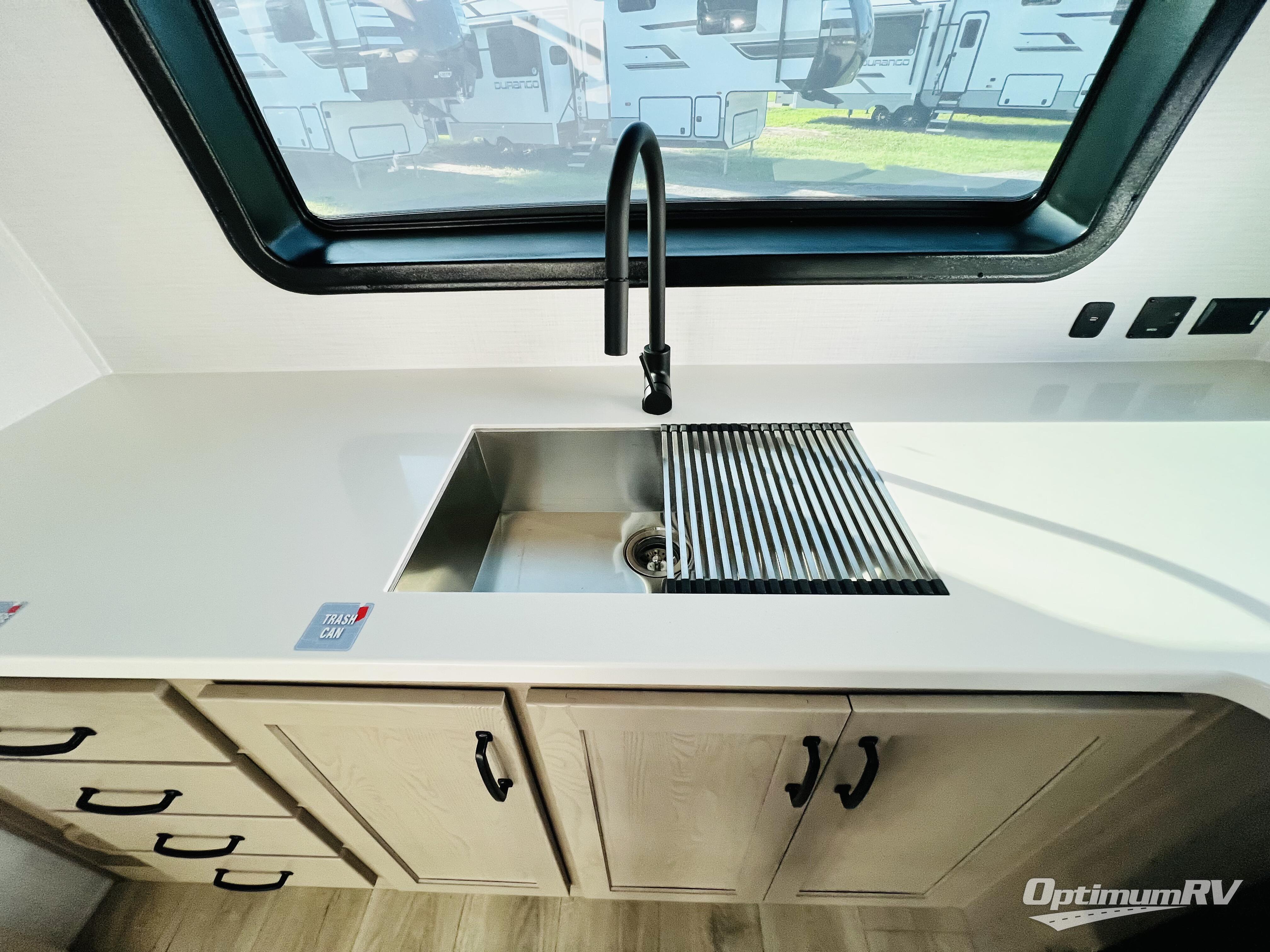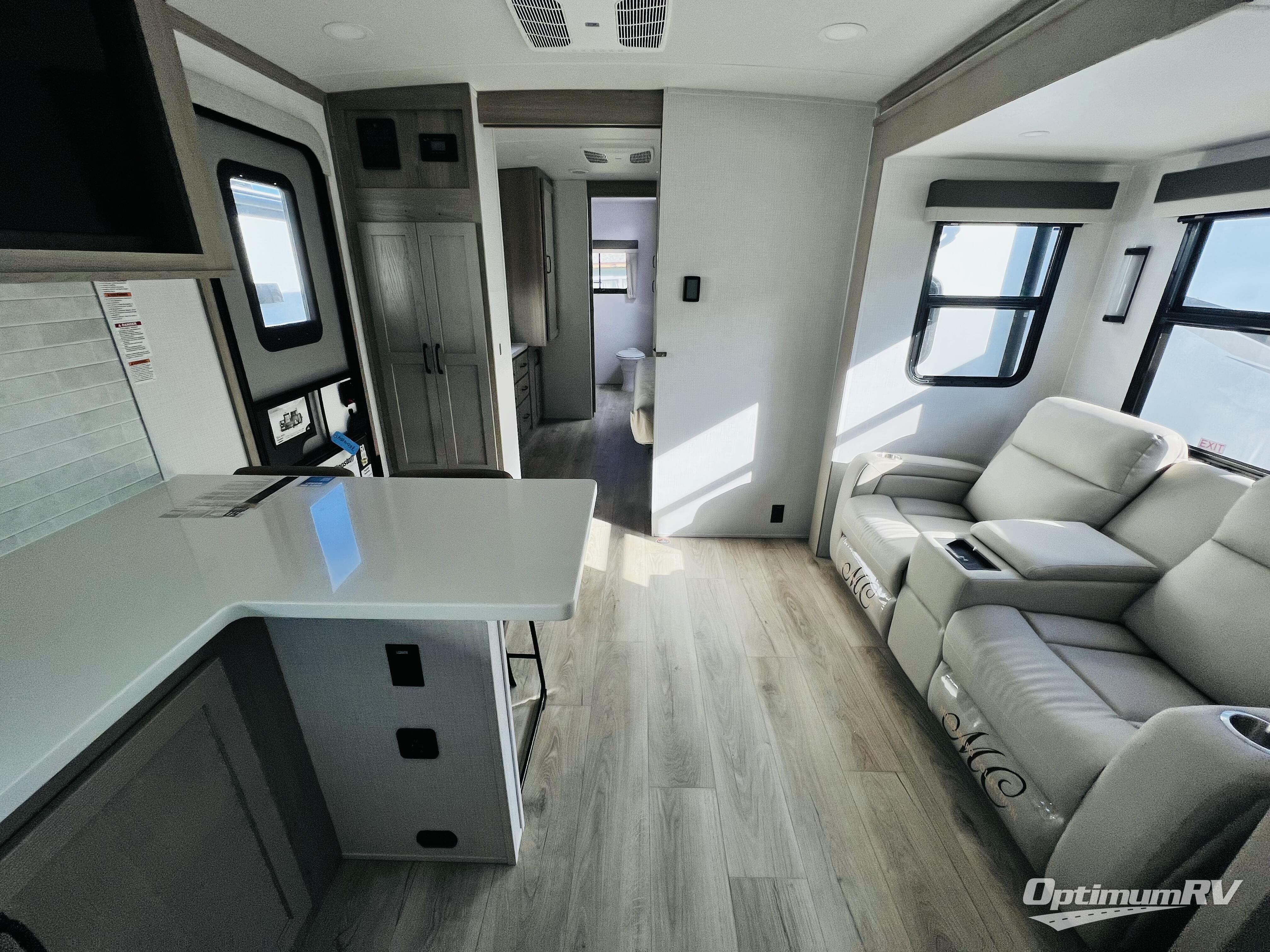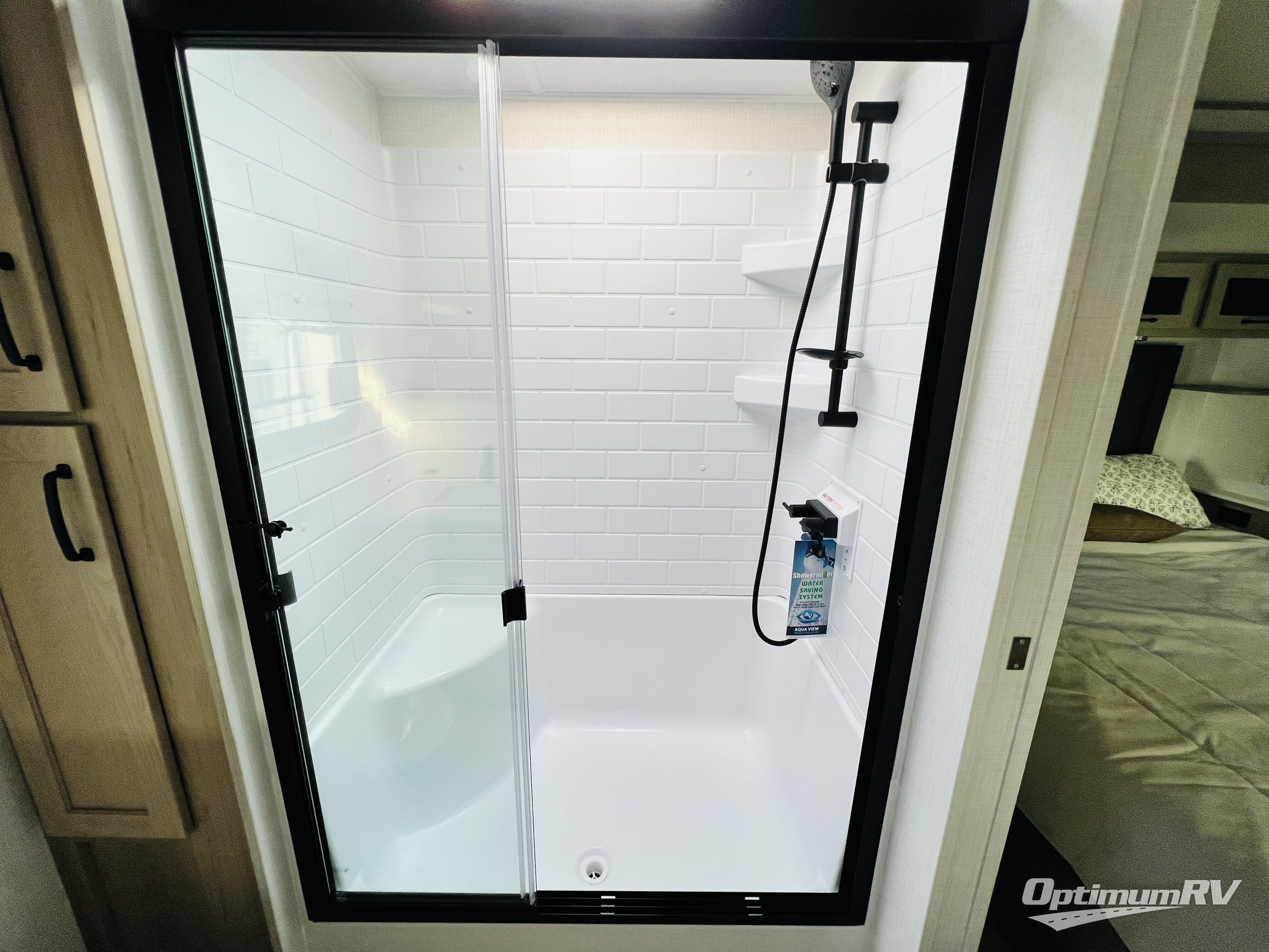You will love how open this travel trailer will feel with the large front window that you can look out from the two-person bar top seating! The front kitchen has plenty of countertop space for you to prepare your best meals. Your nights will be spent in true relaxation with a 67" theater seating and king bed slide in the bedroom for a great night's rest. The full rear bathroom has a shower with a seat to take a nice, hot shower before bed, and a dual-sink vanity for two to get ready at once in the mornings!