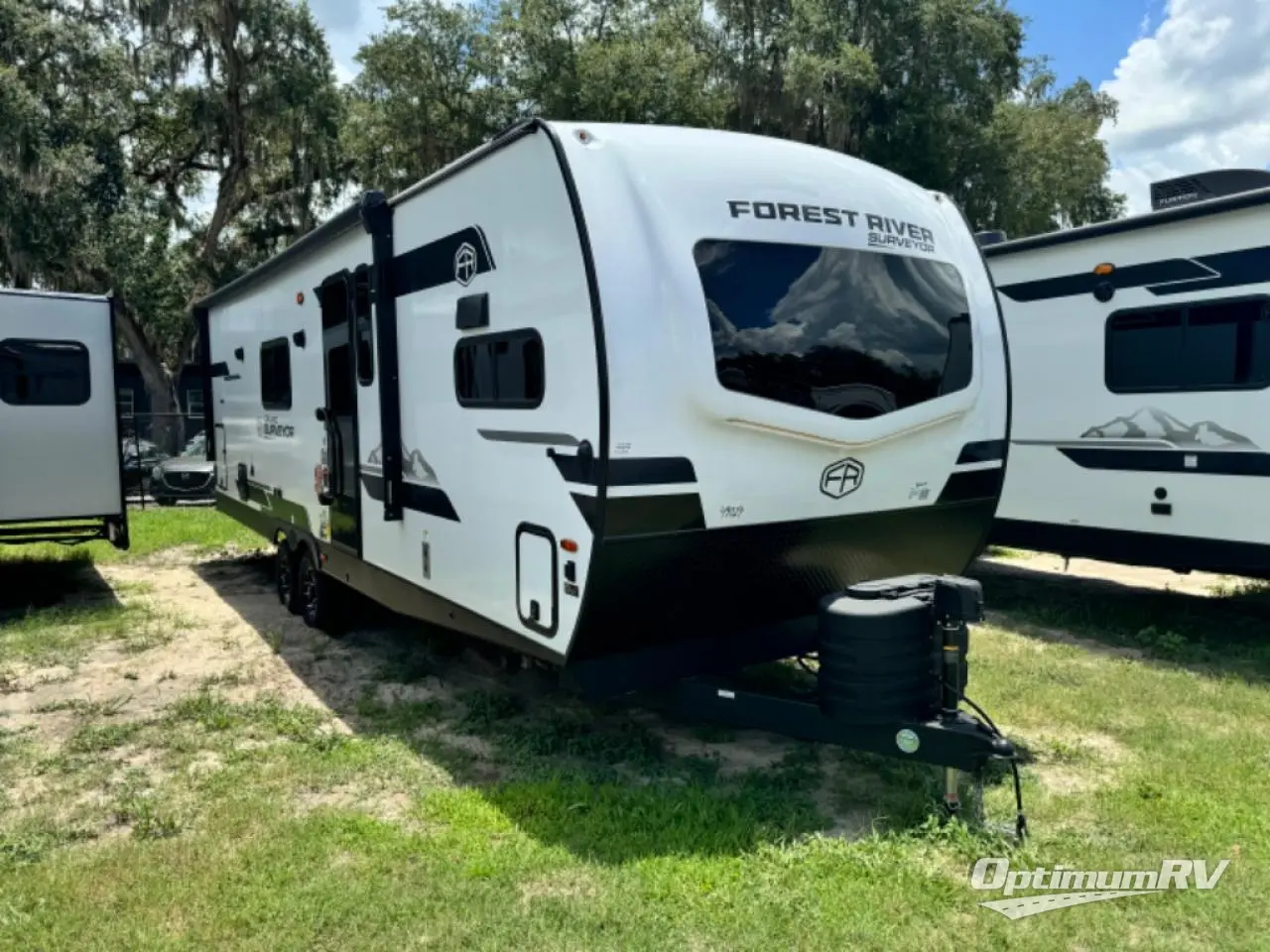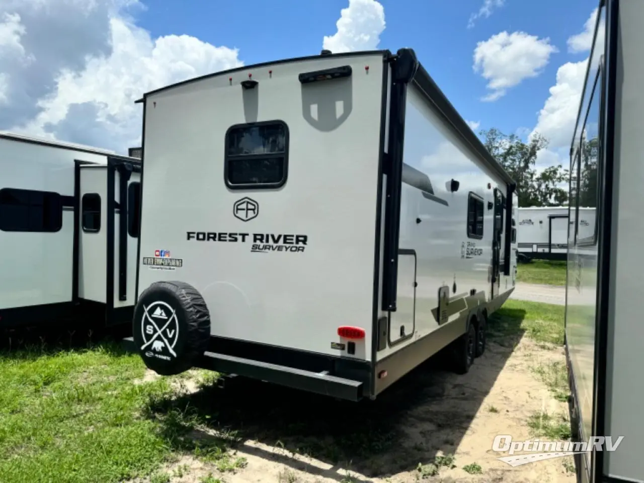 With any Grand Surveyor travel trailer by Forest River you will enjoy turn-key ready-to-go features and quality construction! Each model includes Azdel composite walls and a gel coated fiberglass front cap with an automotive style tinted windshield for a sleek look. There are friction hinge black glass entry door(s), an adjustable platform step with a night light, plus Goodyear tires and a power tongue jack for easy towing. The interior will have you feeling right at home with roller shades, residential faucets, sinks, and bathroom vanity, plus Surf(x) seamless countertops throughout. You can also plan for adventure with a 2" rear accessory and exterior spray port, and there are slam latch exterior baggage doors throughout to keep all your gear secure. Other stand-out features include a central vacuum system, a 200 watt solar panel with a 30 amp controller, a tankless water heater, carpet-free interiors, and the list goes on!