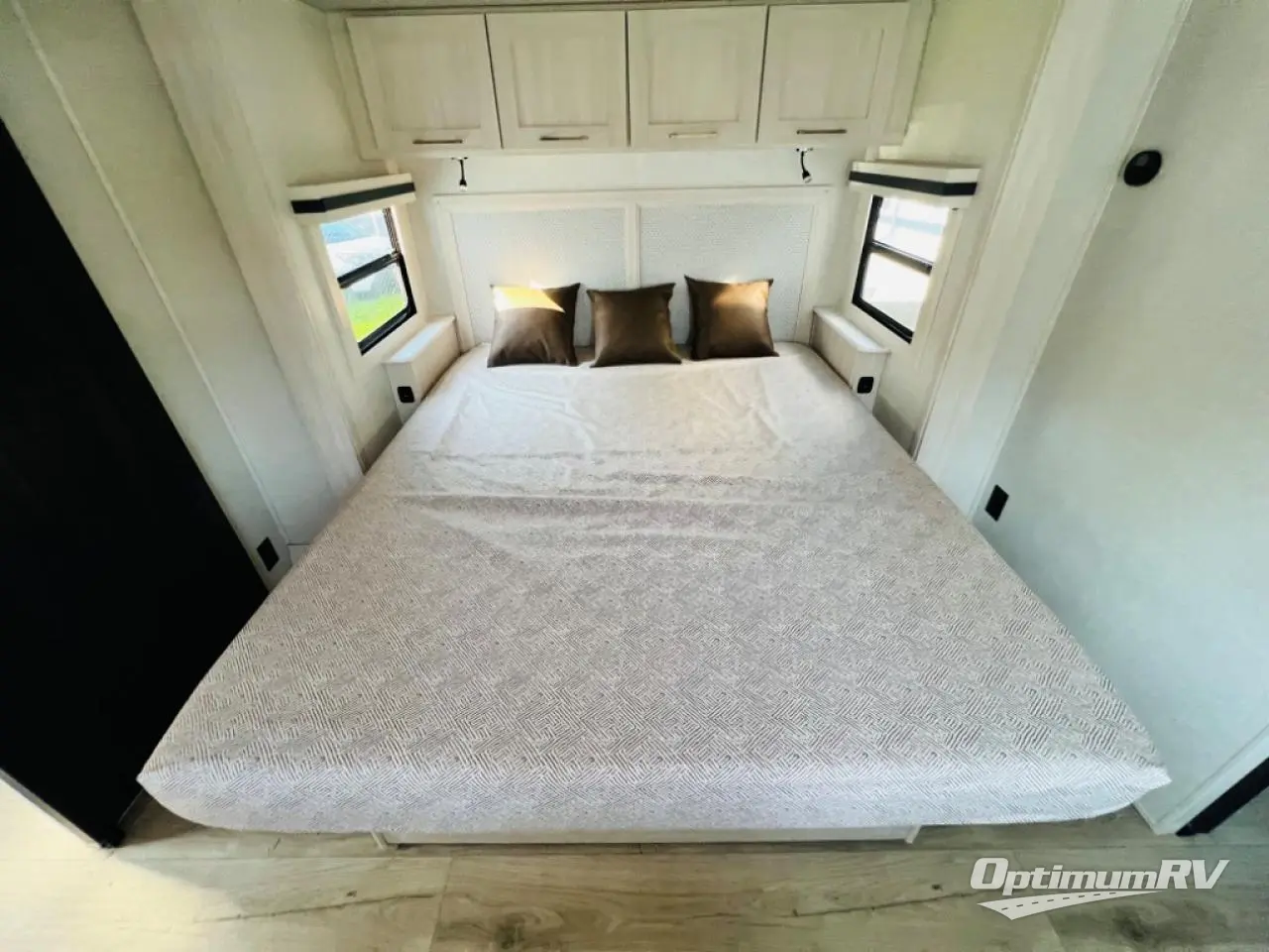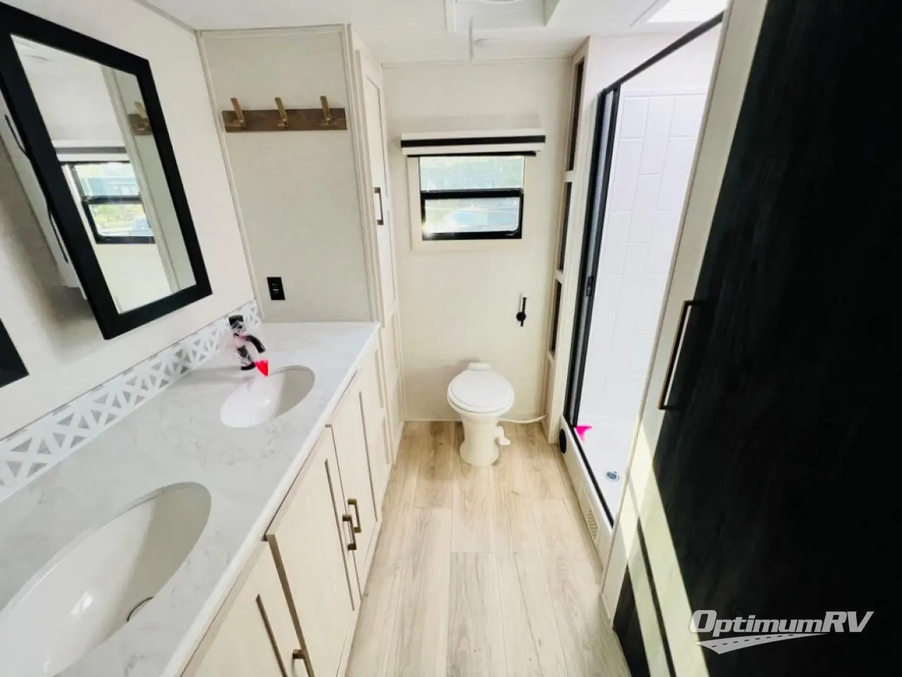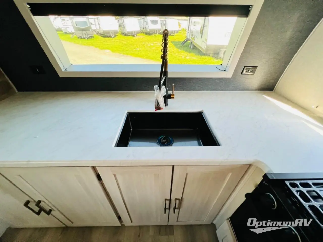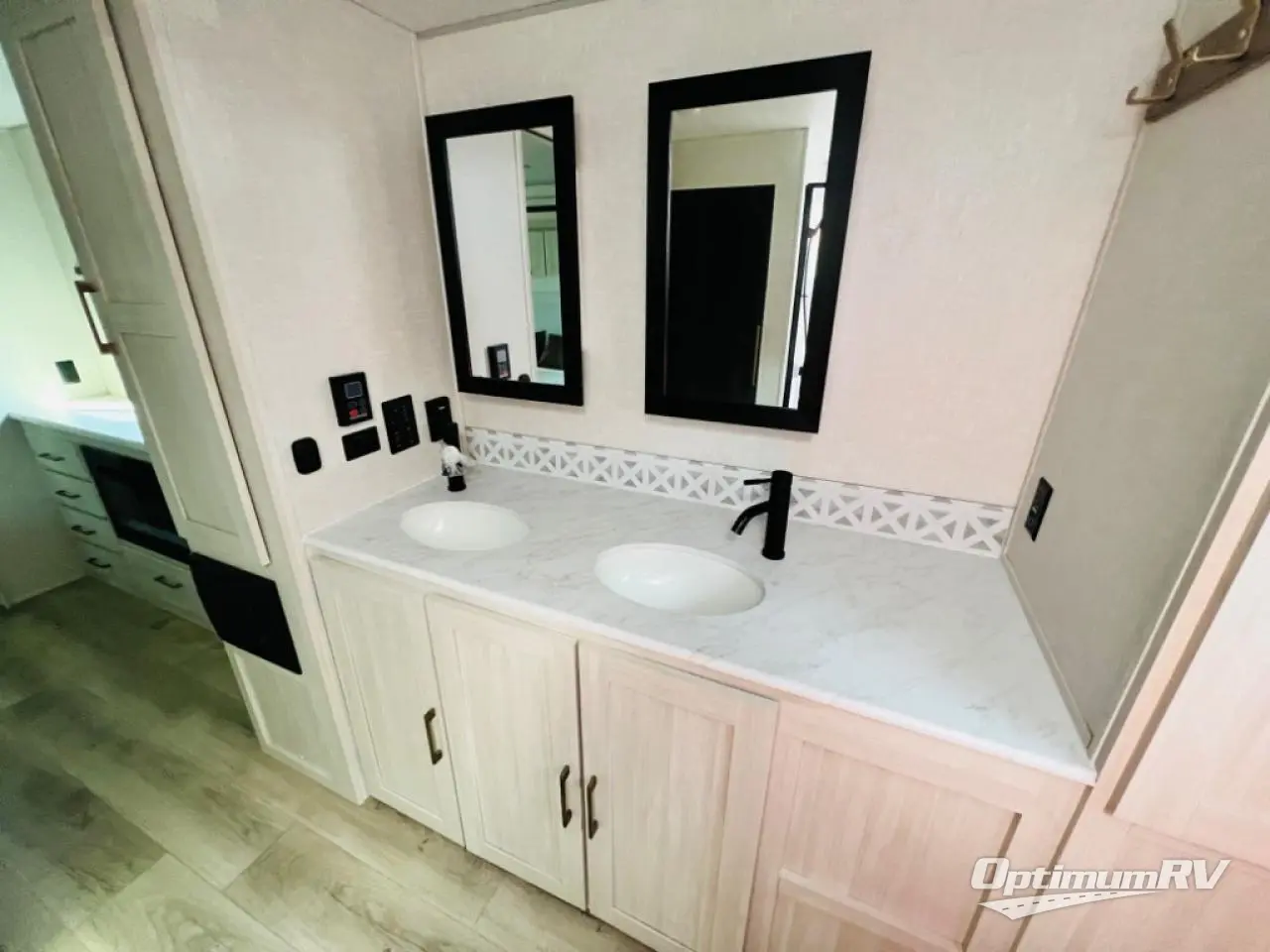 This couple's trailer will be giving you all the glamping vibes! There is a front kitchen with ample counter space, along with a counter with two bar stools, a central vacuum to easily clean up, and a slide out for more space! The second slide out is found in the middle master bedroom where you'll also enjoy a custom king bed across from a bedroom fireplace, a wardrobe, and a dresser with TV prep. Head towards the back and you'll be wowed by the full bath with dual bath sinks, an upgraded slow-close shower door, and a closet with washer and dryer prep. The exterior is just as impressive as the interior with its outside kitchen, 20' power awning with LED lights, pass-through storage, TV coax, and so much more!