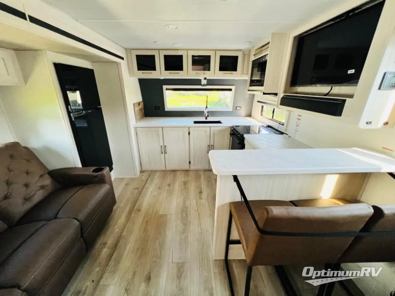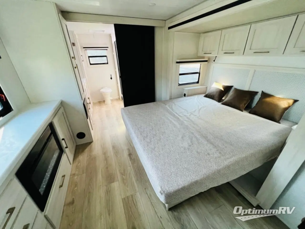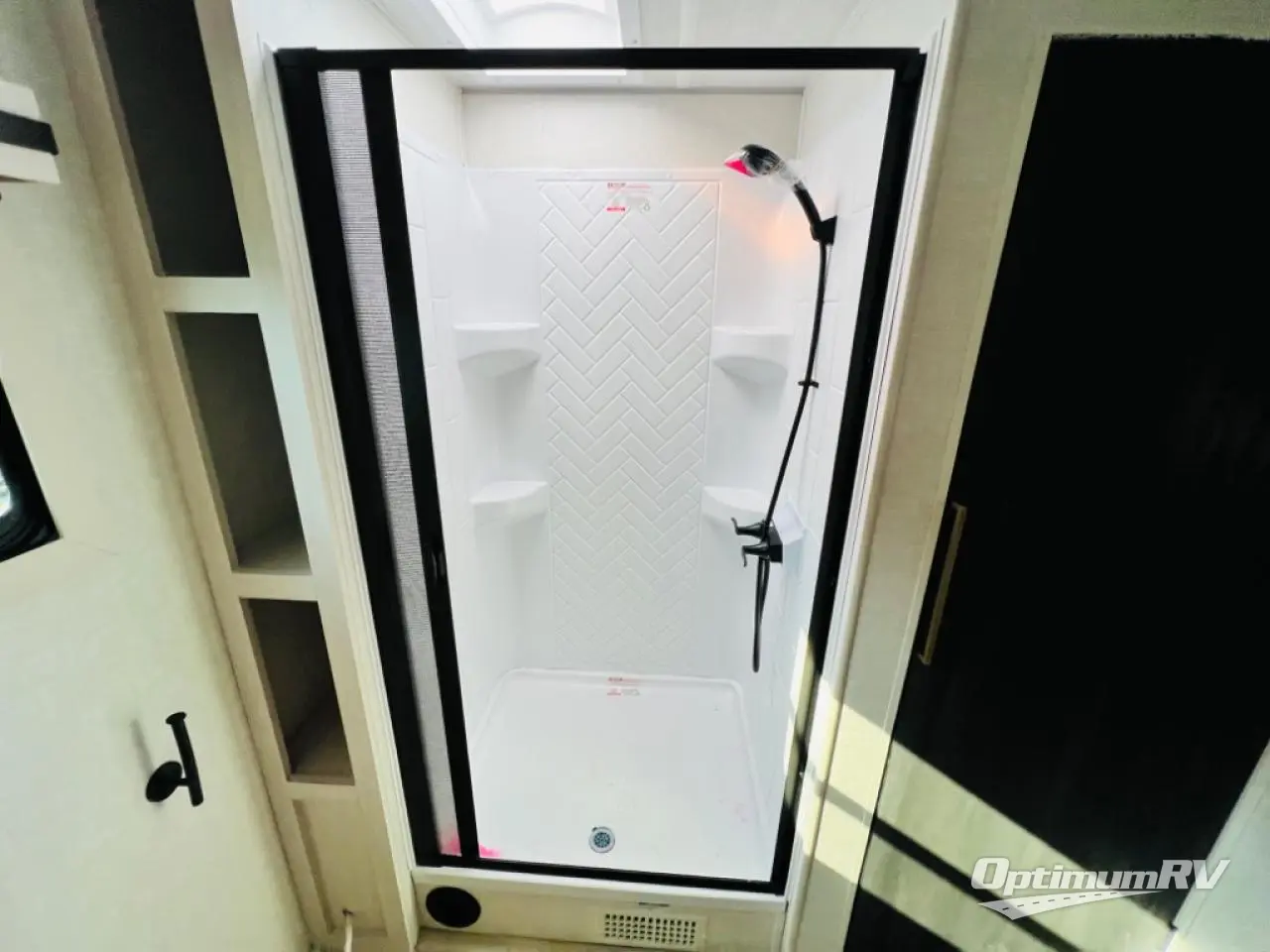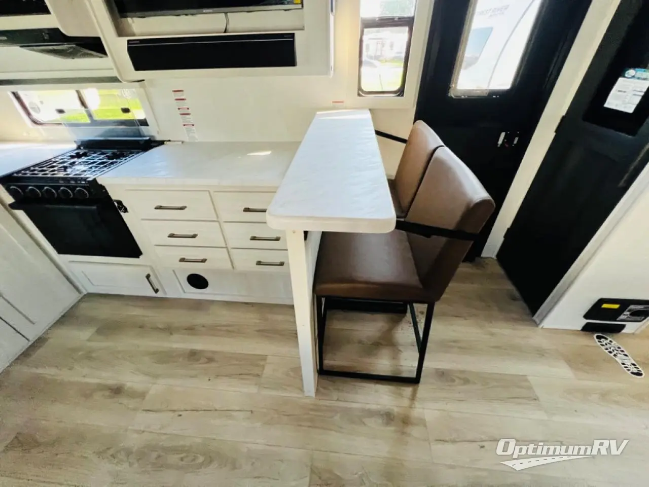 This couple's trailer will be giving you all the glamping vibes! There is a front kitchen with ample counter space, along with a counter with two bar stools, a central vacuum to easily clean up, and a slide out for more space! The second slide out is found in the middle master bedroom where you'll also enjoy a custom king bed across from a bedroom fireplace, a wardrobe, and a dresser with TV prep. Head towards the back and you'll be wowed by the full bath with dual bath sinks, an upgraded slow-close shower door, and a closet with washer and dryer prep. The exterior is just as impressive as the interior with its outside kitchen, 20' power awning with LED lights, pass-through storage, TV coax, and so much more!