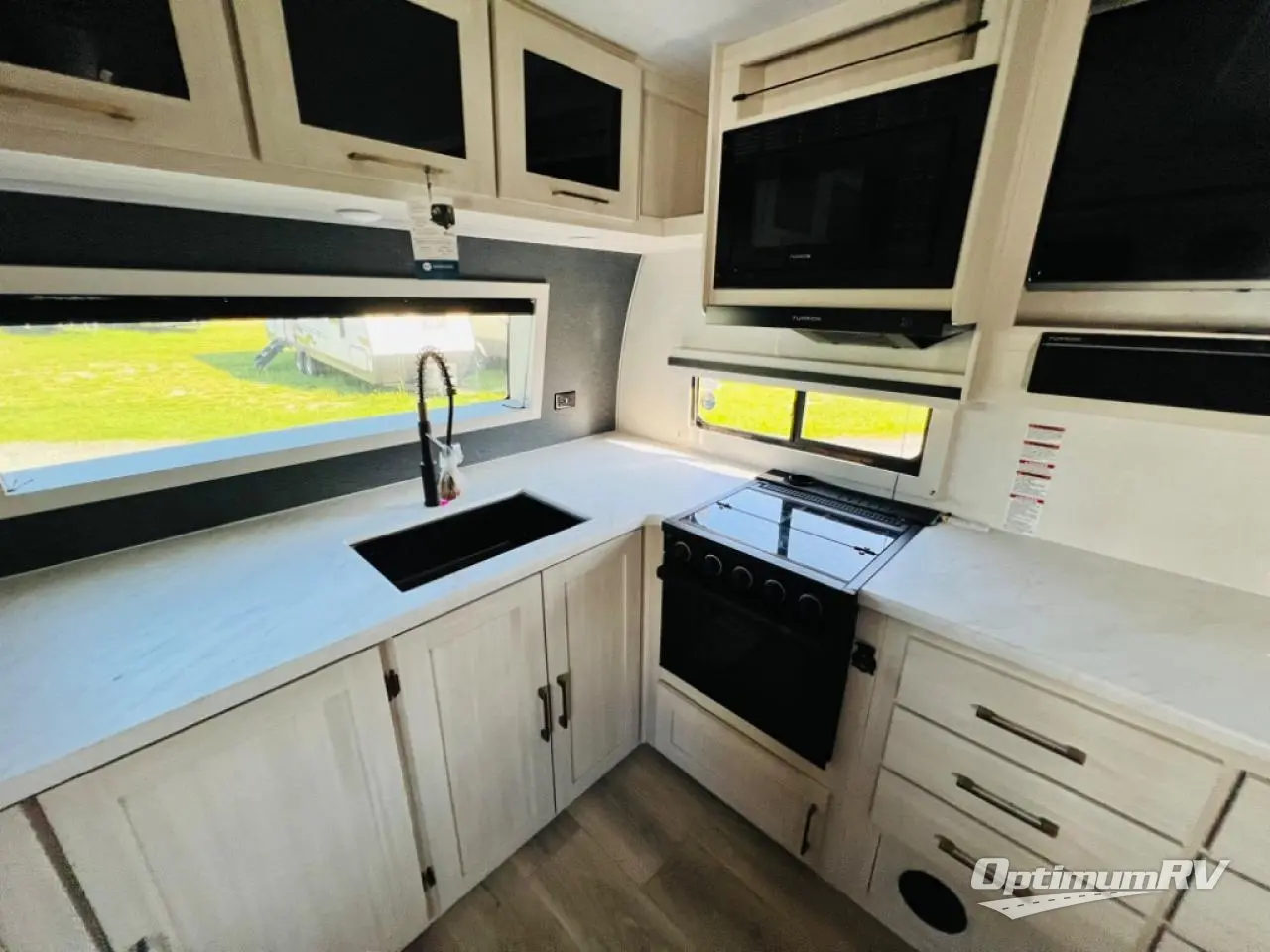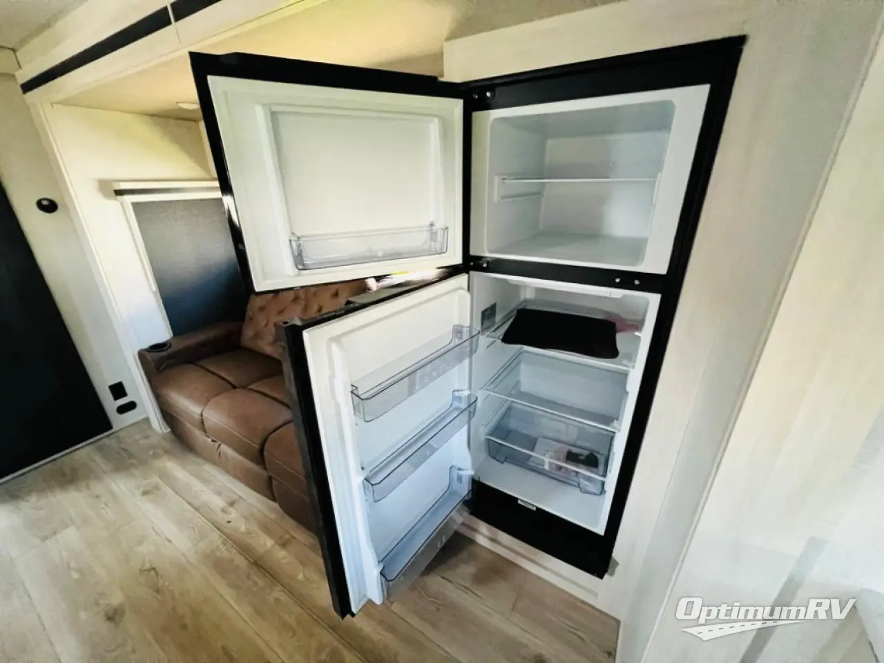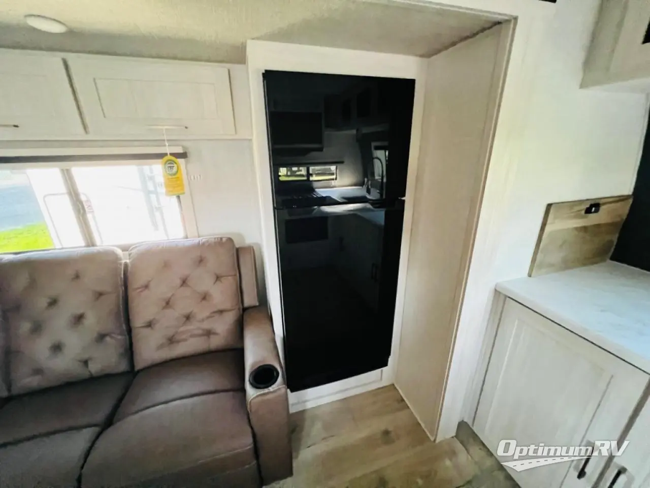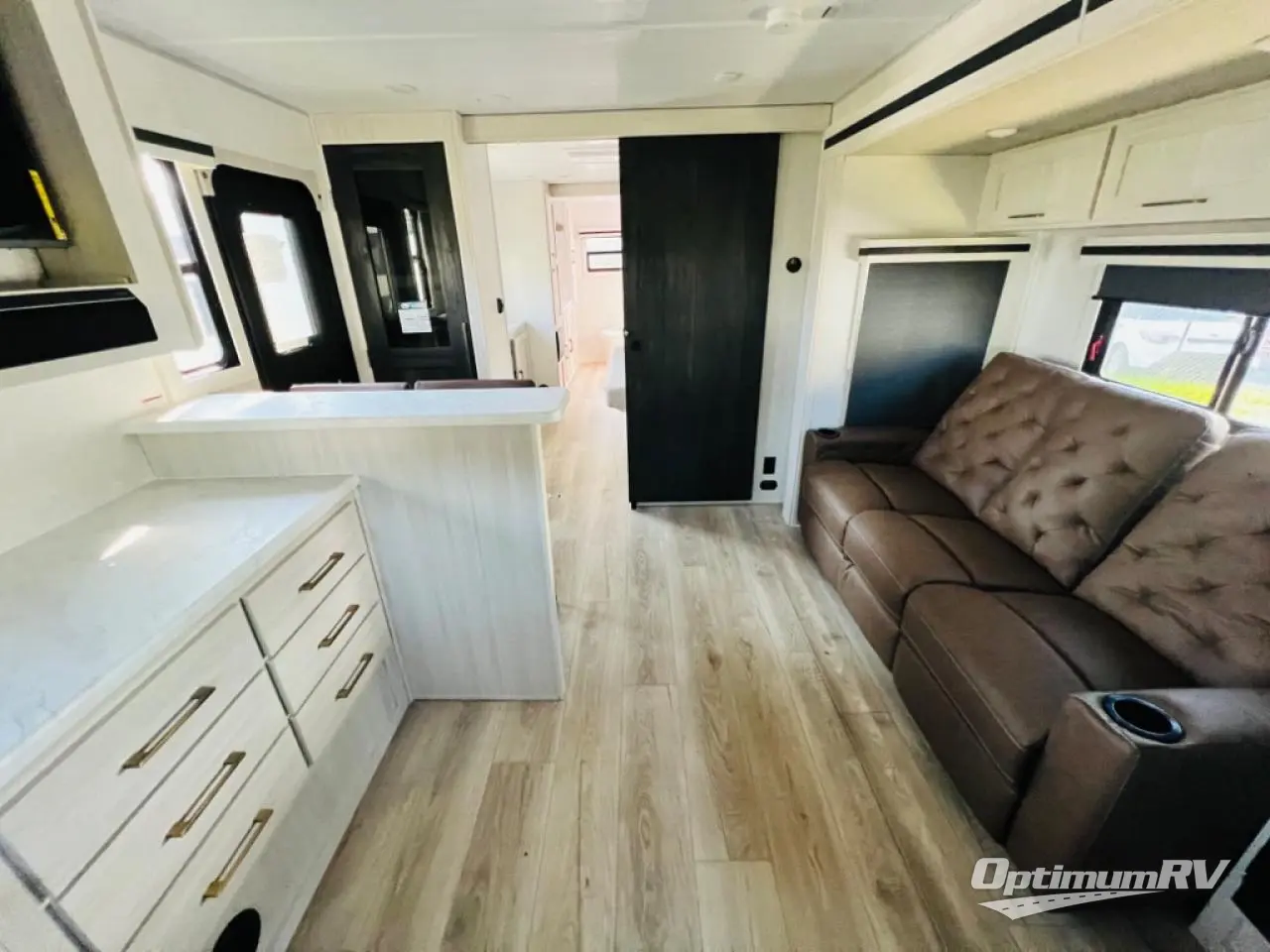 This couple's trailer will be giving you all the glamping vibes! There is a front kitchen with ample counter space, along with a counter with two bar stools, a central vacuum to easily clean up, and a slide out for more space! The second slide out is found in the middle master bedroom where you'll also enjoy a custom king bed across from a bedroom fireplace, a wardrobe, and a dresser with TV prep. Head towards the back and you'll be wowed by the full bath with dual bath sinks, an upgraded slow-close shower door, and a closet with washer and dryer prep. The exterior is just as impressive as the interior with its outside kitchen, 20' power awning with LED lights, pass-through storage, TV coax, and so much more!