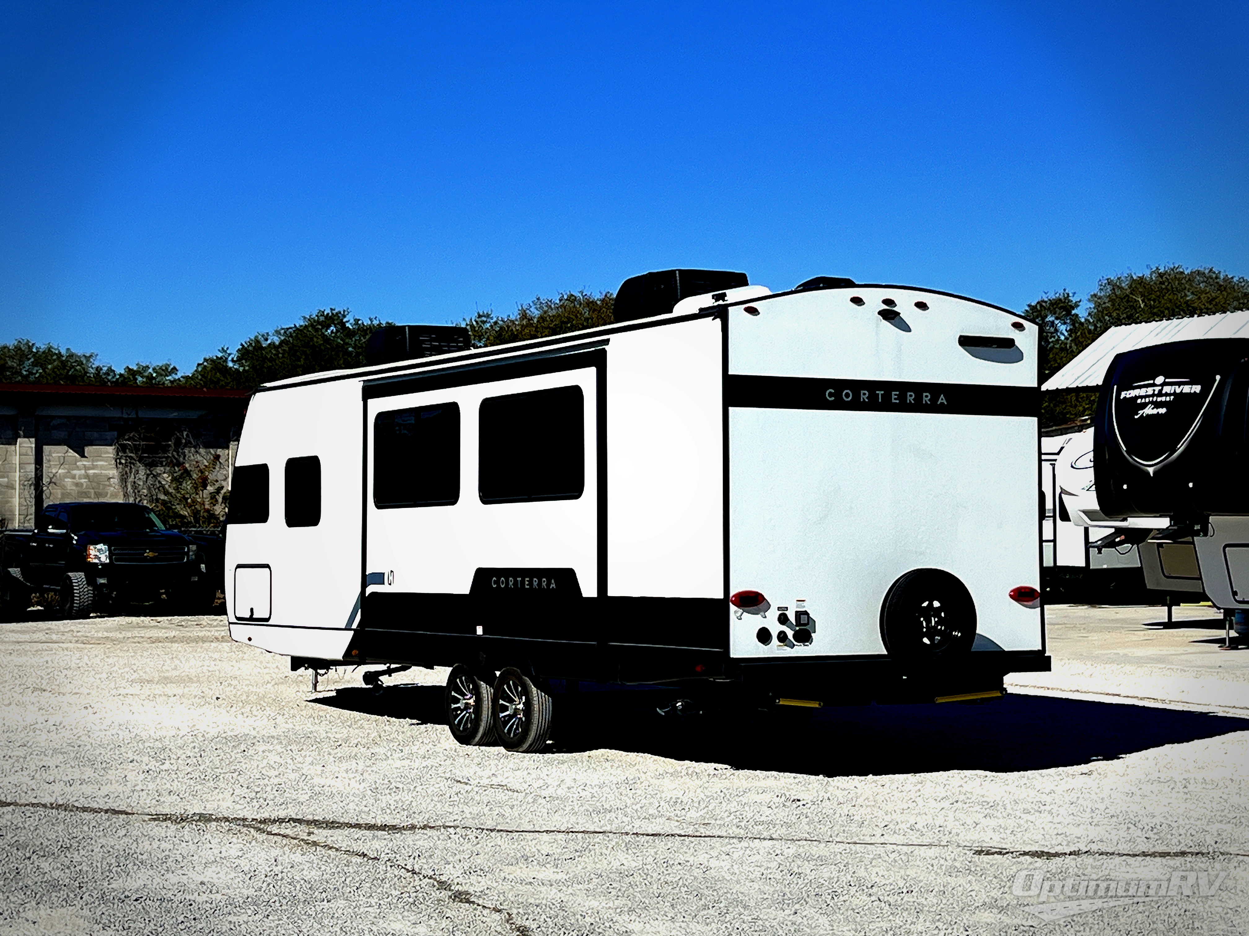 Explore the open road with any one of these Heartland Corterra fifth wheels or travel trailers! They are built with a 8" I-beam, Azdel Onboard composite sidewalls, and a heated and enclosed underbelly to protect your unit's vitals. The Vault XL and color coded wiring makes it easy to navigate through it and the exclusive TRIO airflow AC system ensures maximum cooling to keep you cooled off on a hot summer day. You can safely enter and exit the unit through the deluxe tinted glass entry door with Extended Safe-T entry grab handle. The interiors abound in luxury with hidden storage throughout, a wine and/or coffee bar for entertaining, and a residential appliance package for home cooked meals everywhere you go. Come find your favorite one today!