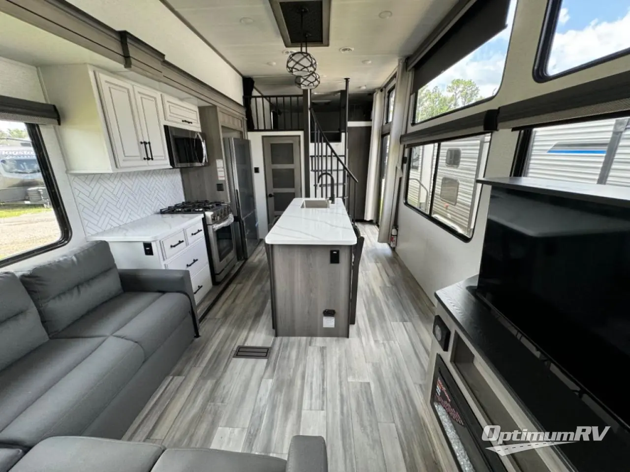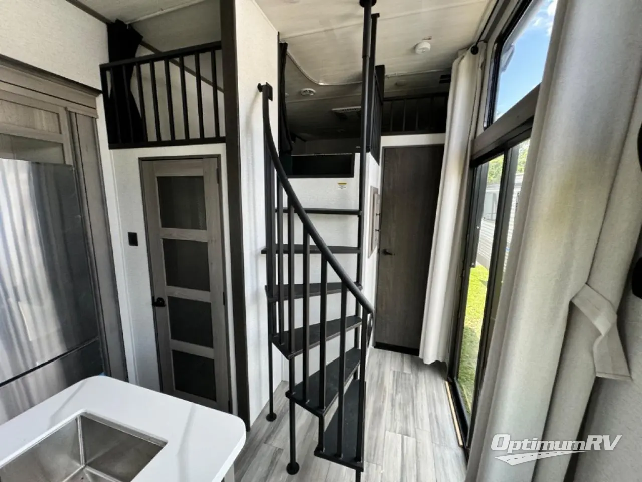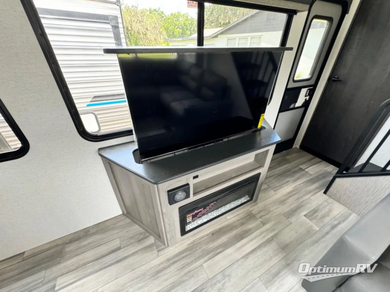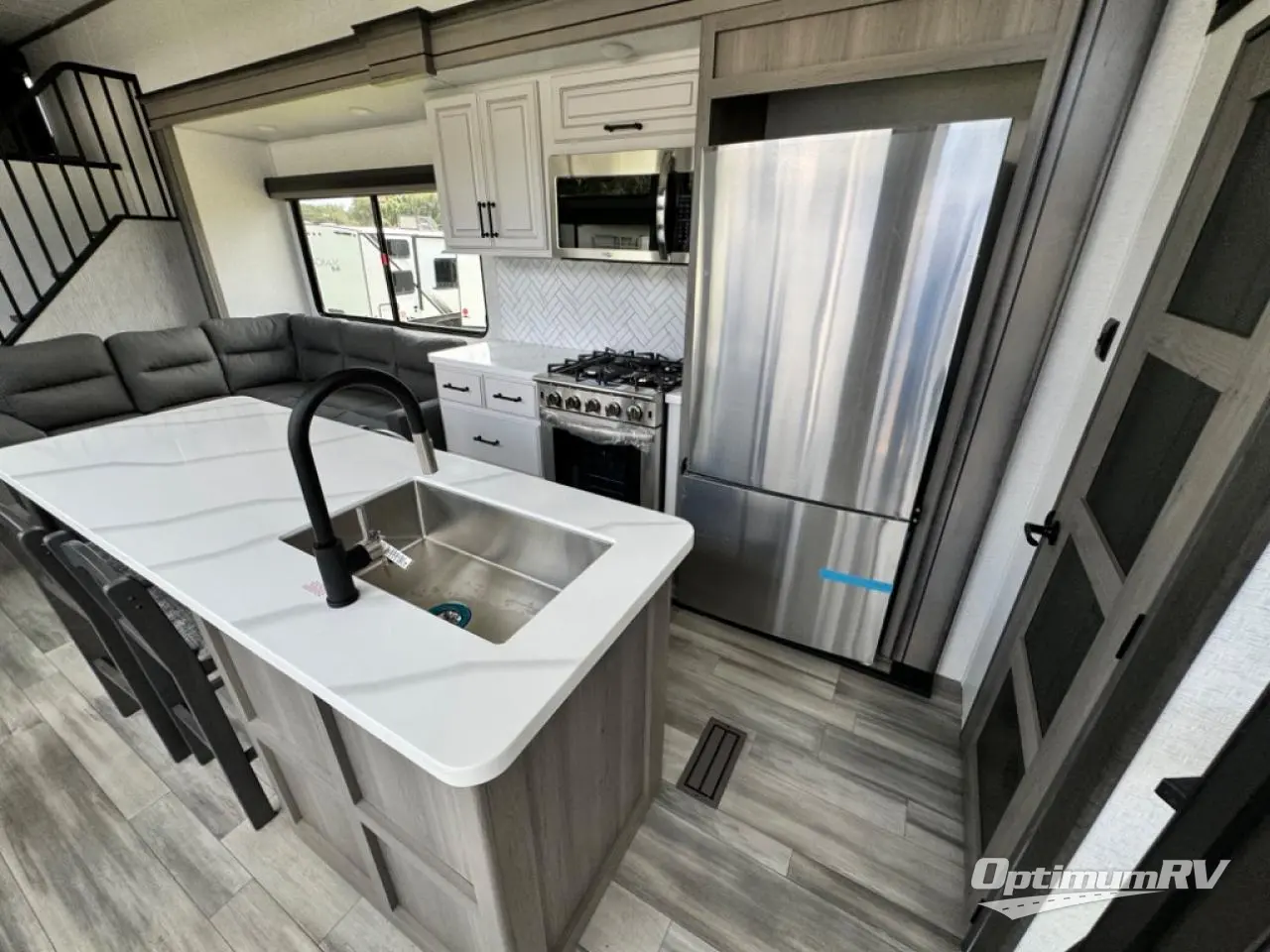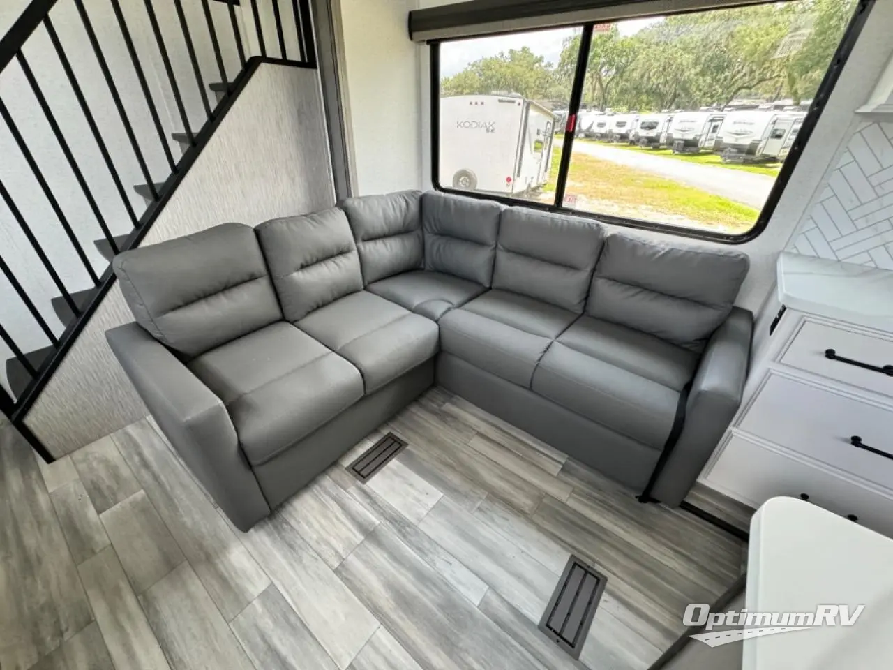 This destination trailer is so accommodating, you may just want to camp all year long! The owners will have the front bedroom all to themselves with a king bed slide out, dresser, and master closet so everything has a place. Above this room is the front loft with stairs that includes three 39" x 74" beds/sleeping spaces and storage shelves, making it perfect for little ones! The spacious full rear bath includes dual bath sinks, a large 48" x 30" shower with a seat, and a closet with washer/dryer prep if you want to add these appliances. And just outside the bath, you'll find the second set of stairs that leads to the rear loft with a 54" x 81" bed, an entertainment center, and storage shelves for your guests. During the day, everyone can meet in the combined living area and kitchen that features a large slide for more space, a sectional sofa, a kitchen island with four barstools, plus an entertainment center with a fireplace!