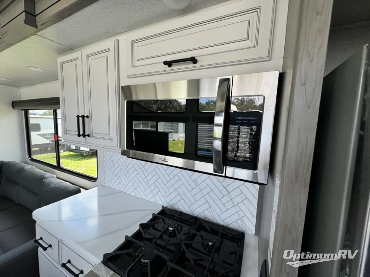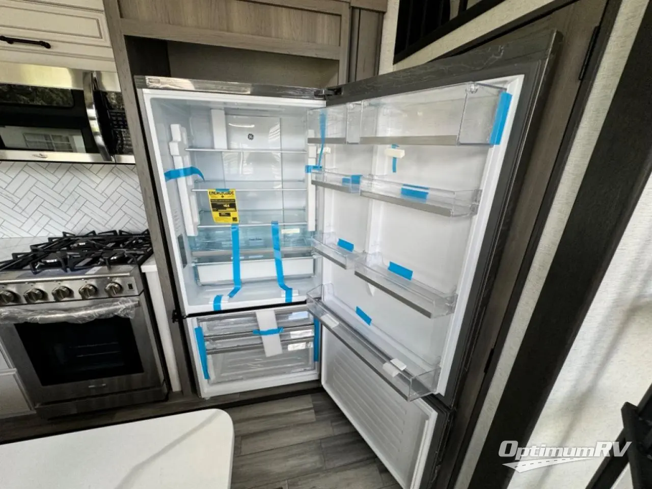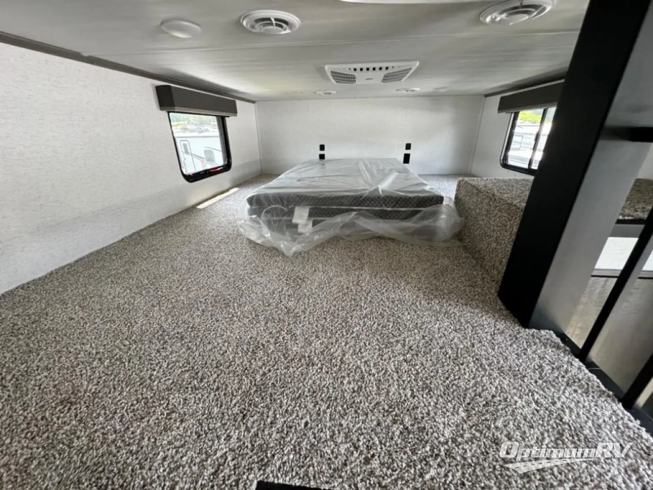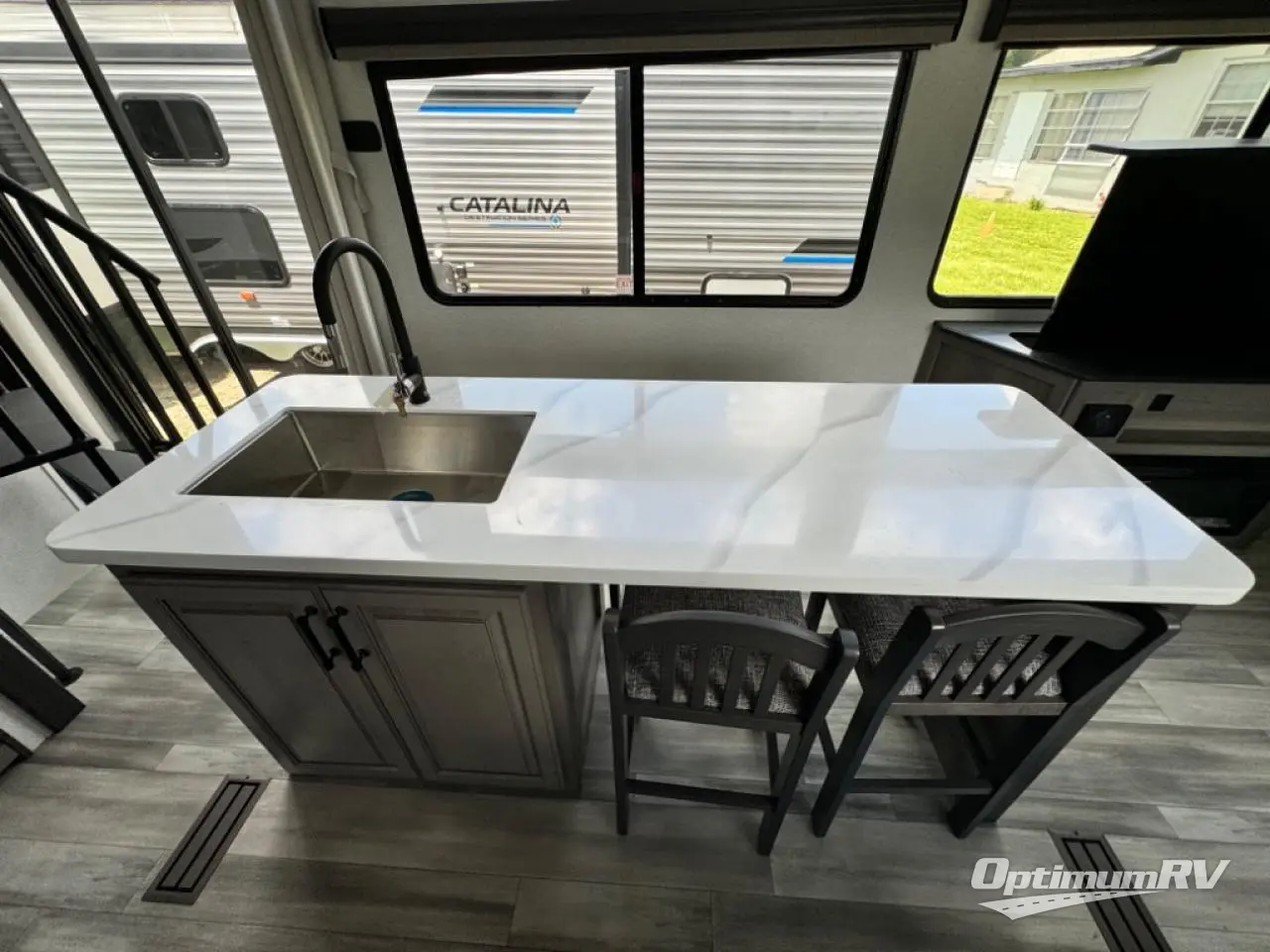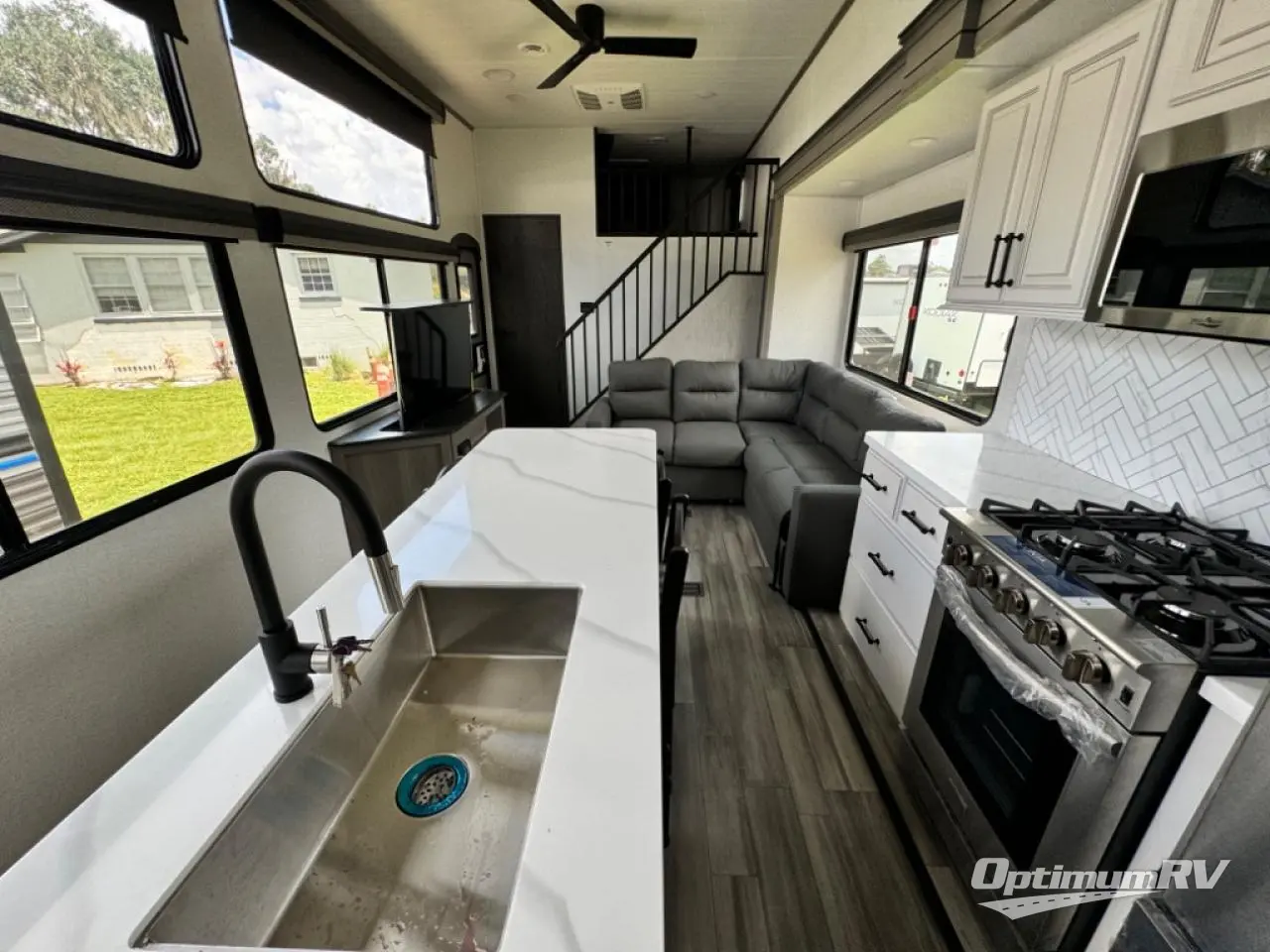 This destination trailer is so accommodating, you may just want to camp all year long! The owners will have the front bedroom all to themselves with a king bed slide out, dresser, and master closet so everything has a place. Above this room is the front loft with stairs that includes three 39" x 74" beds/sleeping spaces and storage shelves, making it perfect for little ones! The spacious full rear bath includes dual bath sinks, a large 48" x 30" shower with a seat, and a closet with washer/dryer prep if you want to add these appliances. And just outside the bath, you'll find the second set of stairs that leads to the rear loft with a 54" x 81" bed, an entertainment center, and storage shelves for your guests. During the day, everyone can meet in the combined living area and kitchen that features a large slide for more space, a sectional sofa, a kitchen island with four barstools, plus an entertainment center with a fireplace!