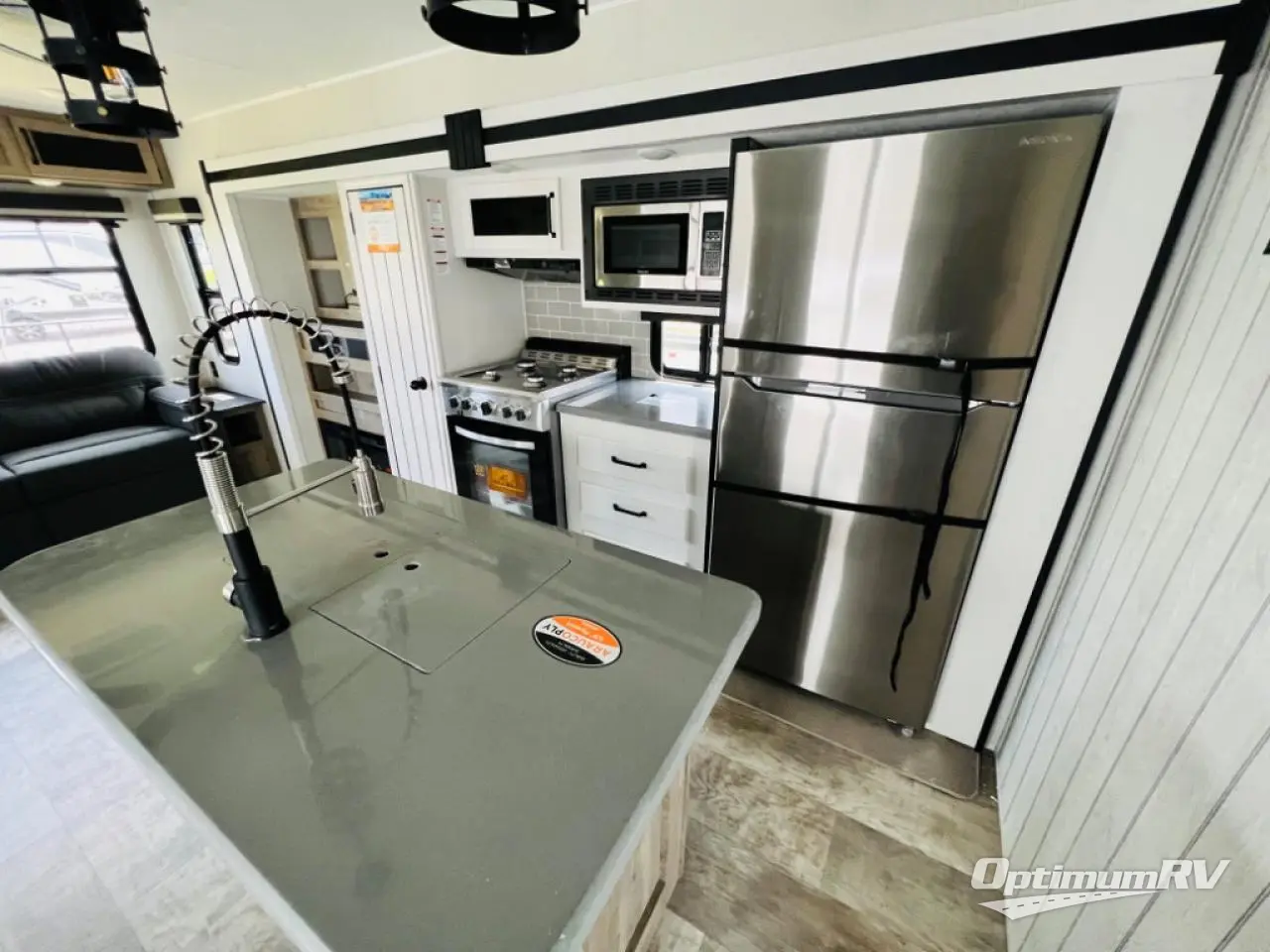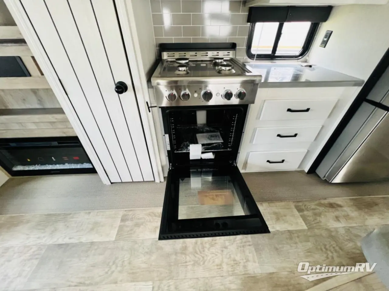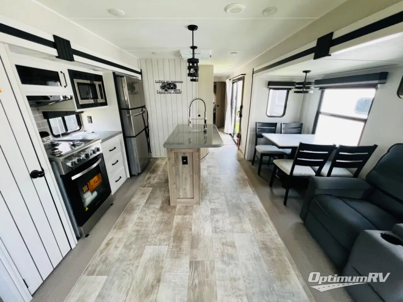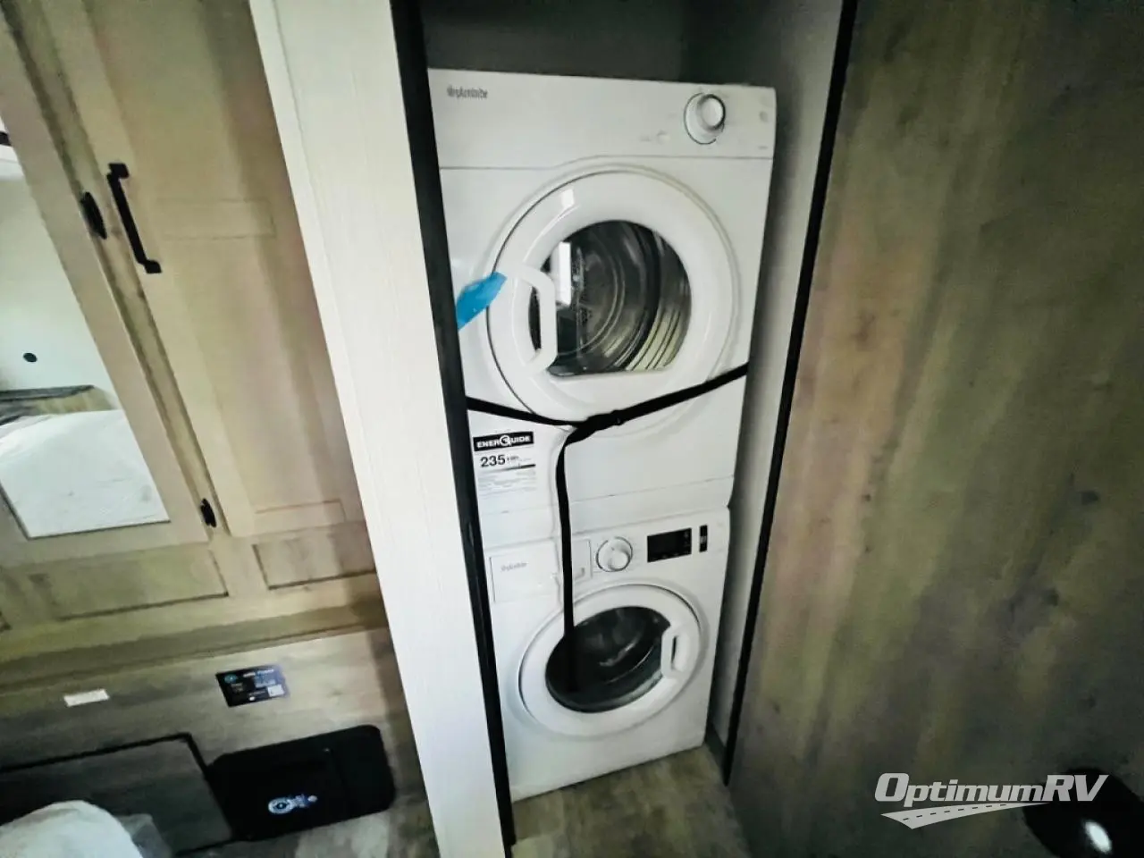 Everyone will want to join you when you head back out to the lake to stay in this trailer! With the middle bunkhouse that includes a bunk above a jiffy sofa and a closet, this can be your kids room or guests headquarters. You will have your own privacy when needed in the front bedroom which includes a queen bed slide and two closets. There is also a dresser and a space within a closet for a washer/dryer prep option. The full bathroom is conveniently located between the two rooms, and the rear of the destination trailer offers a combined living and kitchen area. The dual slides give you lots of floor space around the kitchen island to relax on the booth dinette or sofa, and the cook will have full kitchen amenities including a residential style refrigerator.