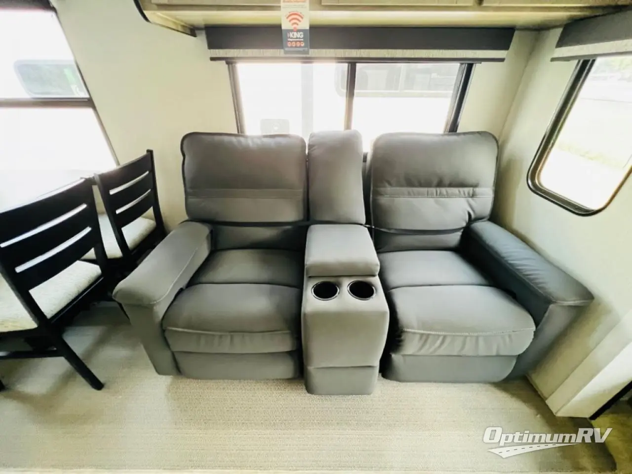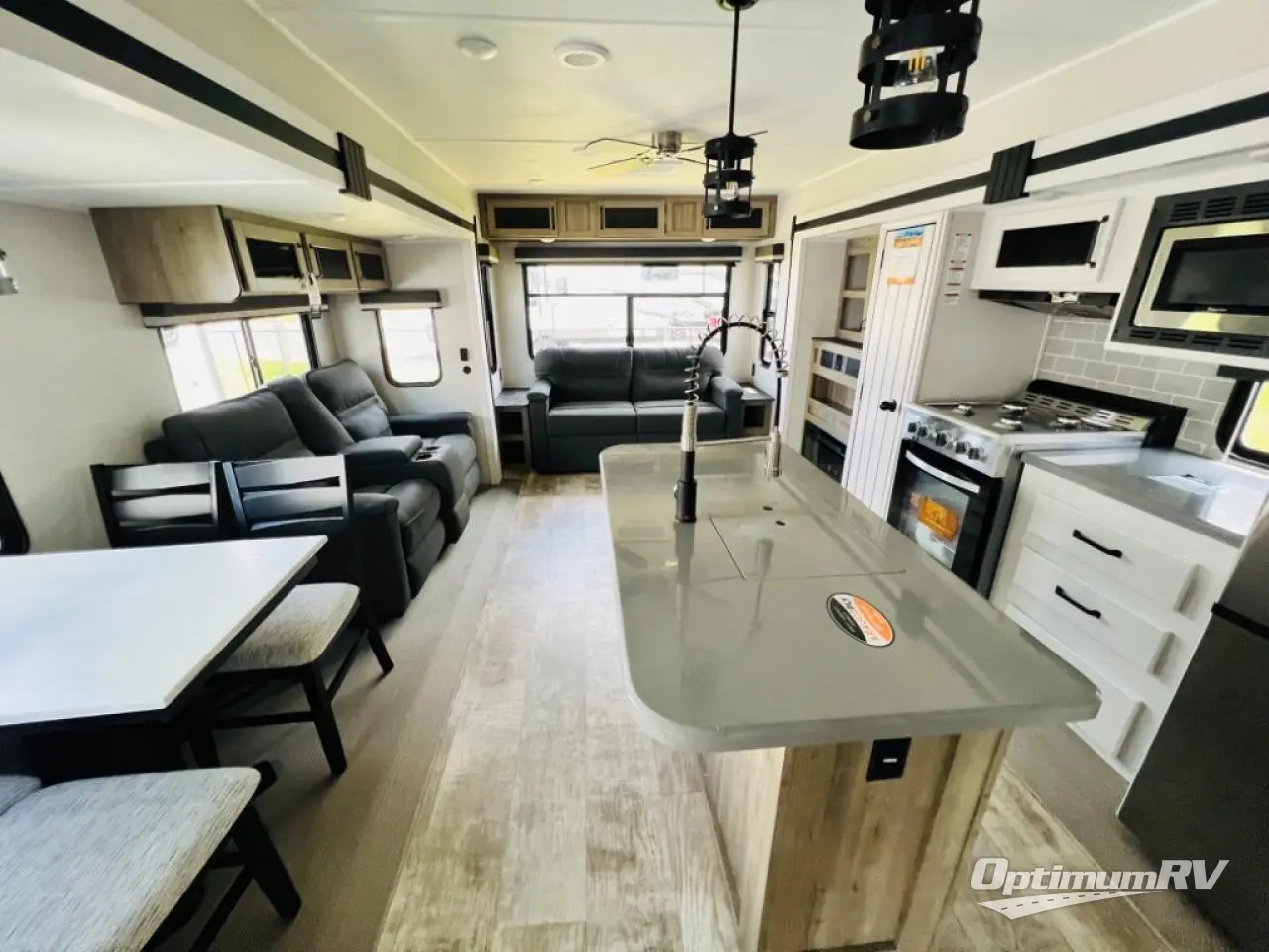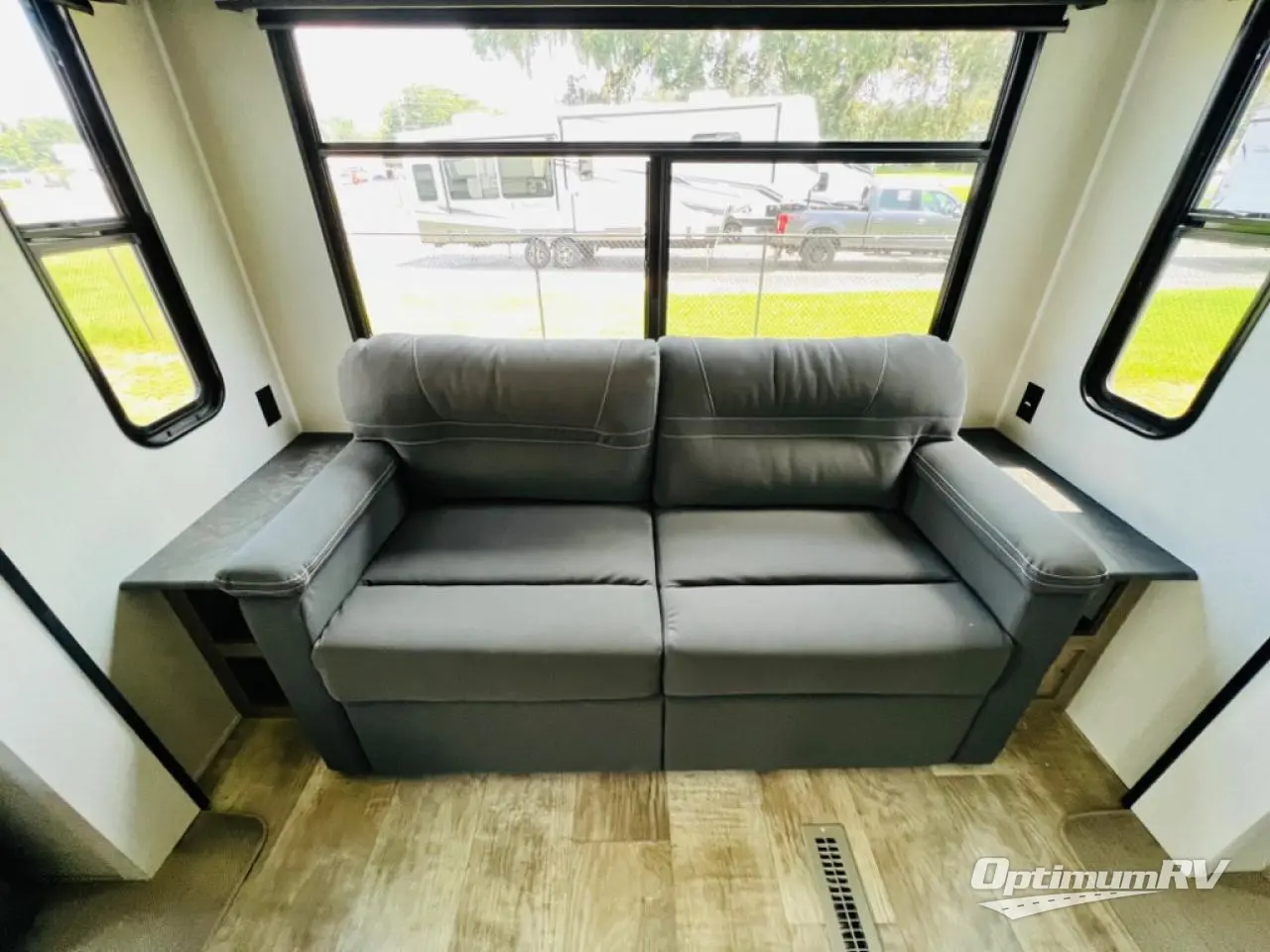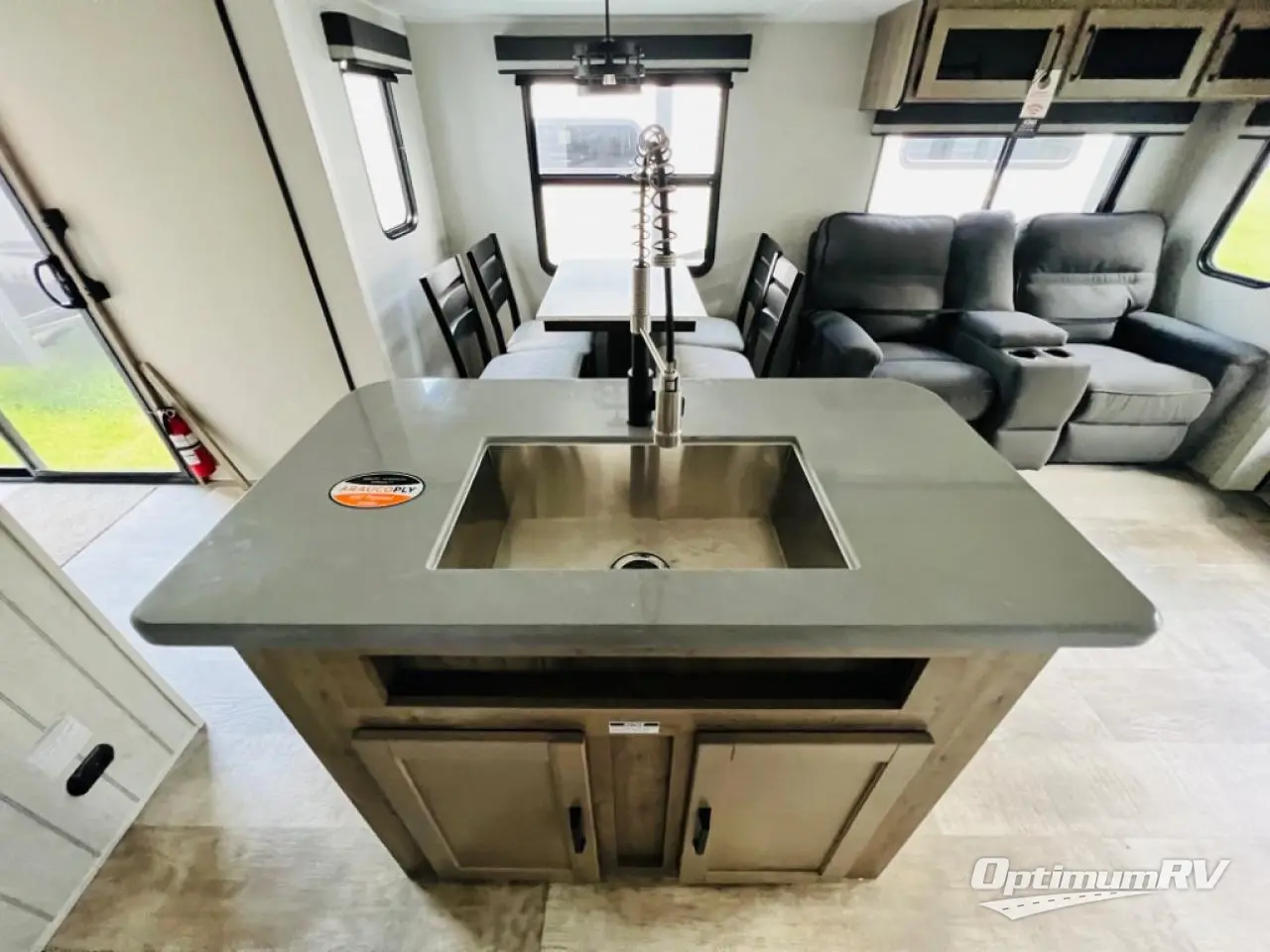 Everyone will want to join you when you head back out to the lake to stay in this trailer! With the middle bunkhouse that includes a bunk above a jiffy sofa and a closet, this can be your kids room or guests headquarters. You will have your own privacy when needed in the front bedroom which includes a queen bed slide and two closets. There is also a dresser and a space within a closet for a washer/dryer prep option. The full bathroom is conveniently located between the two rooms, and the rear of the destination trailer offers a combined living and kitchen area. The dual slides give you lots of floor space around the kitchen island to relax on the booth dinette or sofa, and the cook will have full kitchen amenities including a residential style refrigerator.