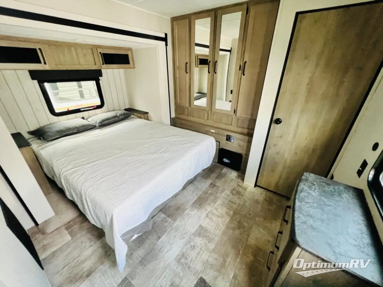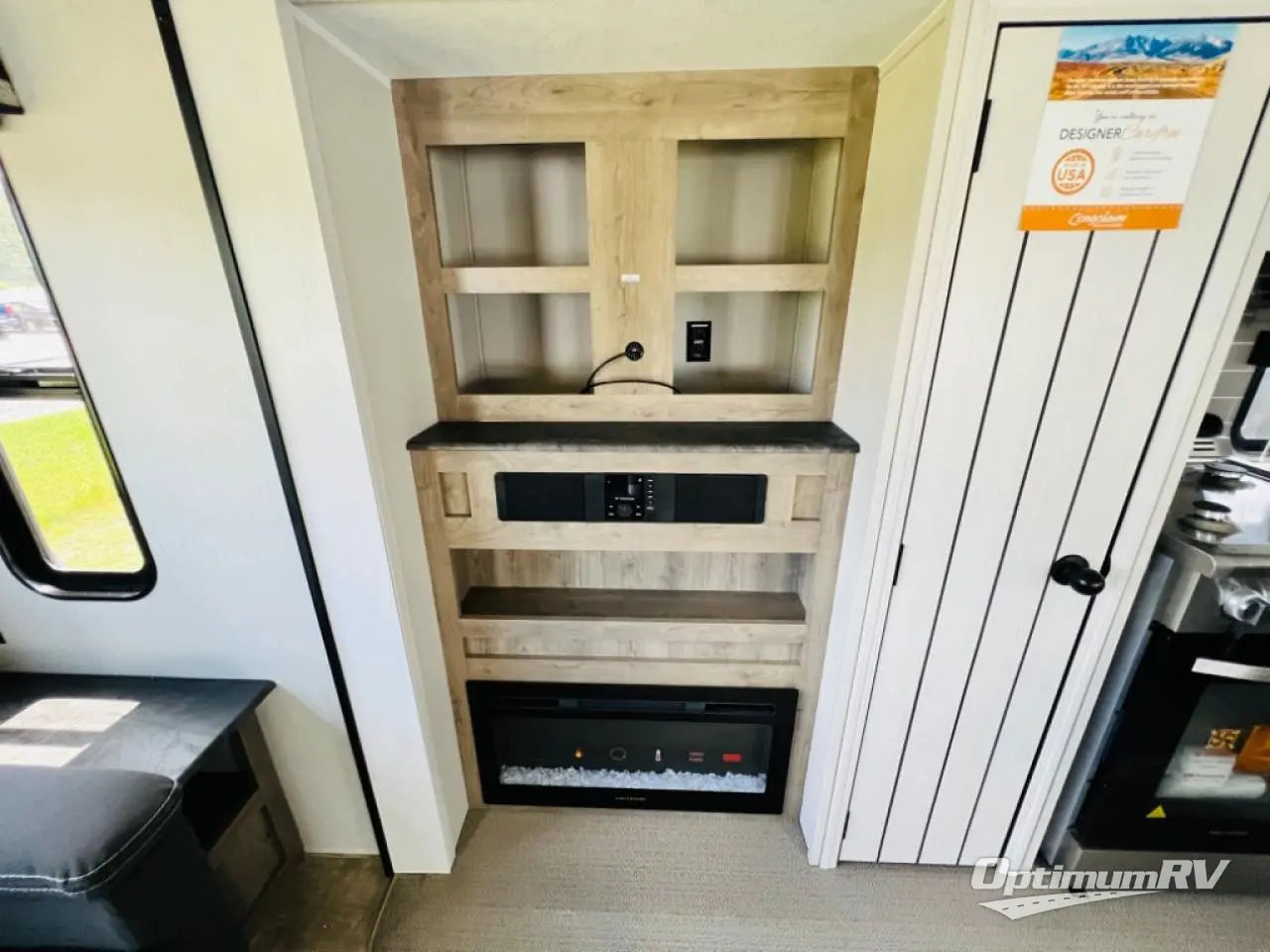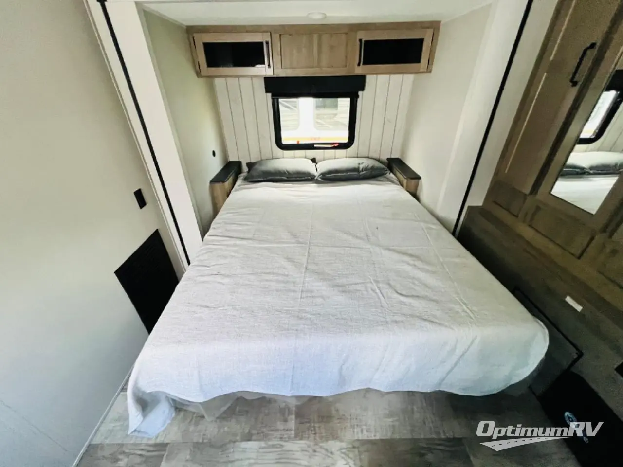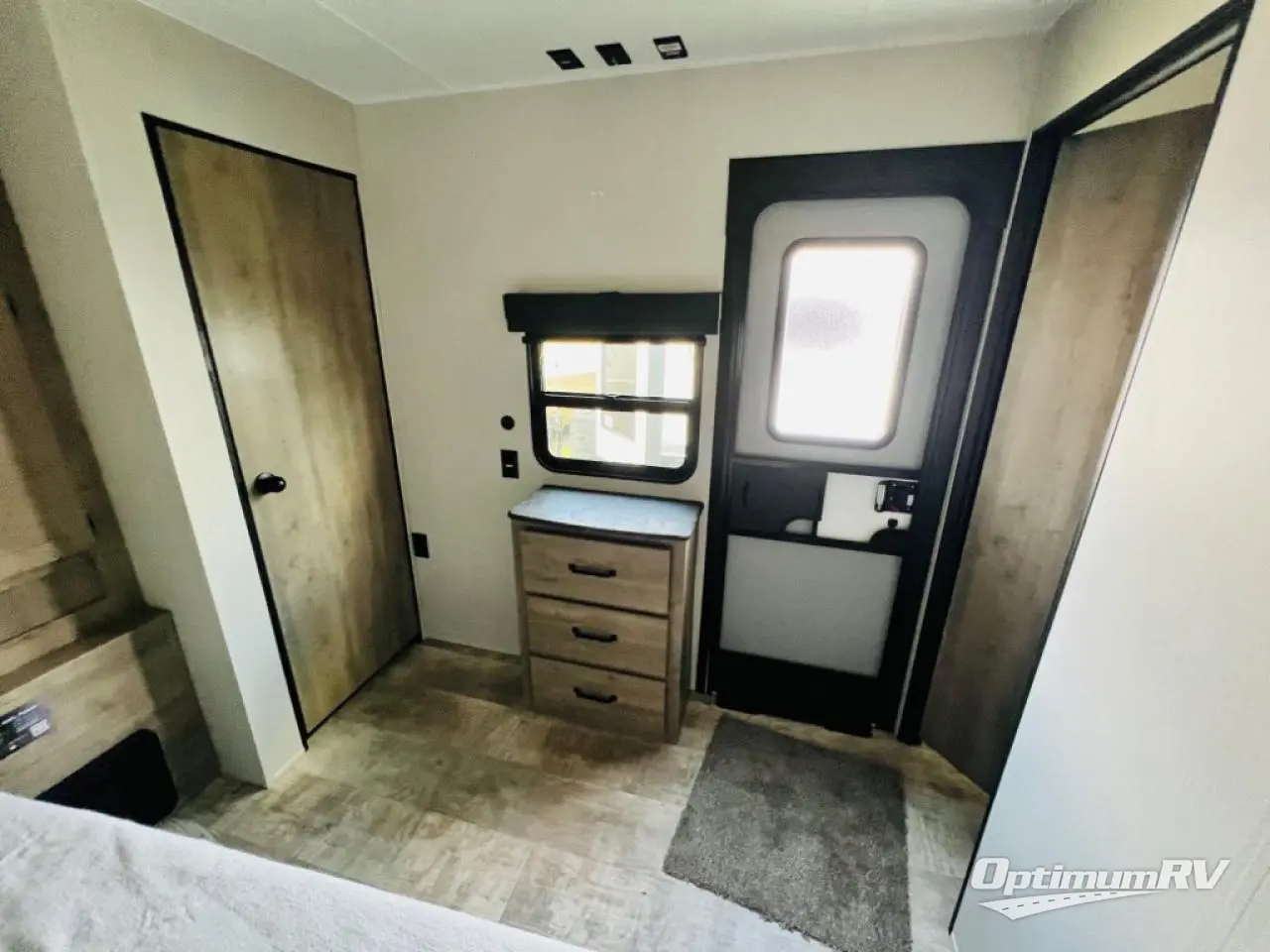Everyone will want to join you when you head back out to the lake to stay in this trailer! With the middle bunkhouse that includes a bunk above a jiffy sofa and a closet, this can be your kids room or guests headquarters. You will have your own privacy when needed in the front bedroom which includes a queen bed slide and two closets. There is also a dresser and a space within a closet for a washer/dryer prep option. The full bathroom is conveniently located between the two rooms, and the rear of the destination trailer offers a combined living and kitchen area. The dual slides give you lots of floor space around the kitchen island to relax on the booth dinette or sofa, and the cook will have full kitchen amenities including a residential style refrigerator.