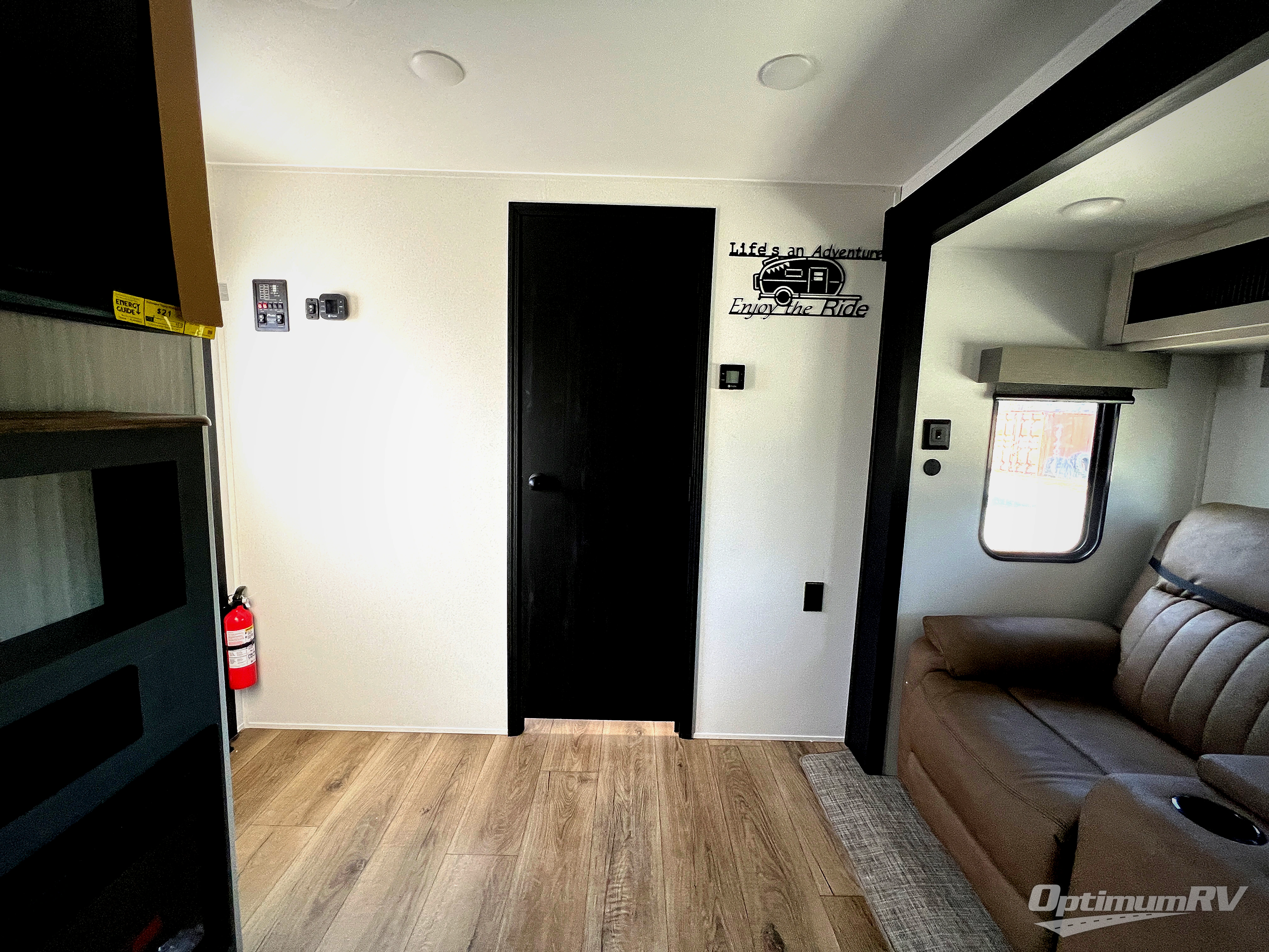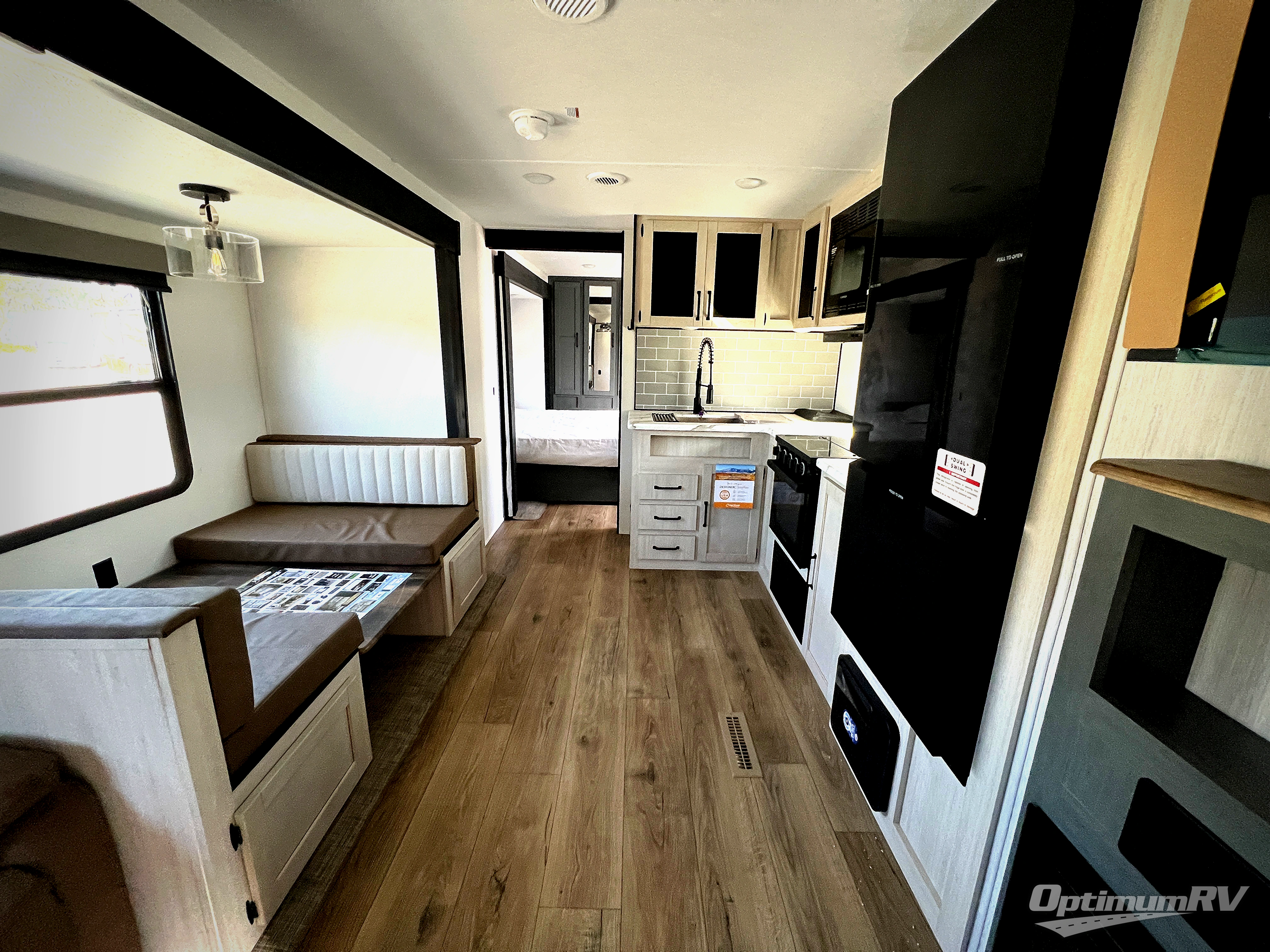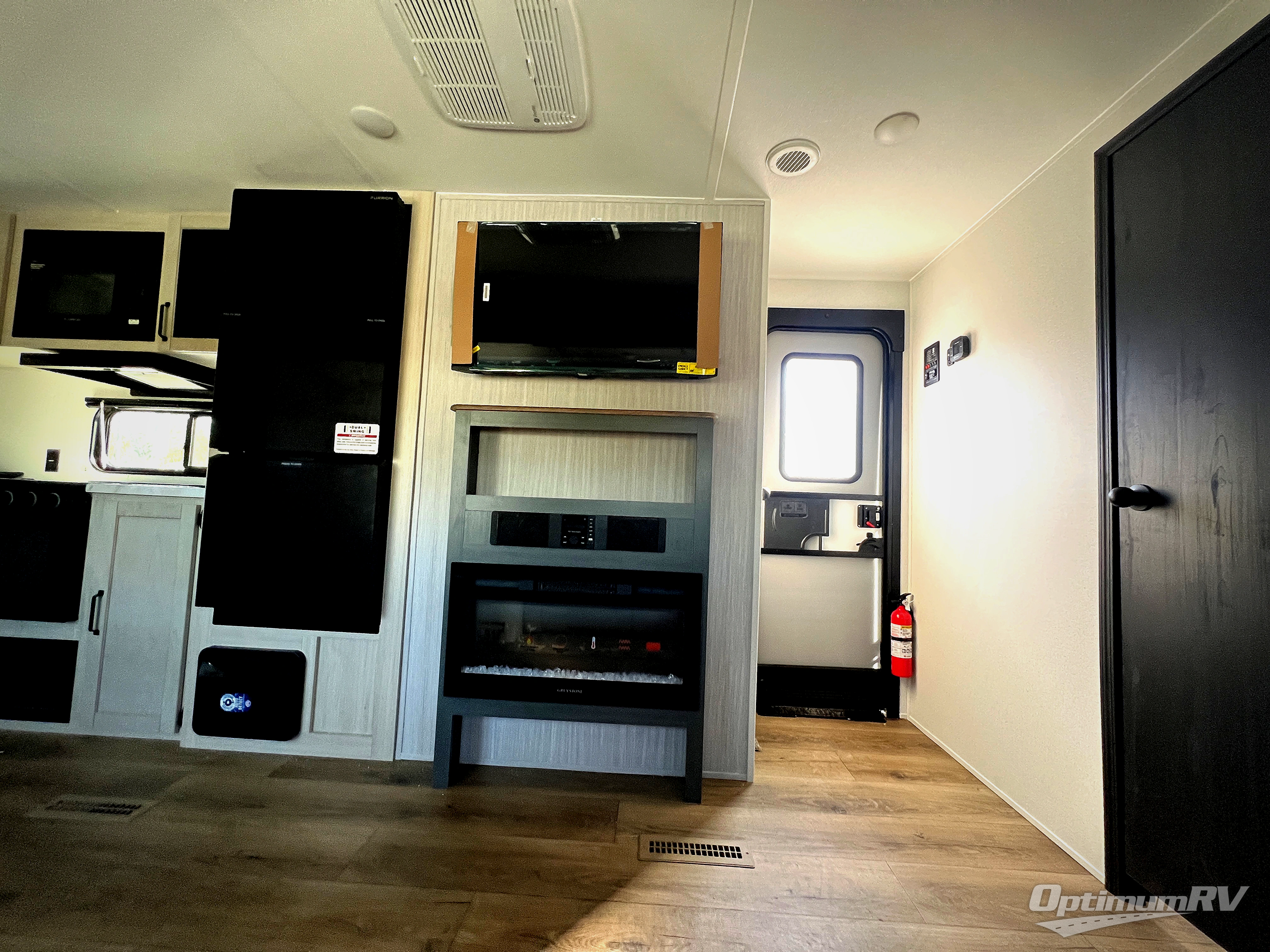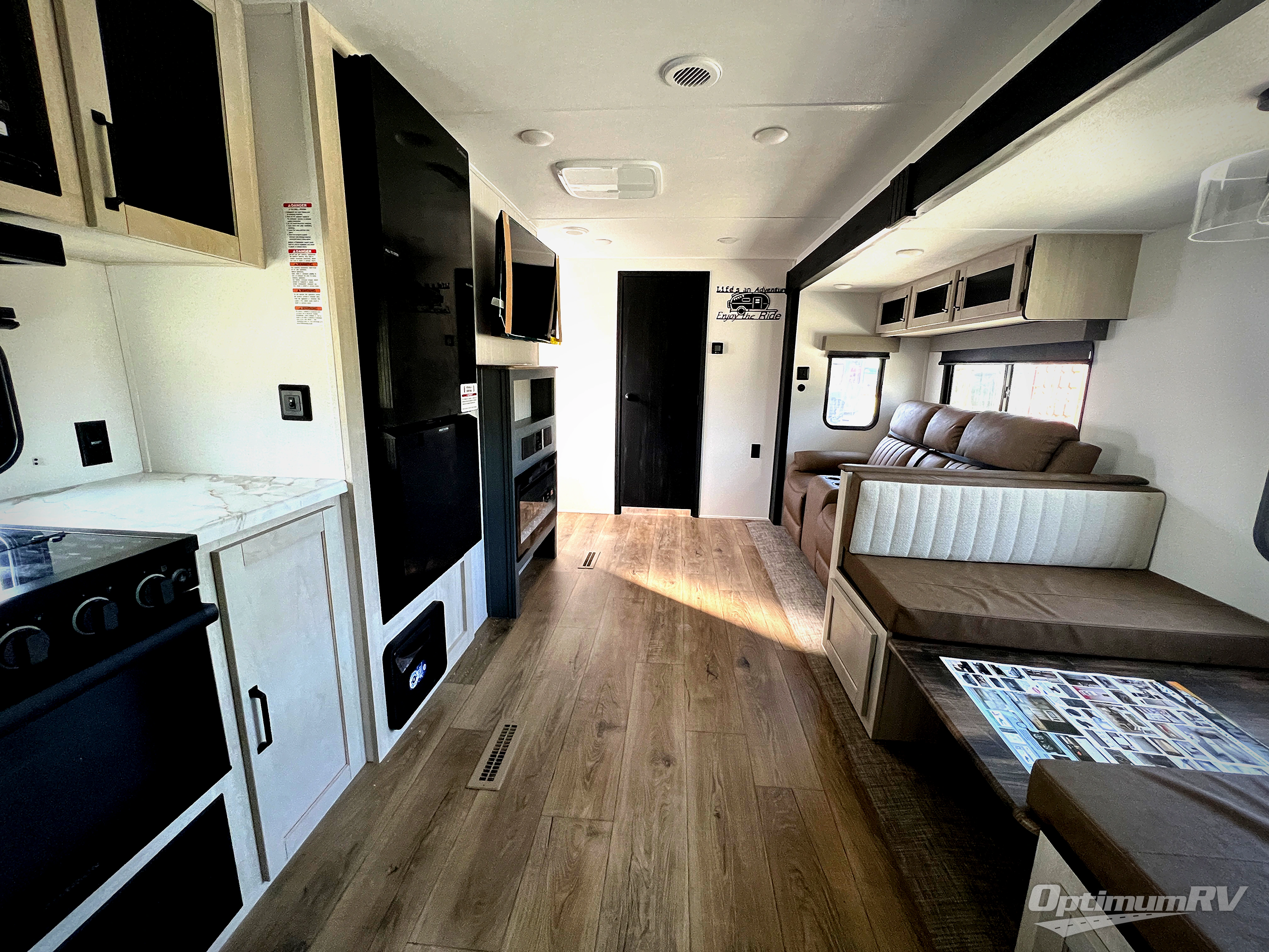 Head to the lake in this double slide out travel trailer that can sleep four to five each night. You will love having the front private bedroom all to yourselves that includes a queen bed slide out, a front wardrobe, a closet with washer and dryer prep, plus your own exterior entry door. Your guests can sleep on the sofa and booth dinette within the second slide out, and the full rear bath is tucked away for privacy. This model also includes an entryway closet/pantry for food storage and jackets, and the fireplace across from the sofa makes your space cozier. An optional outside micro kitchen is available also if you like to cook outdoors!
