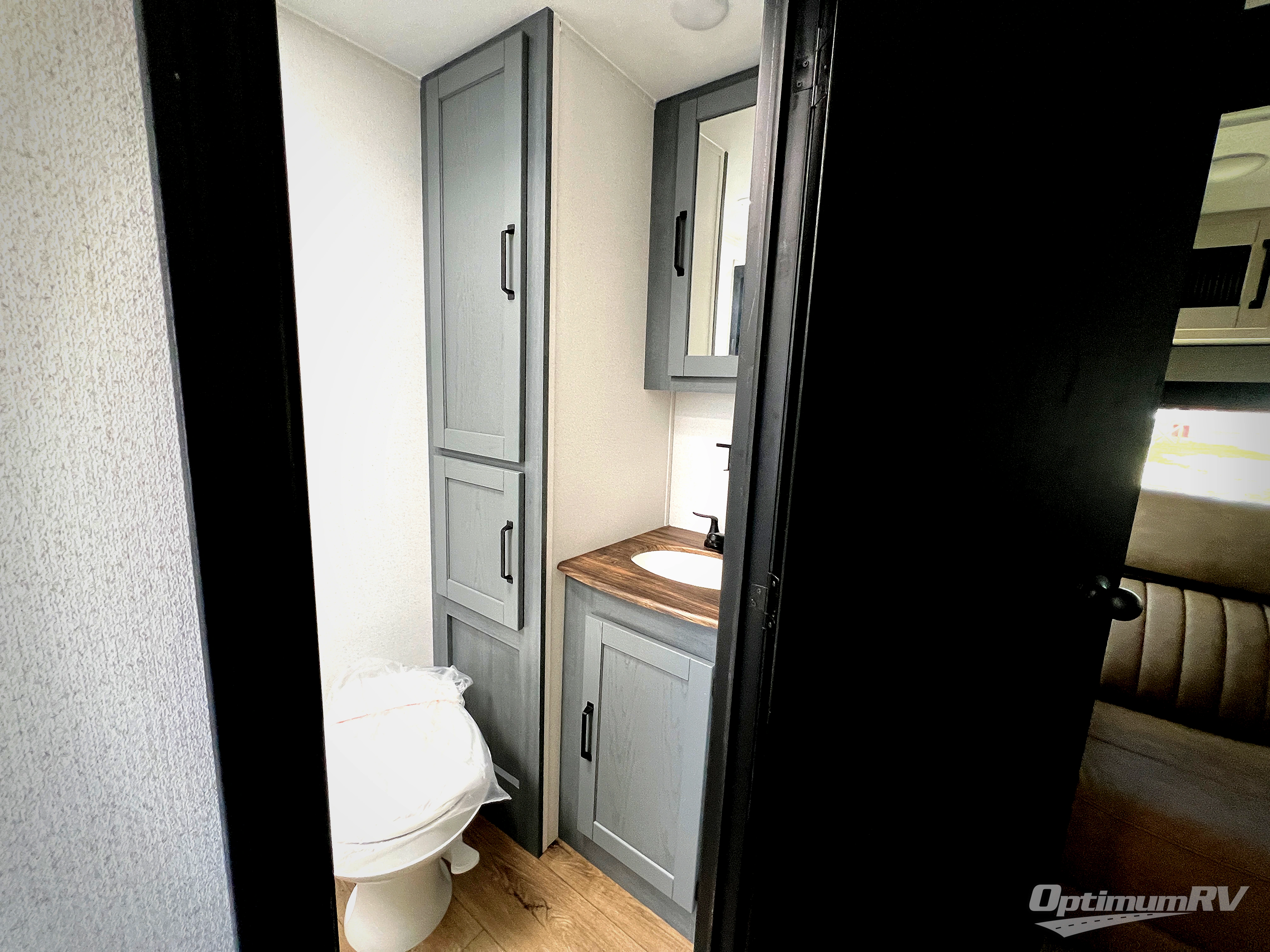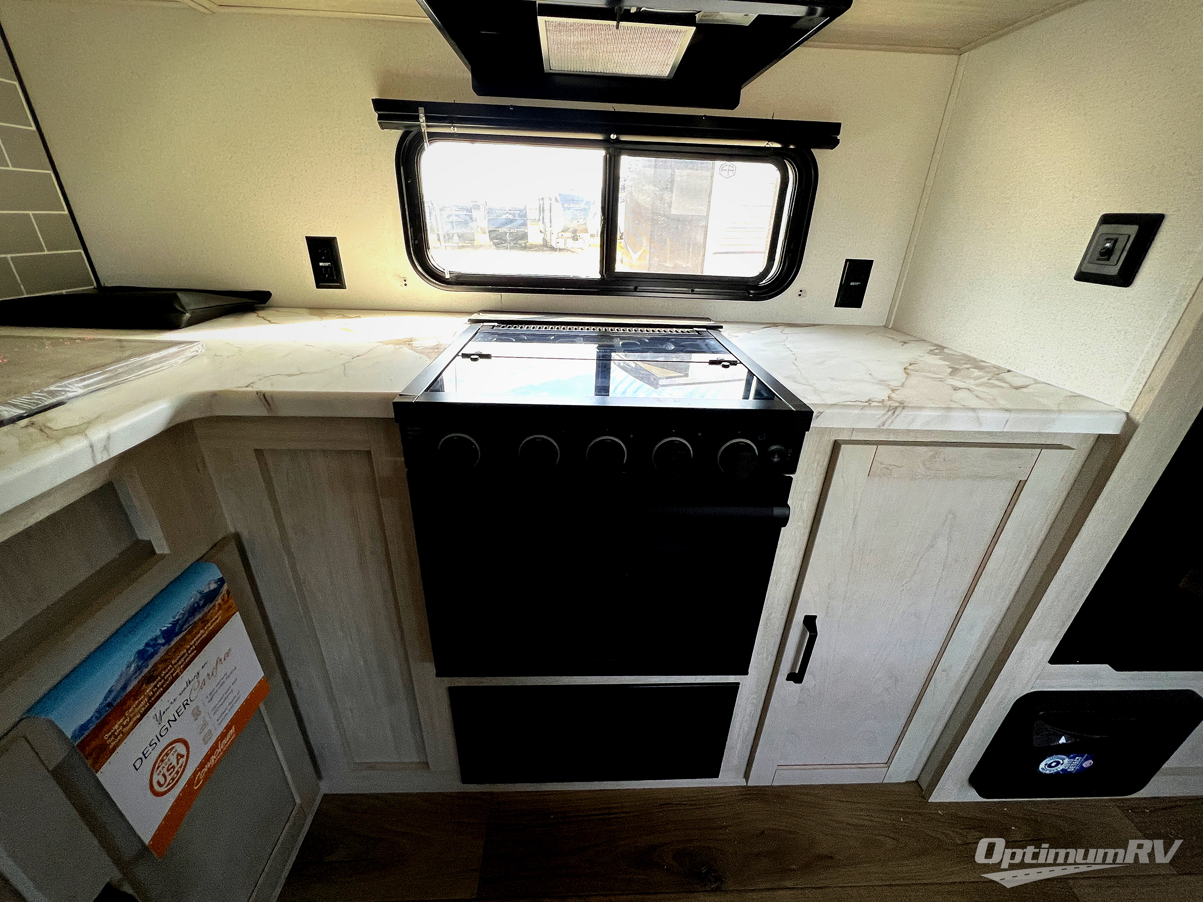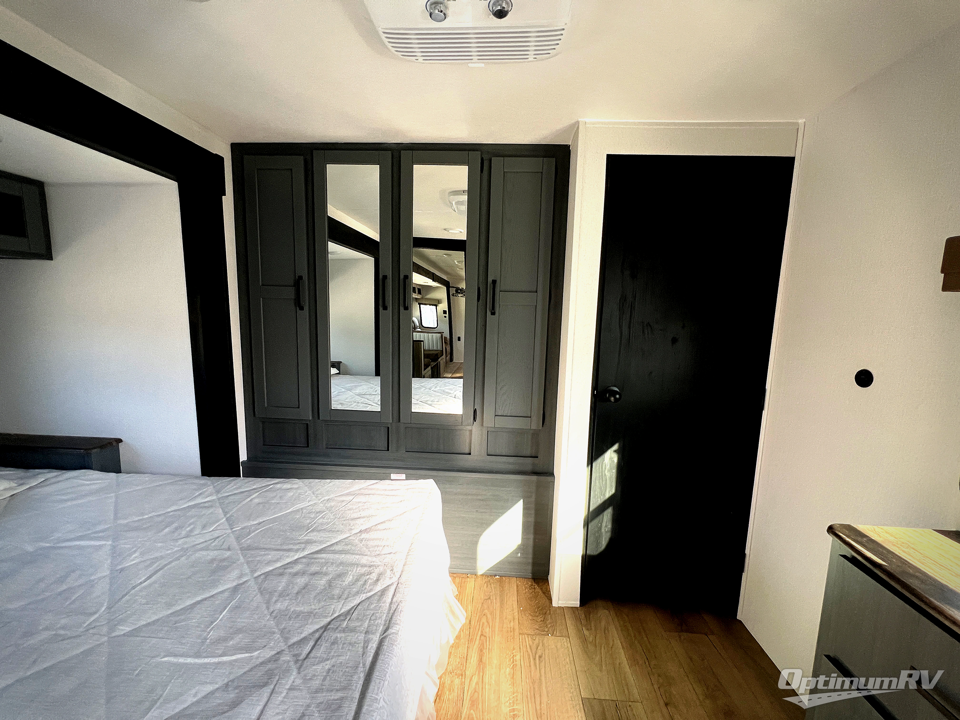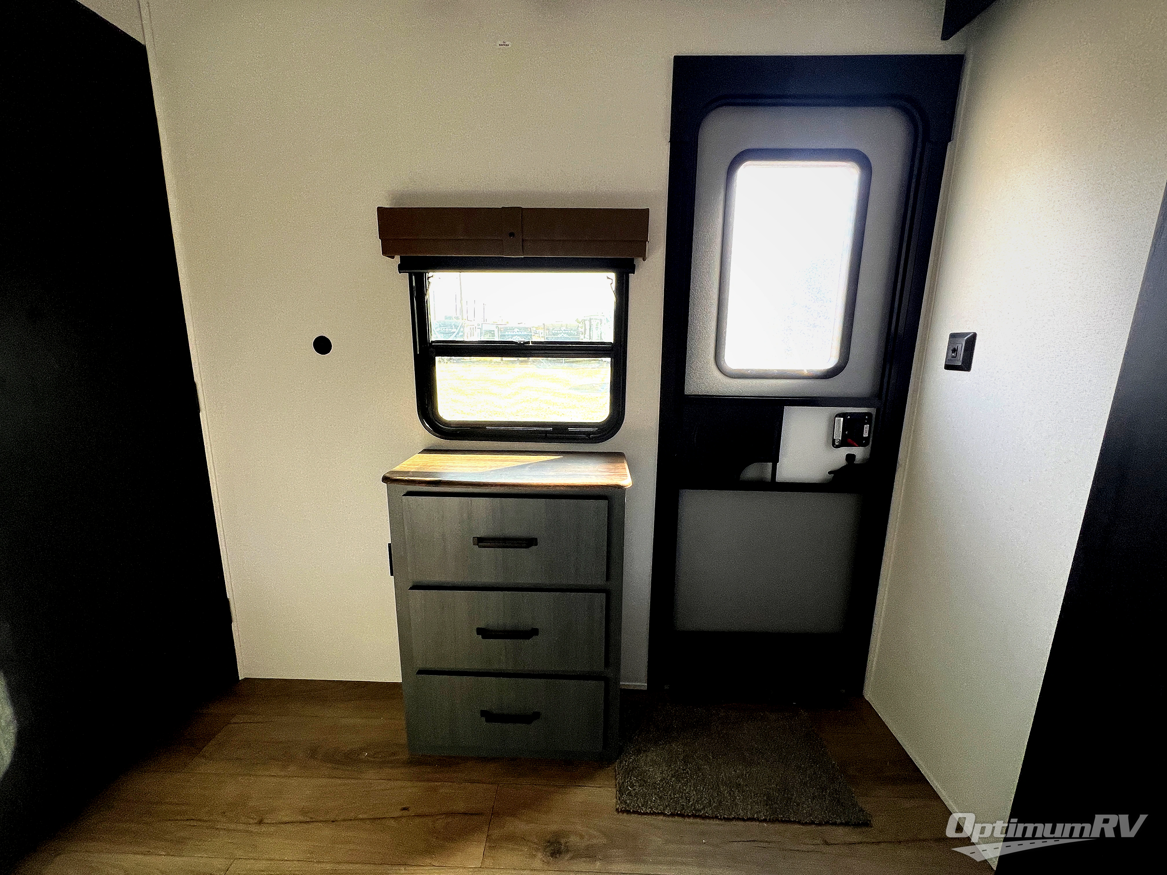 Head to the lake in this double slide out travel trailer that can sleep four to five each night. You will love having the front private bedroom all to yourselves that includes a queen bed slide out, a front wardrobe, a closet with washer and dryer prep, plus your own exterior entry door. Your guests can sleep on the sofa and booth dinette within the second slide out, and the full rear bath is tucked away for privacy. This model also includes an entryway closet/pantry for food storage and jackets, and the fireplace across from the sofa makes your space cozier. An optional outside micro kitchen is available also if you like to cook outdoors!