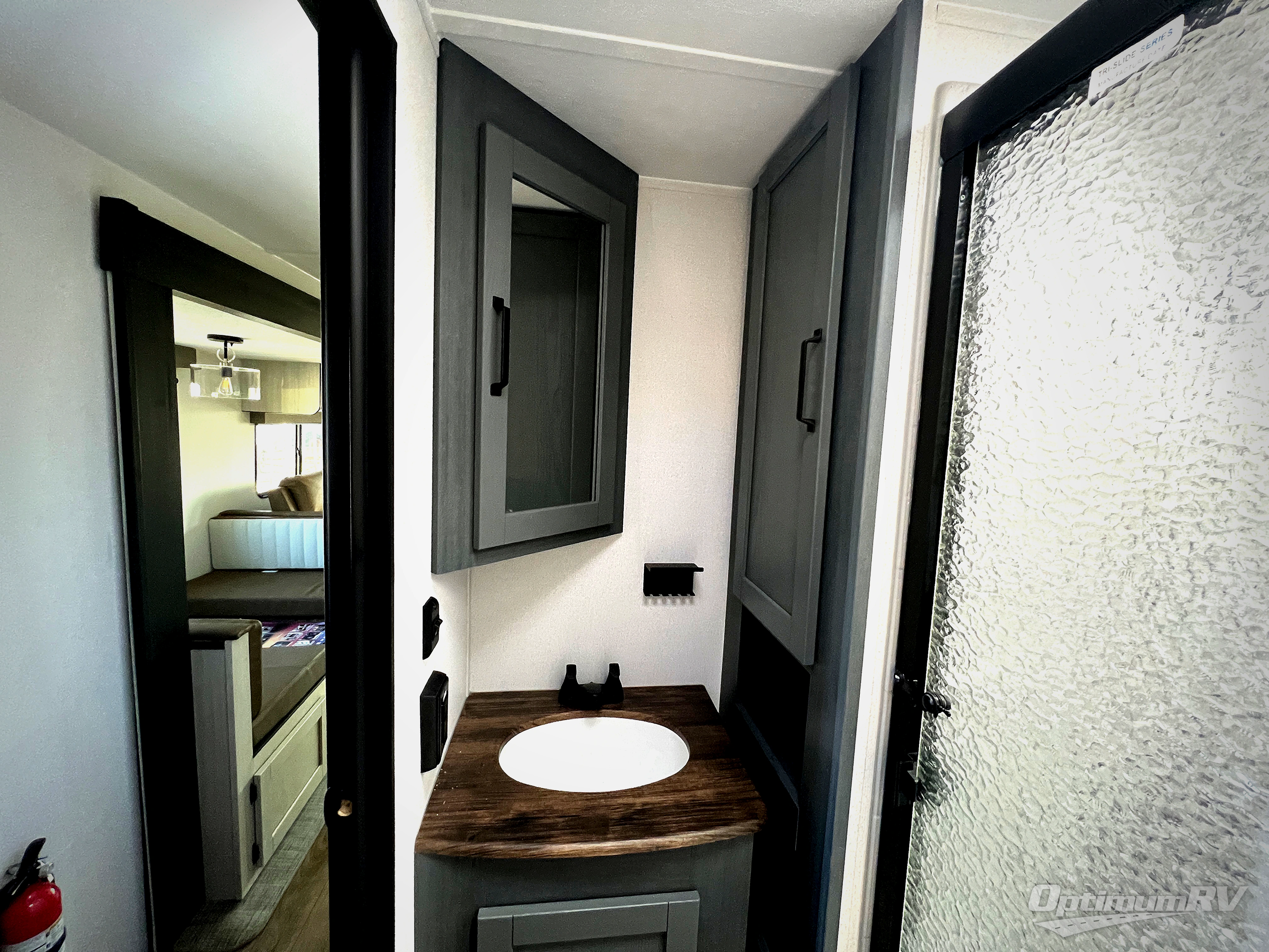 You're going to feel right at home in this travel trailer! The front private bedroom has a queen bed slide for a good night's rest, a dresser and front closet for your clothes, and another closet with washer and dryer prep. Freshen up each morning in the full bathroom with the 32" x 40" shower with a seat and then head to the kitchen to fry up some eggs on the stainless-steel oven and range. You will also appreciate having a kitchen island for easier meal prep and a walk-in pantry to easily see your canned goods and snacks. The booth dinette offers a comfortable place to dine, play, and even sleep once converted. What better way to wind down your nights than to relax on either the rear sofa or on the theater seating across from the entertainment center with a fireplace!