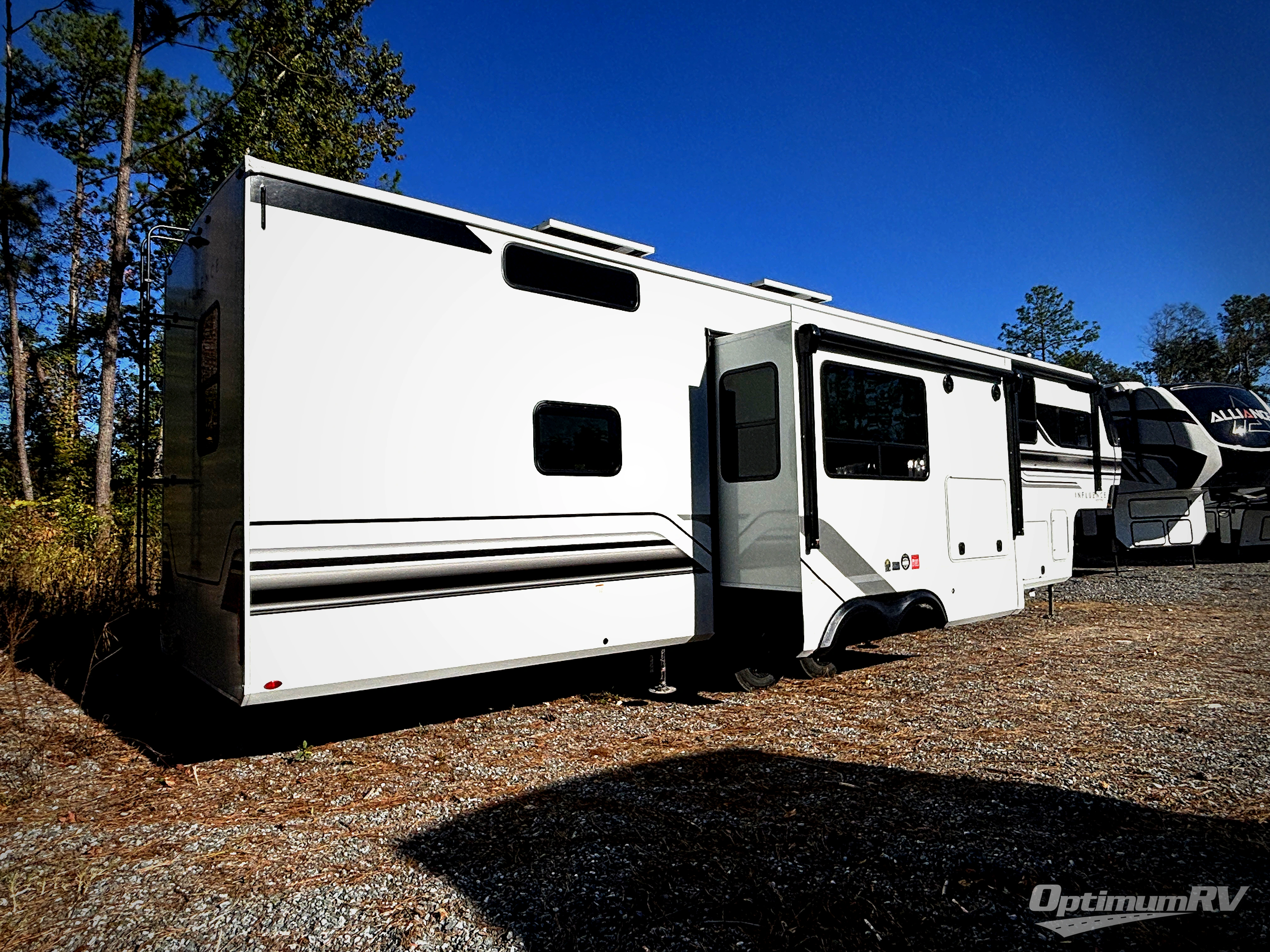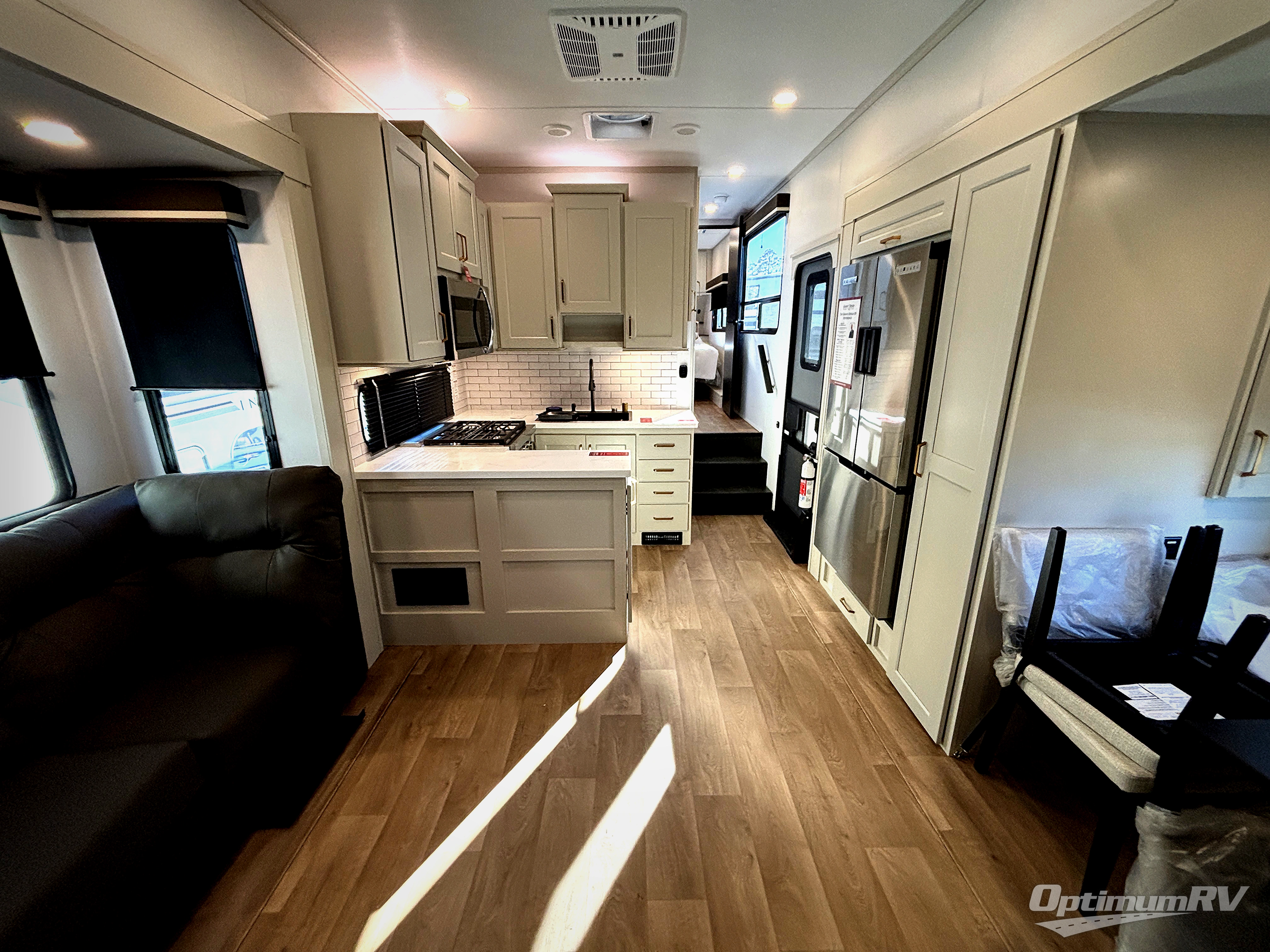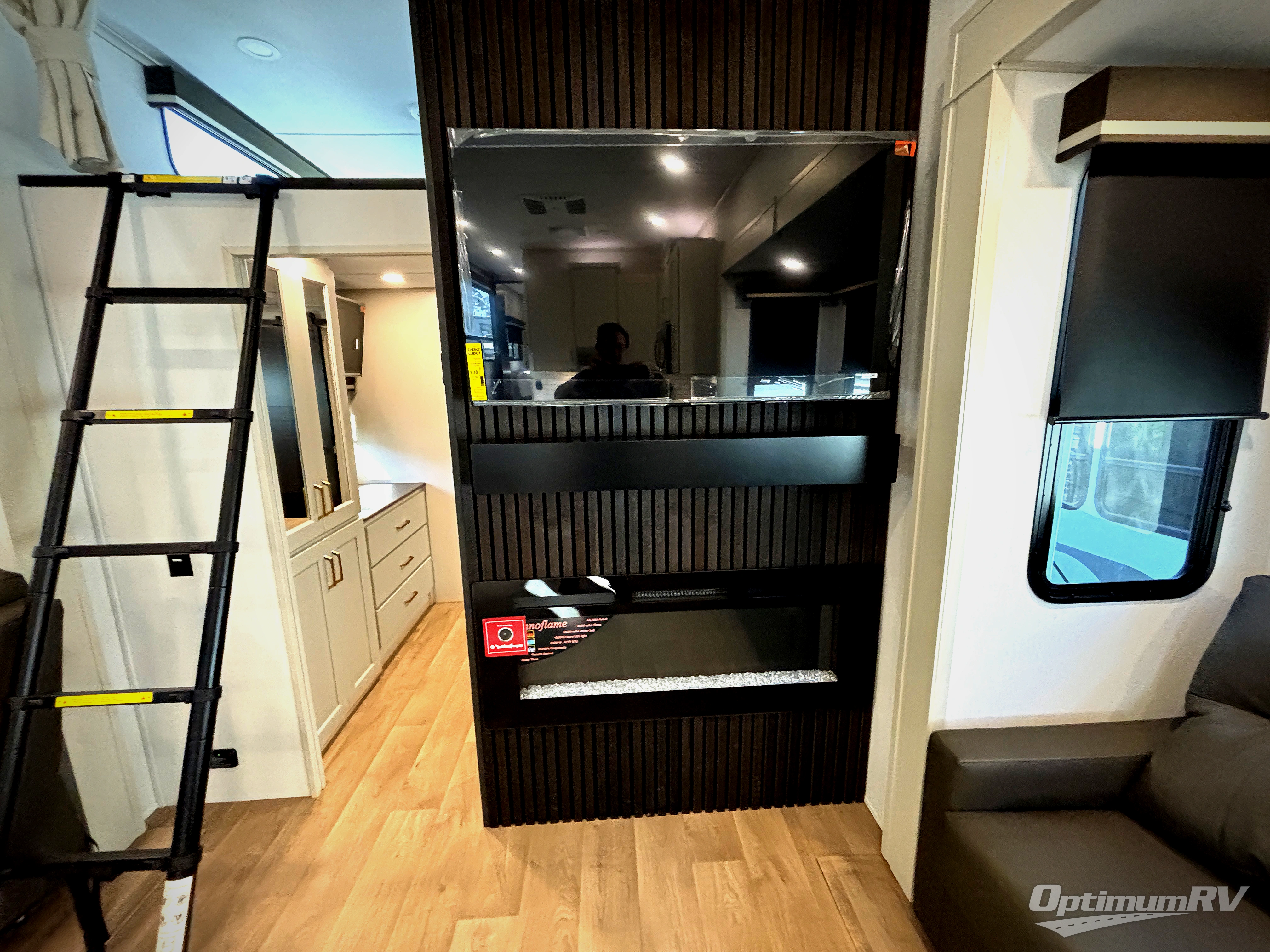 Grab the whole gang and head out in this fifth wheel featuring two private bedrooms, two full baths, and quad slides for even more space in this widebody layout. The living area featuring dual opposing slides offers space to dine and relax including an L-shaped sofa with recliners opposite the entertainment center and fireplace. You'll also love the full kitchen with ample counter space, a spice rack above the microwave, a pull-out pet dish, and more convenient features. The front master bedroom includes a queen bed with an optional king bed, a private entrance into the dual entry bath, plus a slide out with the wardrobe and bath sink. And your guests can take the second master bedroom with a folding queen bed slide, washer and dryer prep, a full rear bath, and even a loft above for more sleeping space!