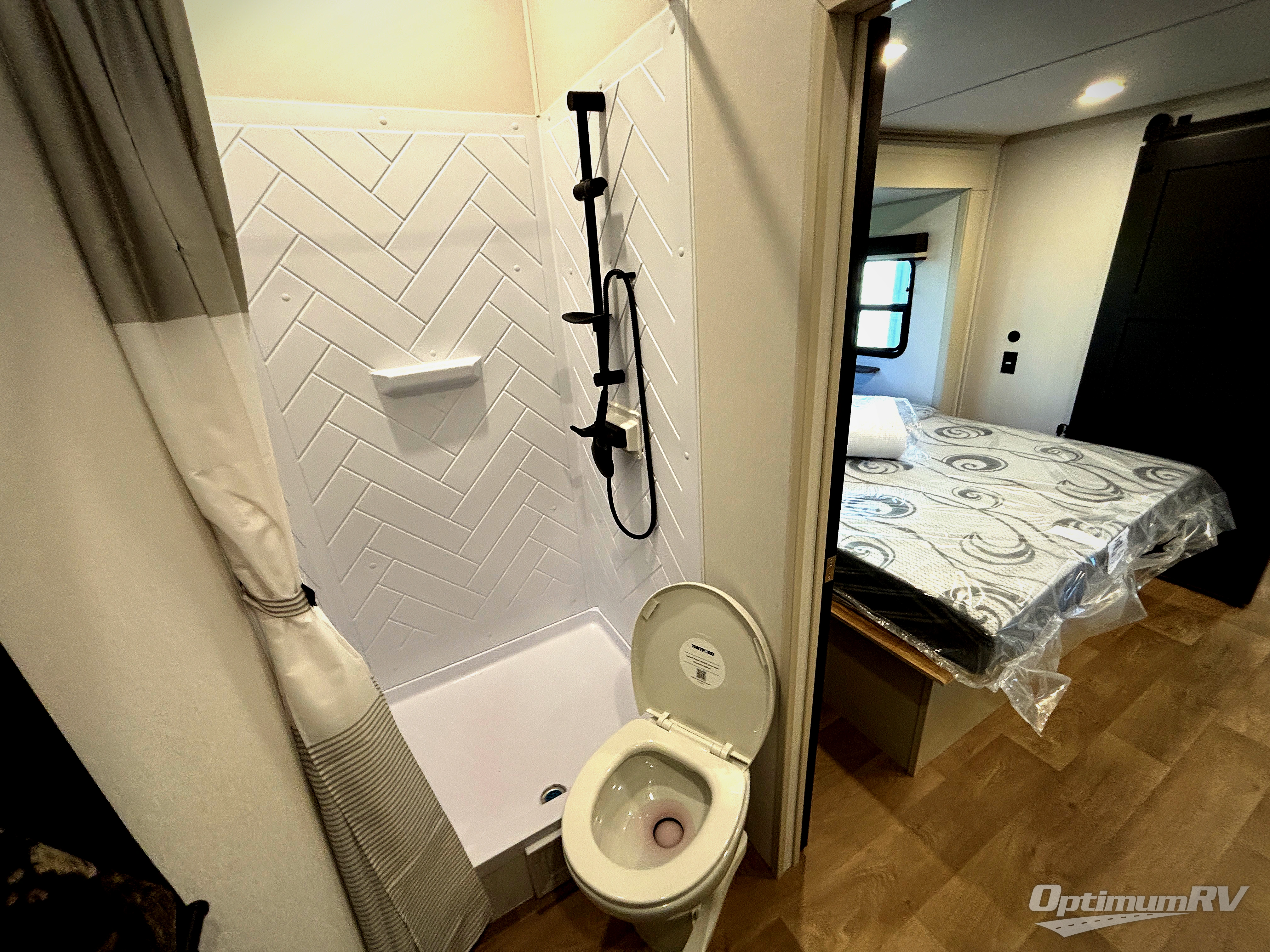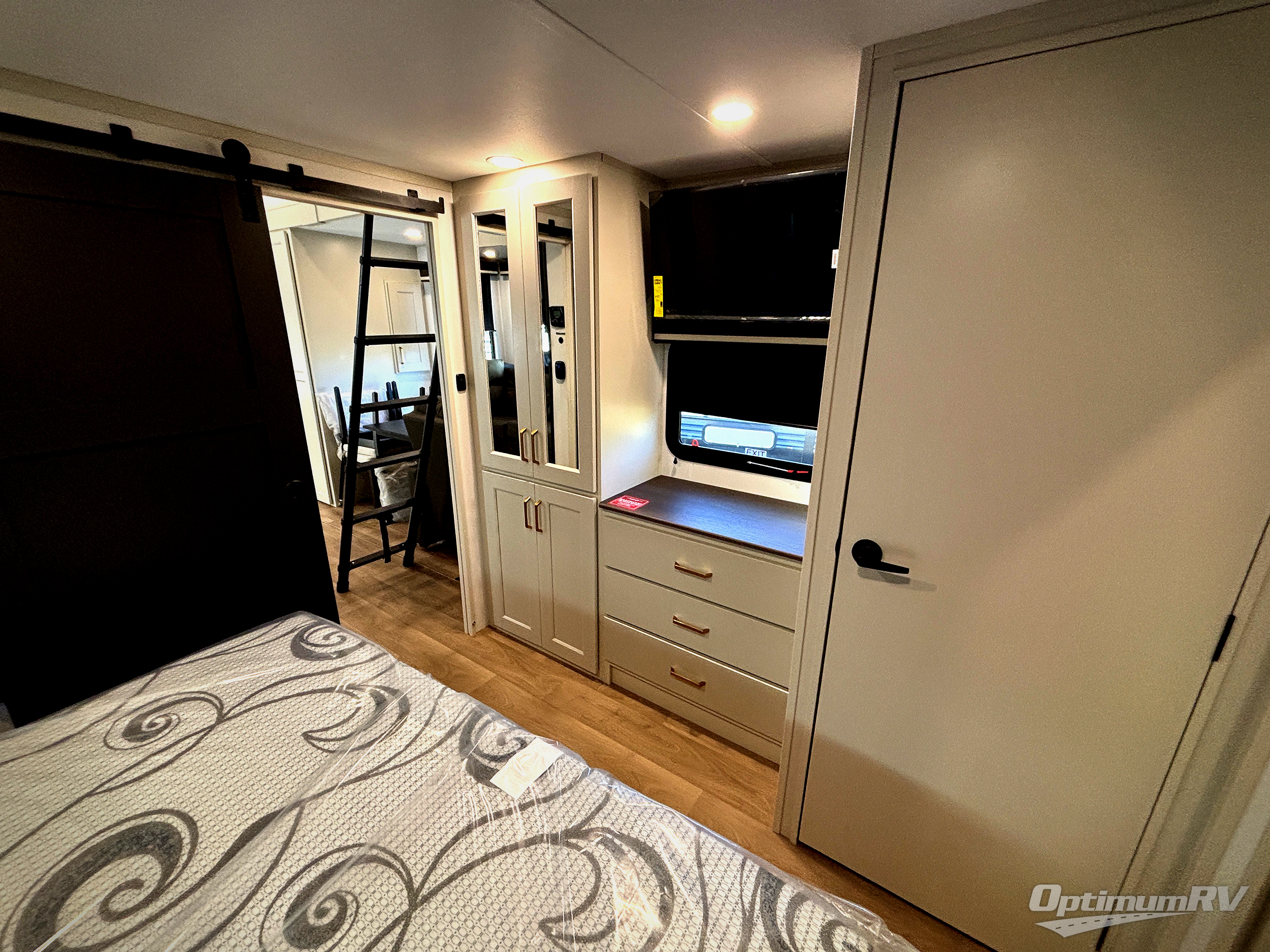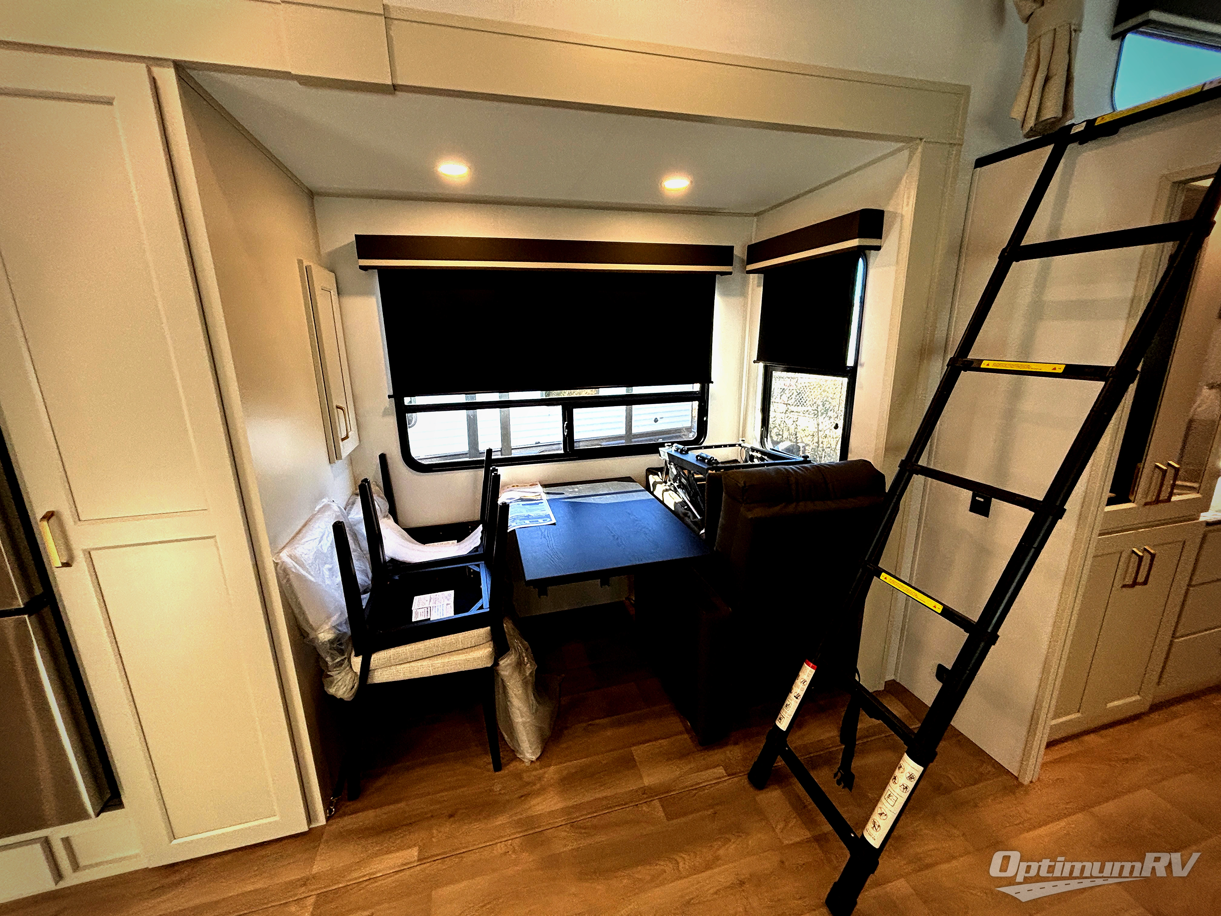 Grab the whole gang and head out in this fifth wheel featuring two private bedrooms, two full baths, and quad slides for even more space in this widebody layout. The living area featuring dual opposing slides offers space to dine and relax including an L-shaped sofa with recliners opposite the entertainment center and fireplace. You'll also love the full kitchen with ample counter space, a spice rack above the microwave, a pull-out pet dish, and more convenient features. The front master bedroom includes a queen bed with an optional king bed, a private entrance into the dual entry bath, plus a slide out with the wardrobe and bath sink. And your guests can take the second master bedroom with a folding queen bed slide, washer and dryer prep, a full rear bath, and even a loft above for more sleeping space!