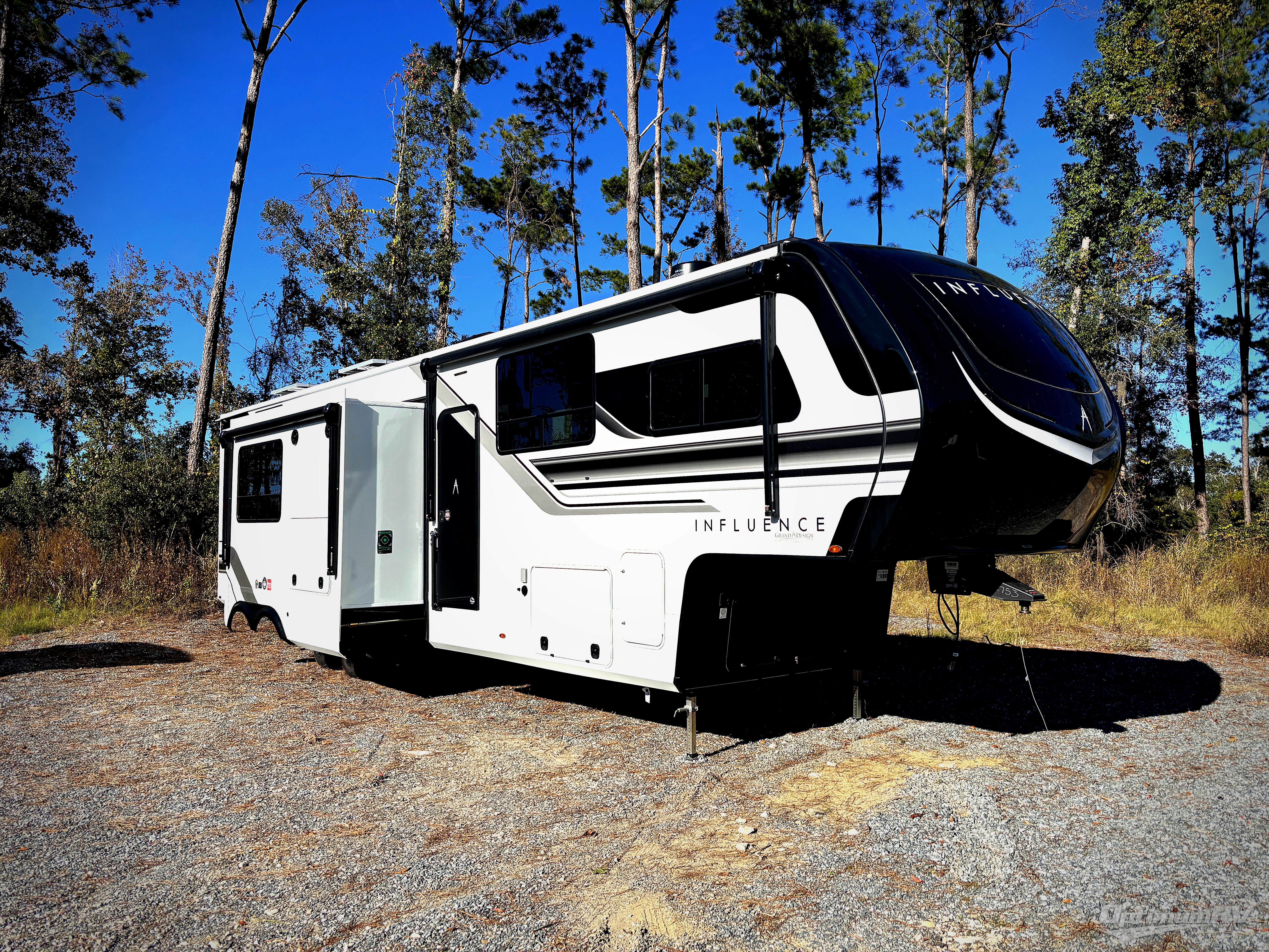 Any Grand Design Influence fifth wheel features five-sided aluminum cage construction with a walk-on roof and a fully enclosed underbelly with heated tanks and storage for all weather camping. For peace of mind, the MORryde CRE3000 Suspension system will provide safe and smooth towing, and the 101" widebody construction offers all the room you need and that is before multiple slides are fully engaged. You will appreciate the Keyed-Alike locks, slam-latch baggage doors with magnetic door catches, exterior security light, and SolidStep entry steps. On the inside, Congoleum flooring, premium roller shades for privacy, a hallway handrail for safety, and nightstands with USB ports to keep all of your electronics fully charged. You will also love the On Demand tankless water heater when showering, plus the added heat and ambiance from an electric fireplace, and so much more!