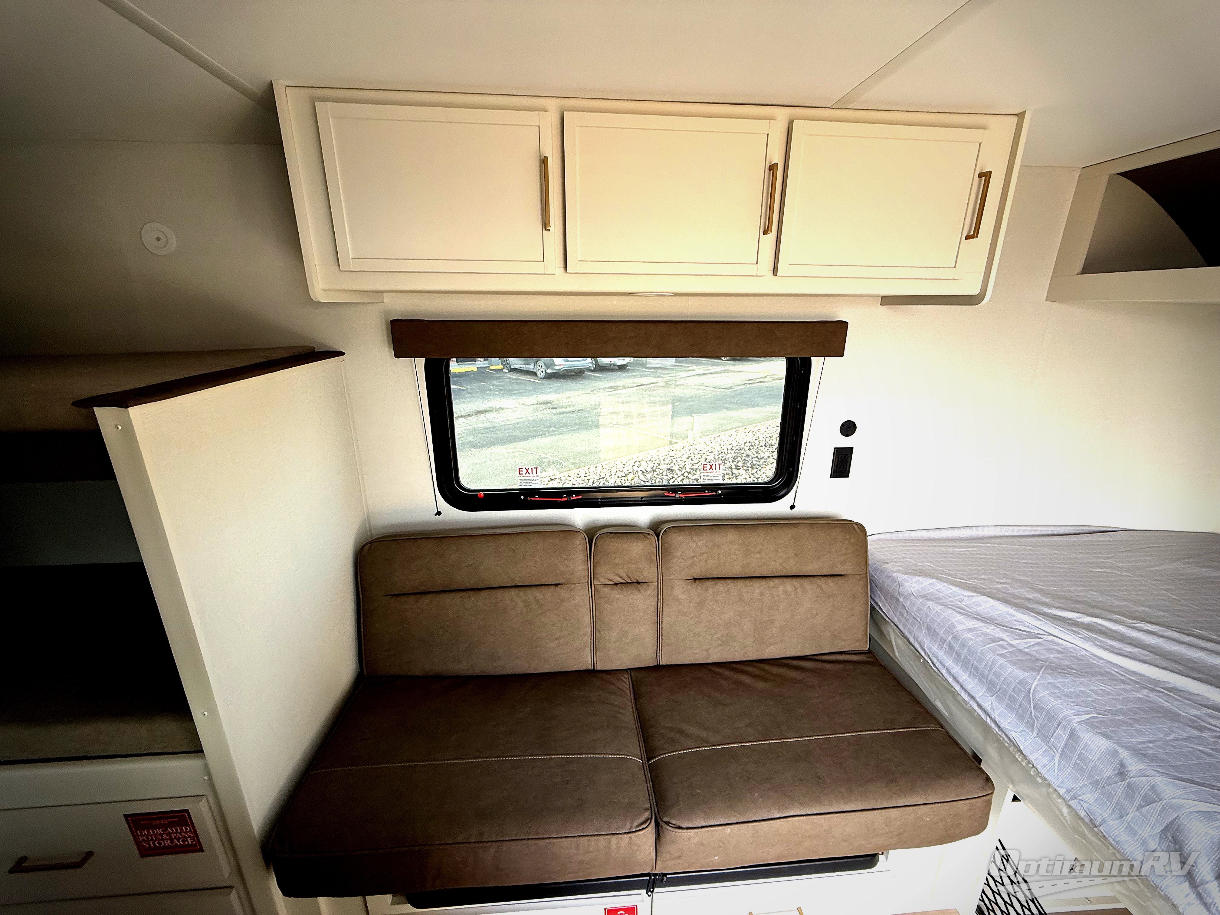 Camping trips to the lake have never been easier than with this travel trailer! The 28" x 67" bunks are right next to the private bath for easy nighttime use, and the front queen bed includes hidden storage for your things. There is also a 66" Jack knife sofa that provides a little more sleeping space for guests. A kitchen lets you cook meals each day and there is an exterior LP quick connect if you want to fire up your own propane grill.