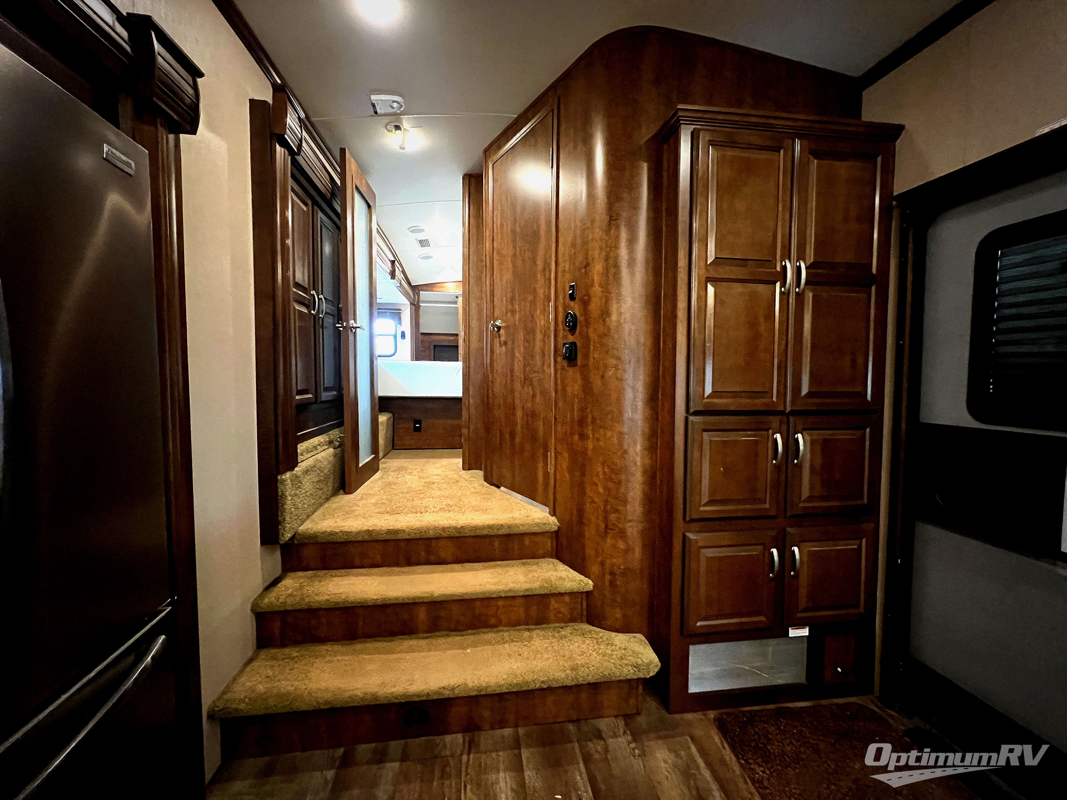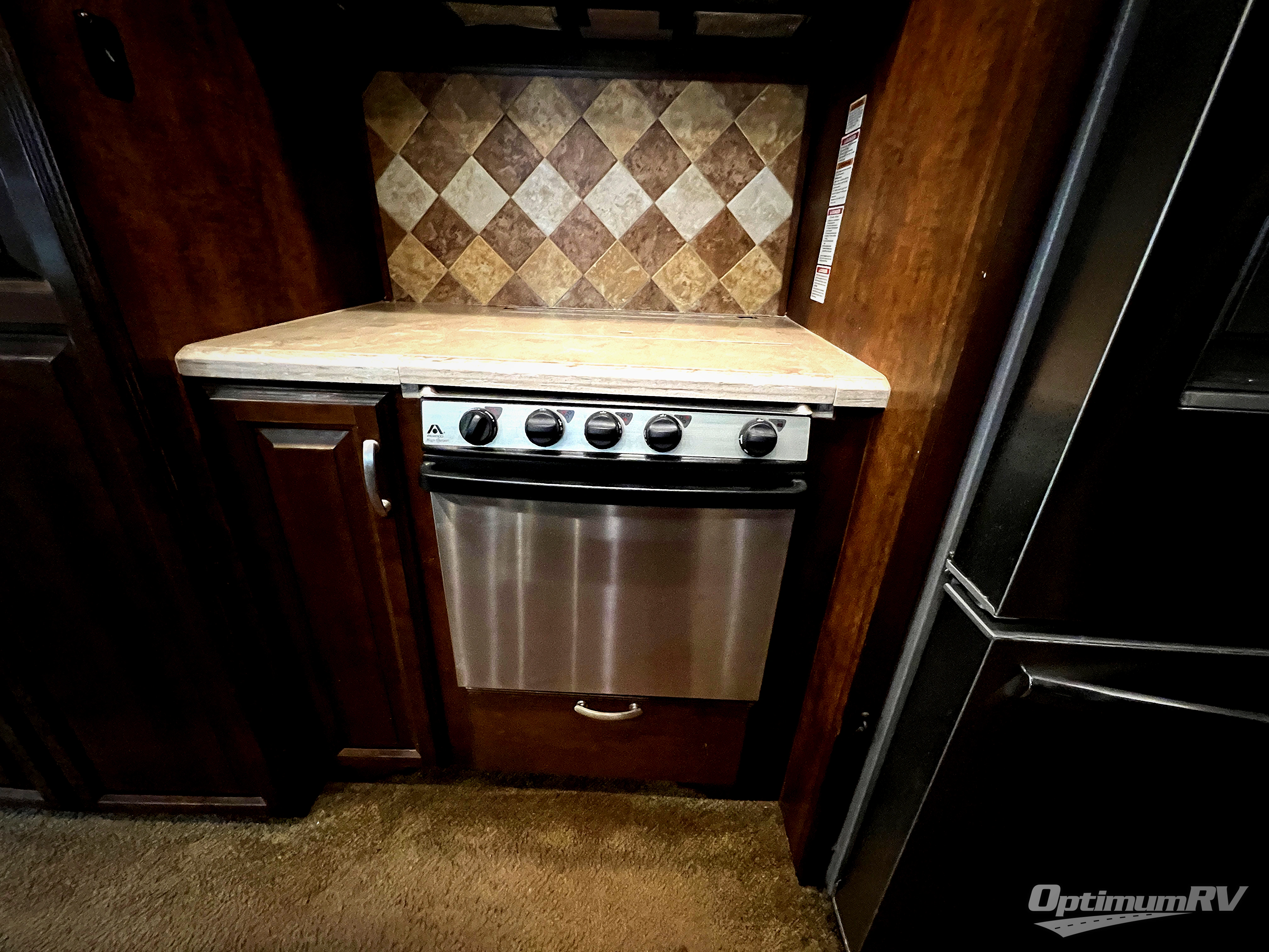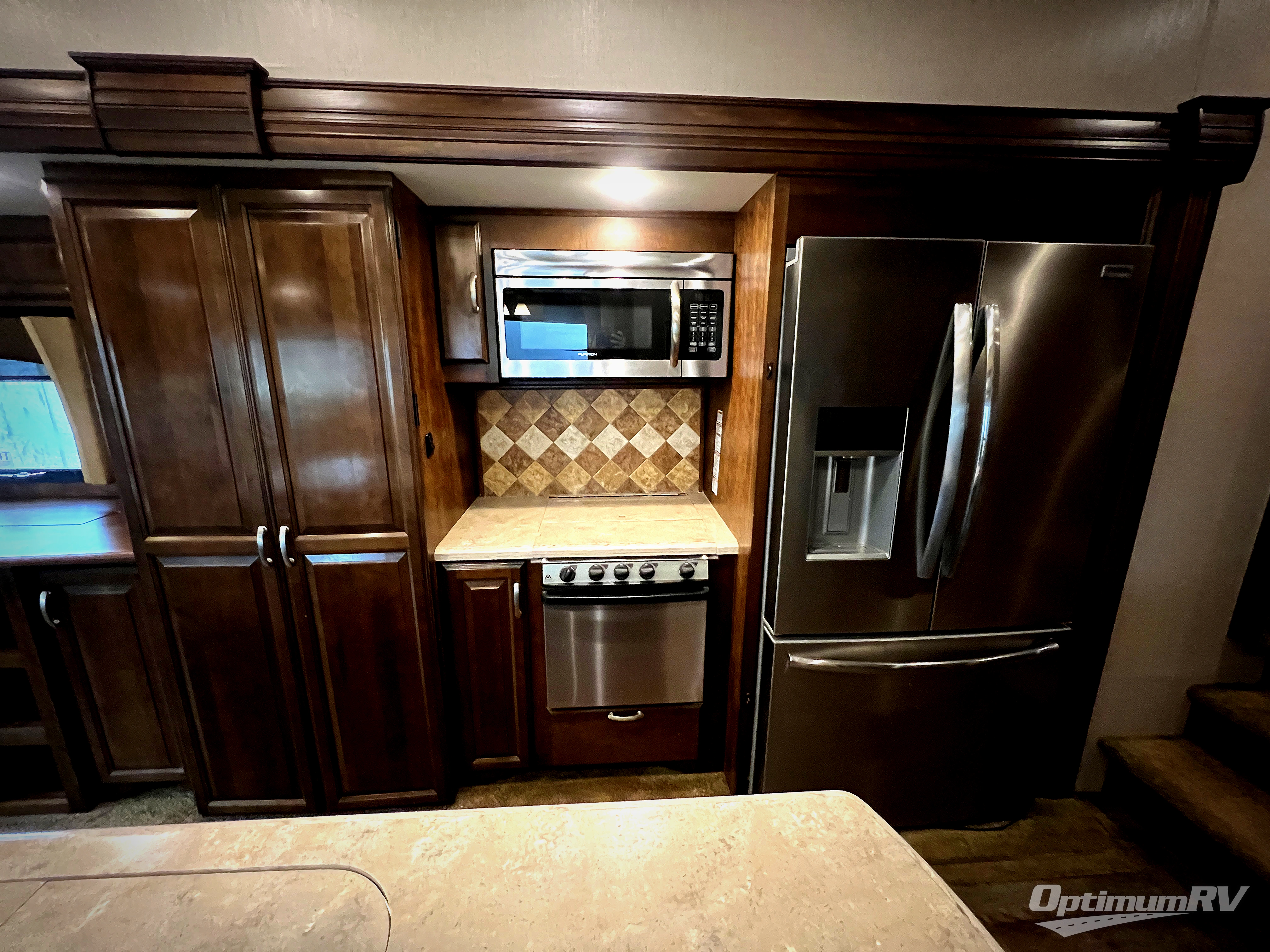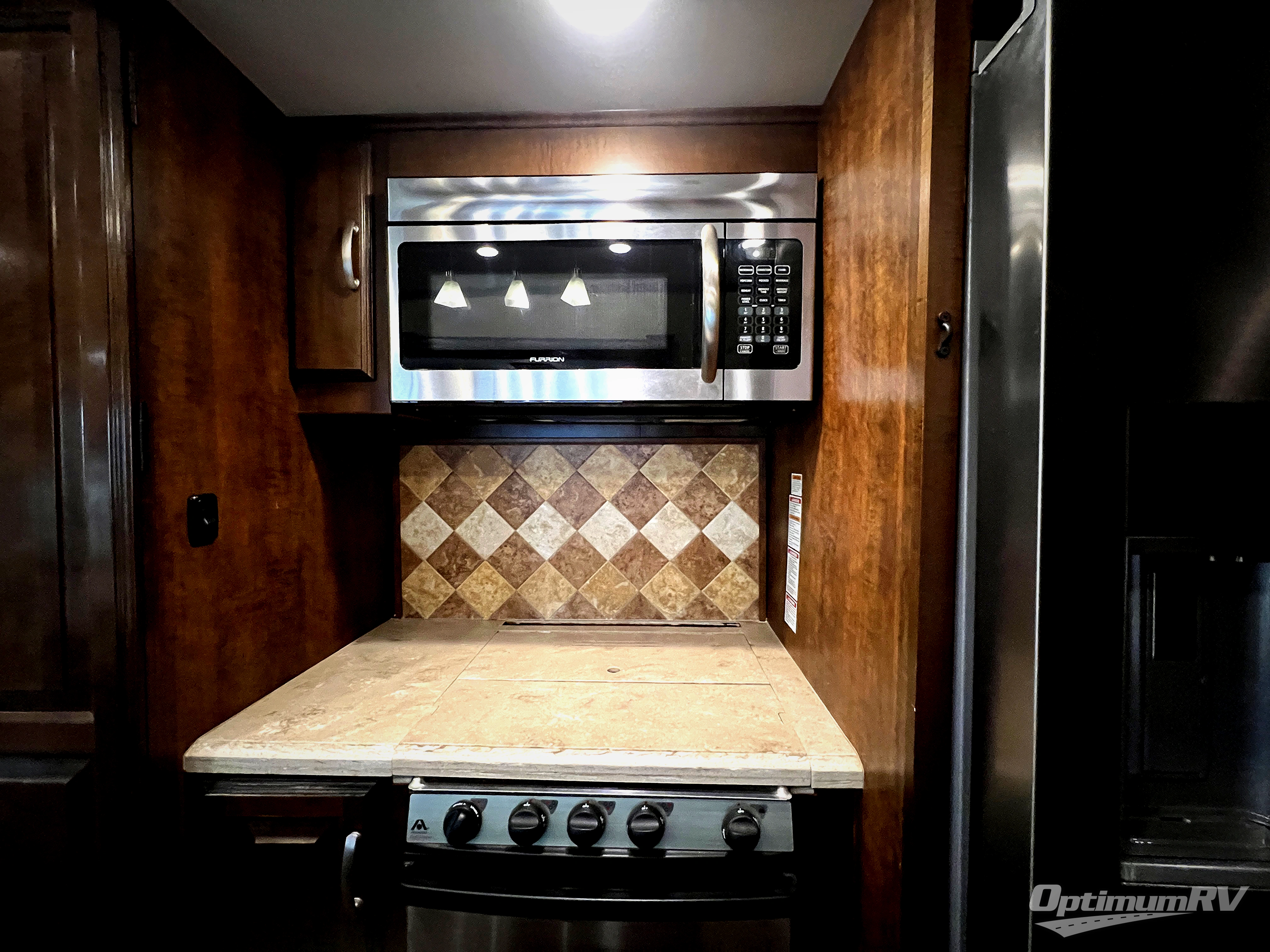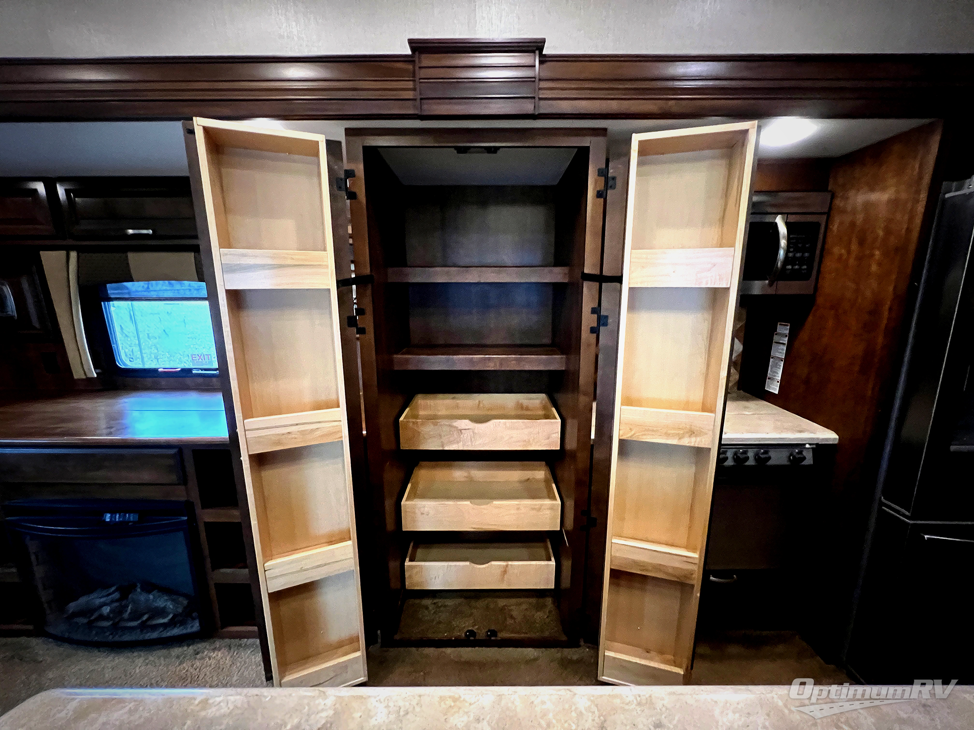 As you enter the fifth wheel, to the left is a slide with a free-standing dinette, and two recliners or you can choose optional theater seats. Along the rear wall there is a sofa hide-a-bed. The other slide has a 58" pop-up TV with a fireplace below the TV, pantry, microwave, three burner range, additional pantry, and a refrigerator. There is also a kitchen island with a double kitchen sink.