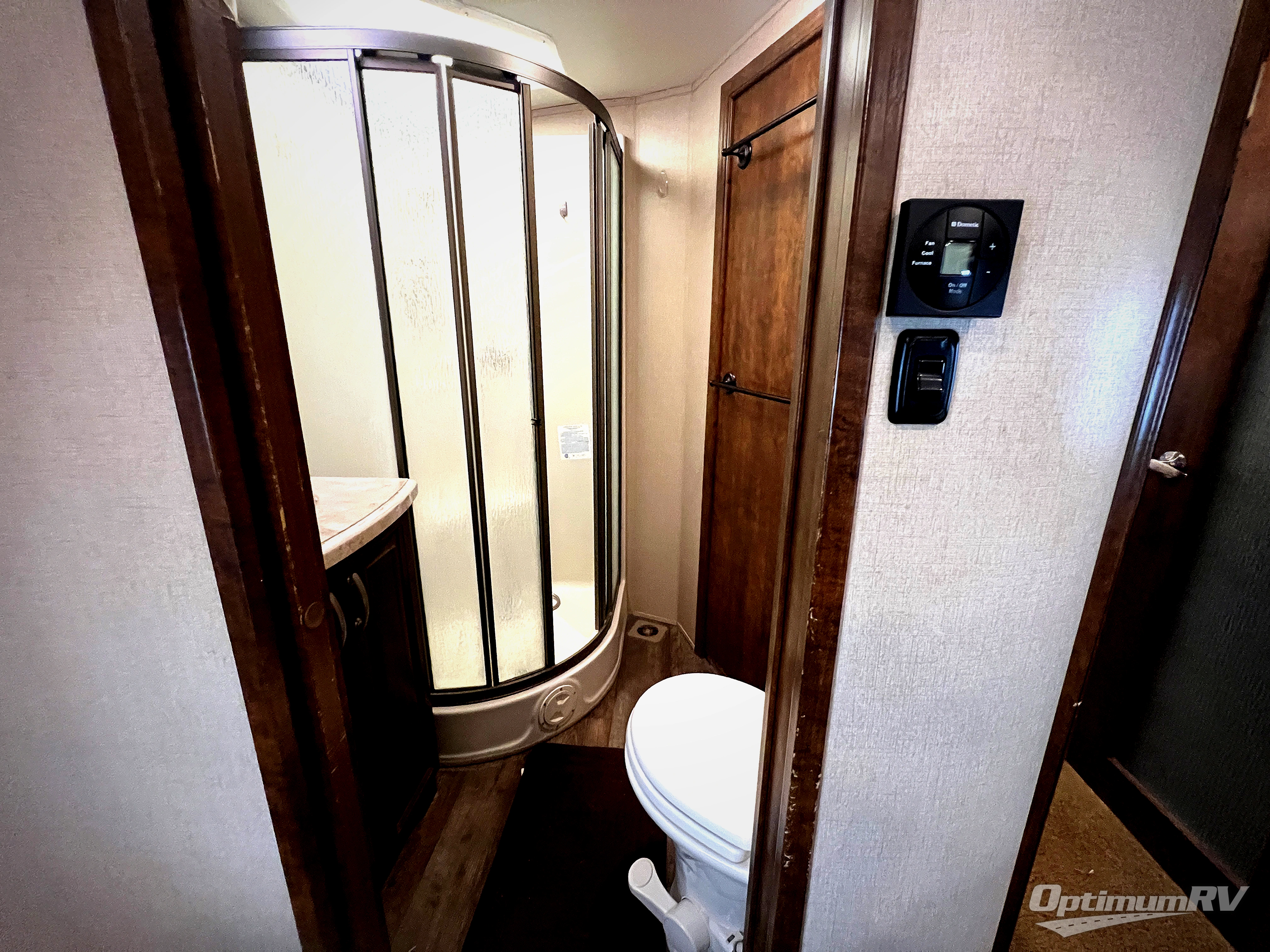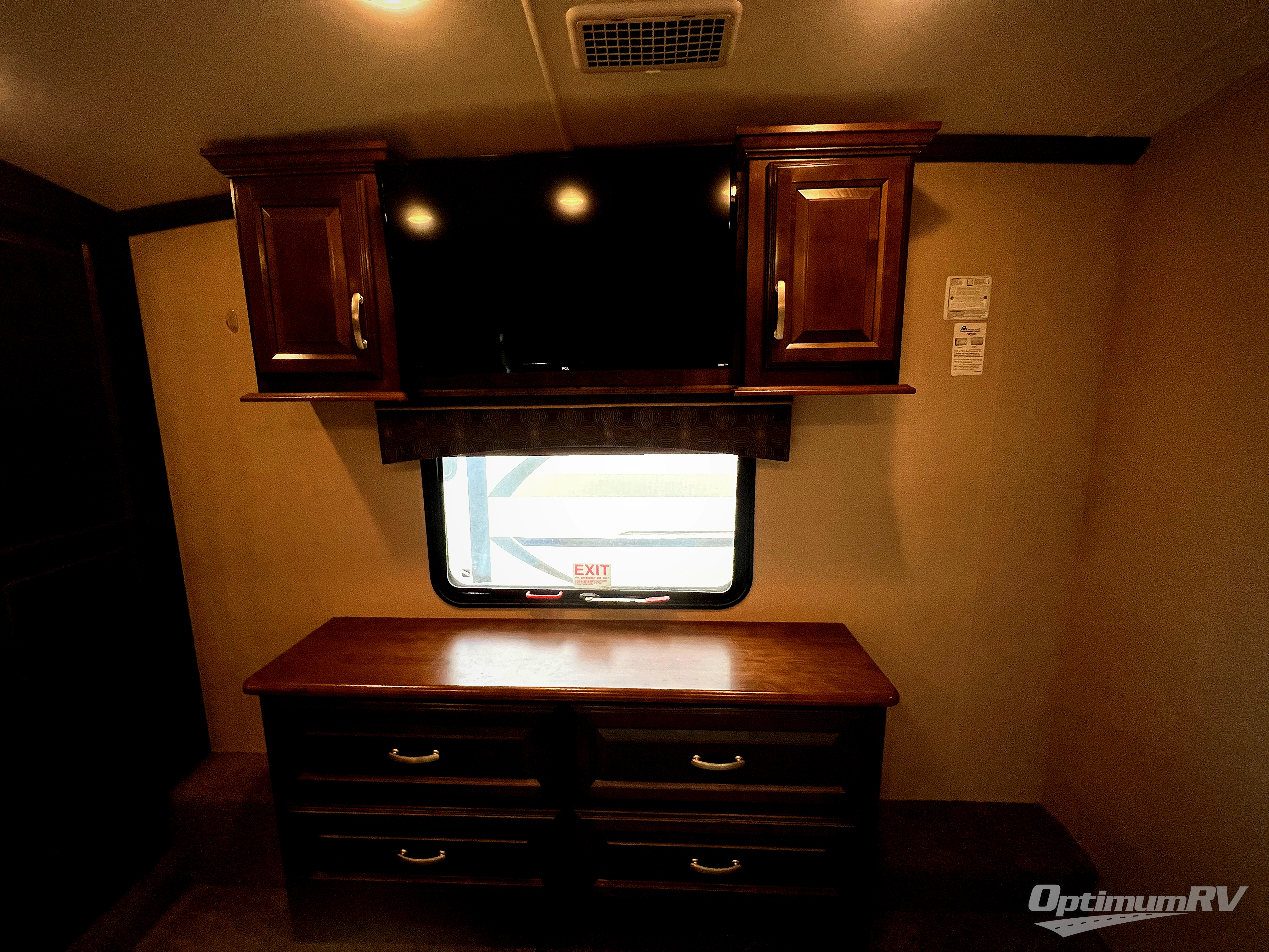The bedroom has a slide with a wardrobe, nightstand, and king bed or you can choose an optional queen. There is also a wardrobe with shelves, washer/dryer prep, drawers, and a vanity with a 32" TV above the vanity, and more!