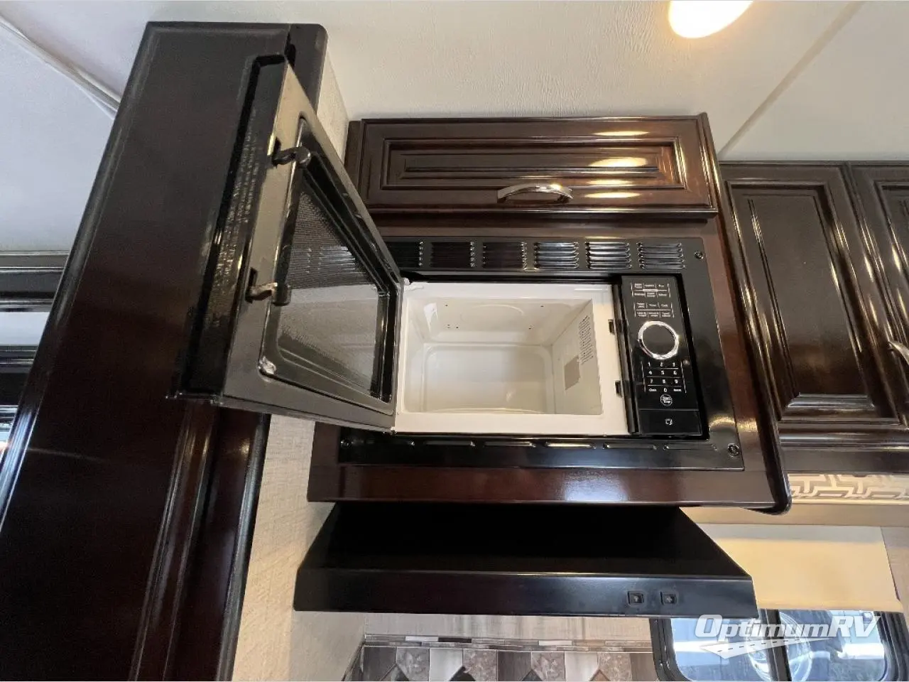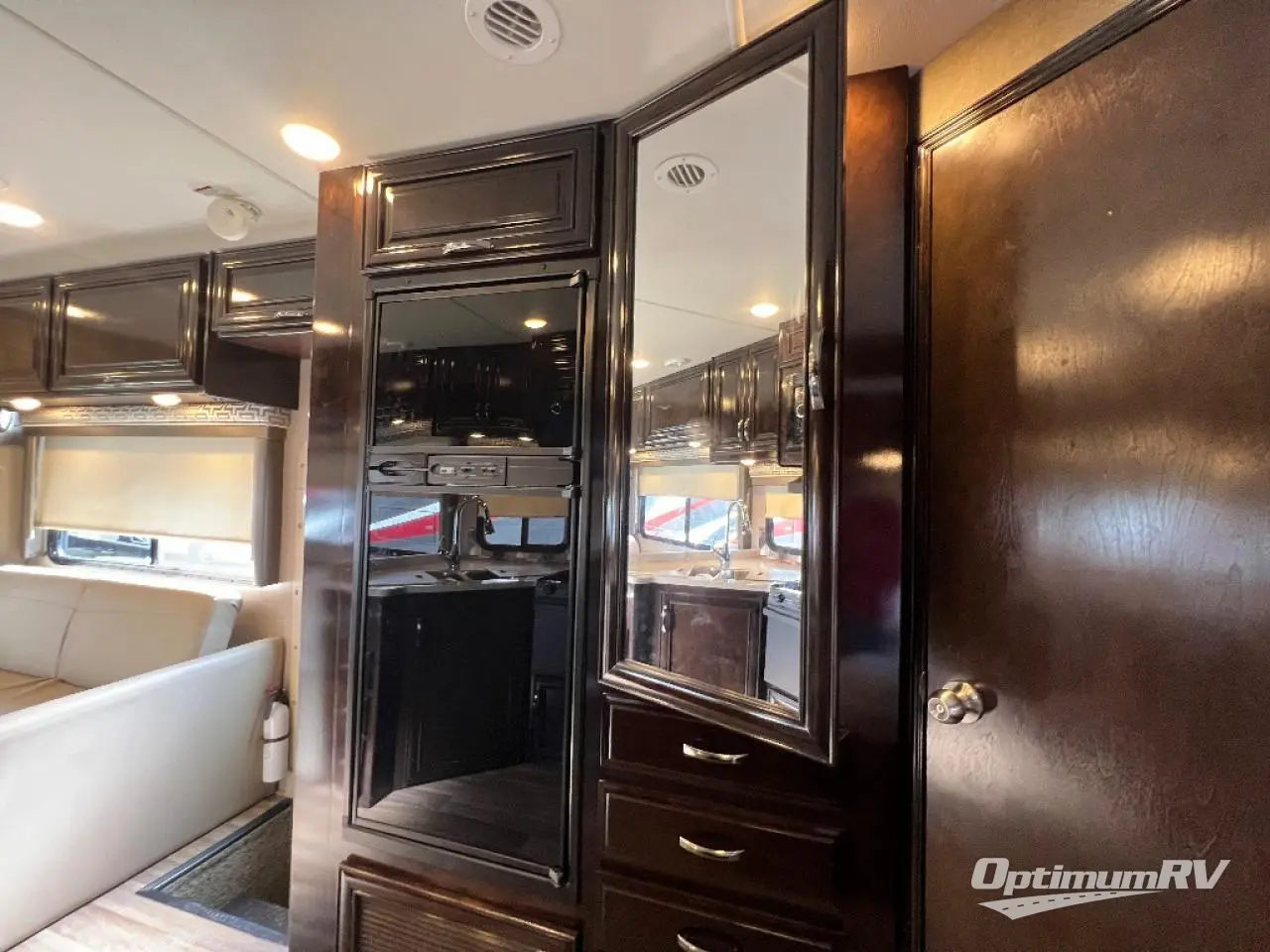 To the left of the entry door find a refrigerator for your perishables. Opposite you can cook and prepare food with a three burner range, an overhead microwave oven, and there is also a double sink for cleaning up. You will also find plenty of storage for your dry and canned good in the pull-out pantry. The upper cabinets also provide places to keep your dishes and things organized and neatly tucked away.