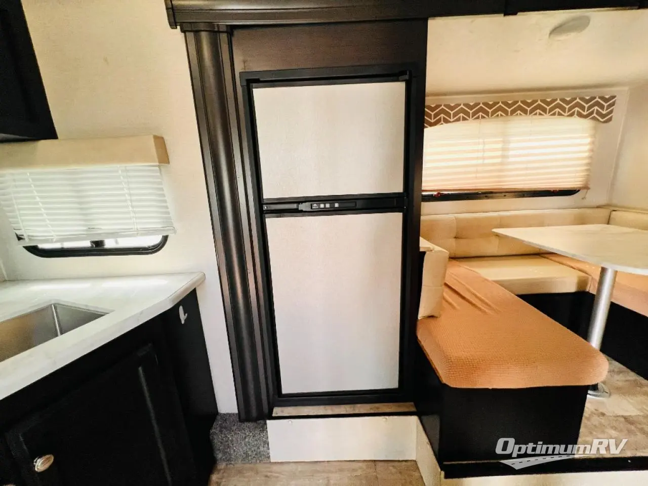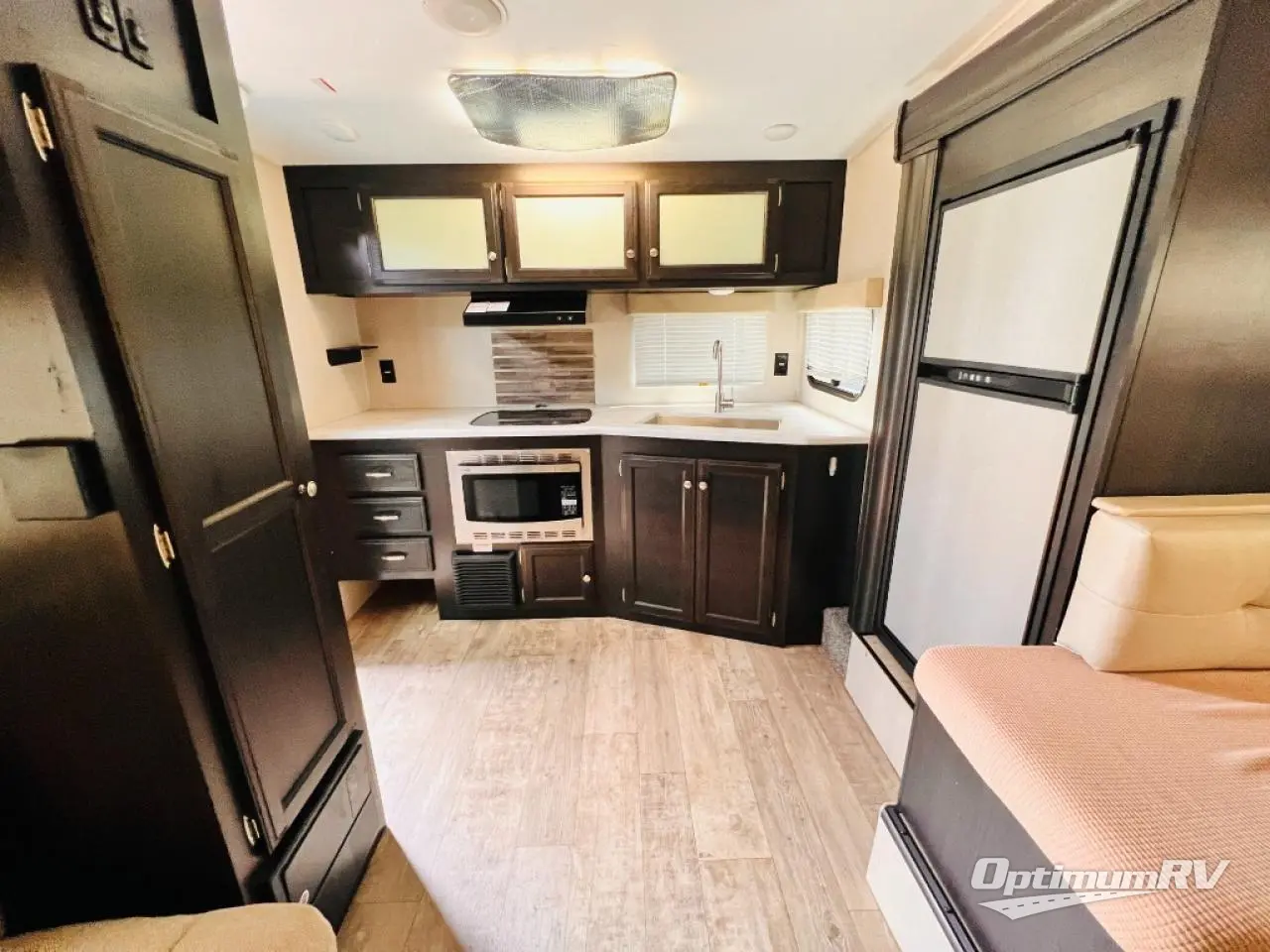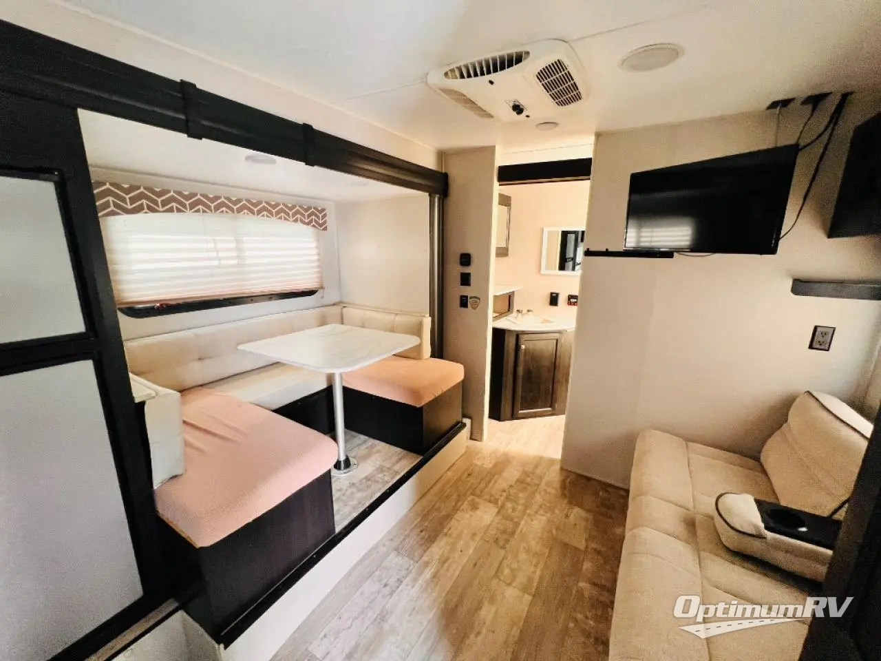 This single slide out U-shaped dinette and refrigerator allow you to grab a cold snack just before sitting at the dinette to play games or read a book. You can also sleep here if you like. As you visit with your family sitting on the jiffy sofa or washing dishes in the rear kitchen, you can plan your next activity whether it's hiking, biking or playing horseshoes. You will find plenty of storage for your clothing in the front bedroom, and the exterior pass-through compartment allows you to bring those larger camping items.