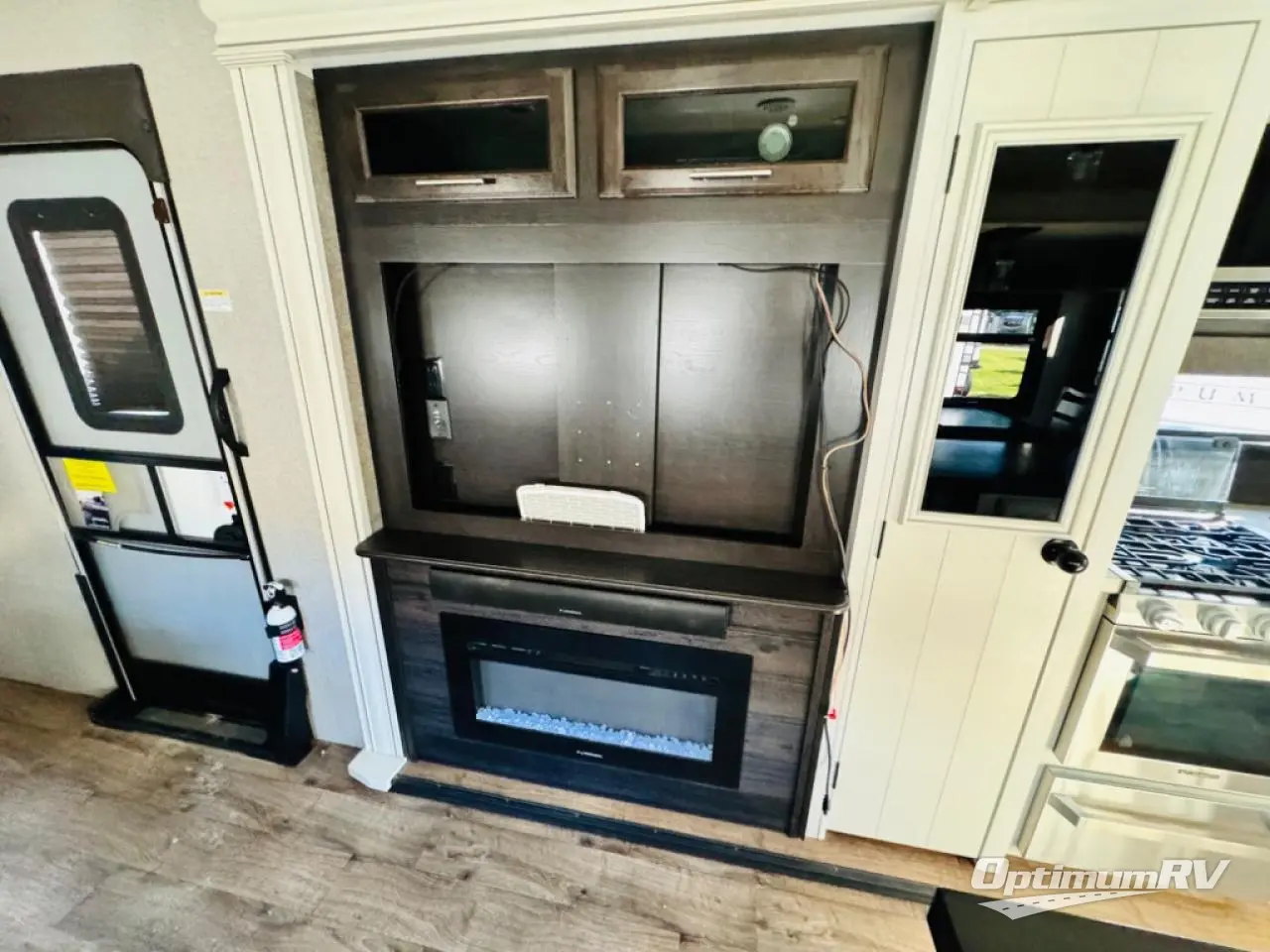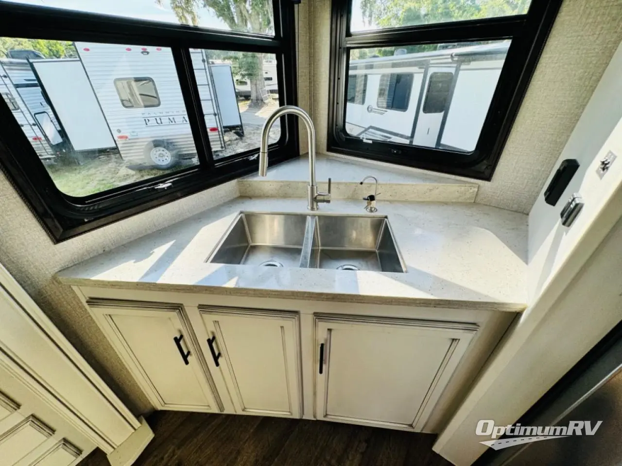 Your family will love spending their time sitting at the huge island with bar stools while they watch you prep dinner on the solid-surface countertops in this Eagle travel trailer! The bamboo sink cover and strainer is a great addition to this already fabulous kitchen, and the opposing slides are also extremely helpful because they allow you to have plenty of space as you move about the kitchen. If you prefer to grill your burgers outside in the fresh air, you are in luck because there has been an outdoor kitchen added to this model!