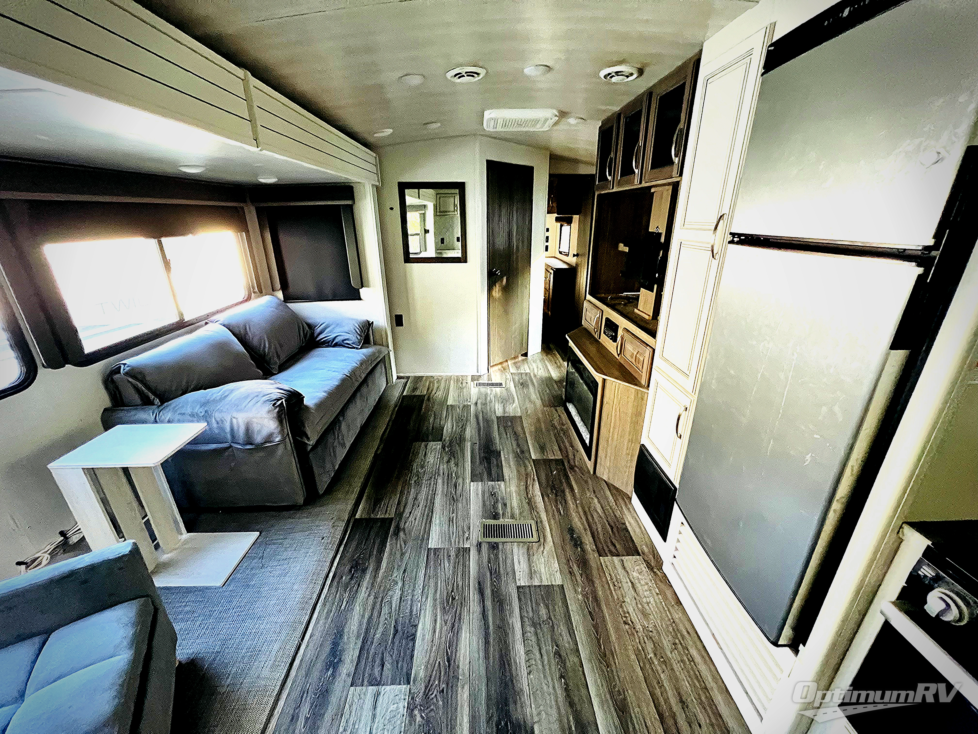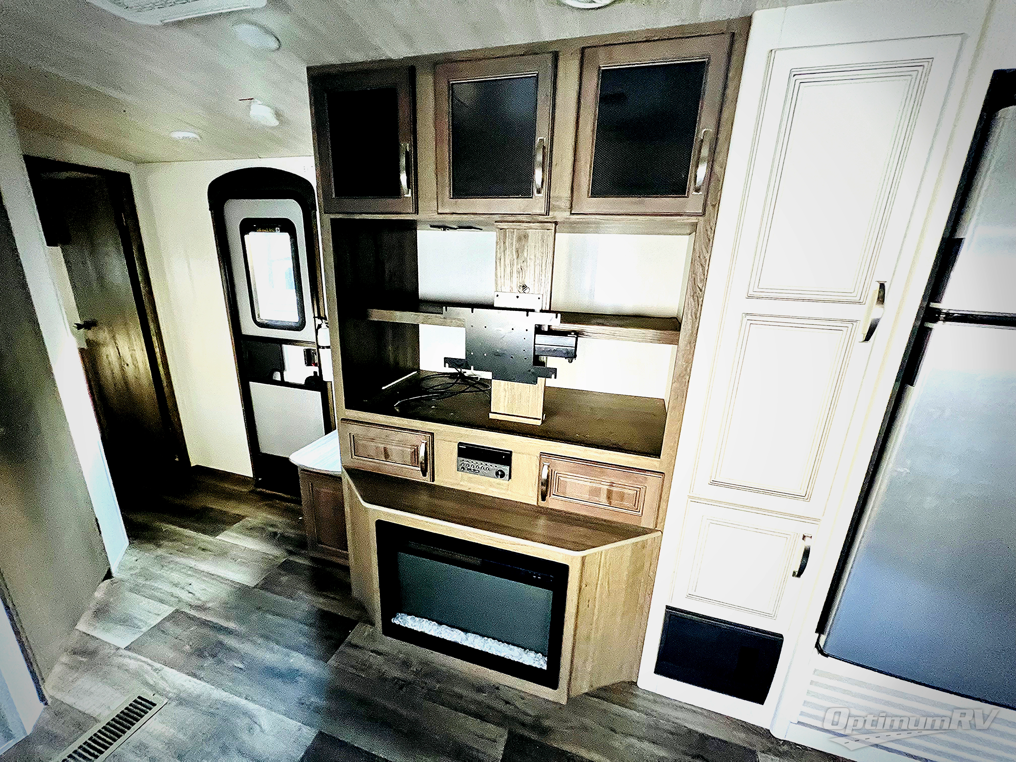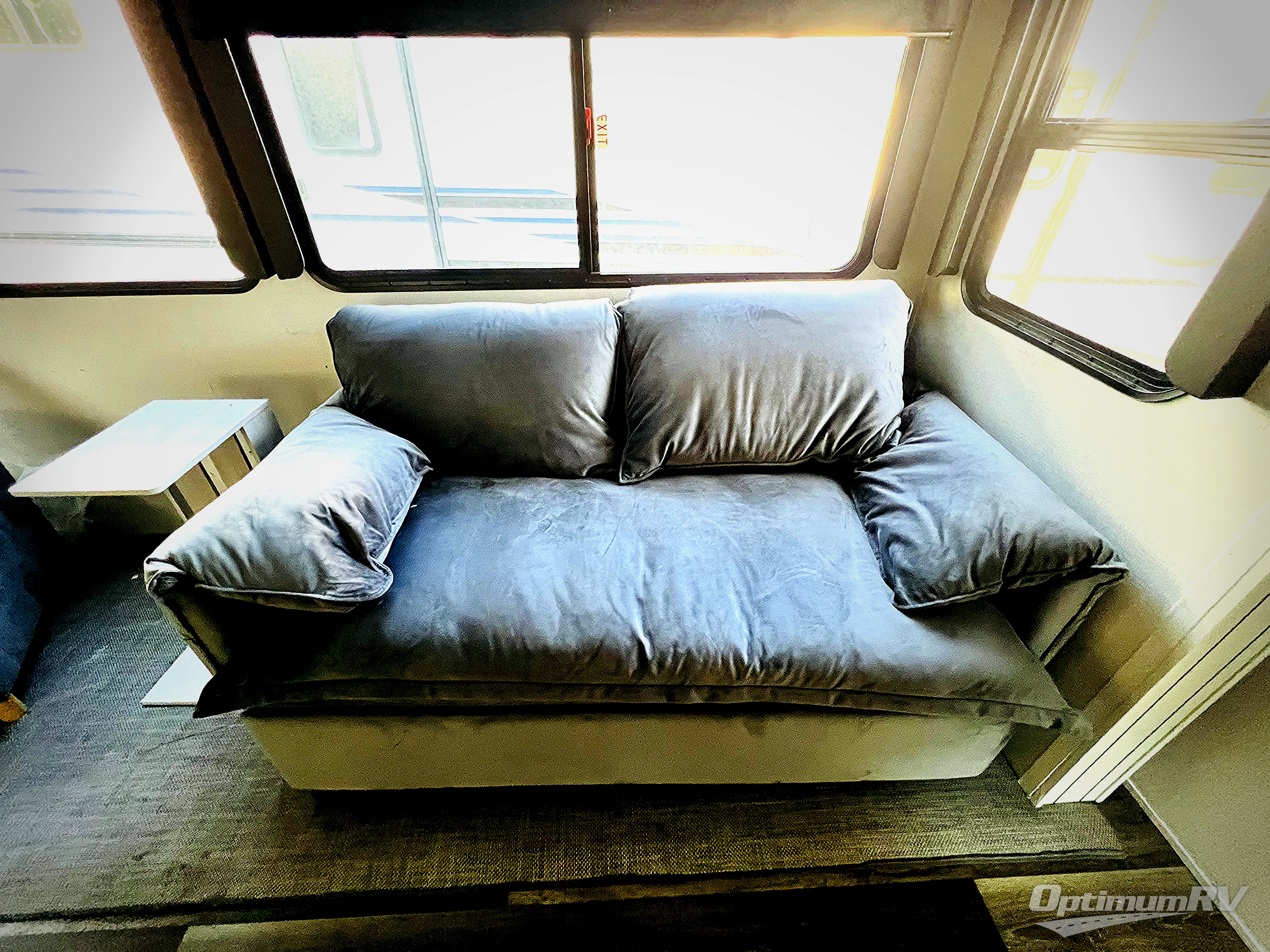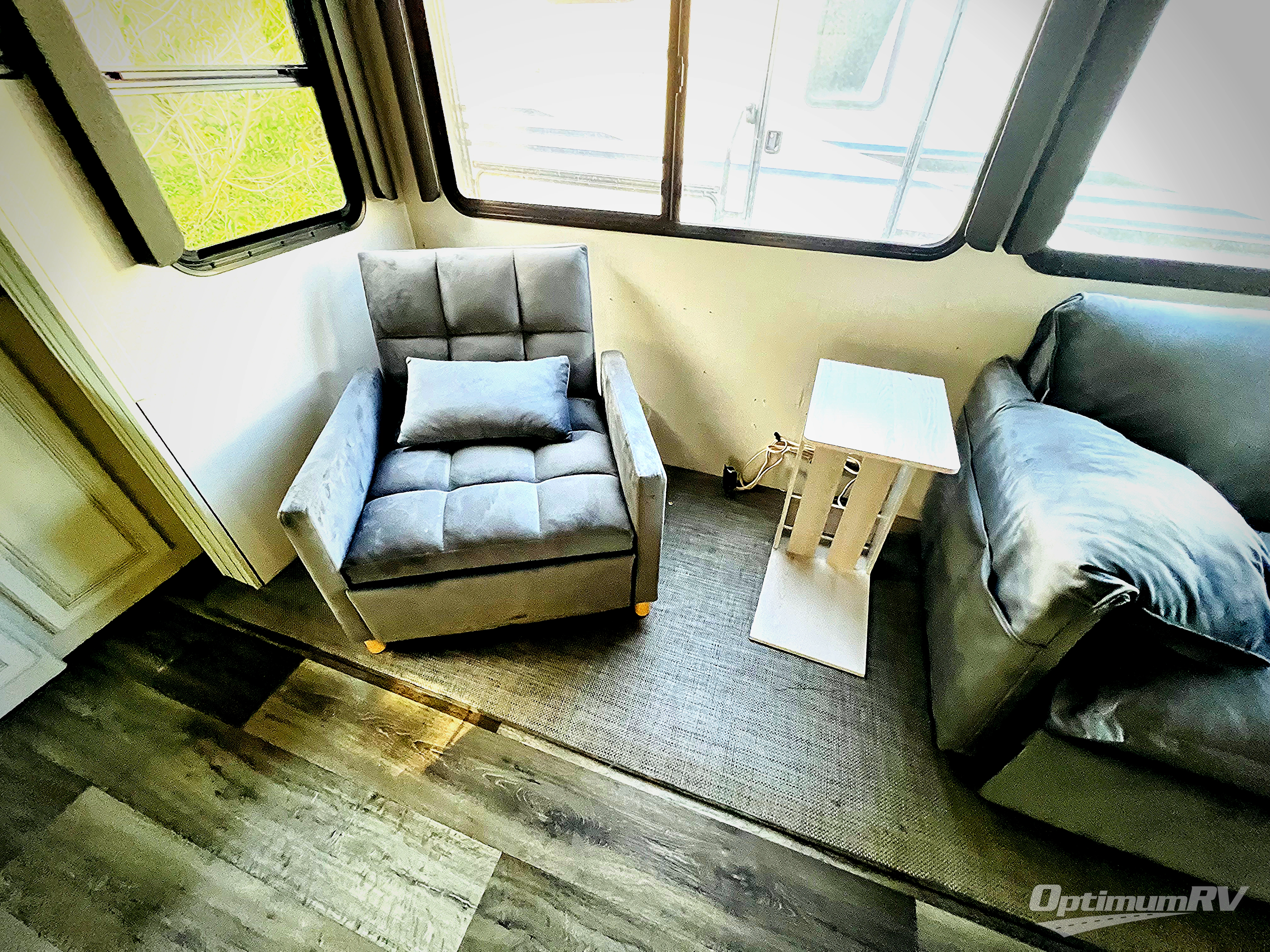 Imagine being able to stay inside on those chilly evenings to relax in a heated theater seat with massage setting while watching the big game on the 39" LED TV and staying cozy from the fireplace. You can invite other RVers over to relax on the tri-fold sofa or play a card game at the booth dinette or the free standing table and chairs if you chose that option. And the cook will love the large pantry, and all the kitchen appliances to make snacks and meals for everyone. Your family pet will surely enjoy having their own space to eat out of the pull-out pet dishes under the stainless steel refrigerator. The full bathroom is near the front master bedroom where you can enjoy your privacy at night on a queen bed. And you will not have to leave anything at home with all the storage found in the closets, and the slide out with a linen cabinet, a wardrobe and a dresser.