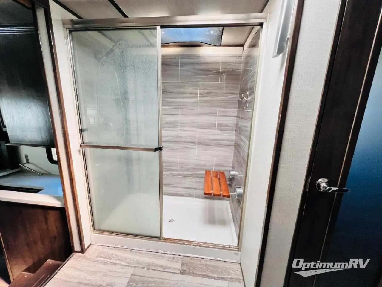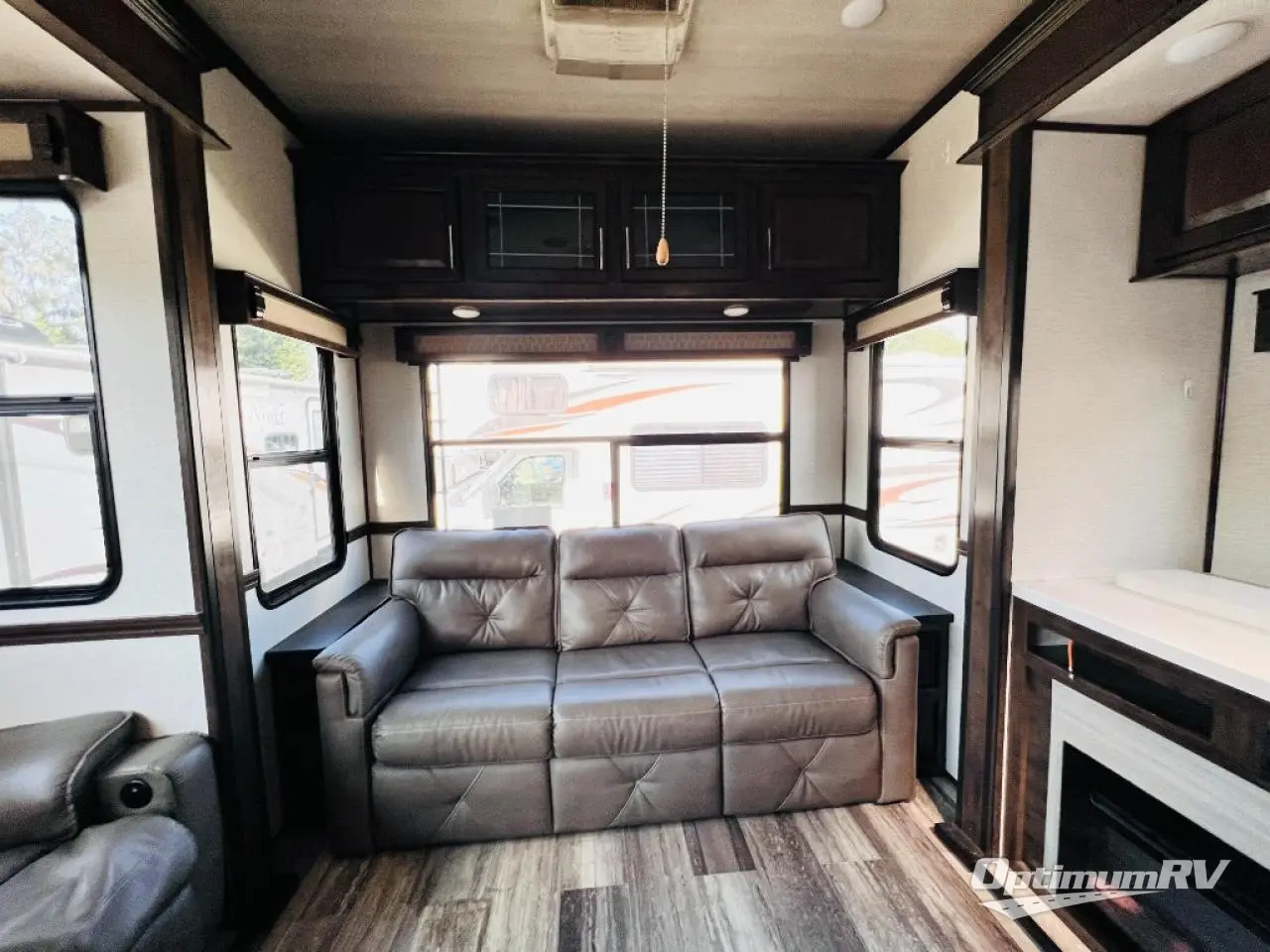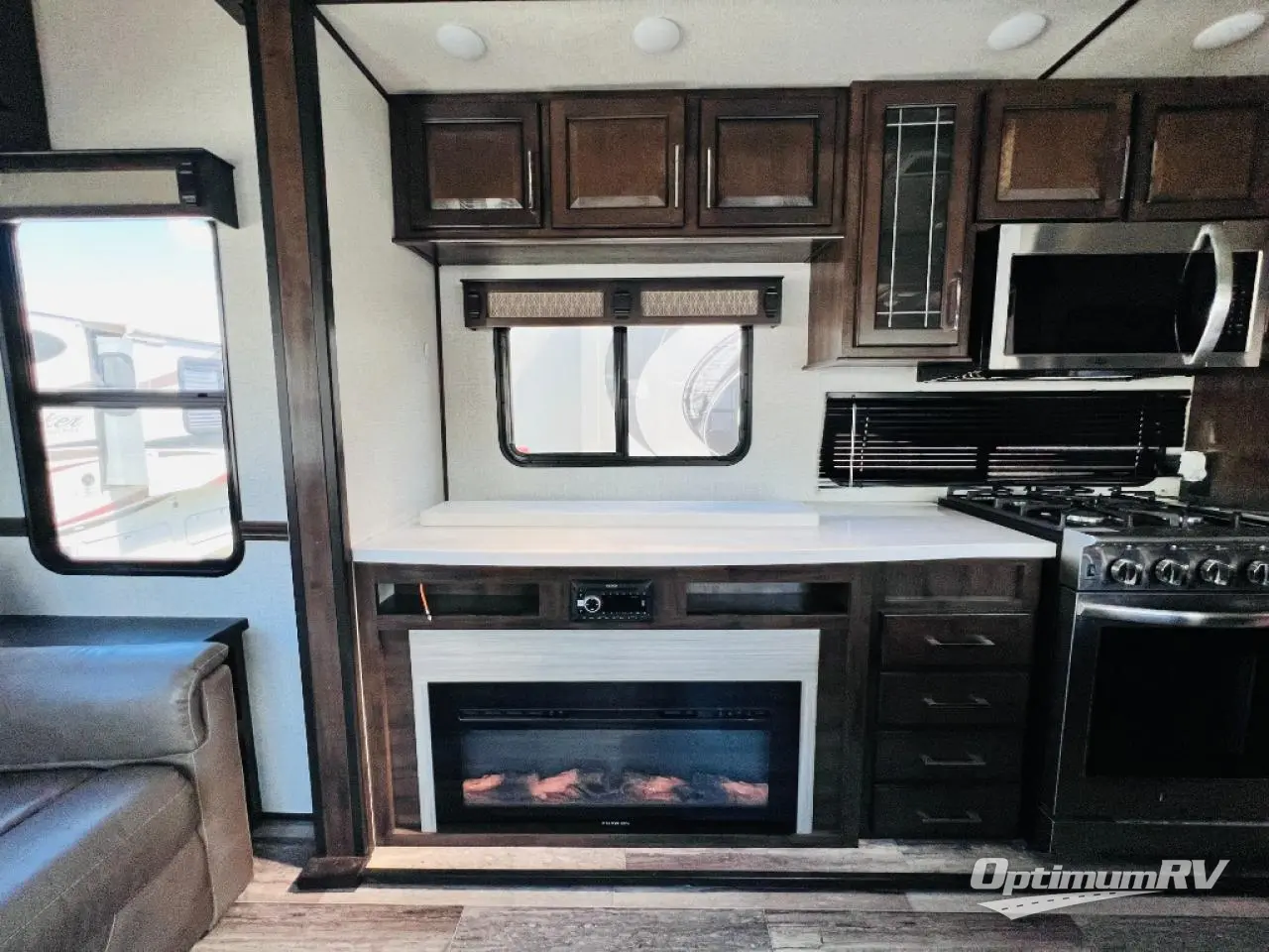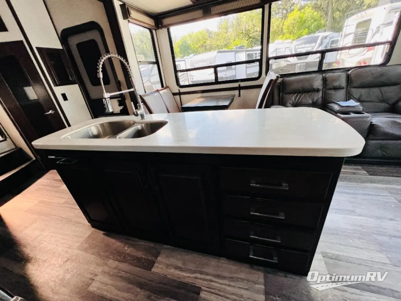 The list of reasons for why you should love this Yukon fifth wheel is endless! The dual-entry bathroom is completely enticing with its two sinks at the vanity, its glass shower doors, and its flip-up shower seat. The two fireplaces in this unit will keep everyone feeling cozy as they relax on the electric residential recliner sofas in the main living area or on the king-size bed in the front master suite. Plus, you will thoroughly enjoy preparing dinner for everyone since the kitchen comes with helpful essentials like the four-burner cooktop, the high-rise faucet in the stainless steel double-bowl sink, and the large island with extra counter space.
