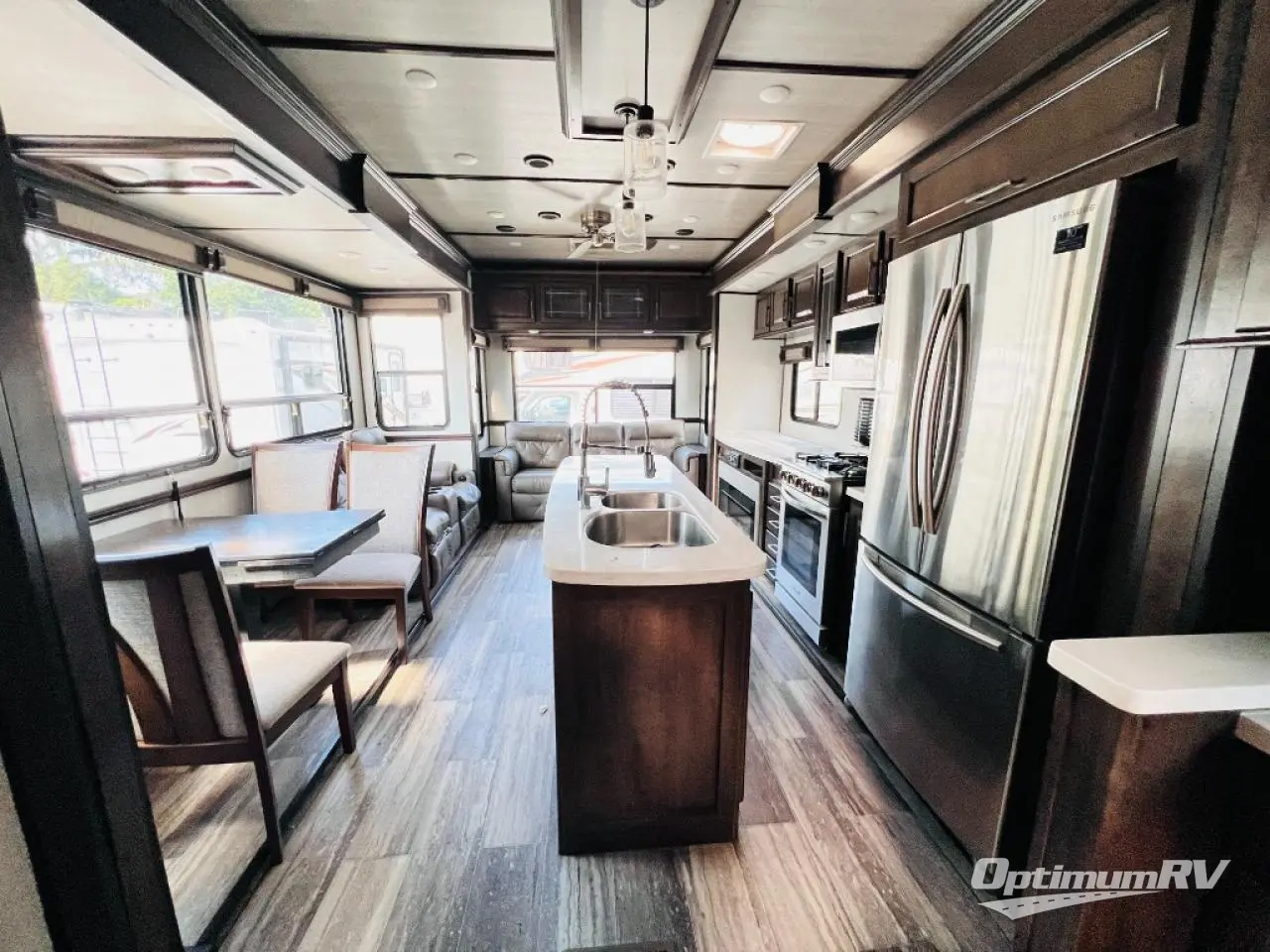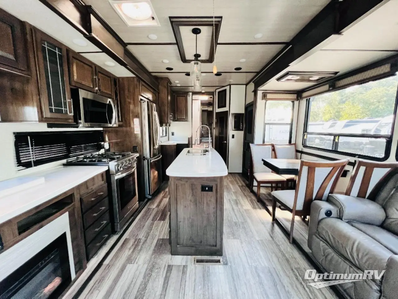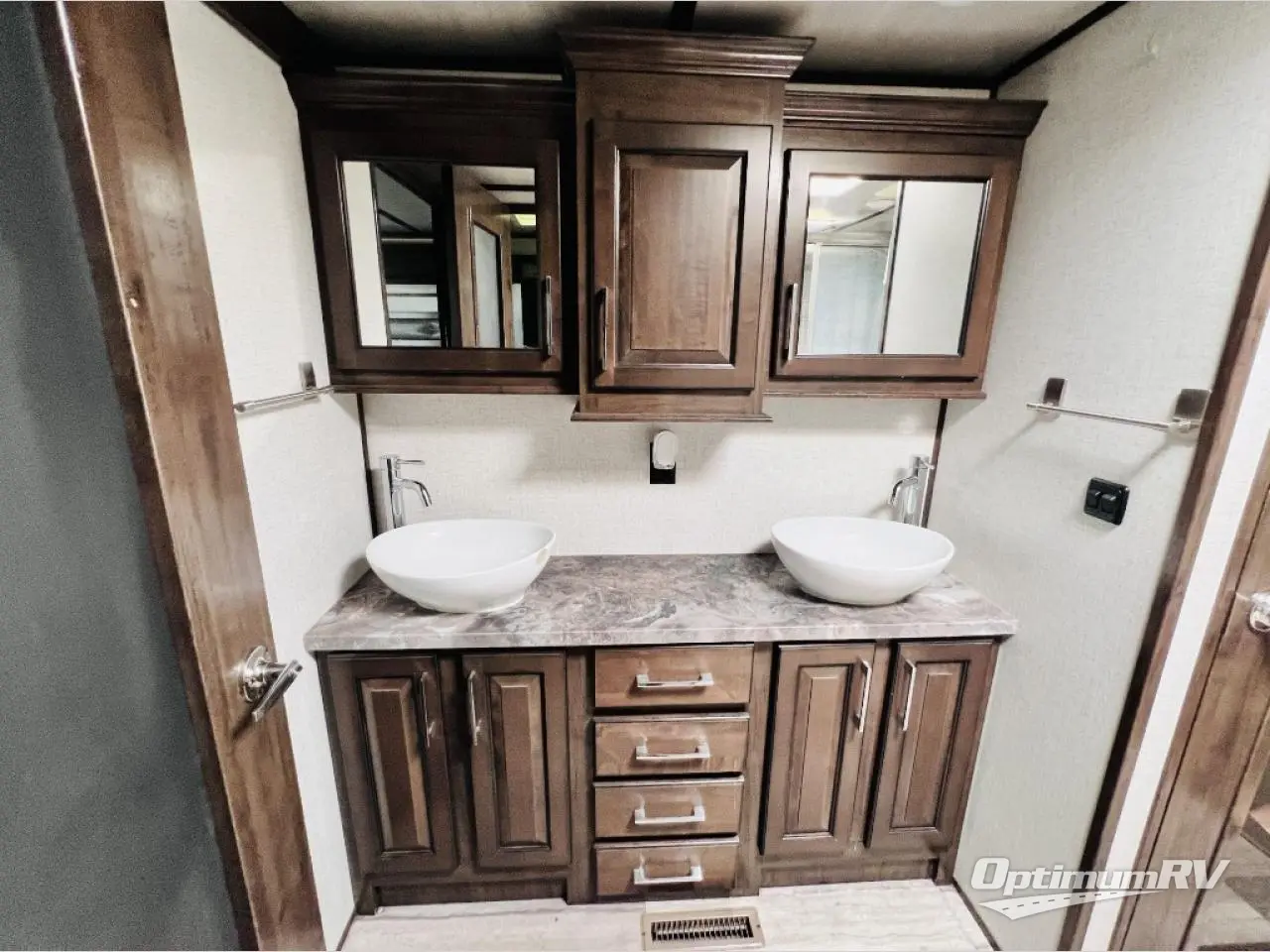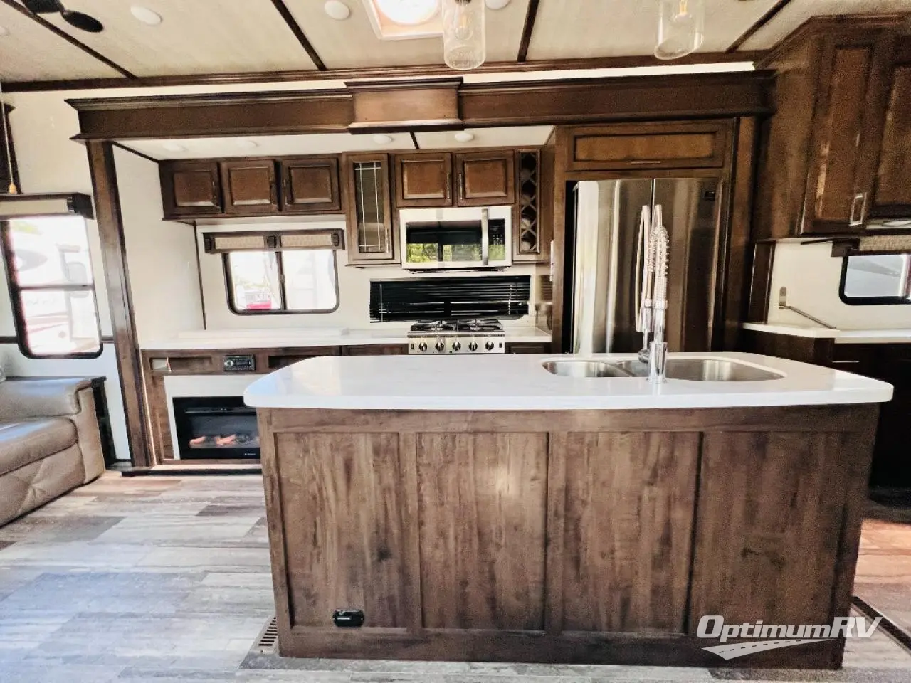 The list of reasons for why you should love this Yukon fifth wheel is endless! The dual-entry bathroom is completely enticing with its two sinks at the vanity, its glass shower doors, and its flip-up shower seat. The two fireplaces in this unit will keep everyone feeling cozy as they relax on the electric residential recliner sofas in the main living area or on the king-size bed in the front master suite. Plus, you will thoroughly enjoy preparing dinner for everyone since the kitchen comes with helpful essentials like the four-burner cooktop, the high-rise faucet in the stainless steel double-bowl sink, and the large island with extra counter space.