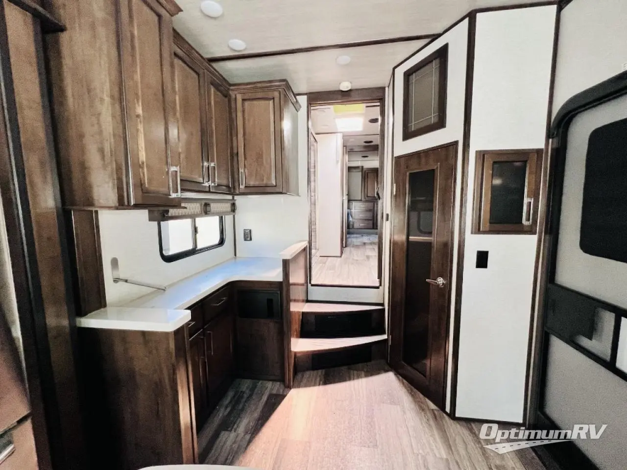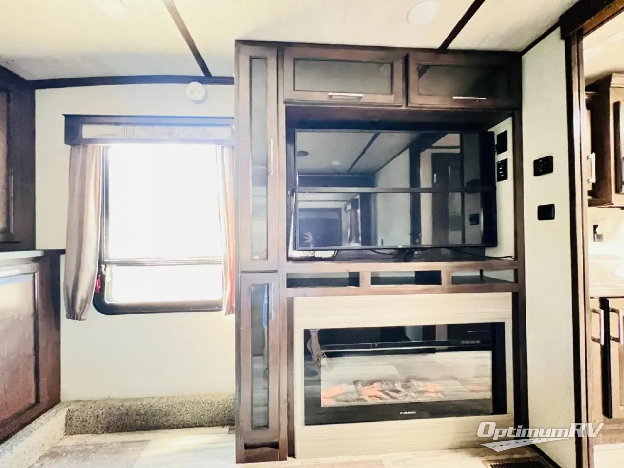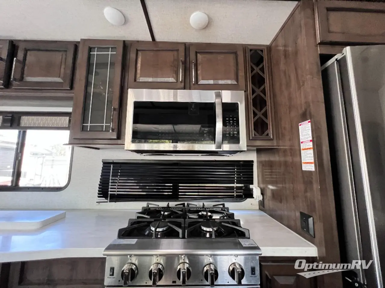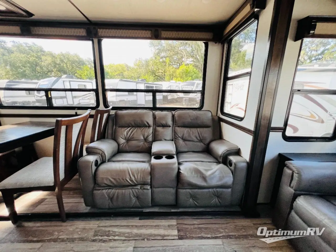 The list of reasons for why you should love this Yukon fifth wheel is endless! The dual-entry bathroom is completely enticing with its two sinks at the vanity, its glass shower doors, and its flip-up shower seat. The two fireplaces in this unit will keep everyone feeling cozy as they relax on the electric residential recliner sofas in the main living area or on the king-size bed in the front master suite. Plus, you will thoroughly enjoy preparing dinner for everyone since the kitchen comes with helpful essentials like the four-burner cooktop, the high-rise faucet in the stainless steel double-bowl sink, and the large island with extra counter space.
