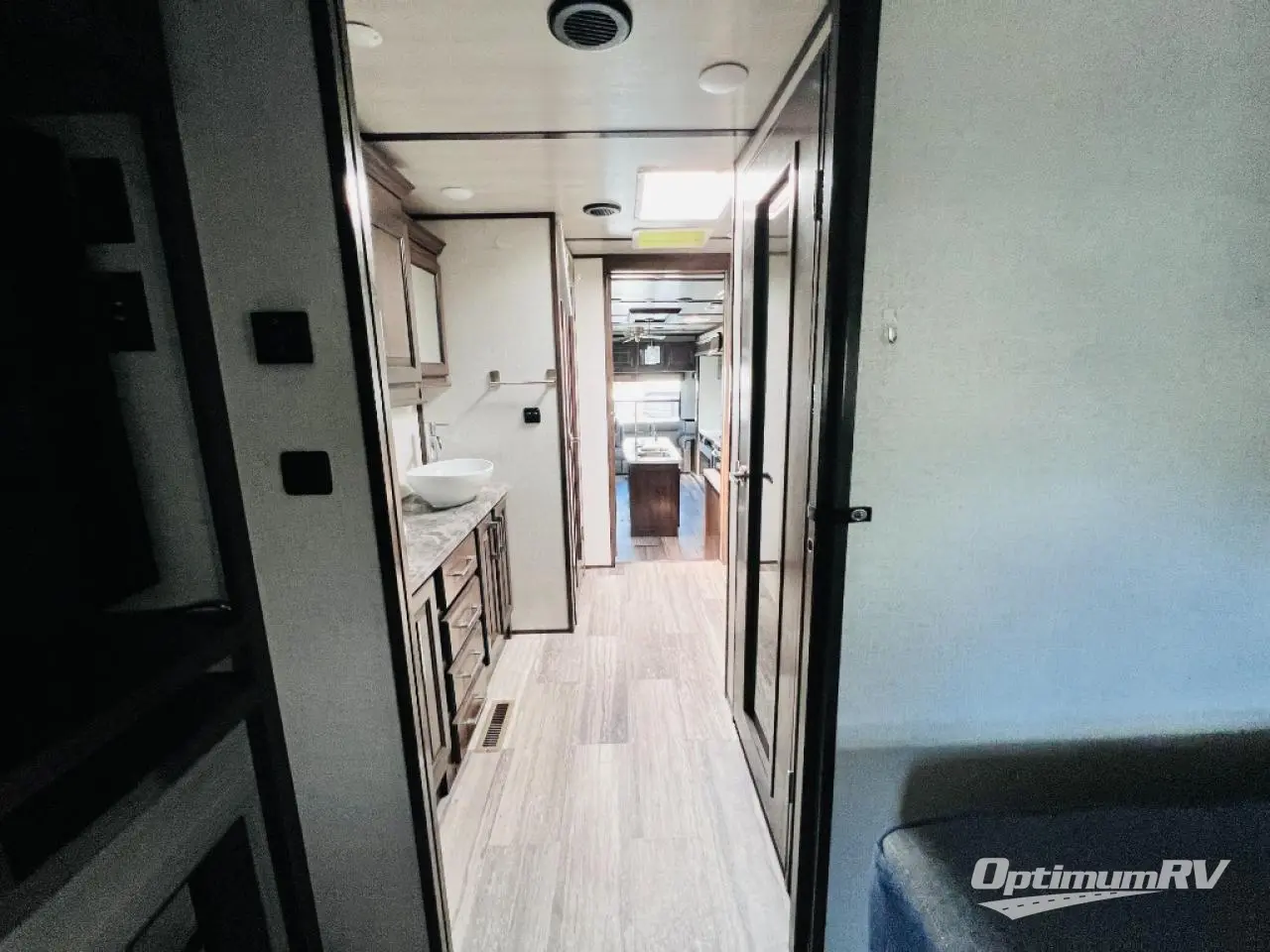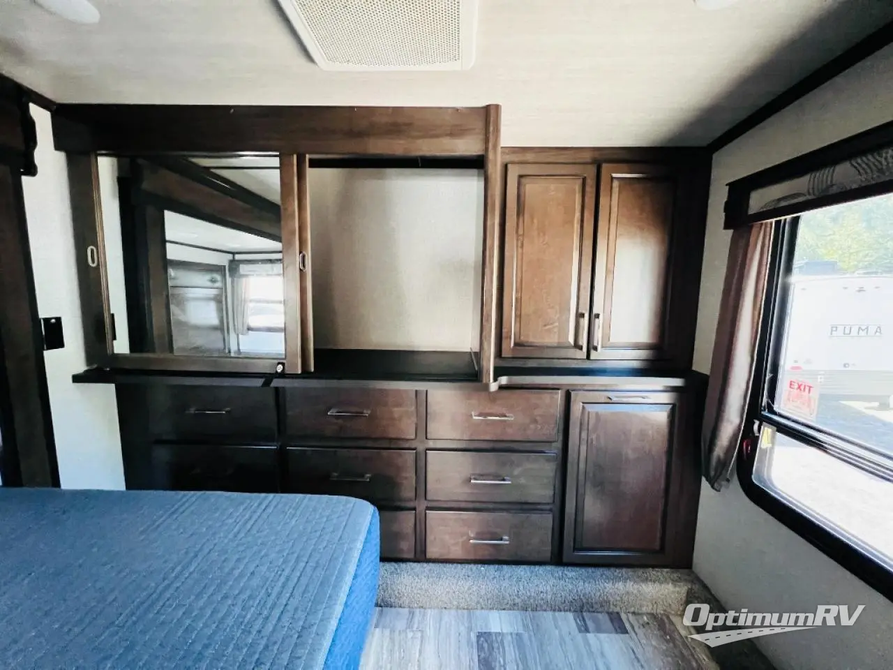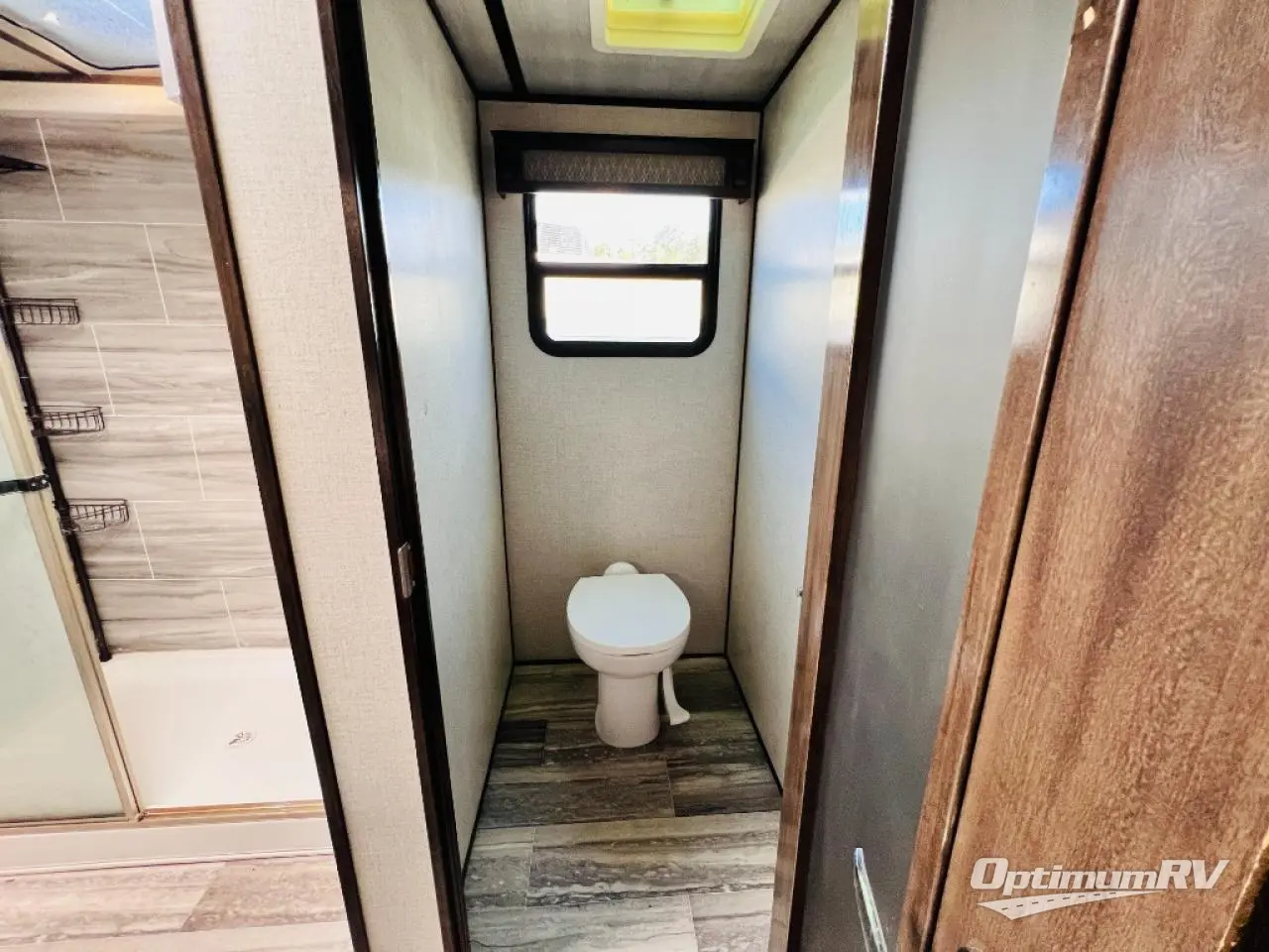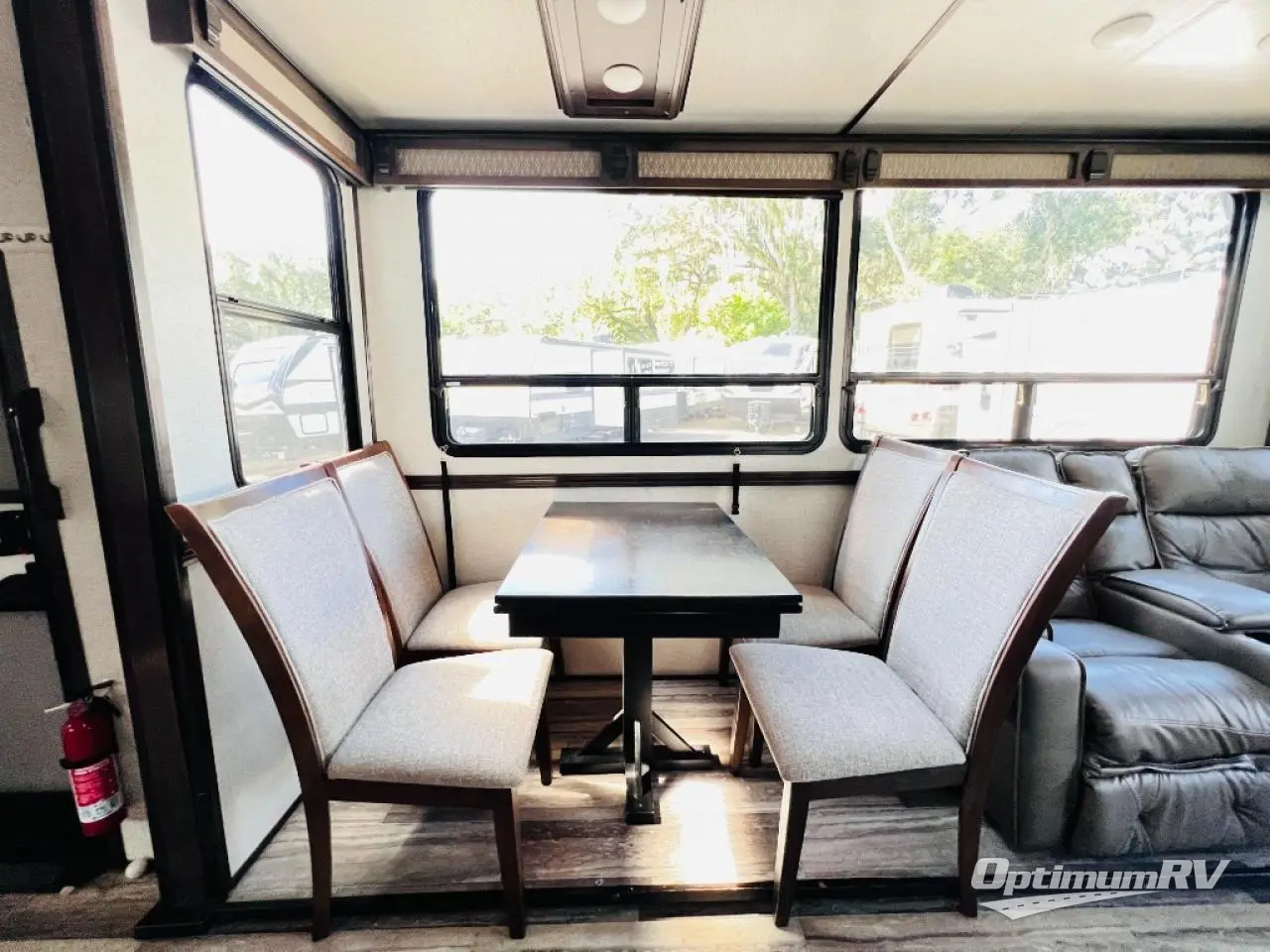 The list of reasons for why you should love this Yukon fifth wheel is endless! The dual-entry bathroom is completely enticing with its two sinks at the vanity, its glass shower doors, and its flip-up shower seat. The two fireplaces in this unit will keep everyone feeling cozy as they relax on the electric residential recliner sofas in the main living area or on the king-size bed in the front master suite. Plus, you will thoroughly enjoy preparing dinner for everyone since the kitchen comes with helpful essentials like the four-burner cooktop, the high-rise faucet in the stainless steel double-bowl sink, and the large island with extra counter space.