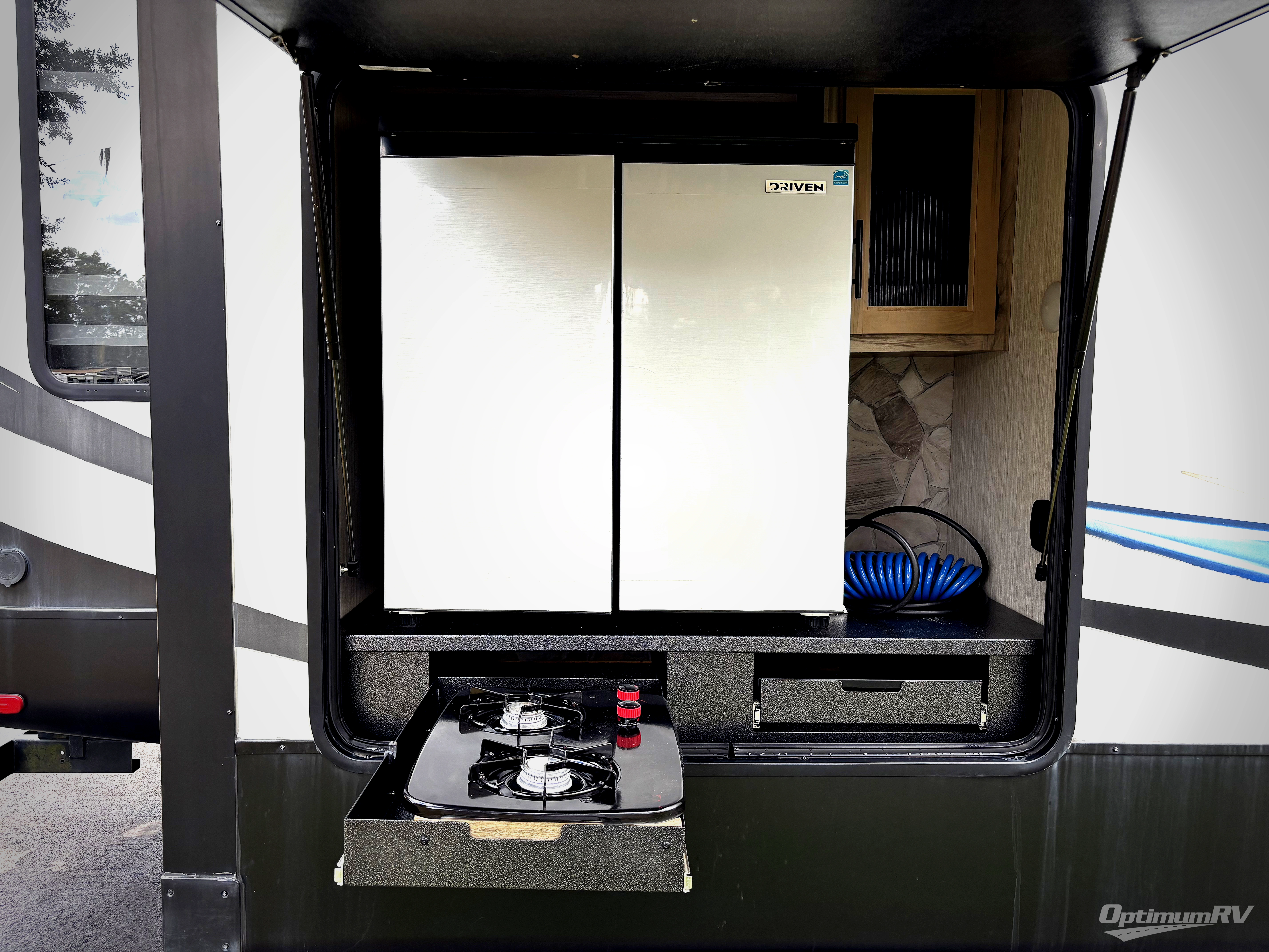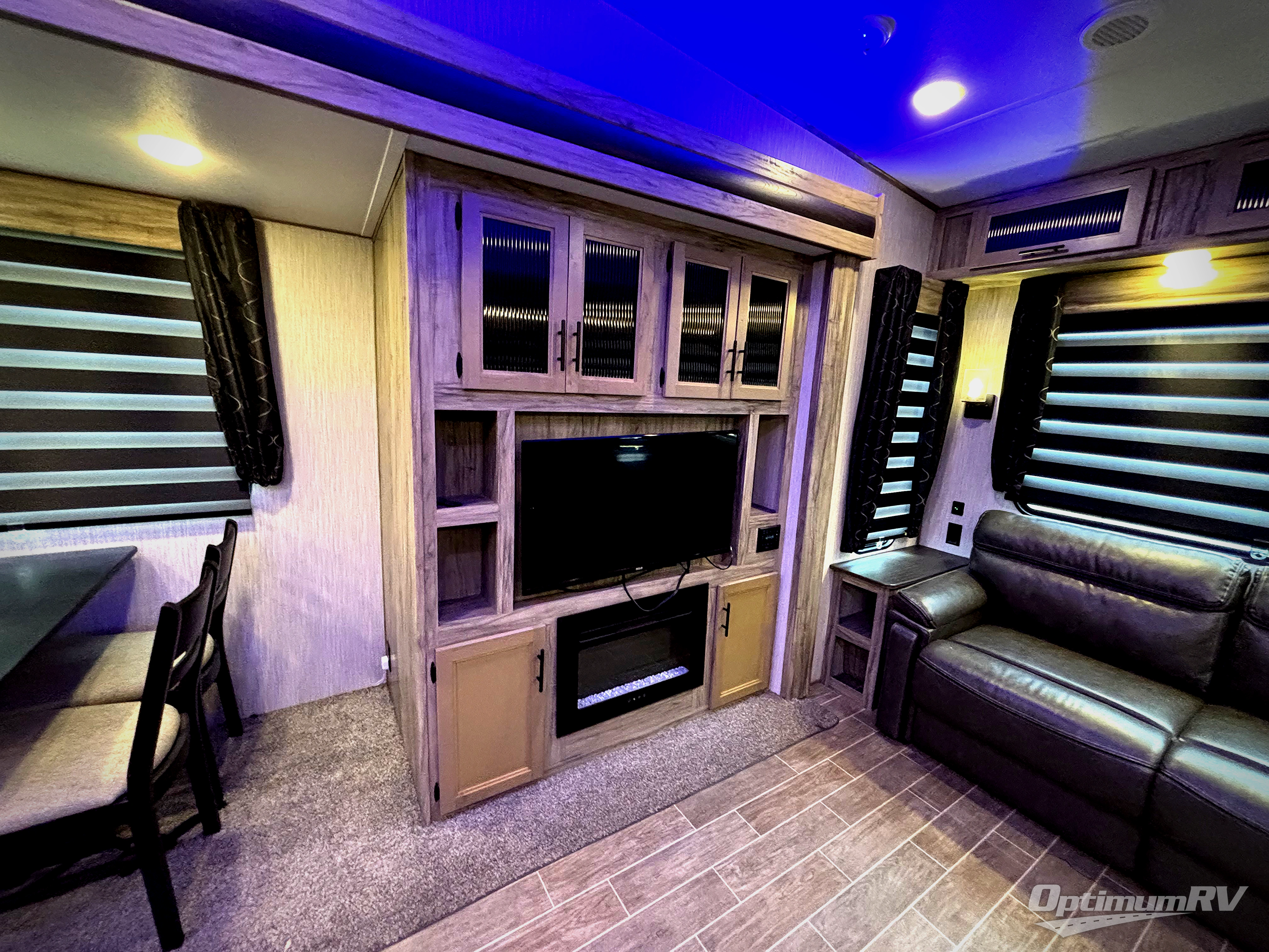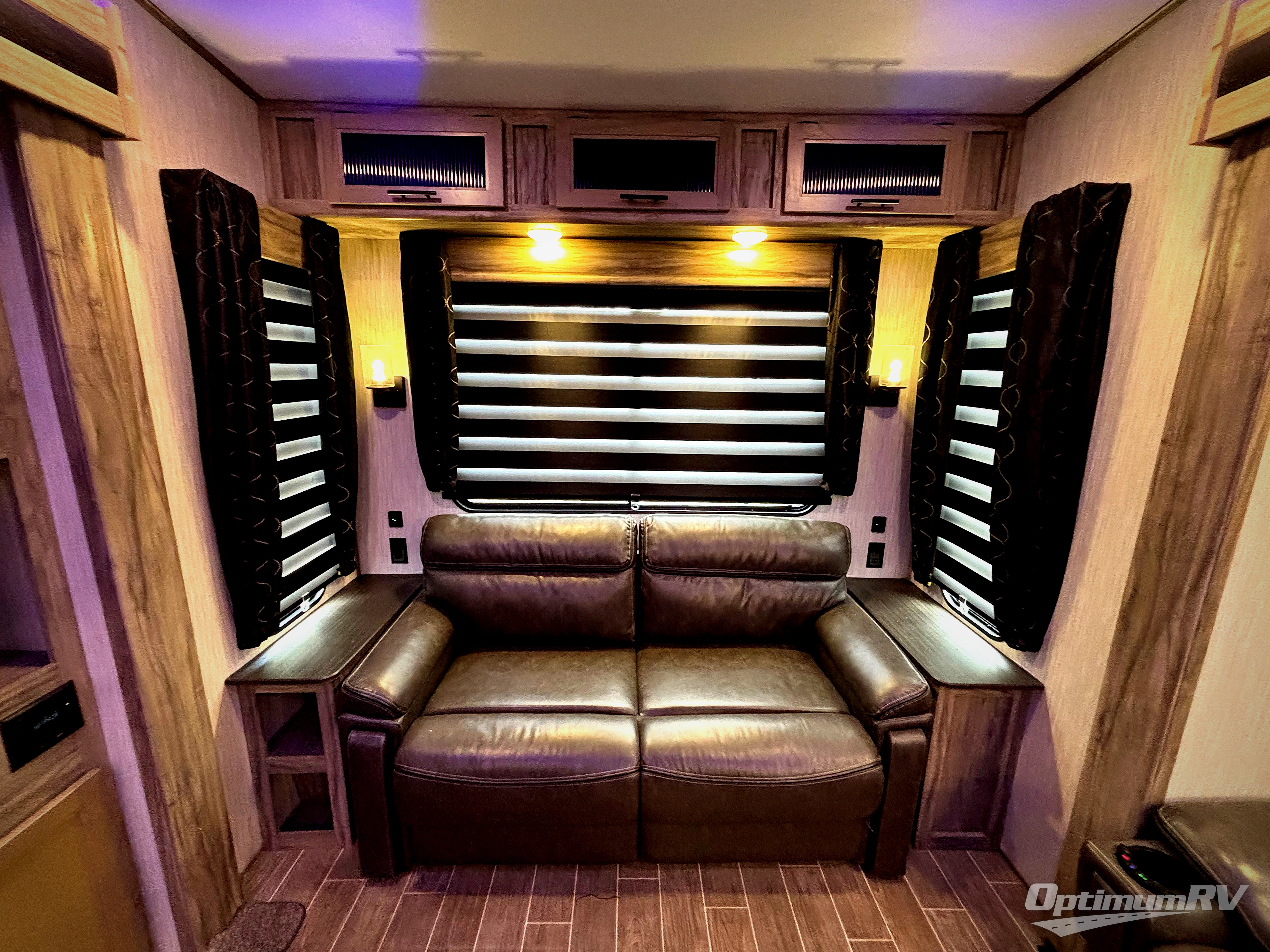 Step inside the most popular couples coach with this fifth wheel! You won't even feel like you're at the campground when you're relaxing at the home theatre seating while enjoying a heated massage in front of the fireplace. The stylish free-standing table has four seats with a panoramic rear window to view the lake while you play a few card games, just brew your favorite cup of coffee at the coffee bar and you're all set to have a good time. You can also have a fun time underneath the 15' awning with a cold beverage from the residential refrigerator at the outside kitchen. Enjoy a good night's rest each night on the king bed inside the front private bedroom, and keep your clothes looking their best with the front wall wardrobe with shelves, and if you choose to add the optional washer and dryer you can extend your trips with clean clothes!