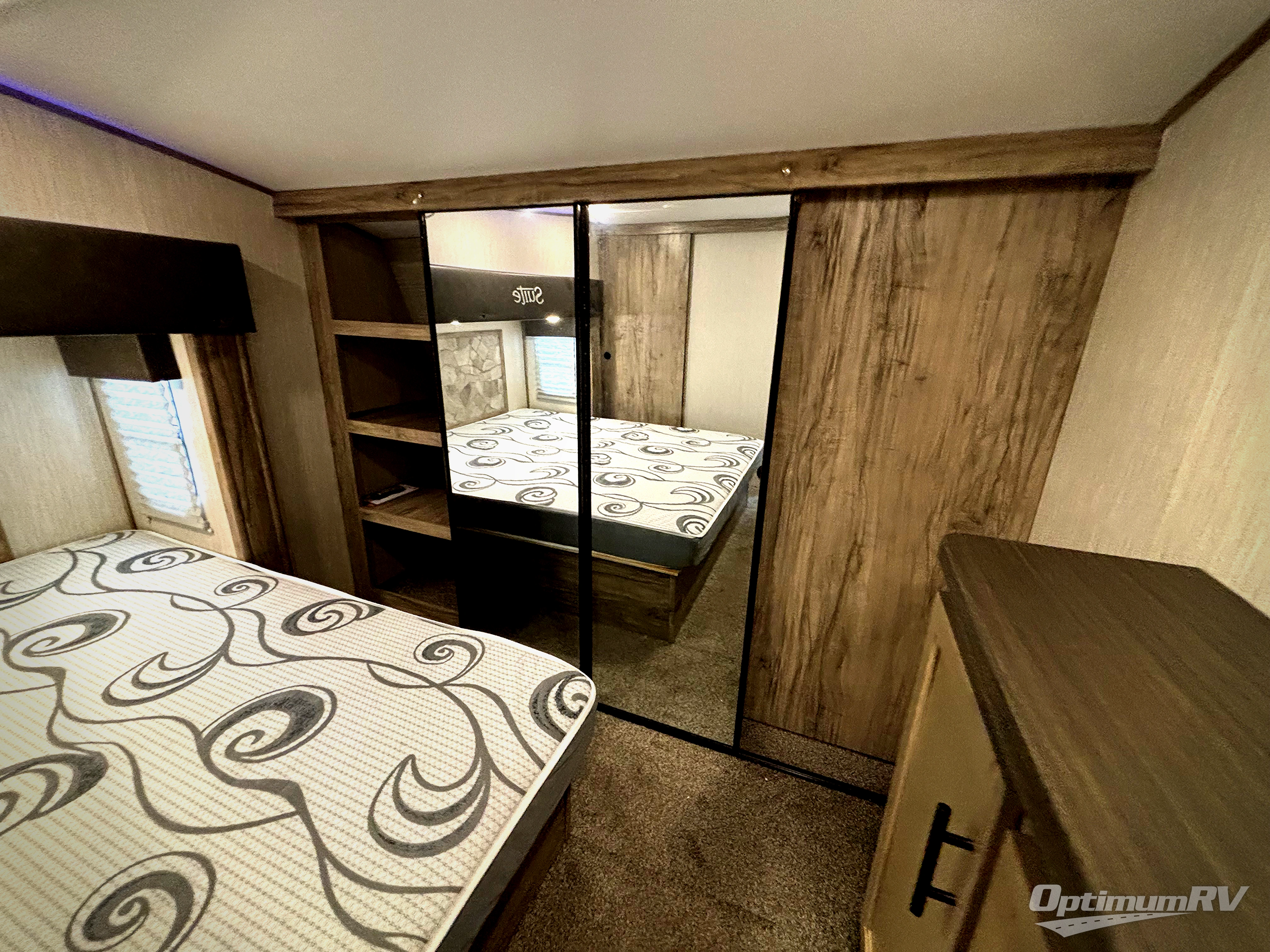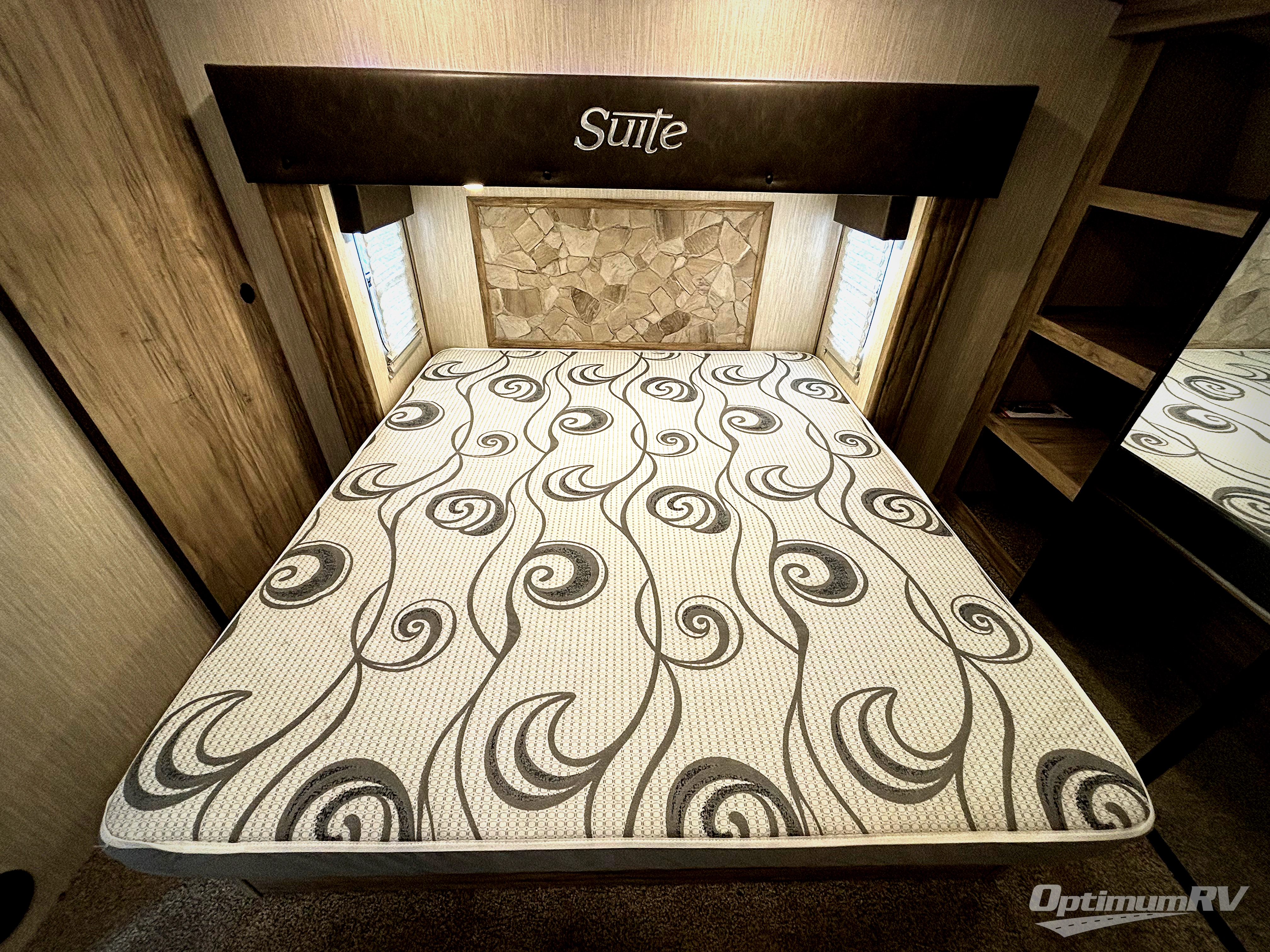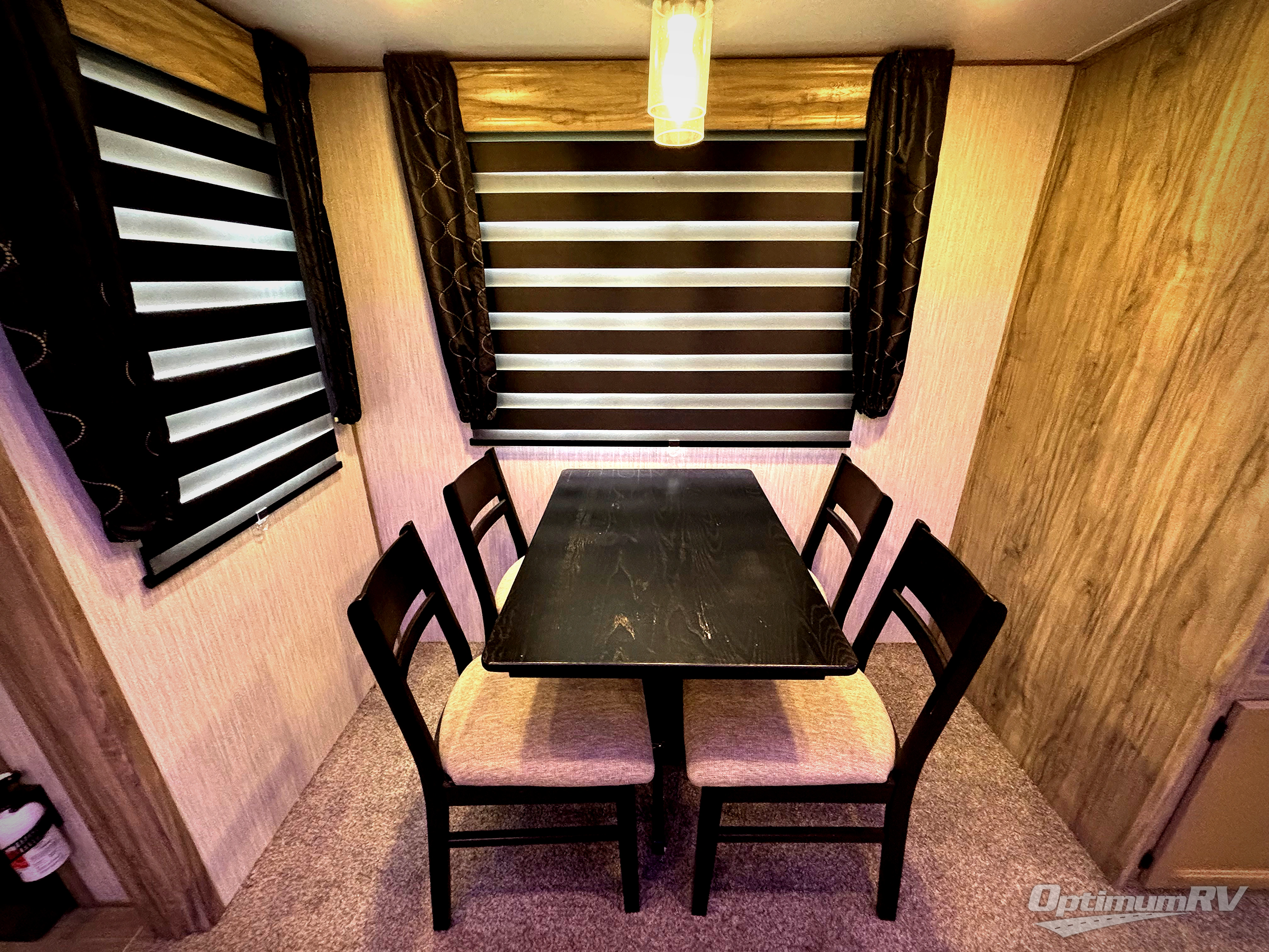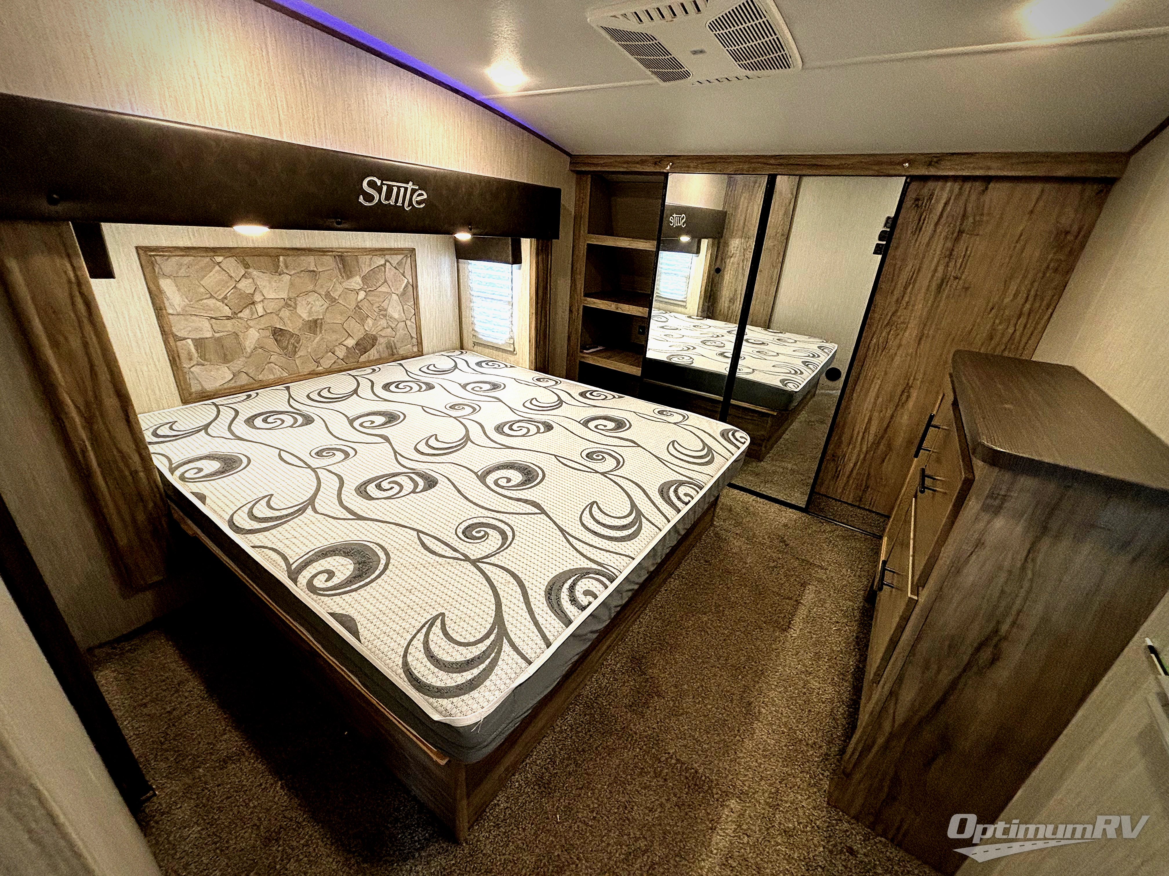 Step inside the most popular couples coach with this fifth wheel! You won't even feel like you're at the campground when you're relaxing at the home theatre seating while enjoying a heated massage in front of the fireplace. The stylish free-standing table has four seats with a panoramic rear window to view the lake while you play a few card games, just brew your favorite cup of coffee at the coffee bar and you're all set to have a good time. You can also have a fun time underneath the 15' awning with a cold beverage from the residential refrigerator at the outside kitchen. Enjoy a good night's rest each night on the king bed inside the front private bedroom, and keep your clothes looking their best with the front wall wardrobe with shelves, and if you choose to add the optional washer and dryer you can extend your trips with clean clothes!
